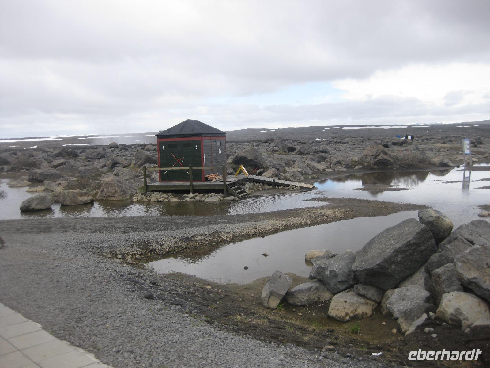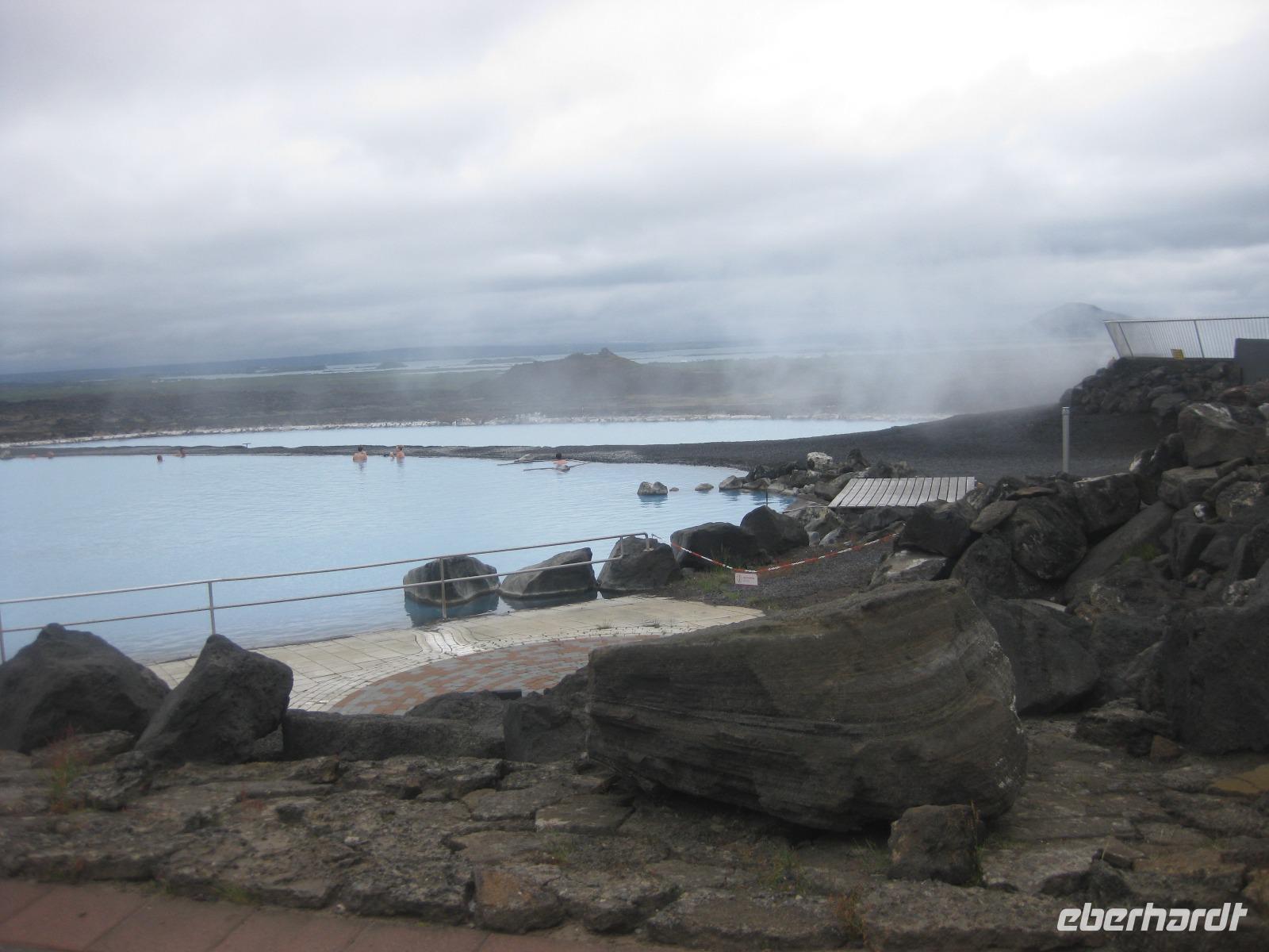 Und dann haben wir da noch einen besonderen Höhepunkt, das Thermal-Mineralbad "Jardbödin", das Pendant hier im Norden zur "Blauen Lagune" bei Reykjavik. Fast alle Gäste kommen mit in's Bad, wollen wir doch mal die Wirkungen des Wassers nach dem Bad prüfen. Hoffentlich erkennen wir uns alle wieder. Das warme Wasser ist mit 36-40 Grad C gerade angenehm, denn heute ist es doch recht kühl. Natürlich müssen wir auch die "heißen Pötte", Wassertemperatur 41 Grad C, ausprobieren. Wir haben viel Spaß.