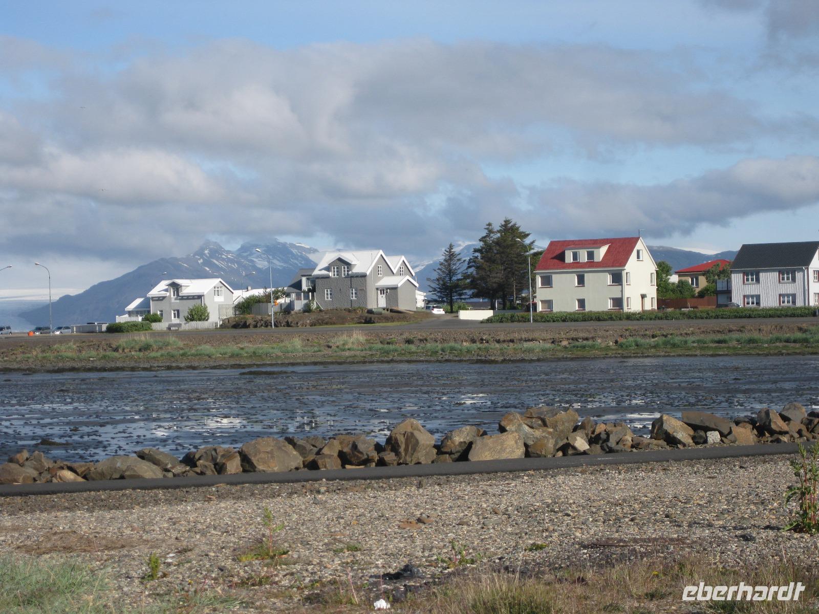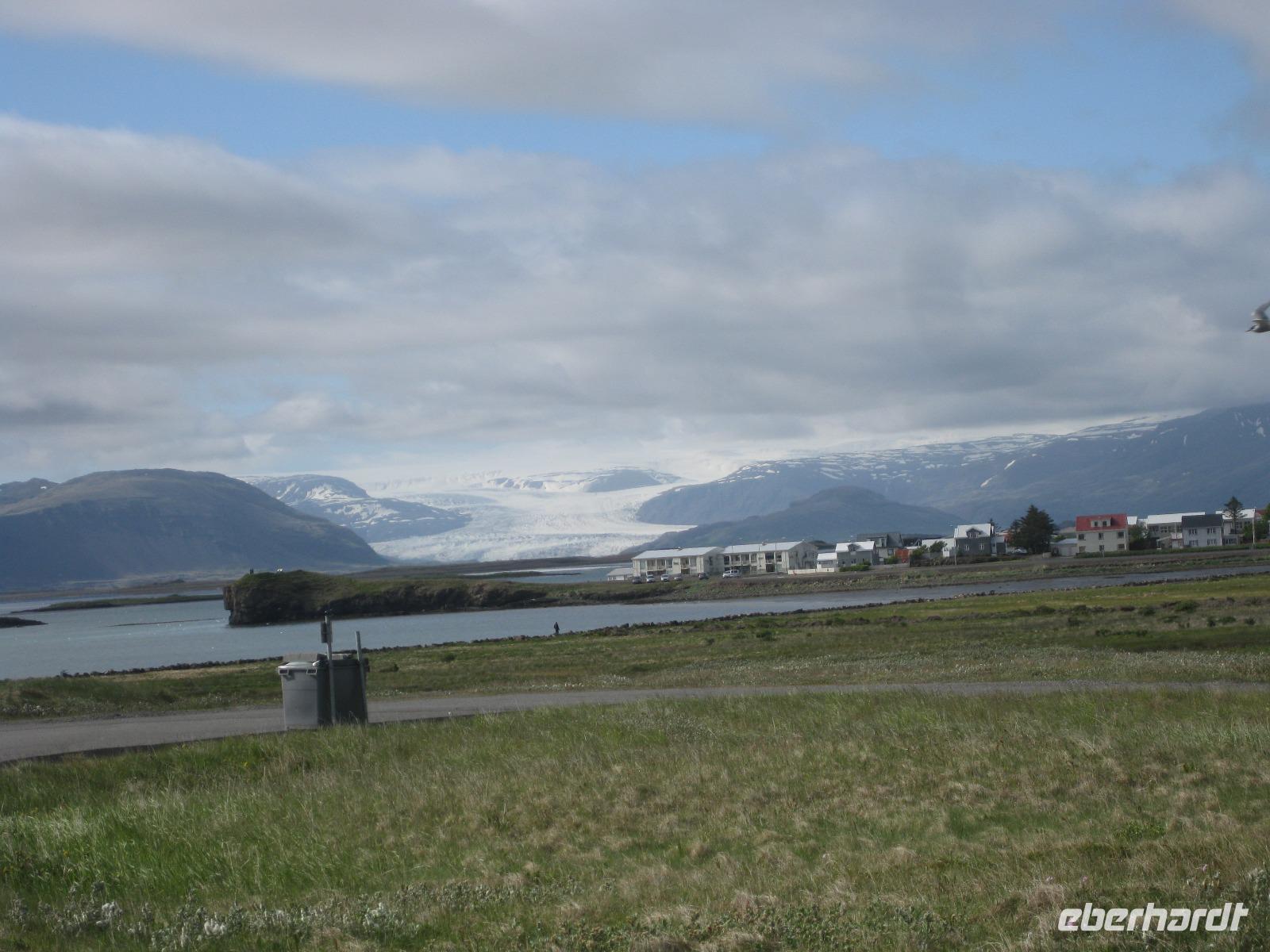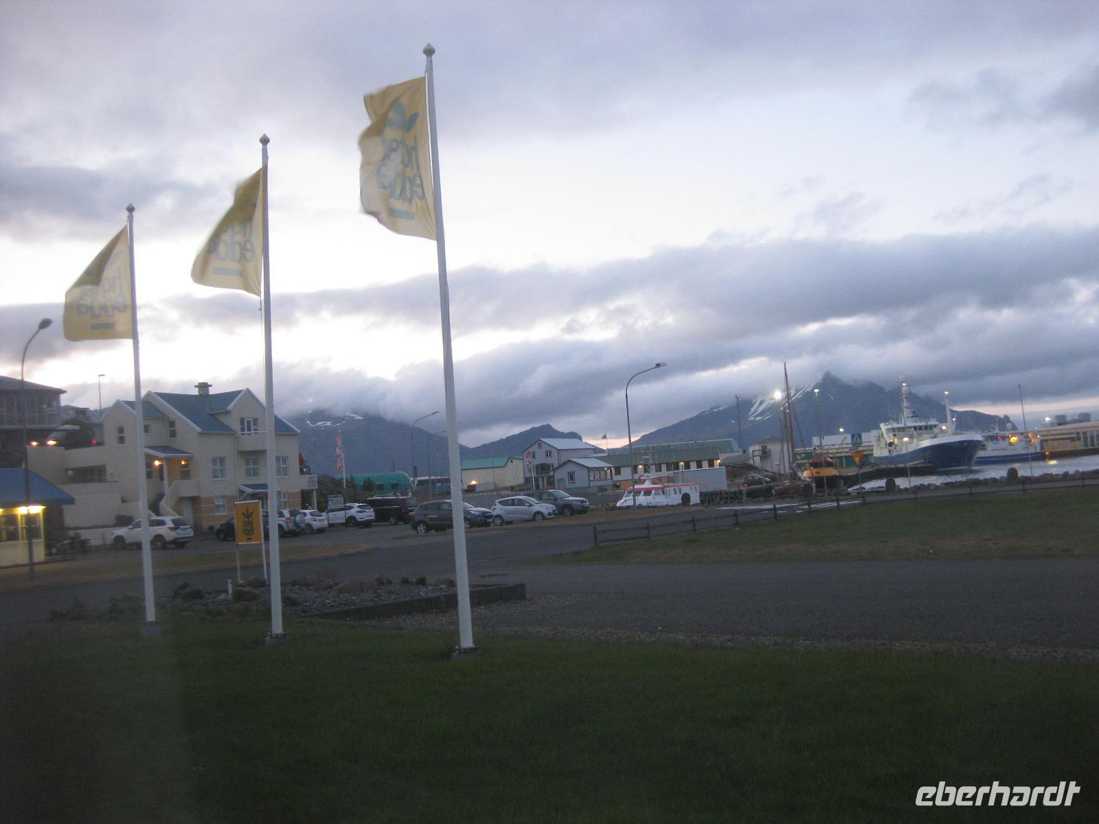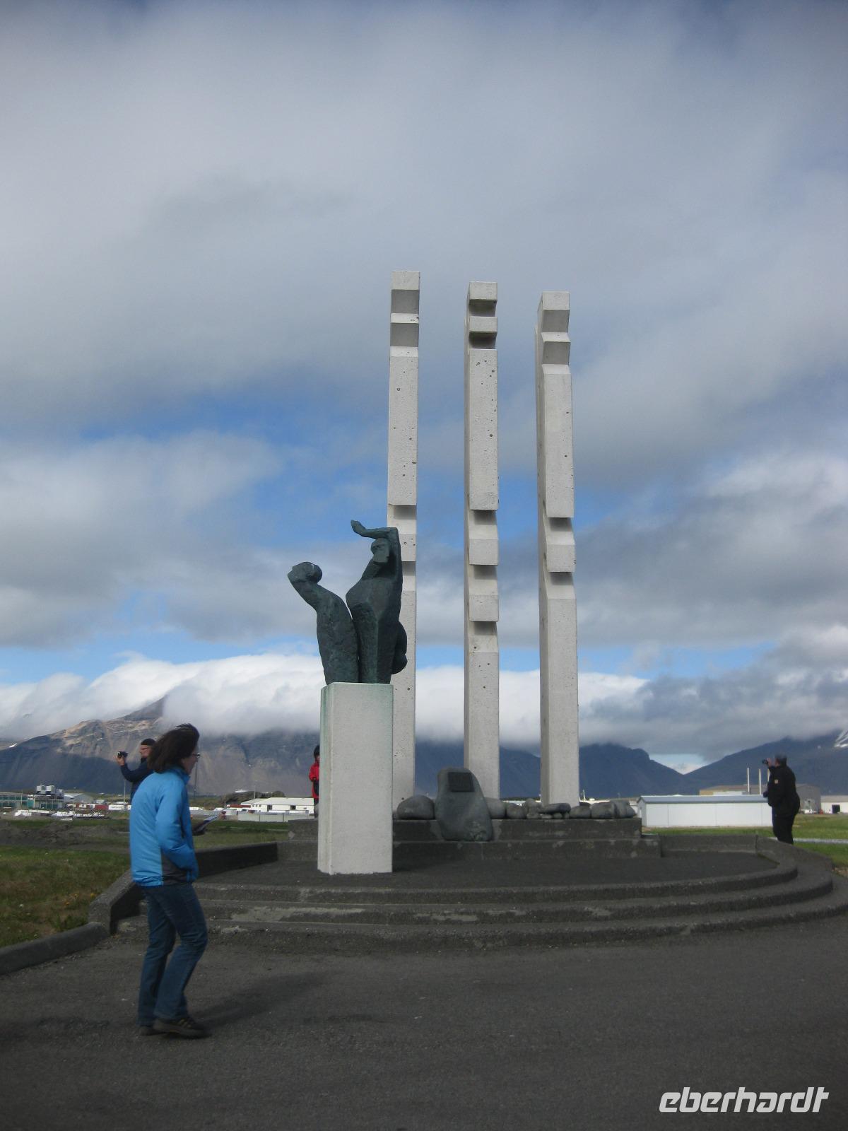 Am Nachmittag erreichen wir das Städtchen. Es ist ein Zentrum der Fischerei und auch "Gateway" zum Gletscher Vatnajökull. Hier bekommt man besonders frischen Hummer, den wir bei unserem Abendessen probieren. Und von hier aus starten wir auch zu unserem fakultativen Gletscherausflug, den fast alle Gäste mit machen. Wir übernachten wieder in einem Edda-Hotel. Bevor wir im Hotel einchecken, zeigen uns Berglind und Ari noch ein wenig das Städtchen. Am Seefahrer- und Fischerdenkmal legen wir noch einen kurzen Stopp ein. Von hier aus hat man die beste Sicht auf die Umgebung.