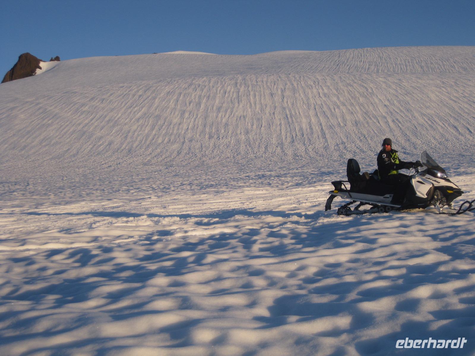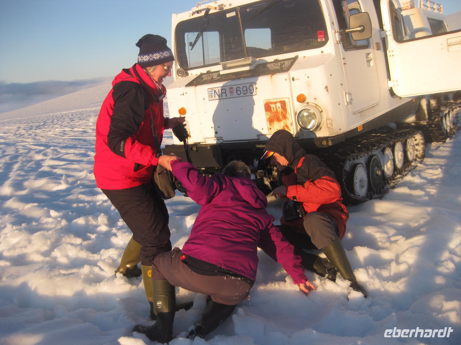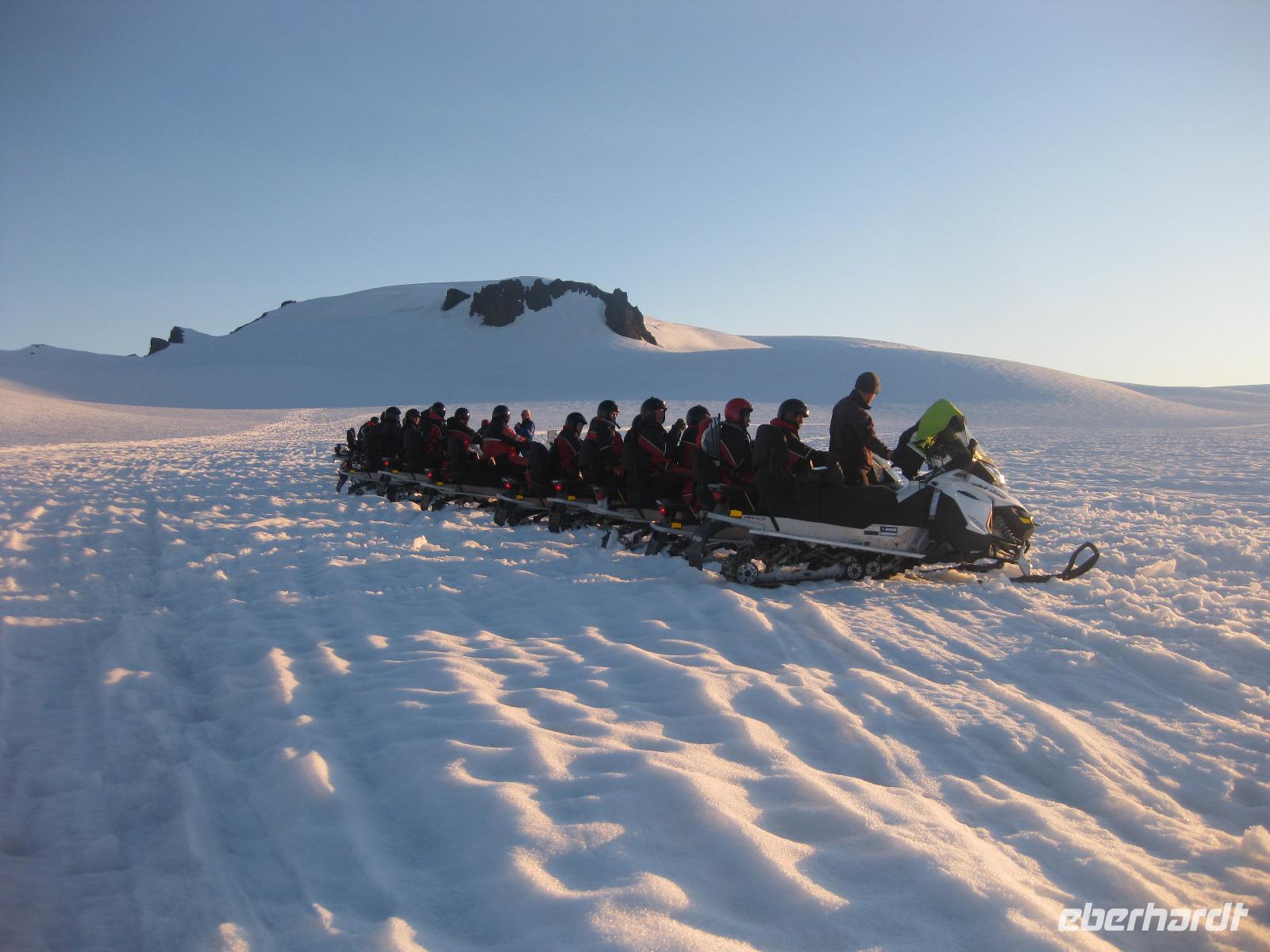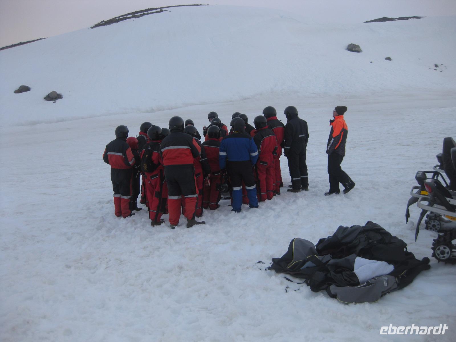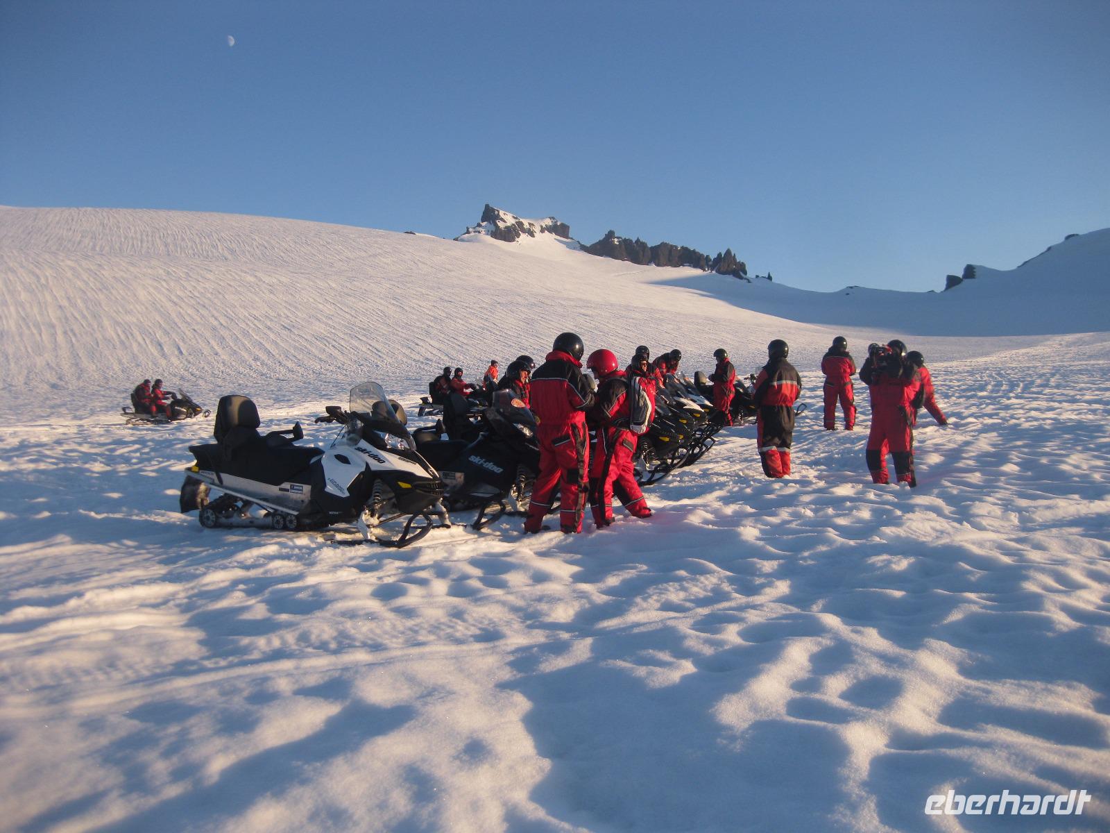 Nach dem super leckeren Abendessen werden wir zur Gletscherfahrt abgeholt. Wir fahren erst einmal zur unteren Basisstation, wo bezahlt wird und die Snowmobile-Fahrer eingekleidet werden. Sie erhalten Anzüge, Helme, Stiefel und Handschuhe und sehen dann wie Astronauten aus. Die anderen Gäste erhalten auch Stiefel. Dann werden wir alle zum Gletscher hinauf gefahren, von Null Meter auf ca. 1000 Meter Höhe. Schon allein die Auffahrt ist spektakulär. Hier oben ist alles weiß. Die Snowmobile-Fahrer steigen nach einer kurzen Einweisung auf die Snowmobile und fahren dann selbst über den Gletscher. Die anderen Gäste werden mit einer Art Schneeraupe über den Gletscher gefahren. Der Chef der Gletschertour-Firma fährt selbst.