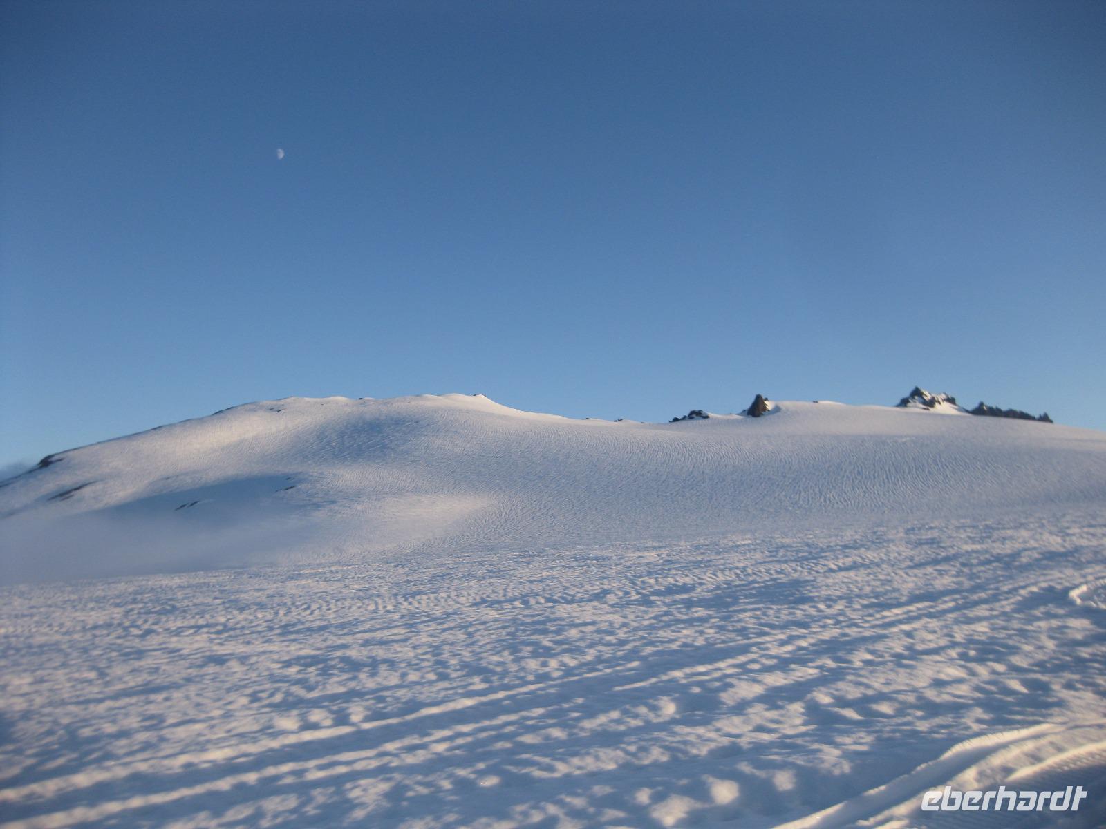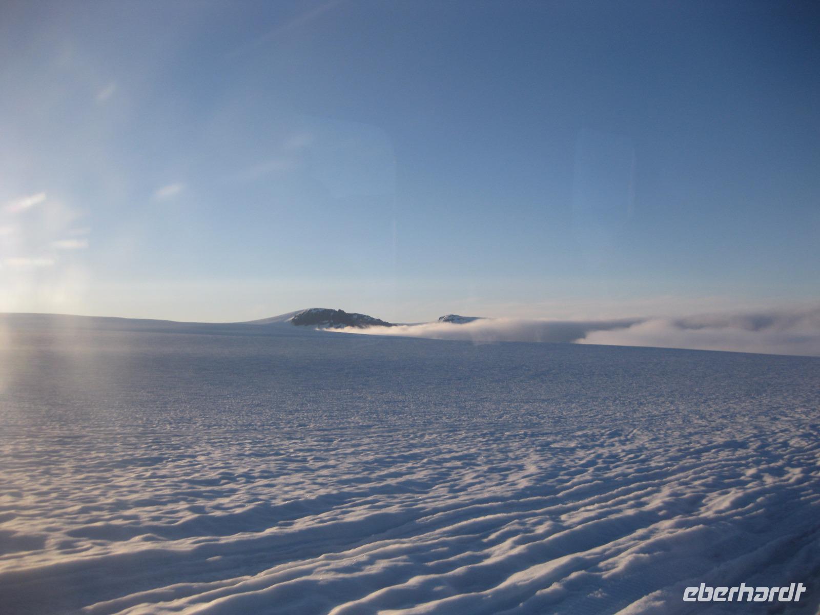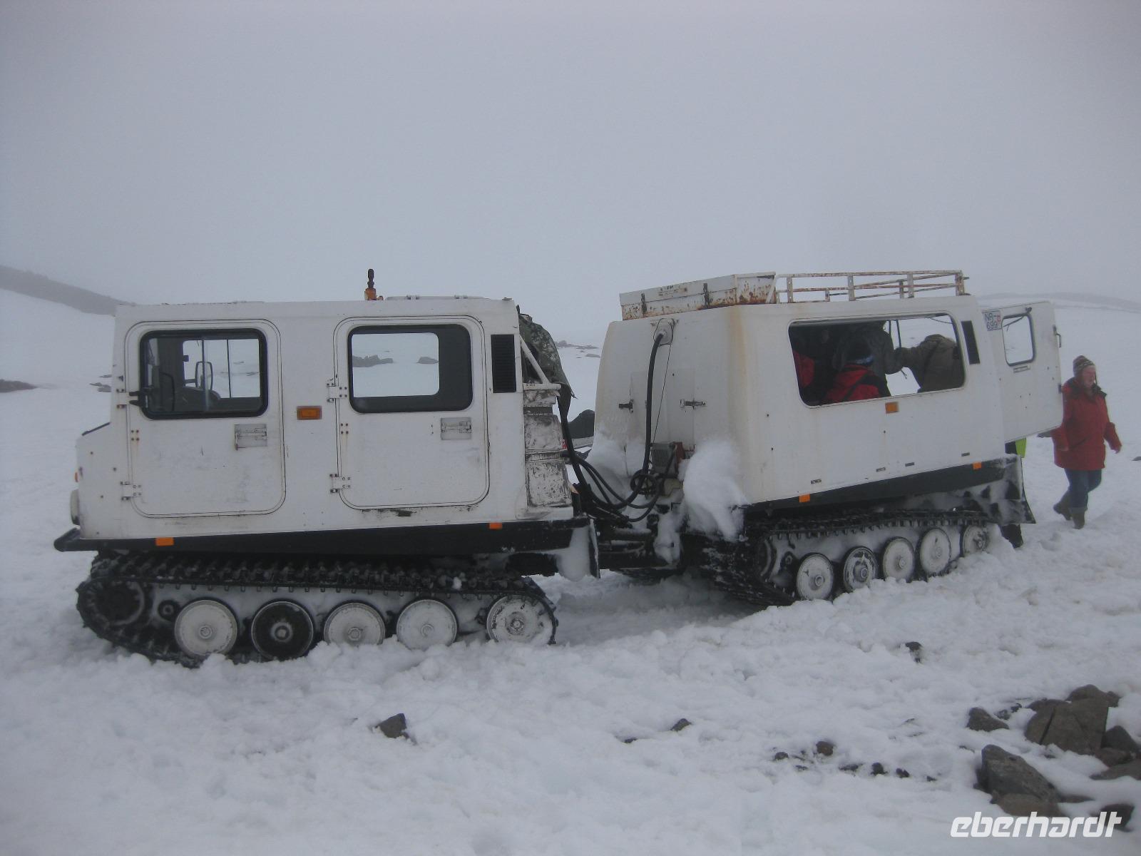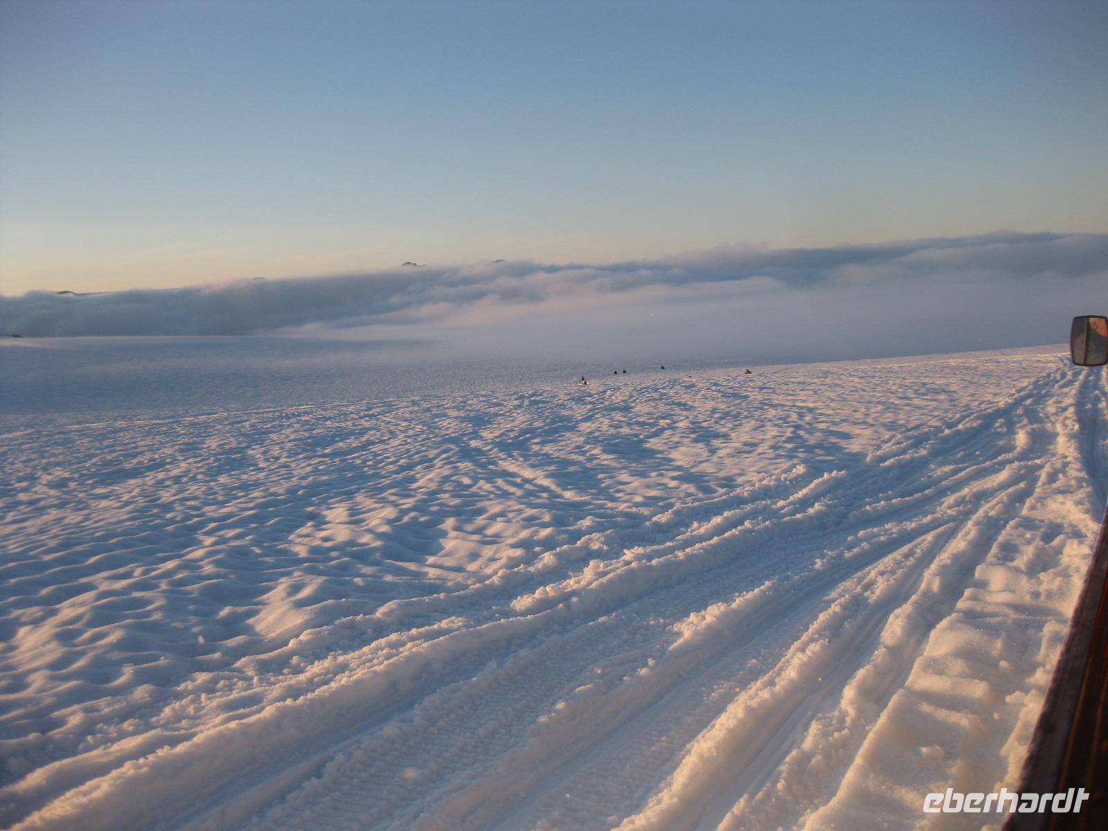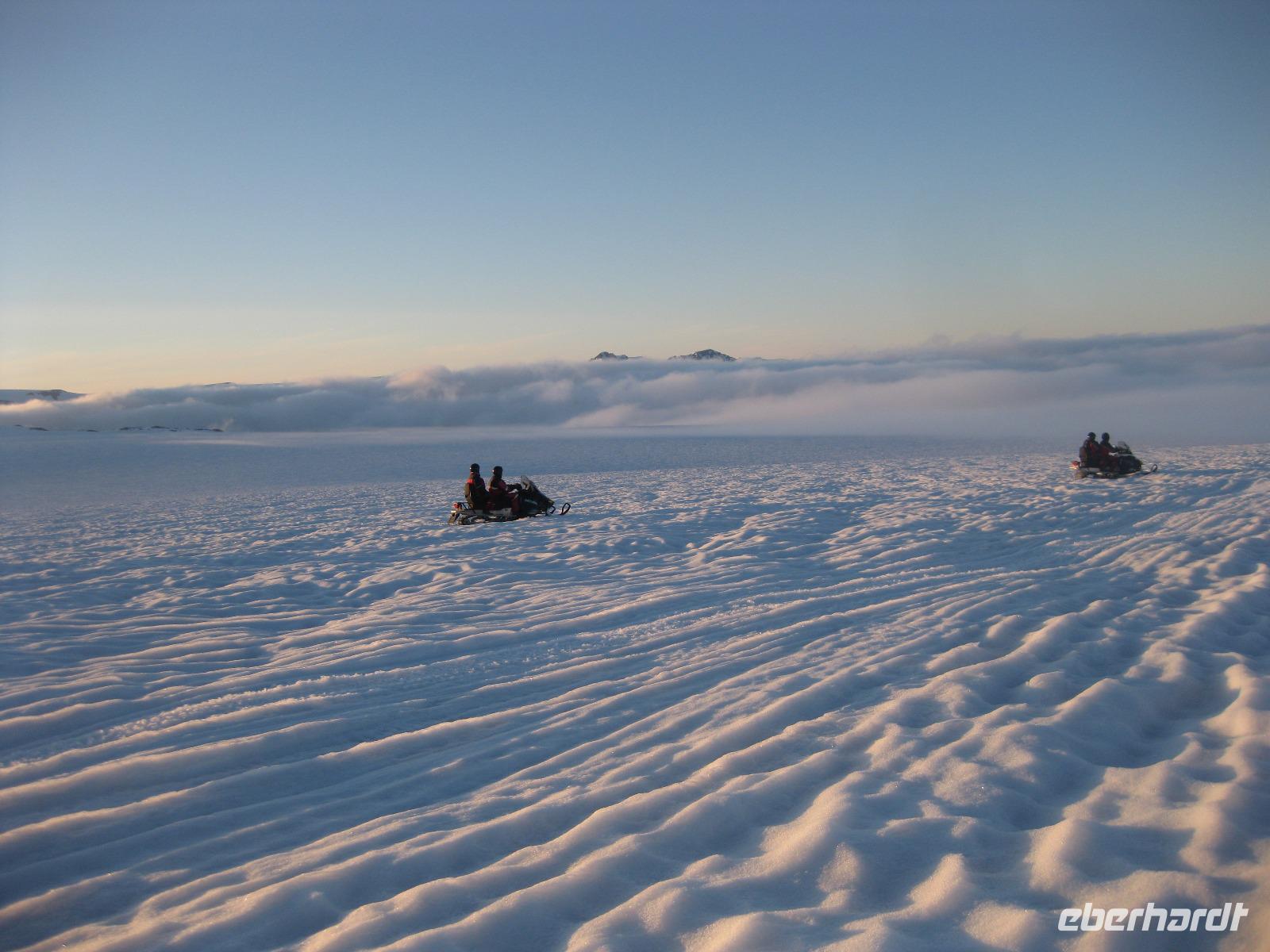 Nach dem super leckeren Abendessen werden wir zur Gletscherfahrt abgeholt. Wir fahren erst einmal zur unteren Basisstation, wo bezahlt wird und die Snowmobile-Fahrer eingekleidet werden. Sie erhalten Anzüge, Helme, Stiefel und Handschuhe und sehen dann wie Astronauten aus. Die anderen Gäste erhalten auch Stiefel. Dann werden wir alle zum Gletscher hinauf gefahren, von Null Meter auf ca. 1000 Meter Höhe. Schon allein die Auffahrt ist spektakulär. Hier oben ist alles weiß. Die Snowmobile-Fahrer steigen nach einer kurzen Einweisung auf die Snowmobile und fahren dann selbst über den Gletscher. Die anderen Gäste werden mit einer Art Schneeraupe über den Gletscher gefahren. Der Chef der Gletschertour-Firma fährt selbst.