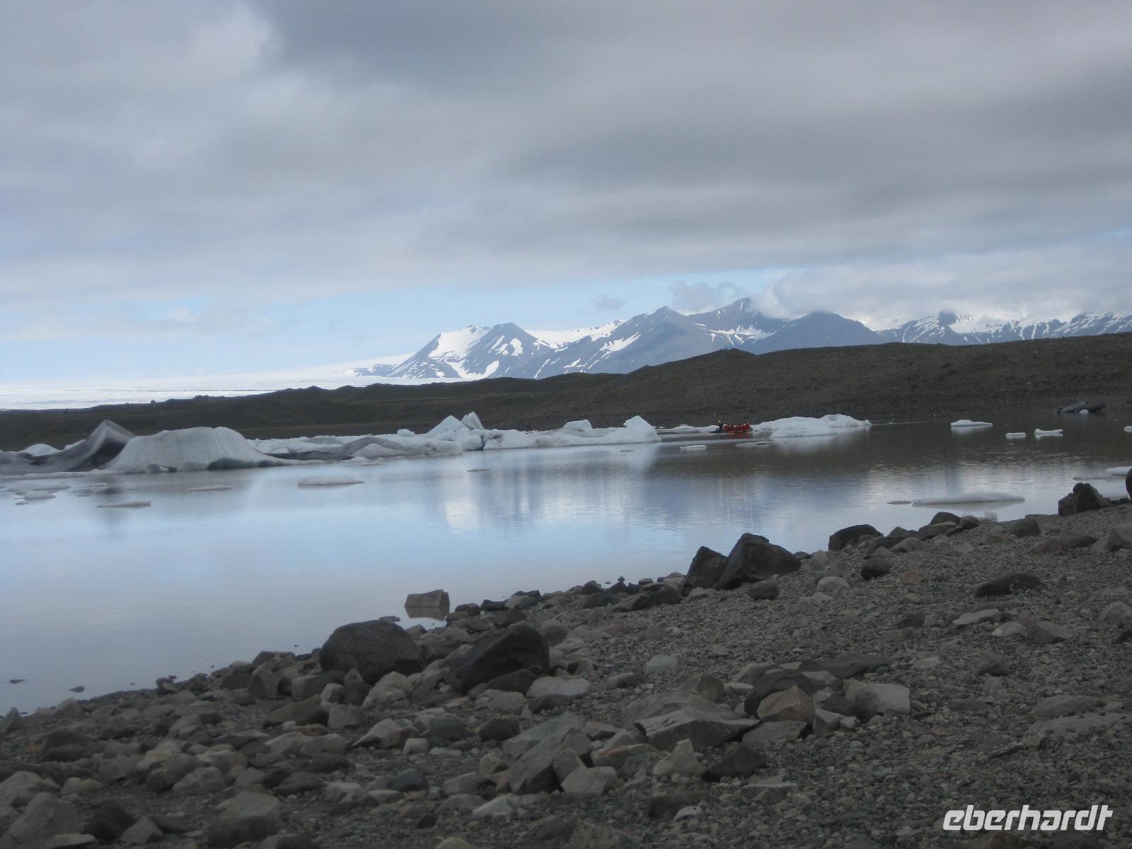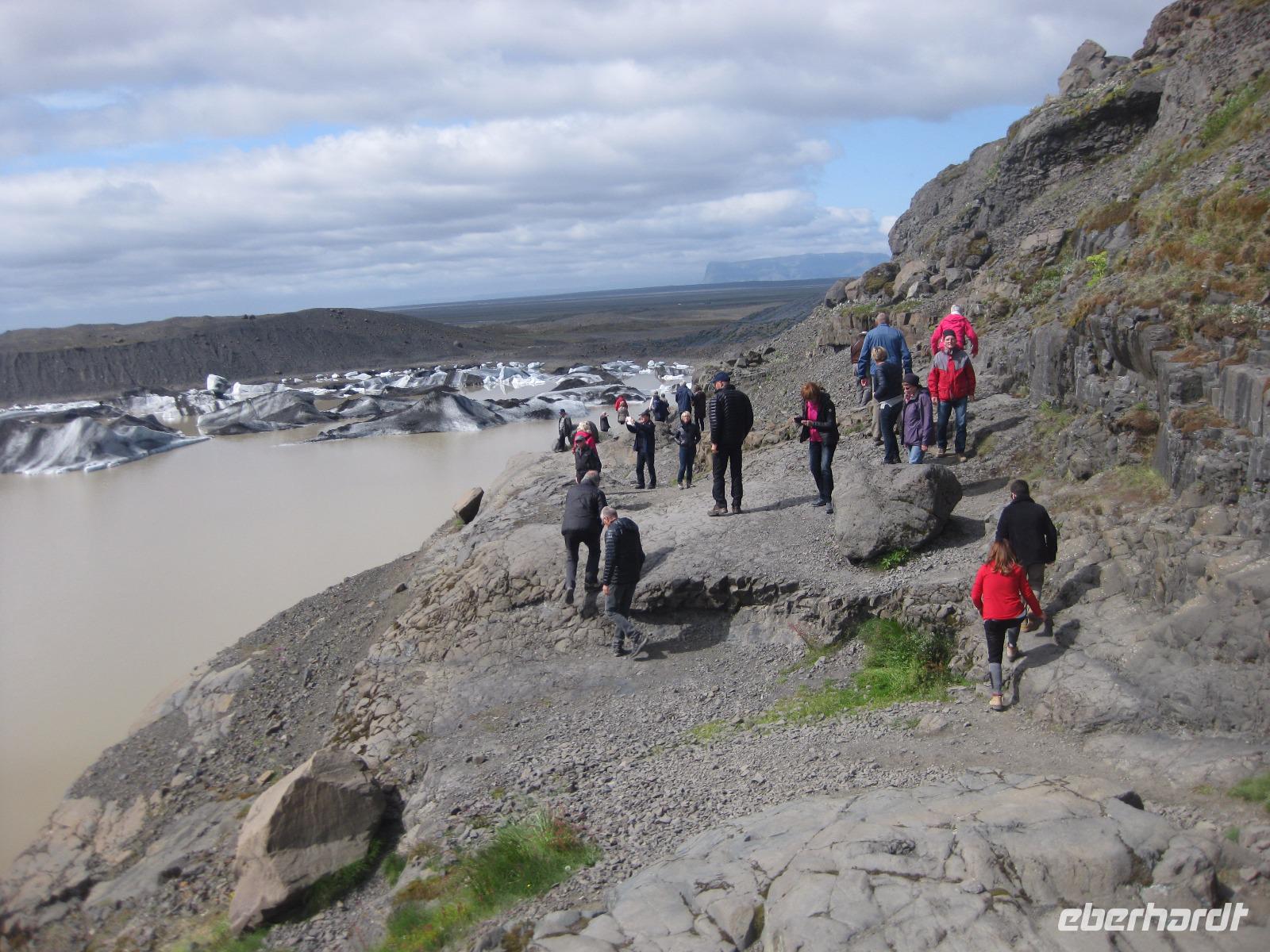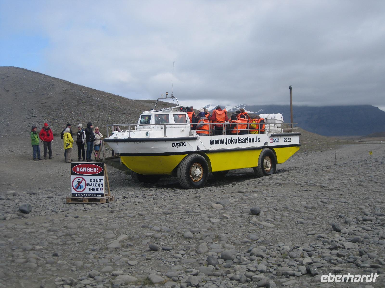 Planmäßig erreichen wir den Gletschersee Jökulsarlon - die "Gletscherlagune". Wir sind mit die ersten Gäste und deshalb geht es auch gleich zur Fahrt auf dem Gletschersee. Wir werden mit Amphibienfahrzeugen gefahren. Es gibt während der Fahrt auch Erklärungen. In dem See sind weiße, blaue und schwarze Eisberge. Wir werden ganz nah herangefahren. Ein "Serviceboot" bringt glasklares Gletschereis zu unserem Fahrzeug. Wir können eine Kostprobe nehmen. Nach der Fahrt auf der "Gletscherlagune" treffen wir uns alle an Land und nehmen eine Probe vom Brennevin, dem "Schwarzen Tod", dem berühmt berüchtigten Schnaps Islands mit Gletschereis. Eine super Überraschung, finden die Gäste.