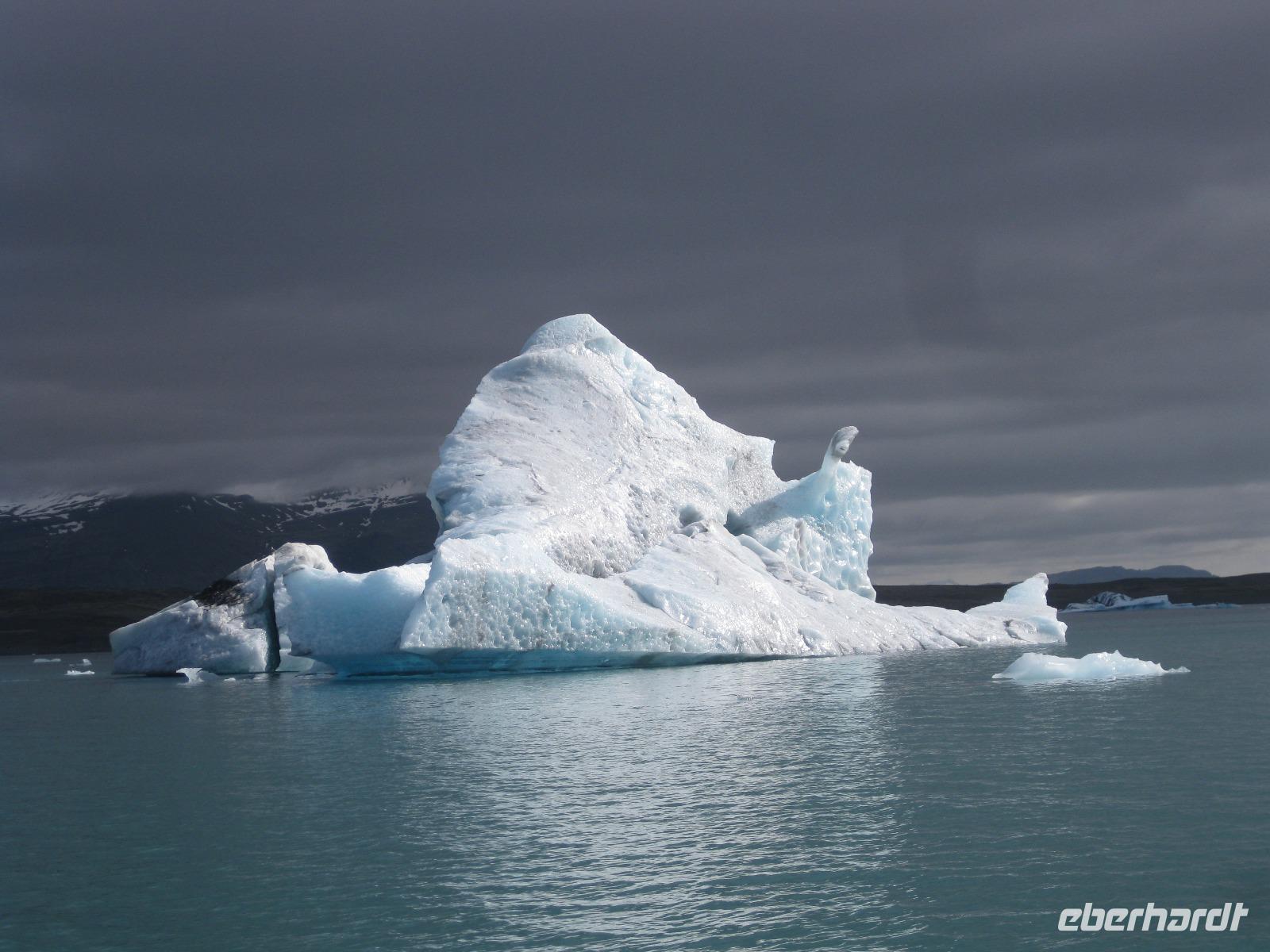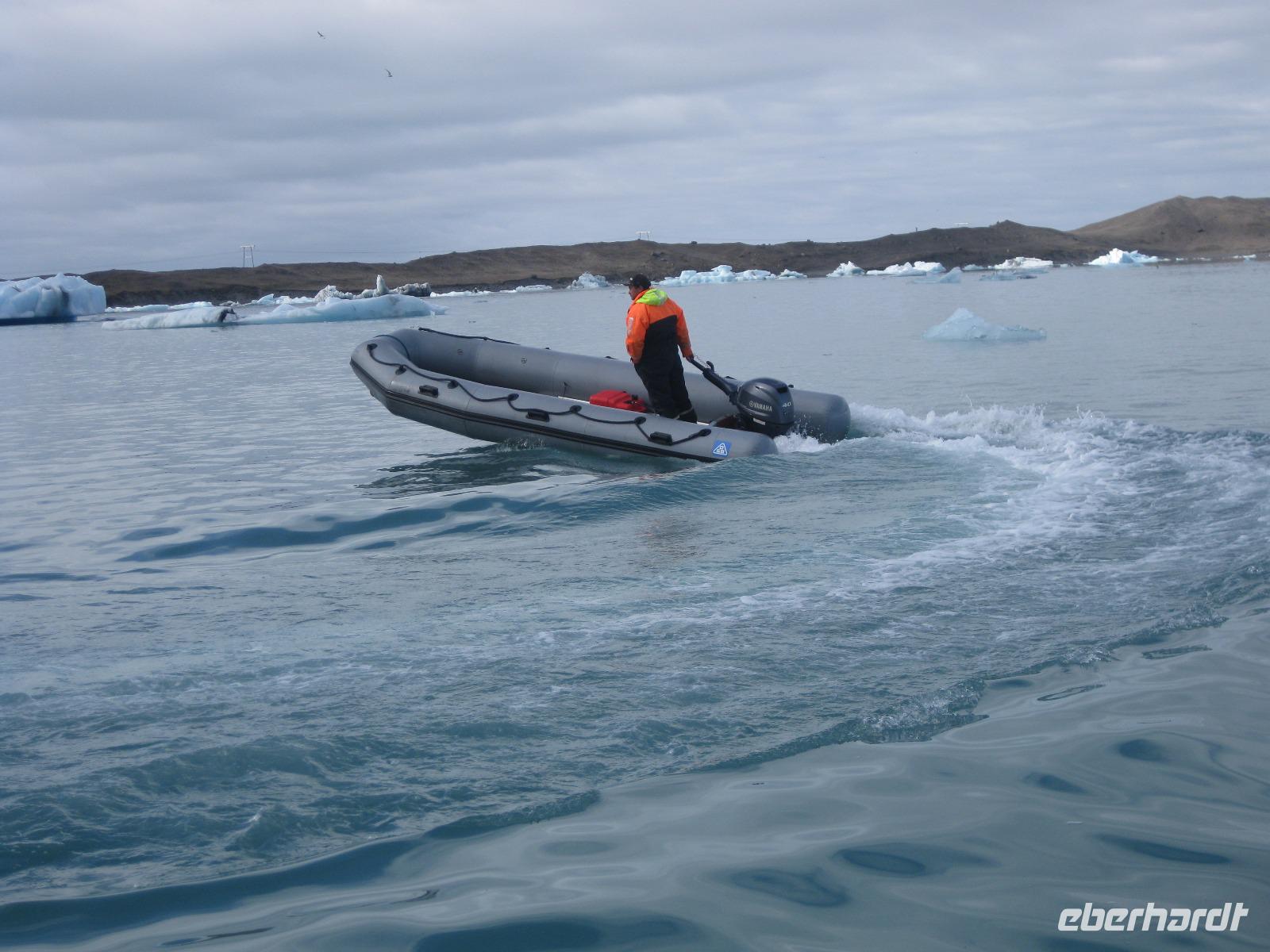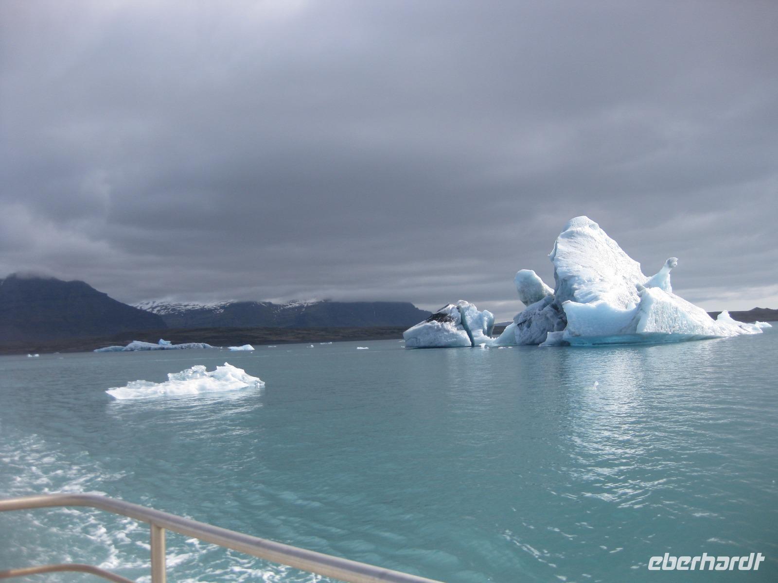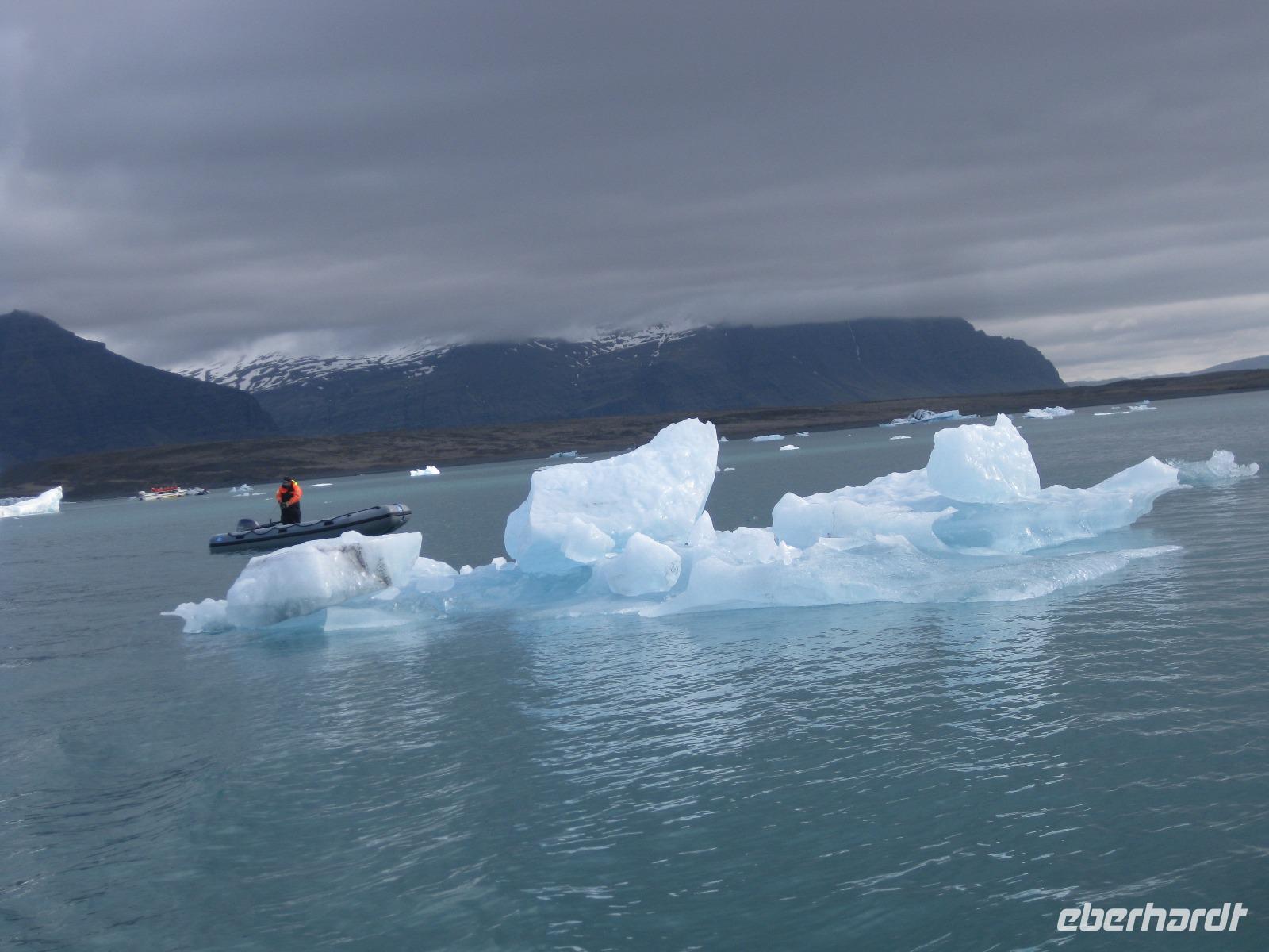 Planmäßig erreichen wir den Gletschersee Jökulsarlon - die "Gletscherlagune". Wir sind mit die ersten Gäste und deshalb geht es auch gleich zur Fahrt auf dem Gletschersee. Wir werden mit Amphibienfahrzeugen gefahren. Es gibt während der Fahrt auch Erklärungen. In dem See sind weiße, blaue und schwarze Eisberge. Wir werden ganz nah herangefahren. Ein "Serviceboot" bringt glasklares Gletschereis zu unserem Fahrzeug. Wir können eine Kostprobe nehmen. Nach der Fahrt auf der "Gletscherlagune" treffen wir uns alle an Land und nehmen eine Probe vom Brennevin, dem "Schwarzen Tod", dem berühmt berüchtigten Schnaps Islands mit Gletschereis. Eine super Überraschung, finden die Gäste.