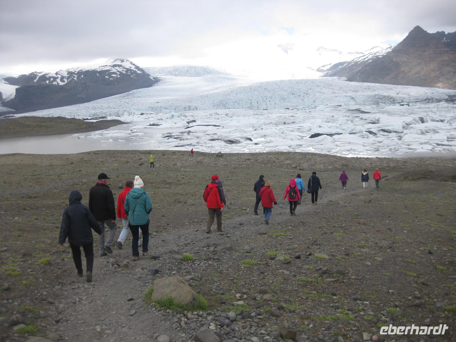 Auf unserer weiteren Fahrt besuchen wir noch einige Gletscherzungen mit Seen. Zum Teil können wir sogar hautnah ran. Nach der Mittagspause besuchen wir das Visitor-Center des Nationalparks Skaftafell. Hier gibt es eine Filmdokumentation über den Vulkanausbruch im Jahr 1996, eine Ausstellung und viel Informationsmaterial. Bei klarem Wetter kann man den höchsten Berg Islands, den vergletscherten Hvannadalshnukur mit seinen 2.119 Metern Höhe sehen.