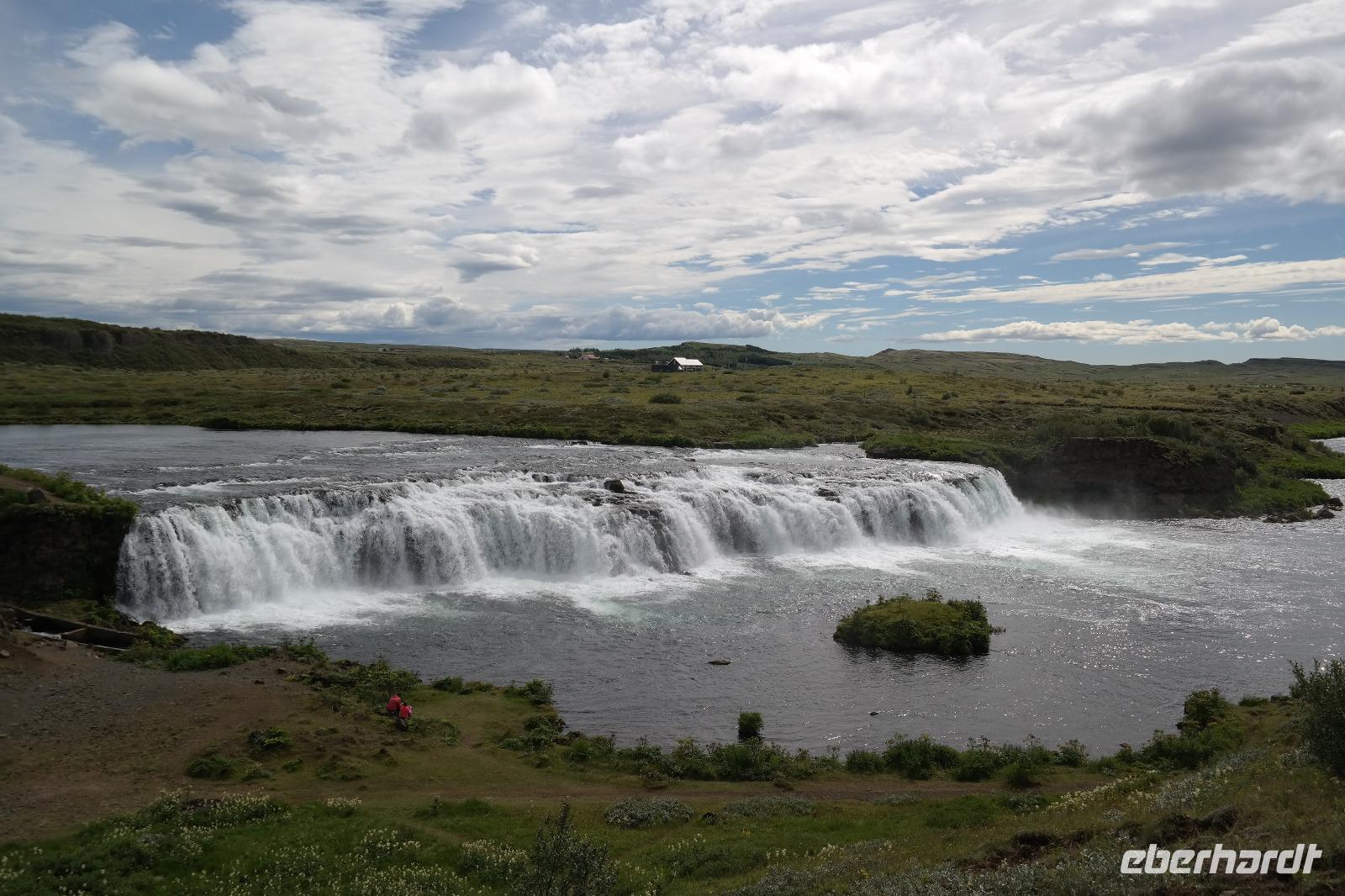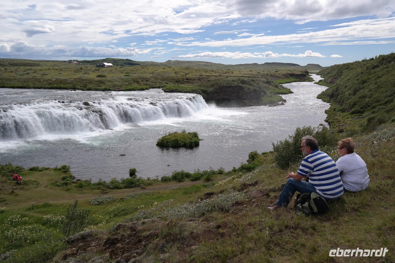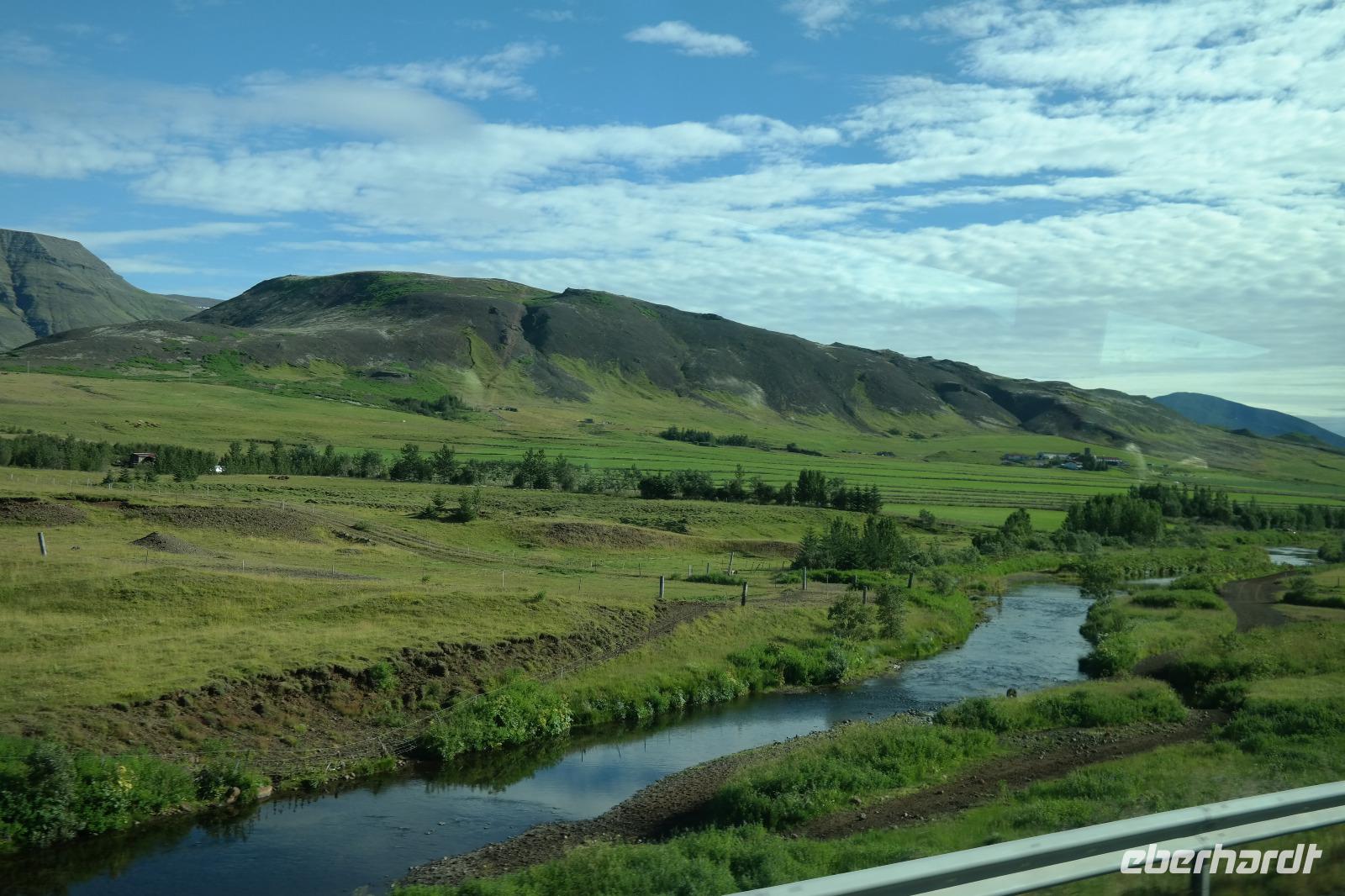 Unsere Weiterfahrt führt uns in eine Region, mit saftig grünen Bergwiesen und weiten Flussarmen. In diesem Gebiet werden seit jeher der Islandpferde gezüchtet. Hier können die Fohlen in den ersten vier Lebensjahren frei umherstreifen, ehe sie später gezähmt und zugeritten werden. Wir besuchen den Pferdehof von Anna und ihrer Familie. Anna erzählt uns vieles über die Islandpferde und stellt uns auch ihre Familie vor. Anschließend führt uns der Sohn auf seinem Islandpferd die fünf verschiedenen Gangarten dieser kleinen Pferderasse vor.