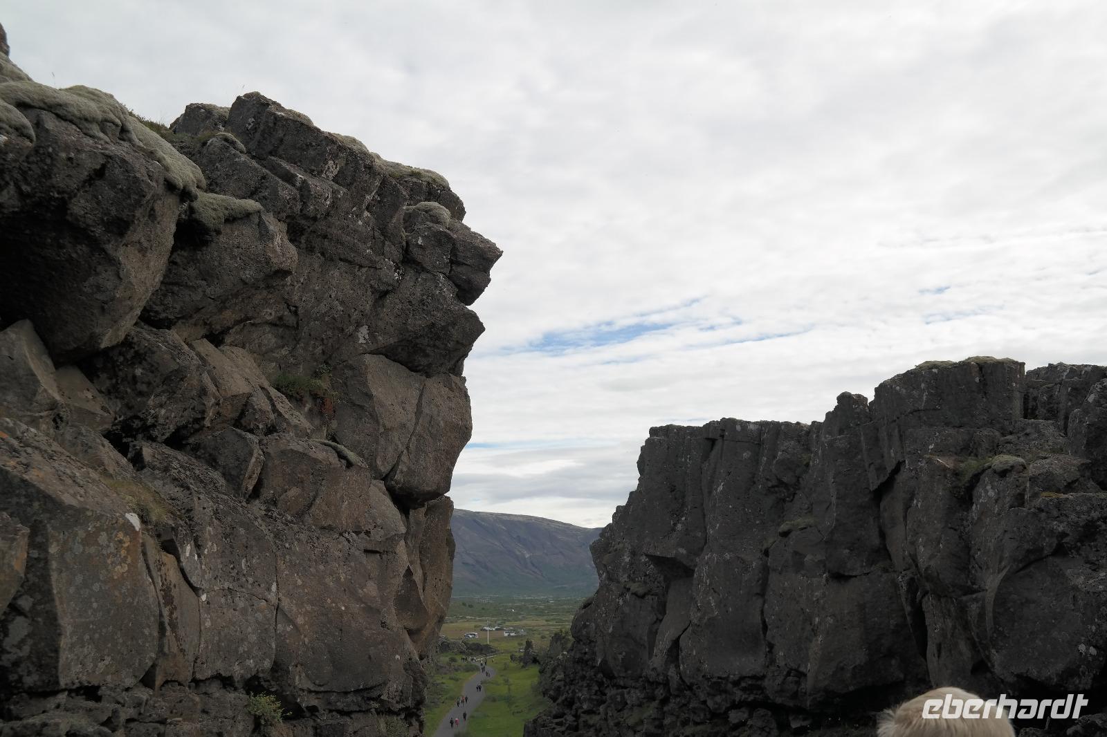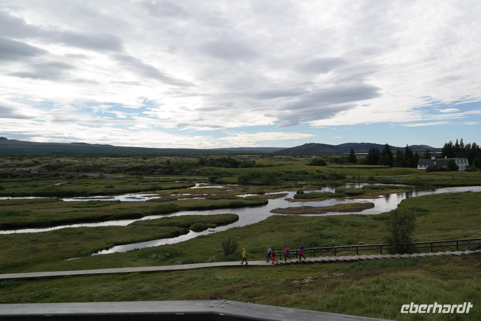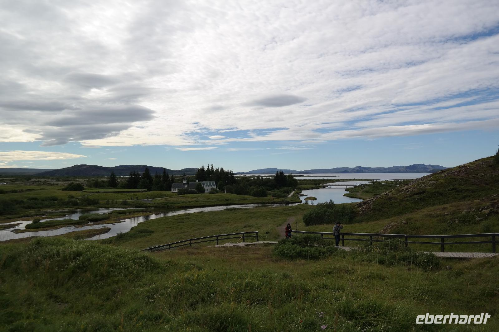 Pünktlich 09.00 Uhr starten wir mit unserem Reisebus. Schon nach kurzer Fahrzeit haben wir den etwas stärker besiedelten Großraum Reykjavik verlassen und sehen spärlich bewachsene Lava- und Hügellandschaften. Wir fahren weiter und erreichen den Thingvellir Nationalpark, wo wir eine kleine Wanderung unternehmen. Man sieht hier recht anschaulich, wie die Erde an dieser Stelle auseinander bricht. Hier wurde um 1000 die weltweit erste demokratische Regierung ausgerufen, ein Rat der verschiedenen Stämme der damaligen Inselbewohner.