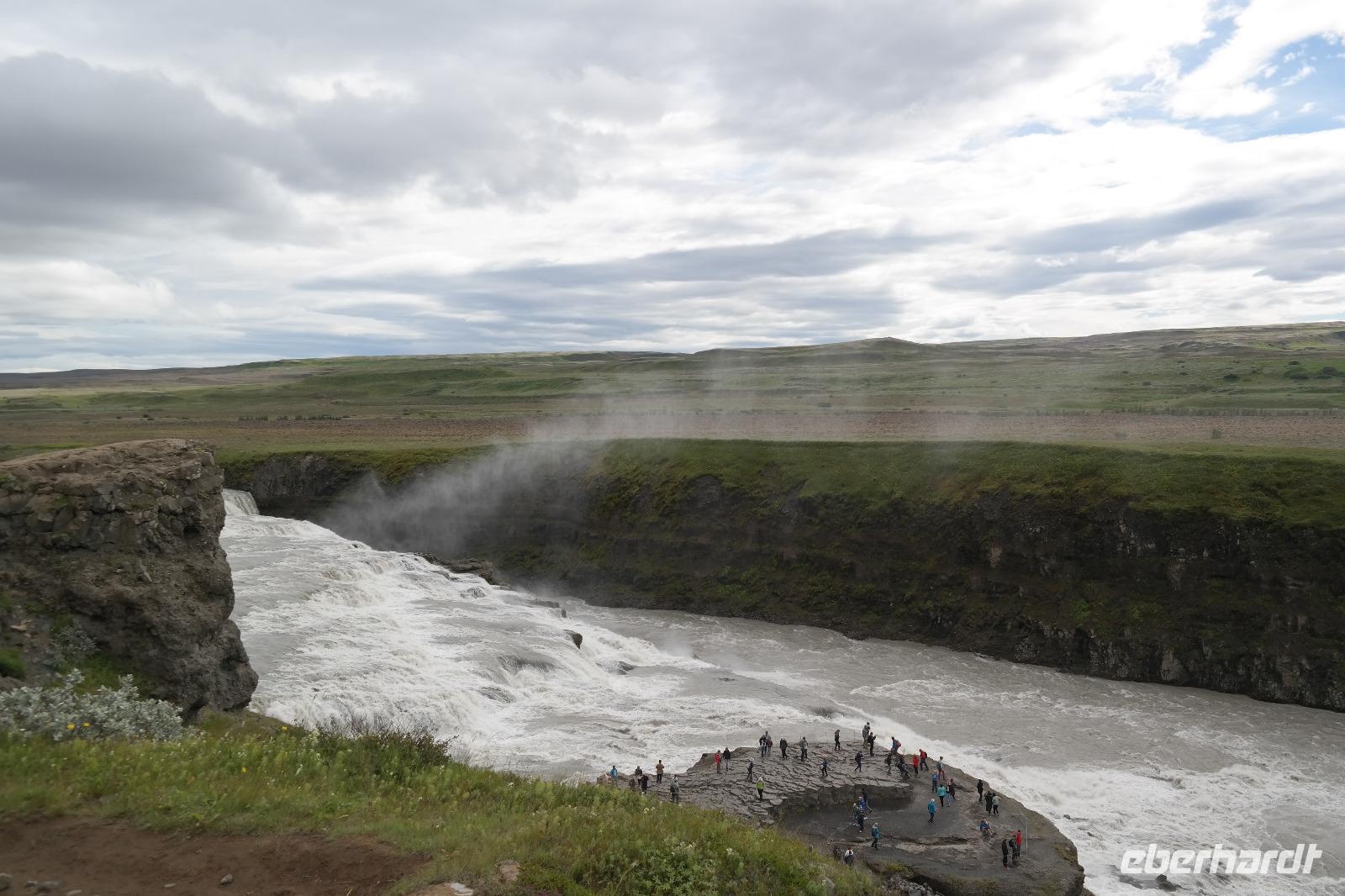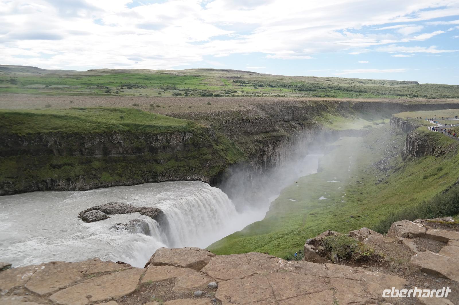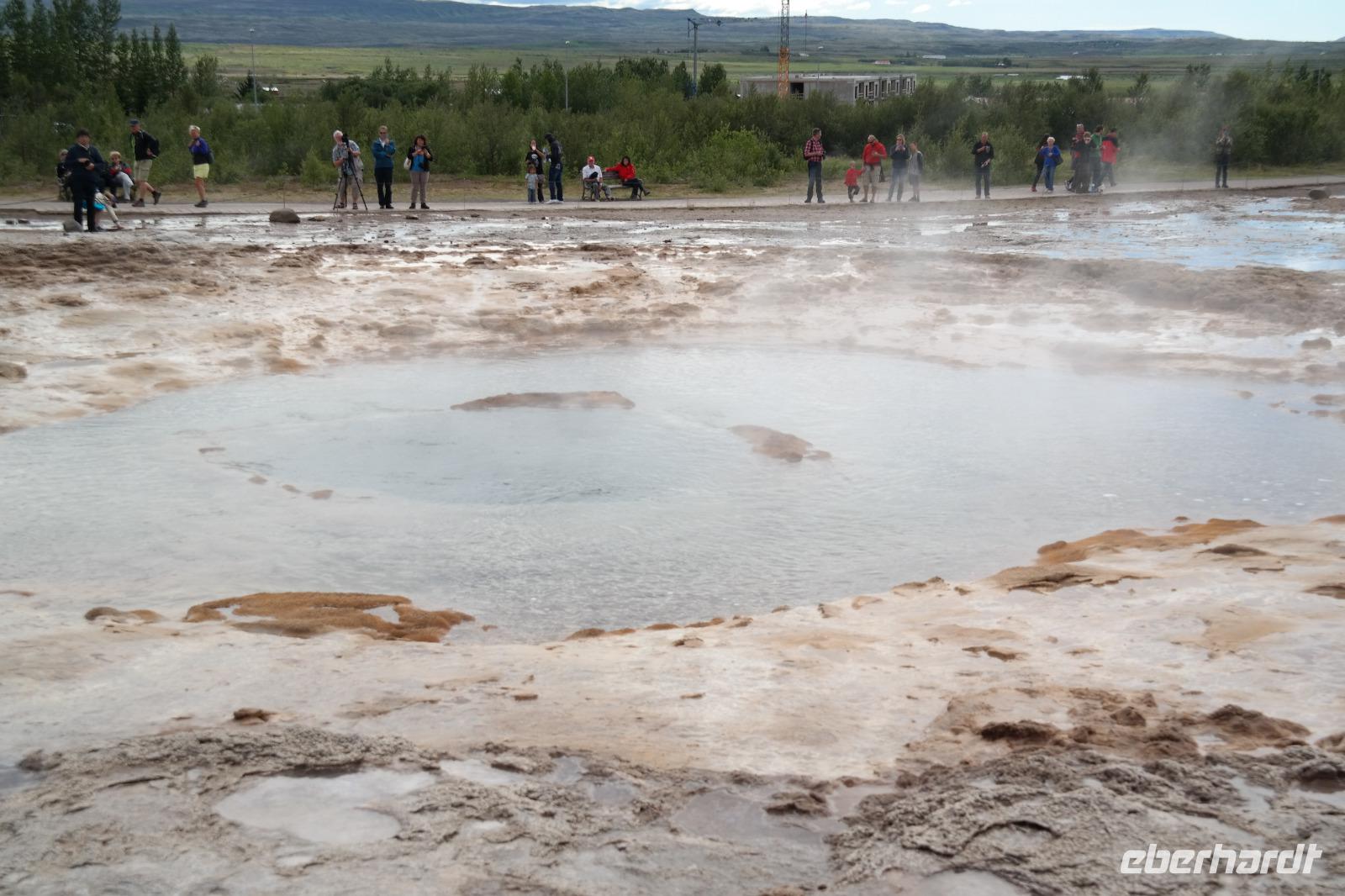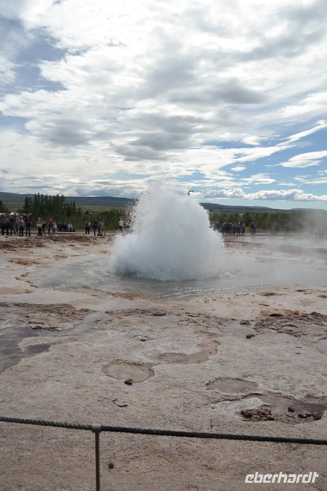 Anschließend fuhren wir weiter gen Ostern zum Wasserfall Gullfoss. Einzigartig stürzt der Wasserfall hier in zwei Stufen hinab in die Tiefe. Nach der Mittagspause fuhren wir weiter zum Geysir. Der Geysir Strokkur bringt alle 4-6 Minuten eine 20 - 30 m hohe Wassersäule hervor, die von den vielen fotografierenden Besuchern entsprechend akustisch gewürdigt wird. Neben weiteren heißen Quellen und viel Dampf bietet dieses Geothermalgebiet eine reizvolle Landschaft. Auf der Weiterfahrt legen wir noch einen Foto-Stopp an einem kleinen, aber sehr schönen Wasserfall ein. Die warmen Temperaturen und der strahlende Sonnenschein laden zum Verweilen ein. Am Nachmittag erreichen wir wieder unser Hotel im Herzen der Hauptstadt Reykjavik.