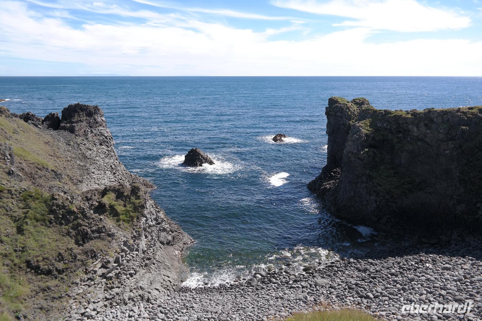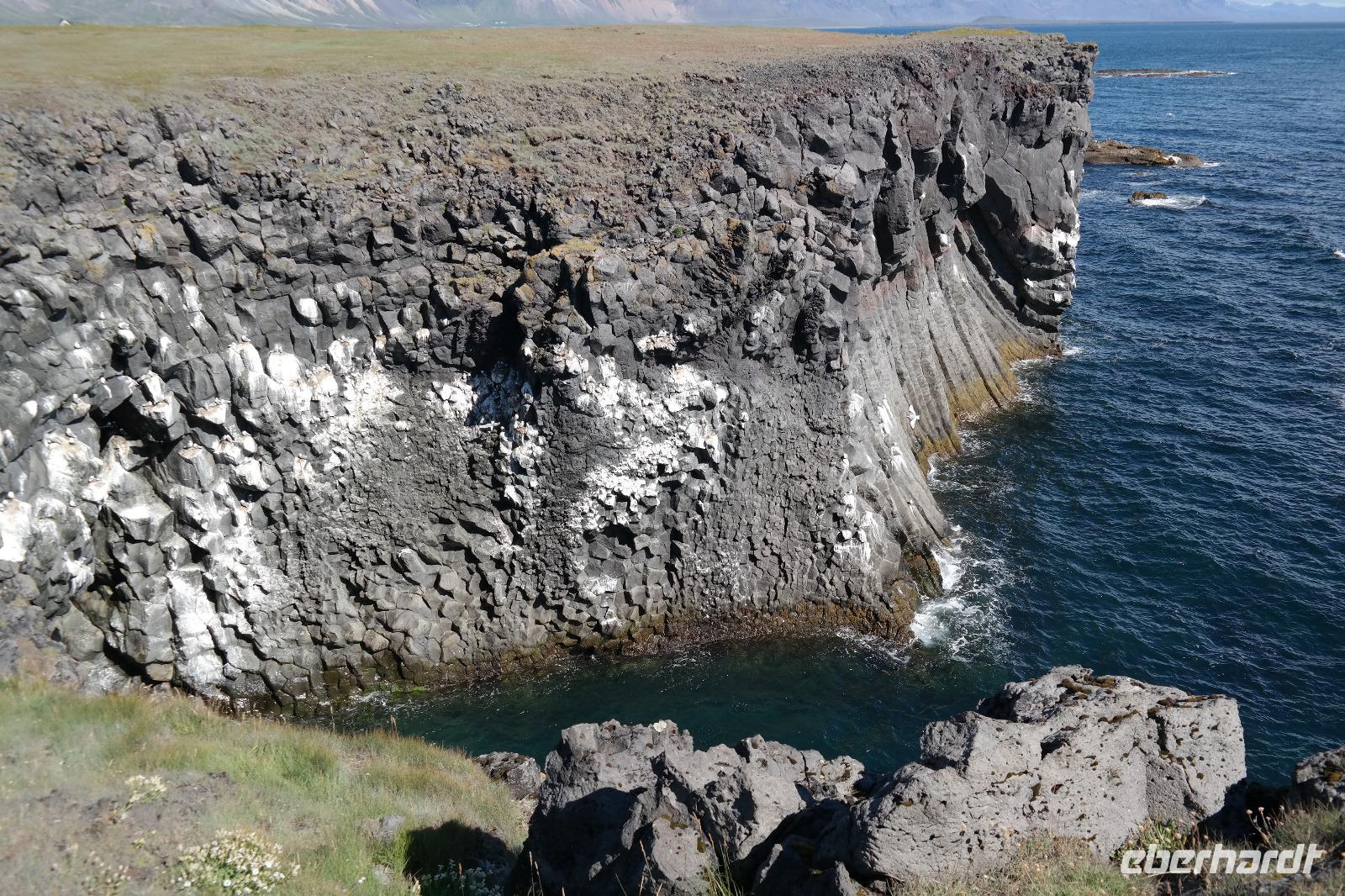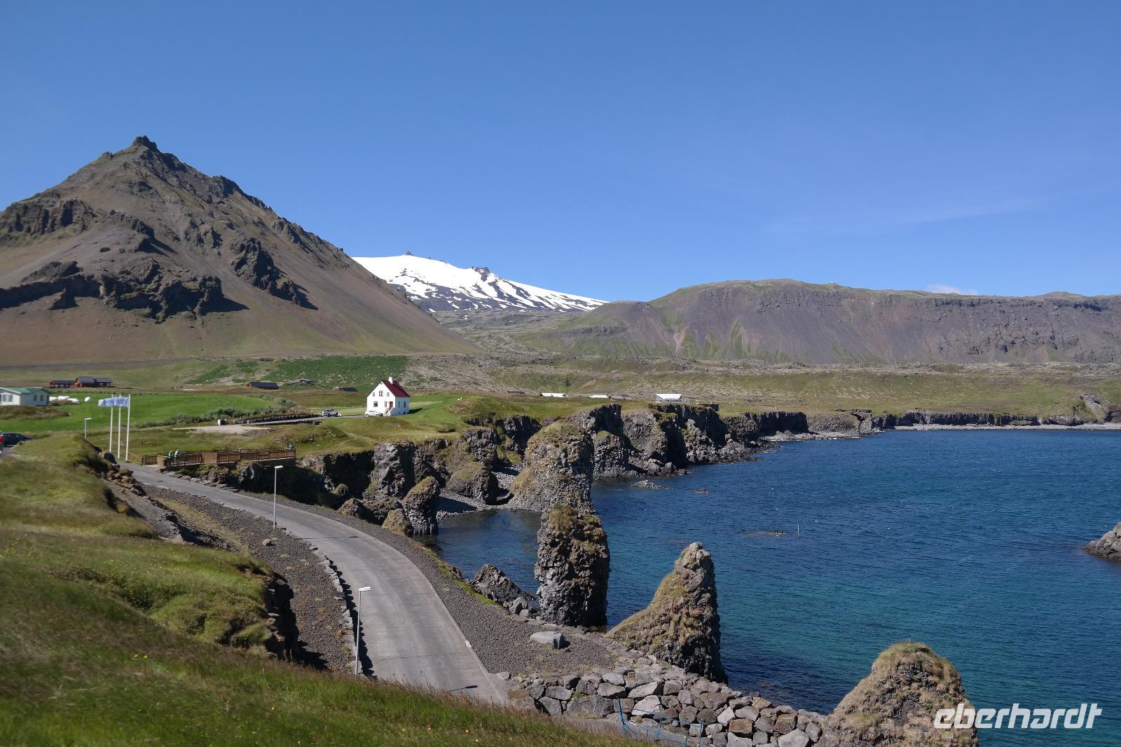 Am Morgen nehmen wir Abschied von Reykjavík. Wir fahren entlang der einzigartigen Landschaft und machen eine Pause in Borgarnes. Die Fahrt führt uns durch die wunderschöne Landschaft auf die Halbinsel Snaefellsnes. Es ging weiter nach Arnastapi an der Steilküste im Süden der Halbinsel. Wir wandern am Rand der Steilküste entlang und sind beeindruckt von den einzigartigen verschiedenen Vulkangesteinsformen. Basaltsäulen ragen in verschiedenen Varianten aus dem Meer oder bildeten die Steilküste. Lavaformationen sind zu erkennen, wie sie sich einst ihren Weg ins Meer gebahnt hatten. Das Meer hat sich große Löcher in die Küste gearbeitet an deren Wänden Möwen nisten. Bei schönstem isländischem Sommerwetter genießen wir die Aussicht. Bei Dritvik Djupalonssandur unternehmen wir eine kleine Wanderung hinunter zum Meer. Einige probieren sich an den Kraftsteinen, mit denen in früheren Zeiten die Männer ihre Kräfte maßen. Am Strand liegen noch Teile eines Schiffswracks, welches 1948 hier strandete. Nun legen wir unsere letzte Etappe bis zum kleinen Ort Stykkisholmur. Wir erreichen unser Hotel und nach einem schmackhaften Abendessen, erkunden wir den kleinen Ort.