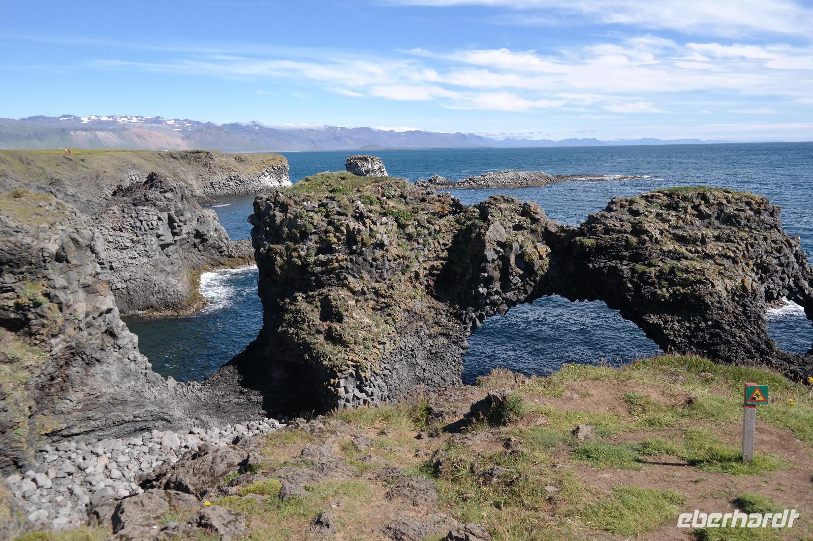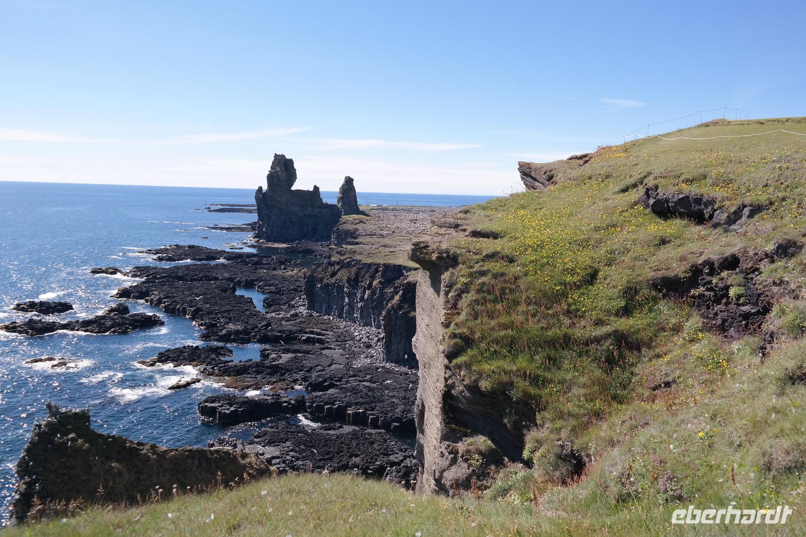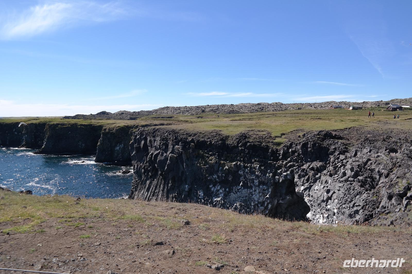 Am Morgen nehmen wir Abschied von Reykjavík. Wir fahren entlang der einzigartigen Landschaft und machen eine Pause in Borgarnes. Die Fahrt führt uns durch die wunderschöne Landschaft auf die Halbinsel Snaefellsnes. Es ging weiter nach Arnastapi an der Steilküste im Süden der Halbinsel. Wir wandern am Rand der Steilküste entlang und sind beeindruckt von den einzigartigen verschiedenen Vulkangesteinsformen. Basaltsäulen ragen in verschiedenen Varianten aus dem Meer oder bildeten die Steilküste. Lavaformationen sind zu erkennen, wie sie sich einst ihren Weg ins Meer gebahnt hatten. Das Meer hat sich große Löcher in die Küste gearbeitet an deren Wänden Möwen nisten. Bei schönstem isländischem Sommerwetter genießen wir die Aussicht. Bei Dritvik Djupalonssandur unternehmen wir eine kleine Wanderung hinunter zum Meer. Einige probieren sich an den Kraftsteinen, mit denen in früheren Zeiten die Männer ihre Kräfte maßen. Am Strand liegen noch Teile eines Schiffswracks, welches 1948 hier strandete. Nun legen wir unsere letzte Etappe bis zum kleinen Ort Stykkisholmur. Wir erreichen unser Hotel und nach einem schmackhaften Abendessen, erkunden wir den kleinen Ort.