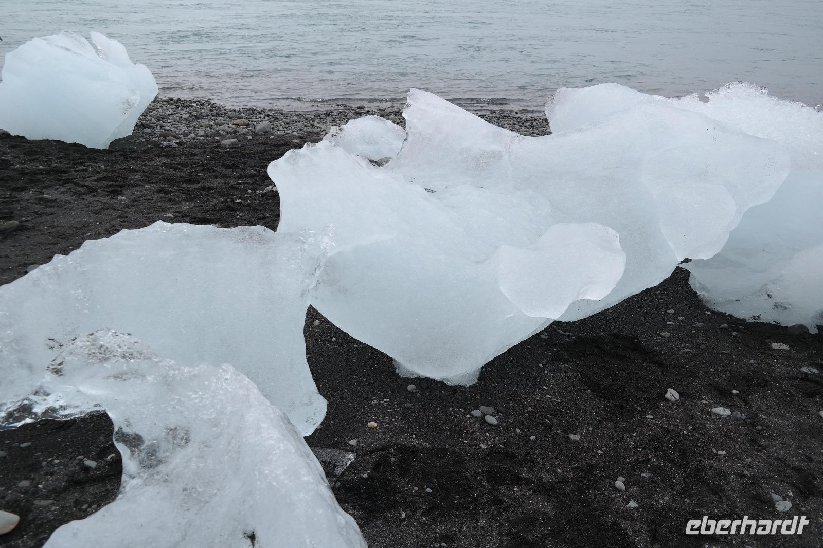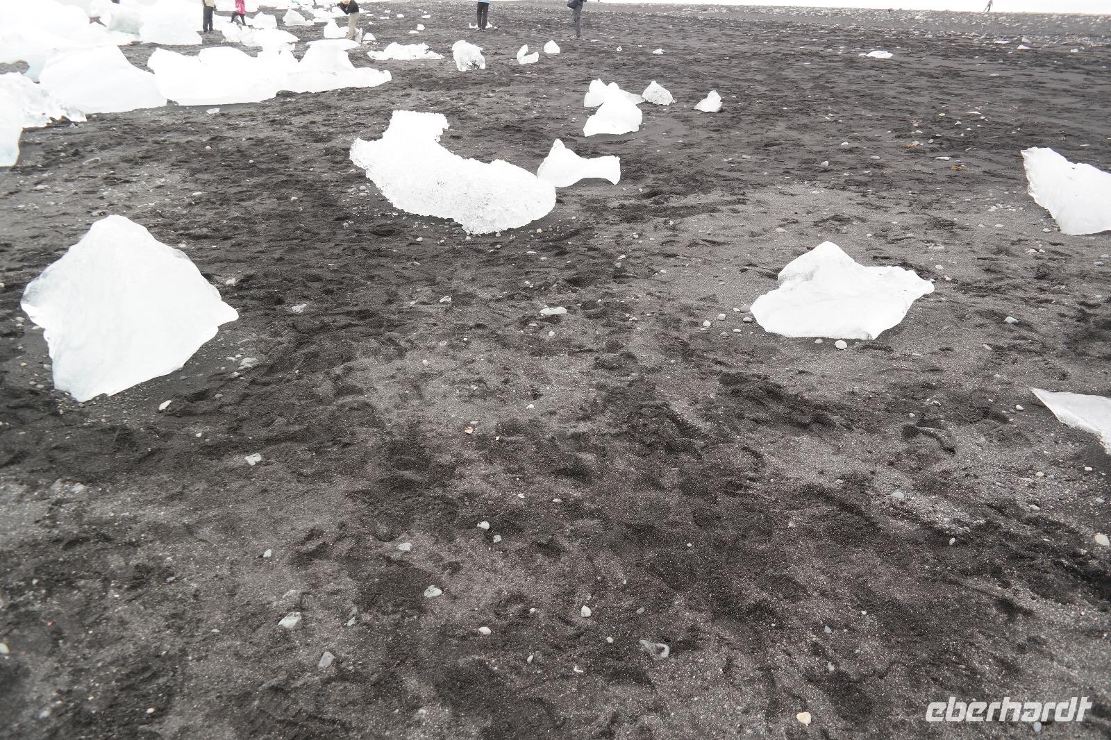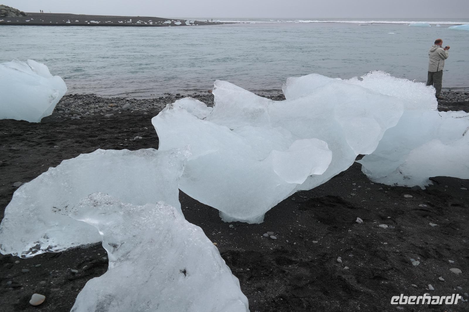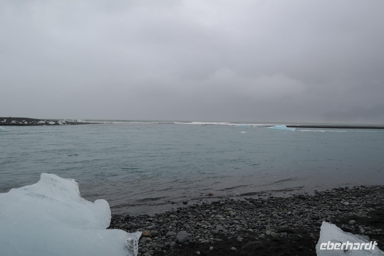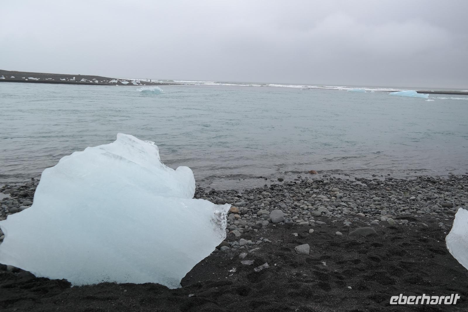 Unser heutiger Tag führt uns zur Gletscherlagune, in der die blauen Spitzen der Eisberge langsam in Richtung Meer schwimmen. Um 10 Uhr steigen wir auf ein Amphibienfahrzeug, das uns zuerst übers Land fährt, dann rollen die riesigen Räder ins Wasser und wir schwimmen zwischen den Eisbergen. Anschließend besuchen wir noch die Mündung des Gletscherflusses, wo wir noch einmal kurz zu einem Fotostopp aussteigen. Überall liegt das Gletschereis in kleinen Stückchen auf dem schwarzen Lavasand des Ufers.