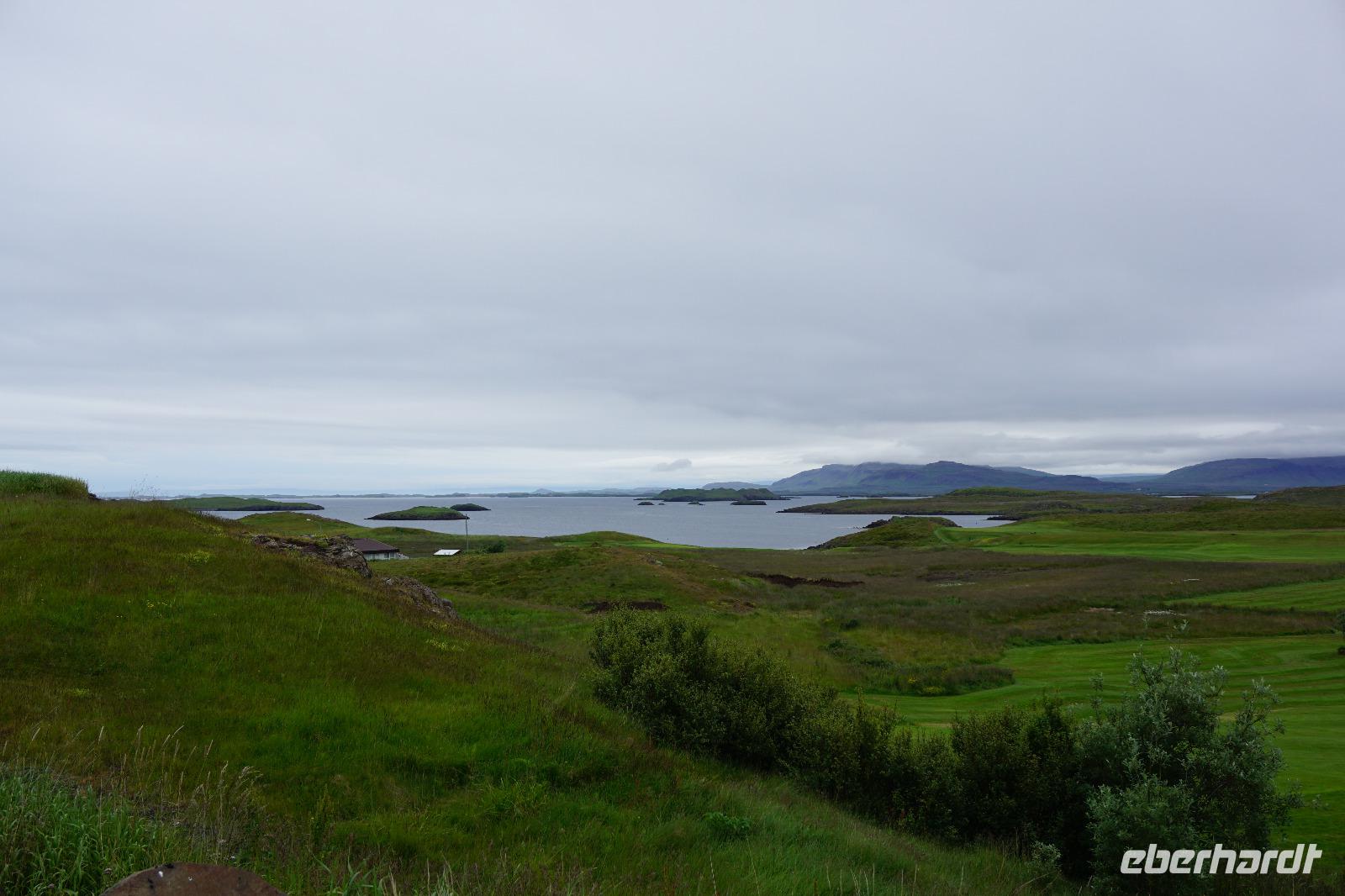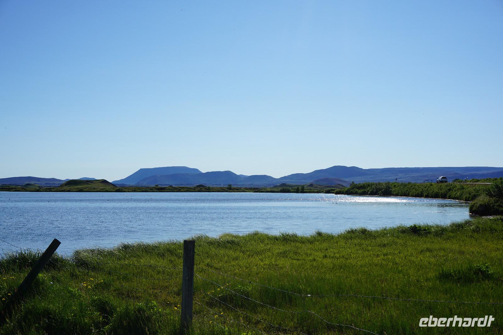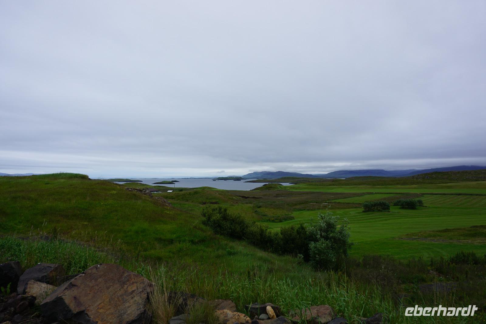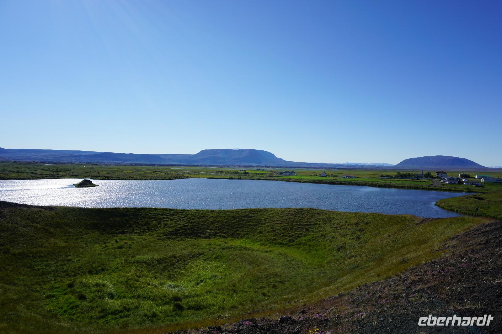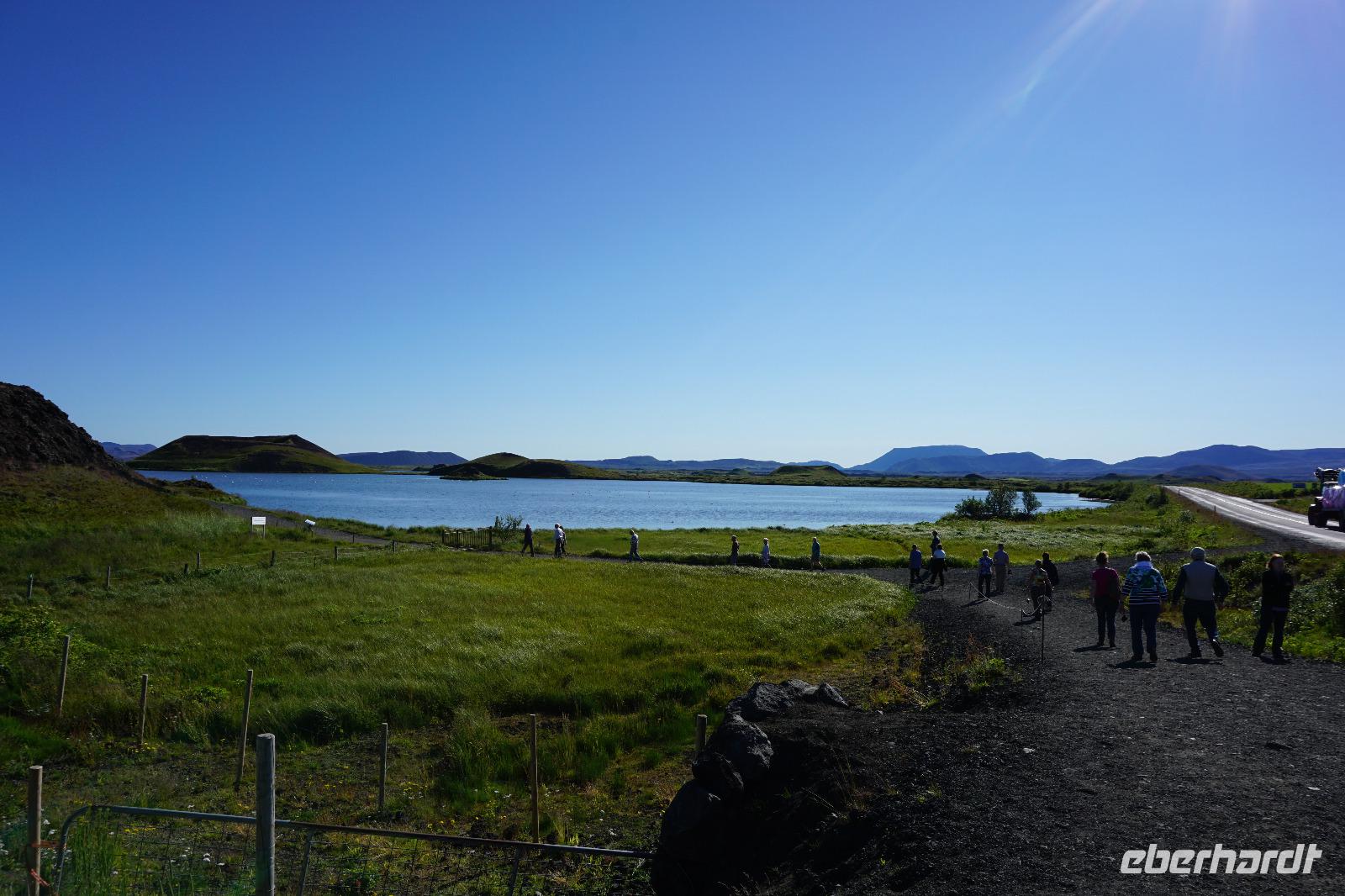 Heute fuhren wir zuerst zum Myvatn - dem Mückensee. Dort machten wir einen kleinen Spaziergang. Mit den Mücken hielt es aber sich zum Glück in Grenzen. Diese sind im Juli nicht ganz so aktiv wie im Juni oder August. Bei unserem Spaziergang konnten wir viele Pseudokrater bewundern und eine kleine Schafherde beobachten, die sich in den Schatten eines Heuballens zur Ruhe gelegt hatte. Anschließend fuhren wir in das Naturschutzgebiet Dimmuborgir, wo wir viele bizarre Steinsformationen sehen konnten. Es handelt sich hierbei um ein Lavafeld und die Überreste eines Lavasees. Danach ging es weiter nach Jarbödin, wo die Möglichkeit bestand ein Bad in den heißen Quellen zu nehmen und in vielen gesunden Mineralien zu entspannen. Nach dem Mittag setzten wir unseren Weg zum Hochtemperaturgebiet Namaskard fort. Dort gab es viele farbenprächtige Gesteine, Schlammquellen und Solfatoren zu bestauen. Allerdings liegt auch der Geruch von faulen Eiern in der Luft. Am Krafla machten wir später auch noch einen kleinen Fotostopp. Unser nächstes Ziel war der kraftvolle Wasserfall Dettifoss. Hier stürzen gewaltige Mengen grauen Wassers über eine rund hundert Meter breite Stufe. Ein Stück weiter oben konnte man auch den um einiges kleineren Wasserfall Selfoss sehen. Anschließend fuhren wir zu unserem nächsten Übernachtungsort - Egilsstadir. Die Stadt entwickelte sich erst vor ca. sechzig Jahren aus einem Großgehöft.