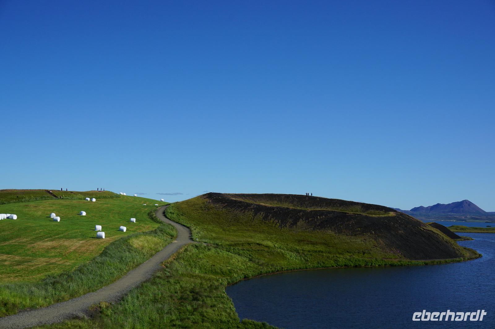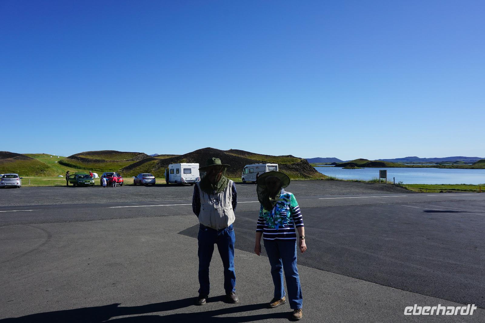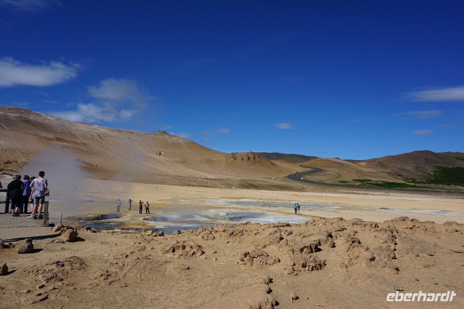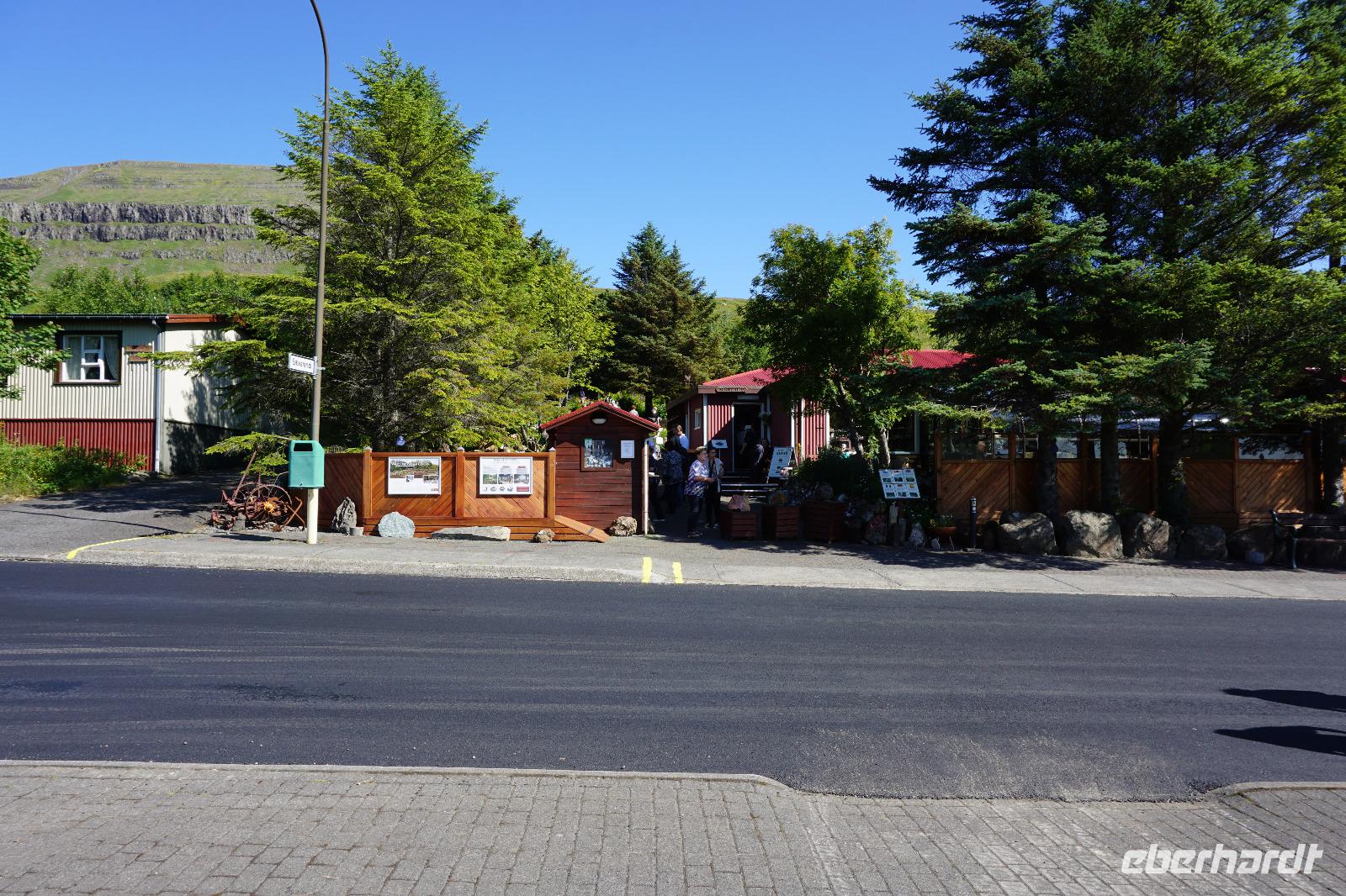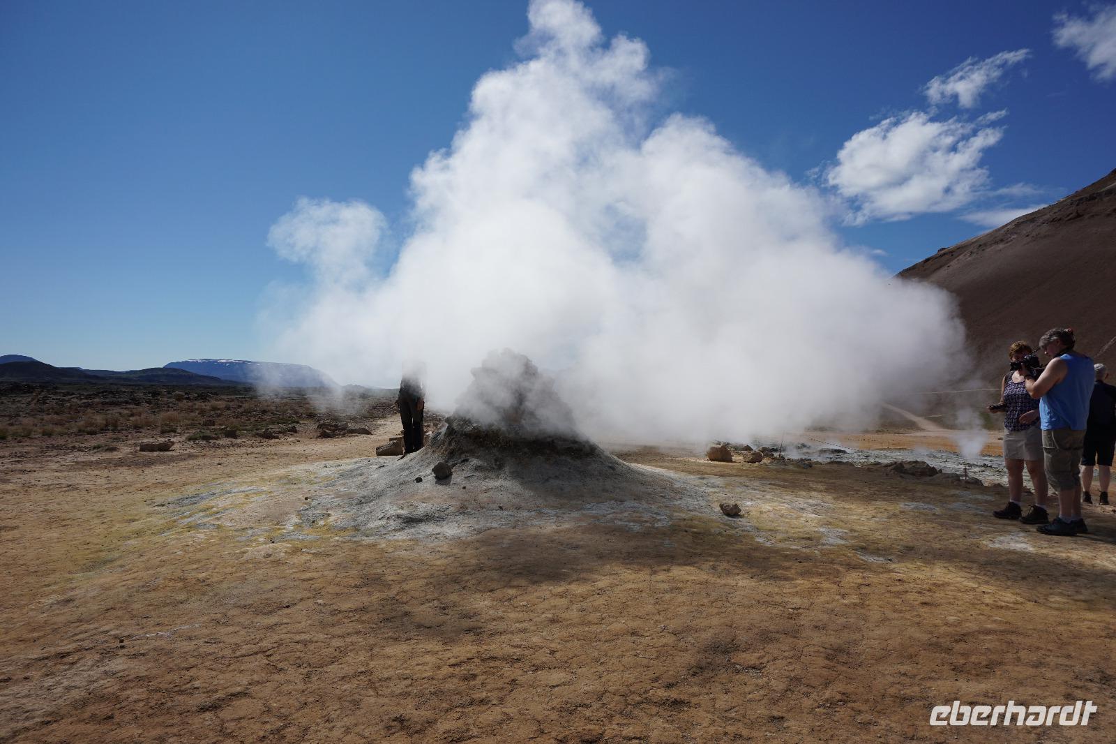 Heute fuhren wir zuerst zum Myvatn - dem Mückensee. Dort machten wir einen kleinen Spaziergang. Mit den Mücken hielt es aber sich zum Glück in Grenzen. Diese sind im Juli nicht ganz so aktiv wie im Juni oder August. Bei unserem Spaziergang konnten wir viele Pseudokrater bewundern und eine kleine Schafherde beobachten, die sich in den Schatten eines Heuballens zur Ruhe gelegt hatte. Anschließend fuhren wir in das Naturschutzgebiet Dimmuborgir, wo wir viele bizarre Steinsformationen sehen konnten. Es handelt sich hierbei um ein Lavafeld und die Überreste eines Lavasees. Danach ging es weiter nach Jarbödin, wo die Möglichkeit bestand ein Bad in den heißen Quellen zu nehmen und in vielen gesunden Mineralien zu entspannen. Nach dem Mittag setzten wir unseren Weg zum Hochtemperaturgebiet Namaskard fort. Dort gab es viele farbenprächtige Gesteine, Schlammquellen und Solfatoren zu bestauen. Allerdings liegt auch der Geruch von faulen Eiern in der Luft. Am Krafla machten wir später auch noch einen kleinen Fotostopp. Unser nächstes Ziel war der kraftvolle Wasserfall Dettifoss. Hier stürzen gewaltige Mengen grauen Wassers über eine rund hundert Meter breite Stufe. Ein Stück weiter oben konnte man auch den um einiges kleineren Wasserfall Selfoss sehen. Anschließend fuhren wir zu unserem nächsten Übernachtungsort - Egilsstadir. Die Stadt entwickelte sich erst vor ca. sechzig Jahren aus einem Großgehöft.