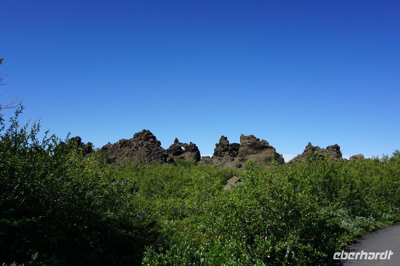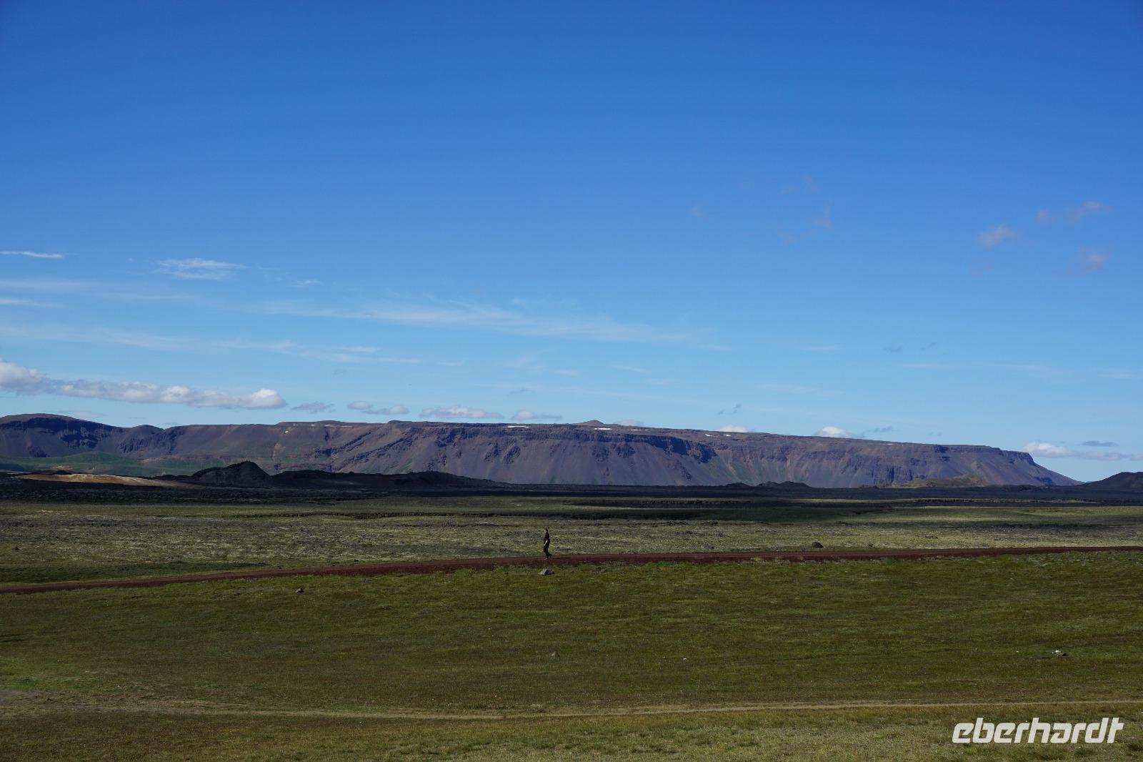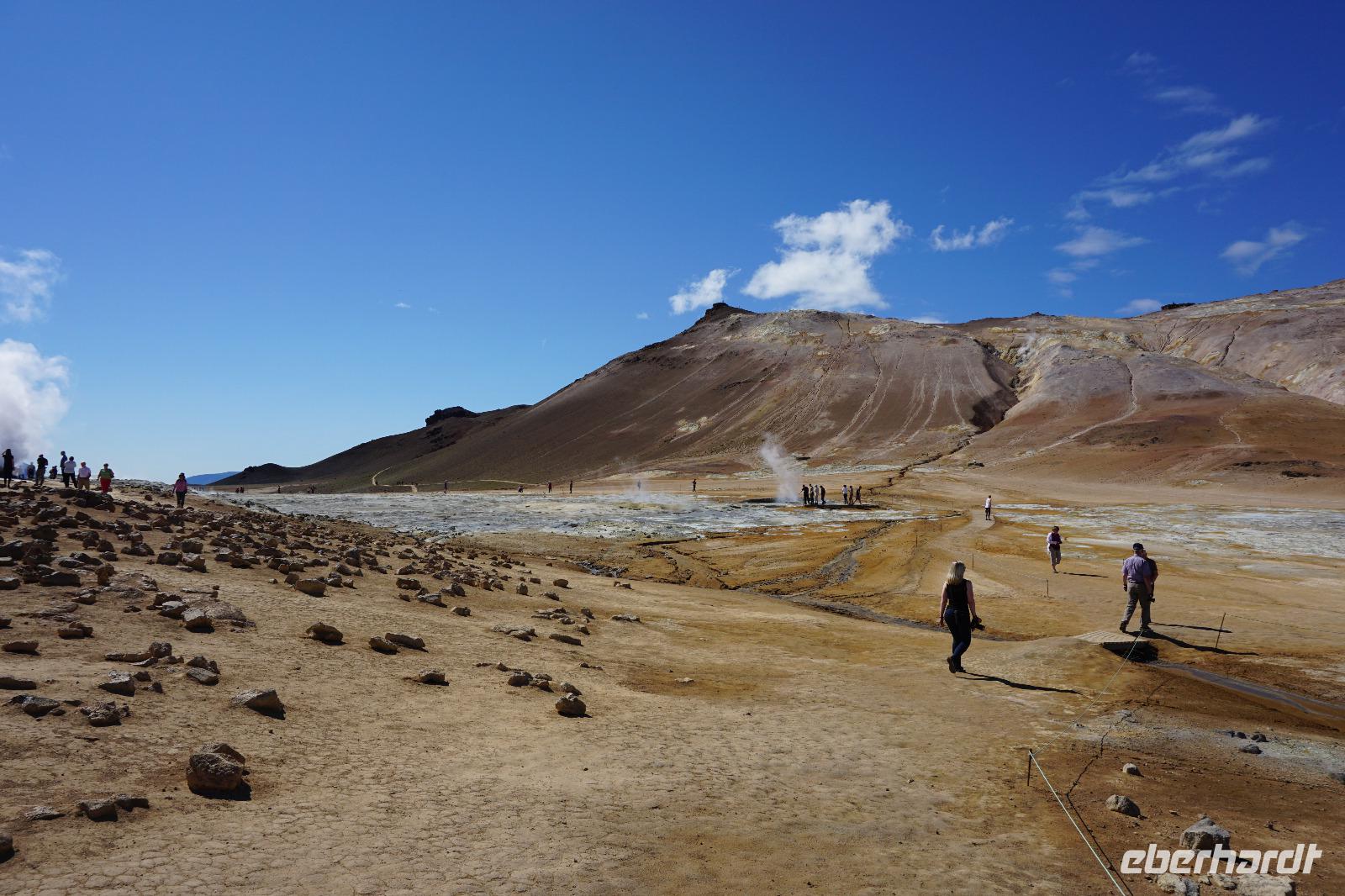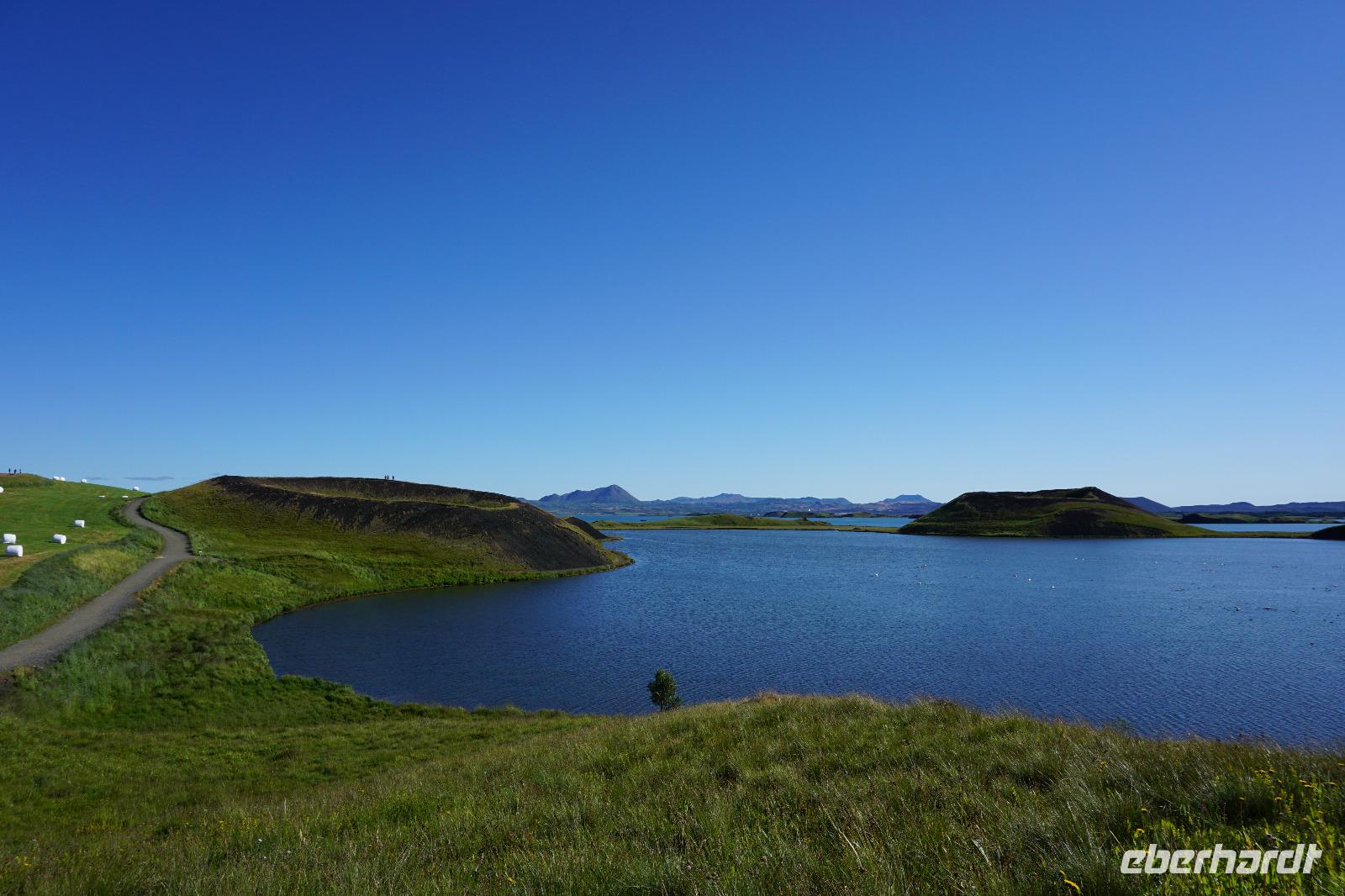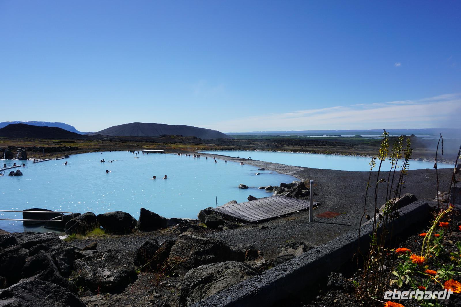 Heute fuhren wir zuerst zum Myvatn - dem Mückensee. Dort machten wir einen kleinen Spaziergang. Mit den Mücken hielt es aber sich zum Glück in Grenzen. Diese sind im Juli nicht ganz so aktiv wie im Juni oder August. Bei unserem Spaziergang konnten wir viele Pseudokrater bewundern und eine kleine Schafherde beobachten, die sich in den Schatten eines Heuballens zur Ruhe gelegt hatte. Anschließend fuhren wir in das Naturschutzgebiet Dimmuborgir, wo wir viele bizarre Steinsformationen sehen konnten. Es handelt sich hierbei um ein Lavafeld und die Überreste eines Lavasees. Danach ging es weiter nach Jarbödin, wo die Möglichkeit bestand ein Bad in den heißen Quellen zu nehmen und in vielen gesunden Mineralien zu entspannen. Nach dem Mittag setzten wir unseren Weg zum Hochtemperaturgebiet Namaskard fort. Dort gab es viele farbenprächtige Gesteine, Schlammquellen und Solfatoren zu bestauen. Allerdings liegt auch der Geruch von faulen Eiern in der Luft. Am Krafla machten wir später auch noch einen kleinen Fotostopp. Unser nächstes Ziel war der kraftvolle Wasserfall Dettifoss. Hier stürzen gewaltige Mengen grauen Wassers über eine rund hundert Meter breite Stufe. Ein Stück weiter oben konnte man auch den um einiges kleineren Wasserfall Selfoss sehen. Anschließend fuhren wir zu unserem nächsten Übernachtungsort - Egilsstadir. Die Stadt entwickelte sich erst vor ca. sechzig Jahren aus einem Großgehöft.