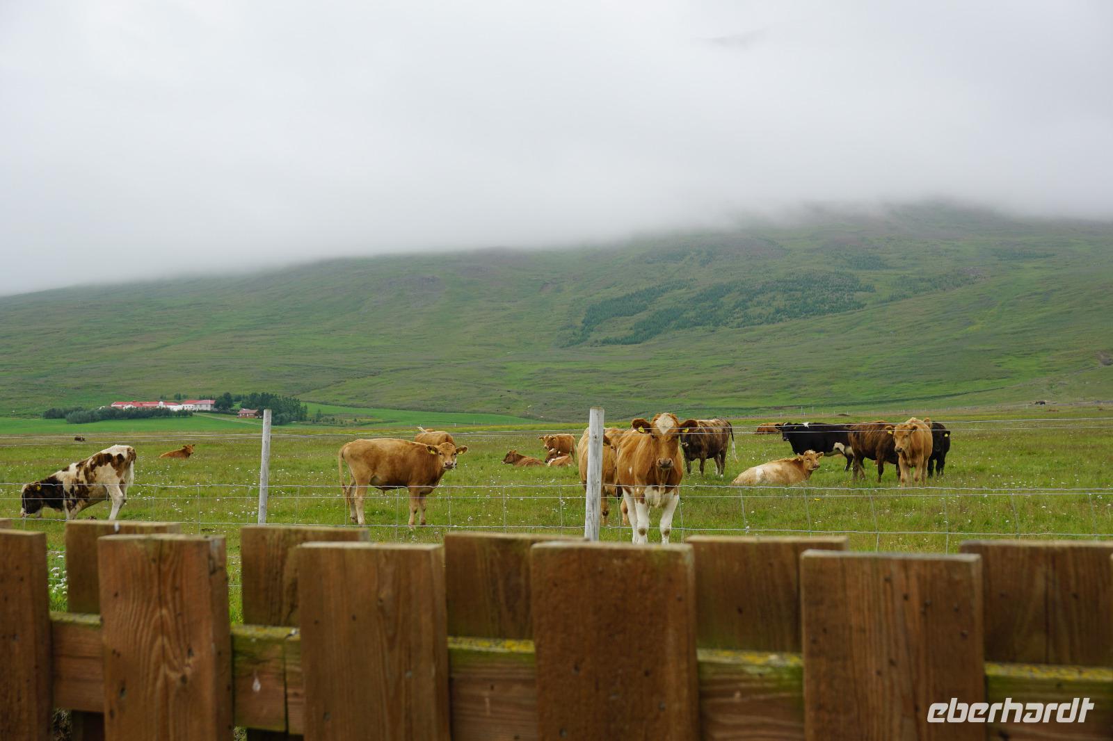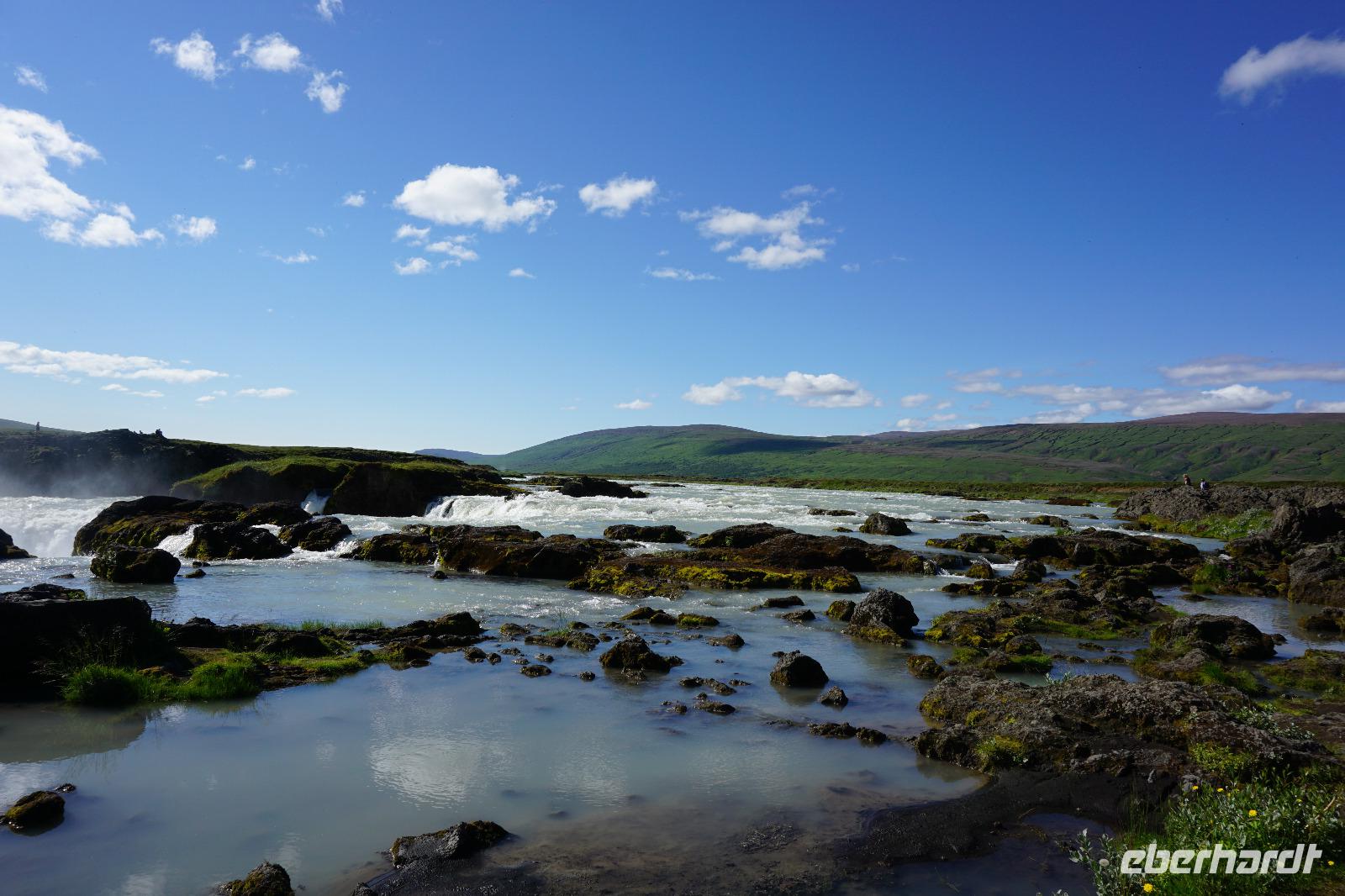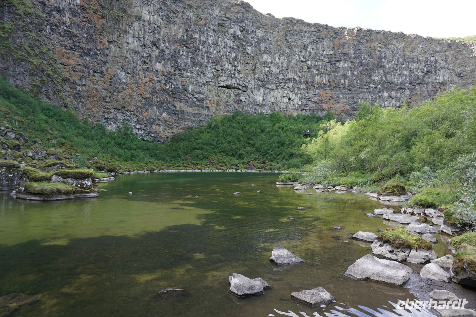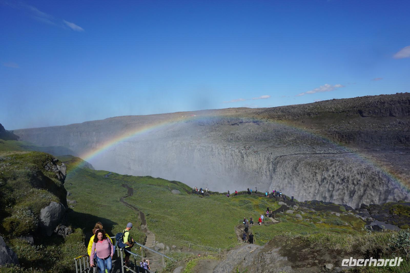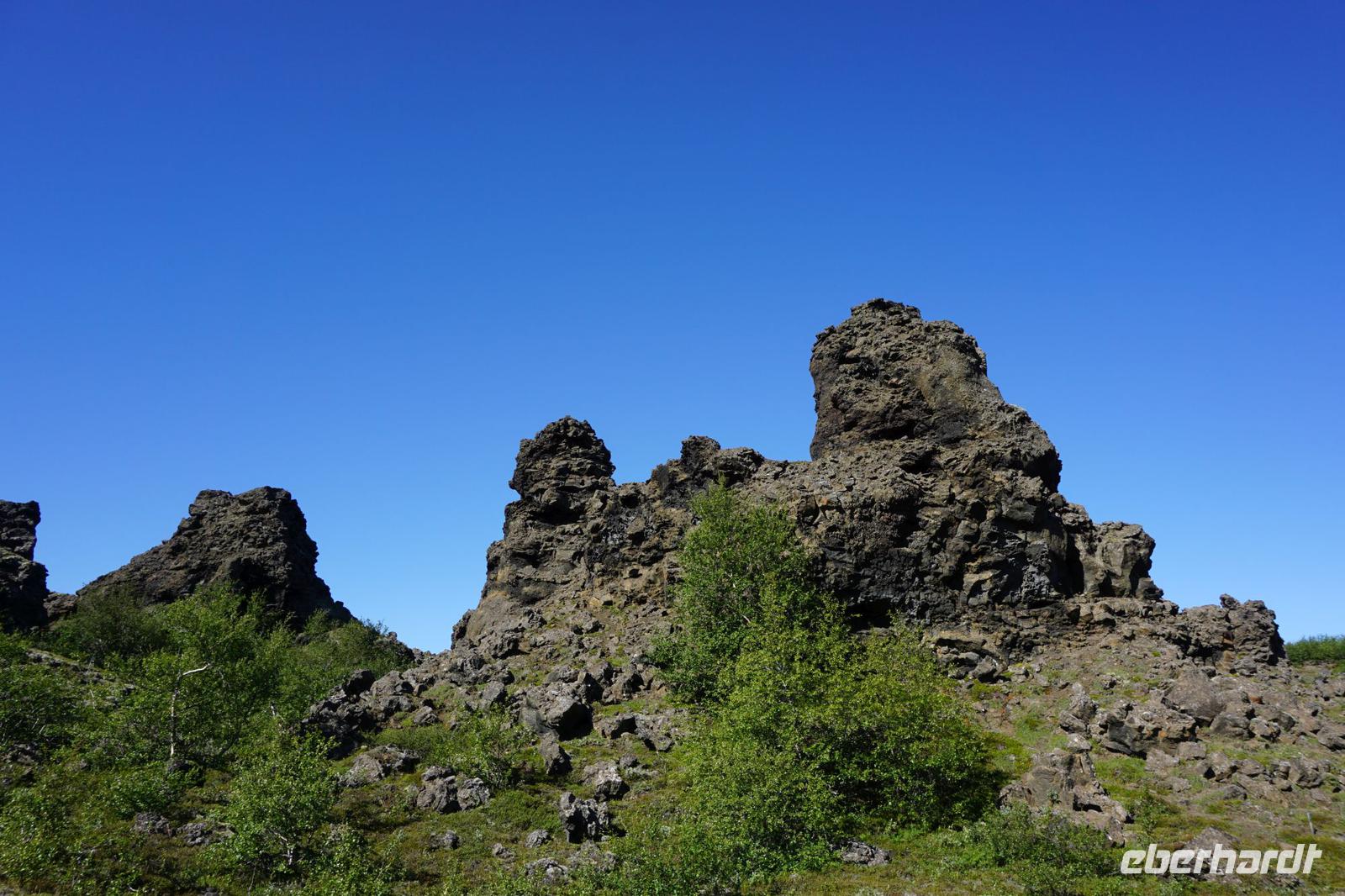 Heute fuhren wir zuerst zum Myvatn - dem Mückensee. Dort machten wir einen kleinen Spaziergang. Mit den Mücken hielt es aber sich zum Glück in Grenzen. Diese sind im Juli nicht ganz so aktiv wie im Juni oder August. Bei unserem Spaziergang konnten wir viele Pseudokrater bewundern und eine kleine Schafherde beobachten, die sich in den Schatten eines Heuballens zur Ruhe gelegt hatte. Anschließend fuhren wir in das Naturschutzgebiet Dimmuborgir, wo wir viele bizarre Steinsformationen sehen konnten. Es handelt sich hierbei um ein Lavafeld und die Überreste eines Lavasees. Danach ging es weiter nach Jarbödin, wo die Möglichkeit bestand ein Bad in den heißen Quellen zu nehmen und in vielen gesunden Mineralien zu entspannen. Nach dem Mittag setzten wir unseren Weg zum Hochtemperaturgebiet Namaskard fort. Dort gab es viele farbenprächtige Gesteine, Schlammquellen und Solfatoren zu bestauen. Allerdings liegt auch der Geruch von faulen Eiern in der Luft. Am Krafla machten wir später auch noch einen kleinen Fotostopp. Unser nächstes Ziel war der kraftvolle Wasserfall Dettifoss. Hier stürzen gewaltige Mengen grauen Wassers über eine rund hundert Meter breite Stufe. Ein Stück weiter oben konnte man auch den um einiges kleineren Wasserfall Selfoss sehen. Anschließend fuhren wir zu unserem nächsten Übernachtungsort - Egilsstadir. Die Stadt entwickelte sich erst vor ca. sechzig Jahren aus einem Großgehöft.