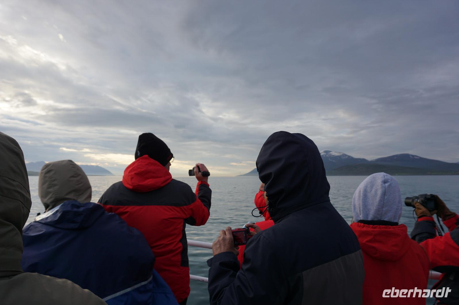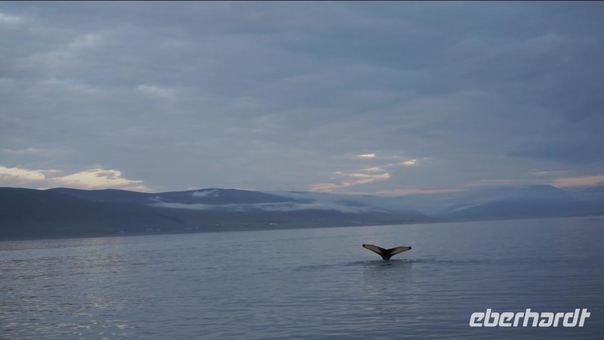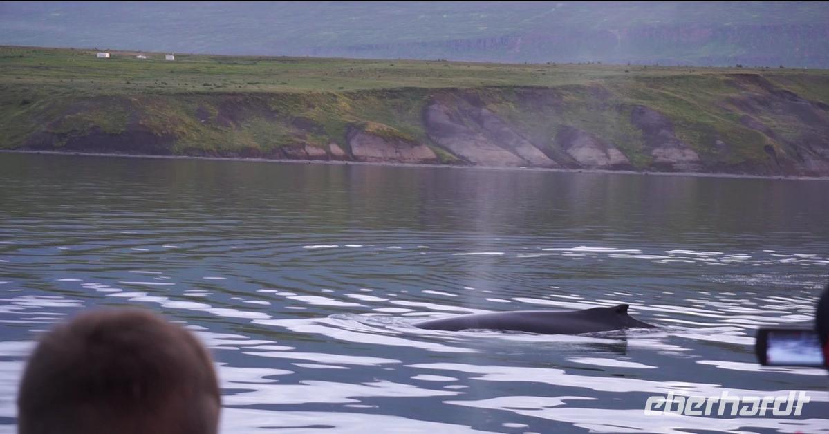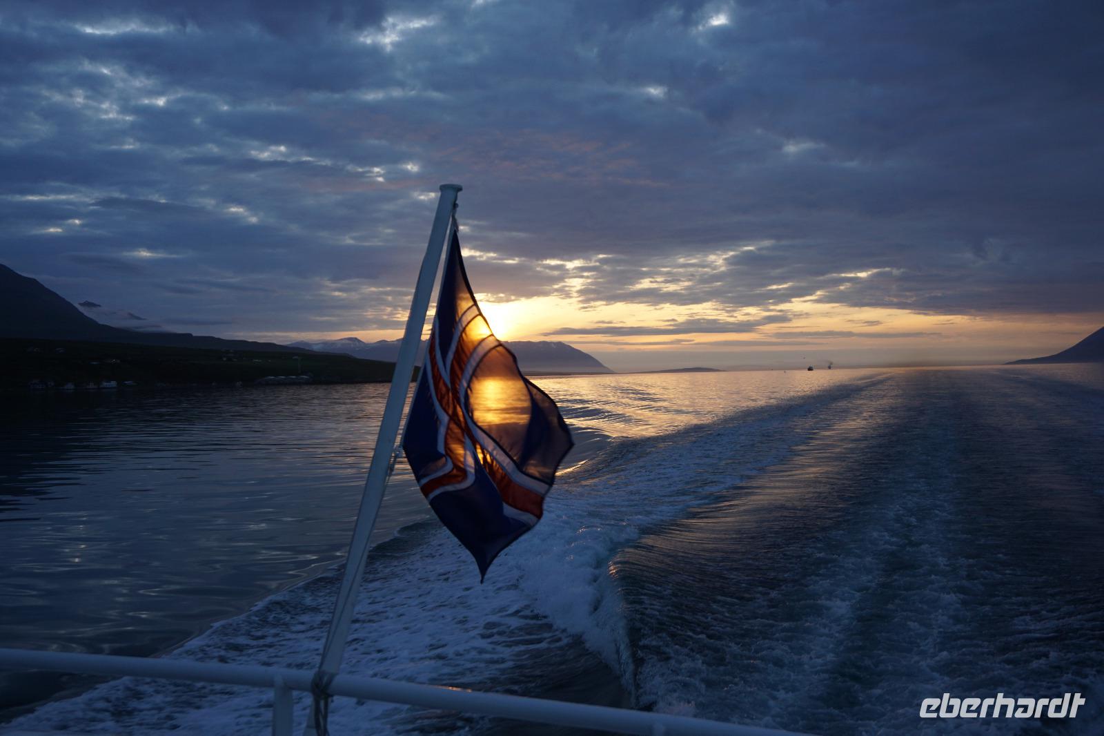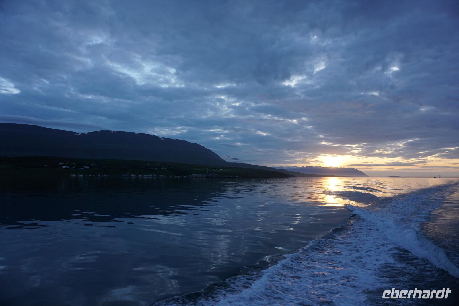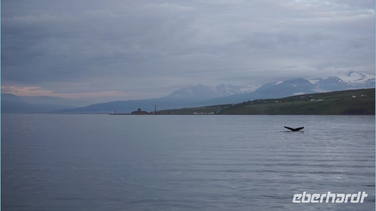 Nach einem ausgiebigen Frühstück und mit sonnigem Wetter fuhren wir in das Tal Norduradalur, wo wir einen Spaziergang am erloschenen Krater Grabrok machten. Einige Treppen führten nach oben, aber dort wurden wir mit einer super Aussicht belohnt! Der Krater Grabrok liegt in mitten des 3000 Jahre alten Lavafeldes Grabrokarhraun. Unterwegs picknickten wir wieder inmitten wunderschöner Natur. Anschließend besuchten wir den Pferdehof Flugumyri, wo uns die Besitzerin einige interessante Fakten über die robusten Islandpferde erzählte und uns die fünf verschiedenen Gangarten vorgeführt wurden - Schritt, Trab, Galopp, Tölt und Rennpass. Die beiden letzteren Gangarten besitzen nur Islandpferde. Nach der „Pferde-Show" blieb uns noch Zeit um Fragen zu stellen, Waffeln zu Essen und Kaffee oder Tee zu trinken. Nach diesem erlebnisreichen Programmpunkt fuhren wir weiter in die Hauptstadt des Nordens - Akureyri. Sie überrascht trotz der Lage fast am Polarkreis mit einer für isländische Verhältnisse sehr üppigen Vegetation. Nach dem Abendessen spazierten viele von uns zum Hafen, wo ein Boot von Ambassador auf uns wartete um uns auf eine Walsafari mitzunehmen. Wir fuhren ca. vierzig Minuten hinaus auf den Fjord Eyjafjordur, den längsten Fjord Islands. Wir hielten dort, wo die Wale immer fressen und warteten auf den ersten. Begleitet wurden wir von fast vollkommener Windstille, ruhigem Wasser und einem wunderschönen Sonnenuntergang. Insgesamt haben wir etwa zehn Buckelwale gesehen, die immer wieder aufgetaucht sind. Sie sind teilweise bis auf vier Meter an das Boot heran gekommen, aber außer Rücken und Schwanzflossen hat man von den ca. dreizehn bis siebzehn Meter langen Walen kaum etwas gesehen. Die Buckelwale wiegen zwischen fünfundzwanzig und vierzig Tonnen und man kann sie an ihren langen weißen Flippern (Brustflossen) erkennen, welche fünf bis sechs Meter lang sind (ein Drittel der Körpergröße). Ihre Schwanzflosse wird aus dem Wasser gehoben, wenn sie sich für einen tieferen Tauchgang bereit machen. Die Schwanzflosse ist ein sehr besonderes Merkmal, da sie bei jedem Wal anders ist, ähnlich wie ein Fingerabdruck. So kann man sie voneinander unterscheiden. Buckelwale können in größeren Gruppen auf Futtersuche gehen, oftmals sind sie jedoch Einzelgänger. Nach ungefähr drei Stunden intensiver und aufregender Walbeobachtung kamen wir kurz vor Mitternacht wieder im Hotel an. Draußen war es noch fast so hell wie am Tag. In Akureyri sind die roten Ampeln übrigens herzförmig, was einen gleich schon viel lieber auf grün warten ließ.