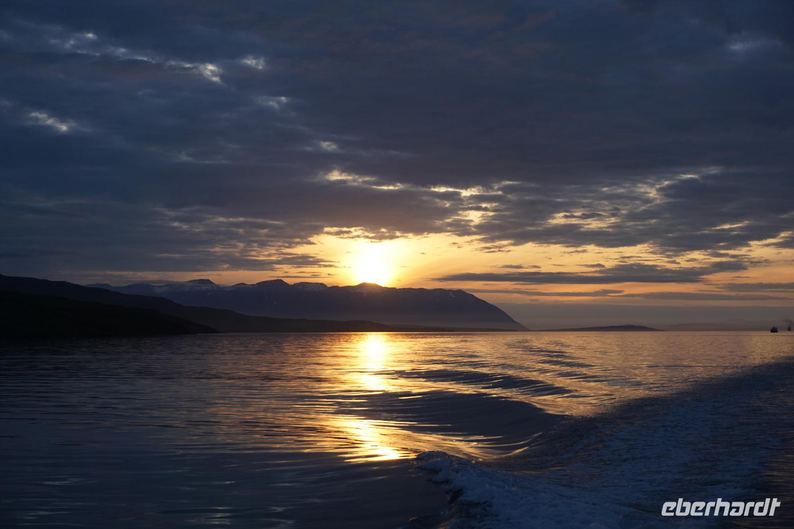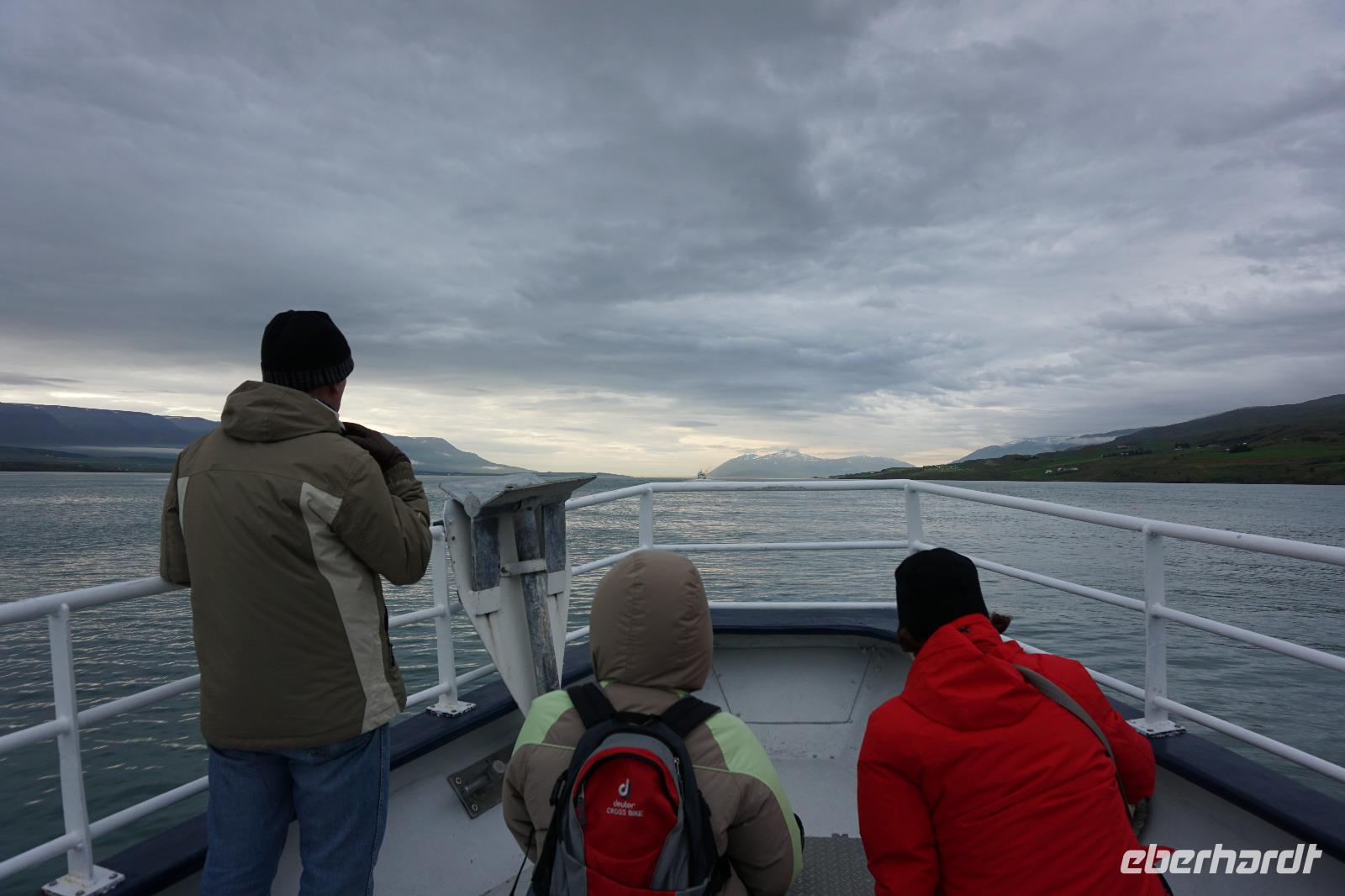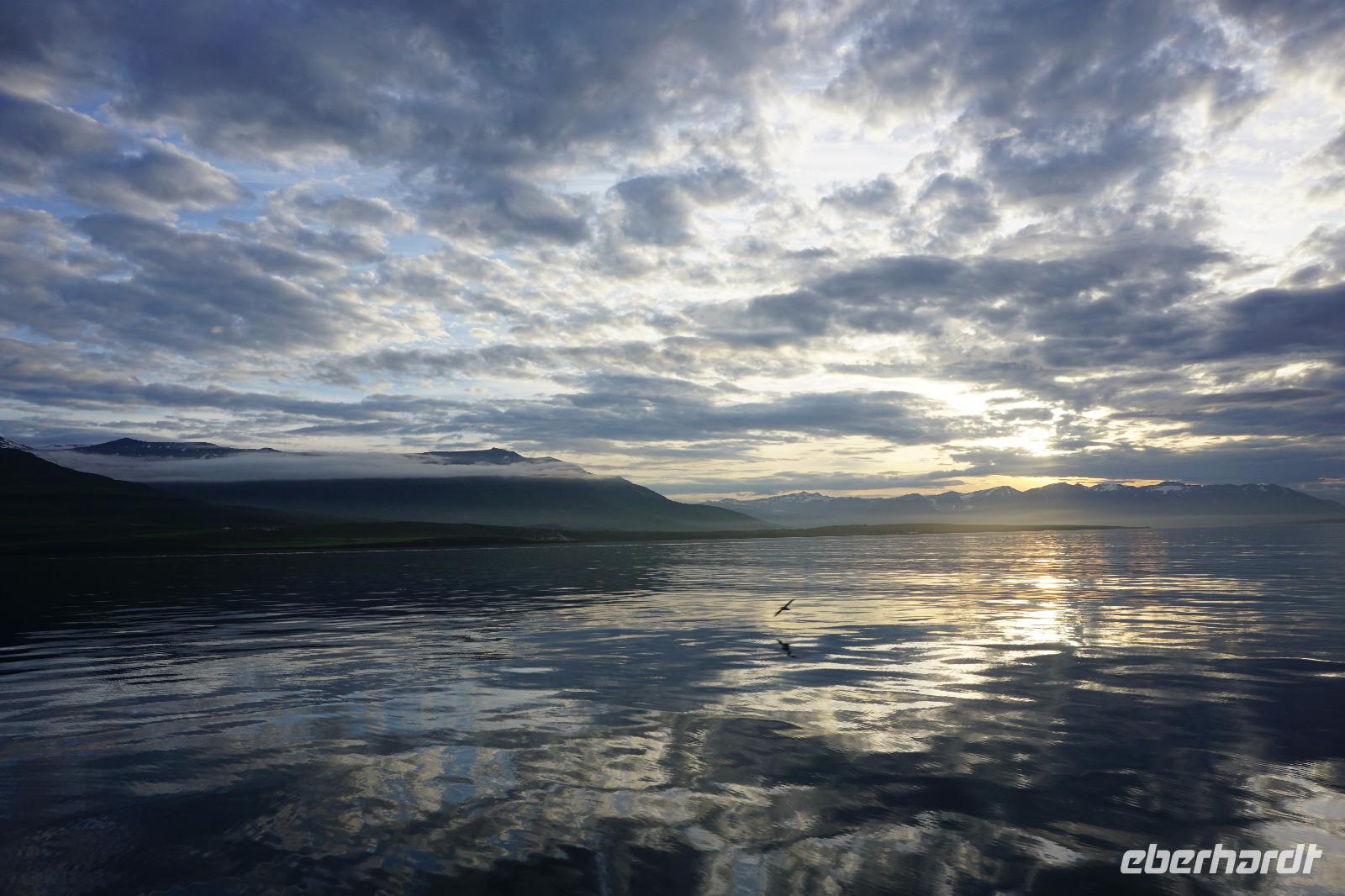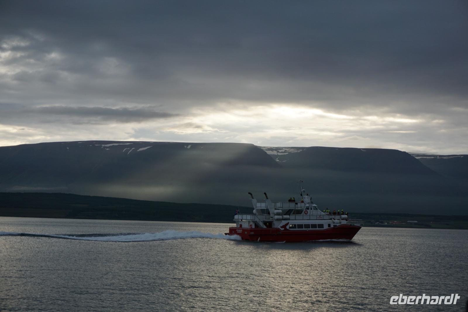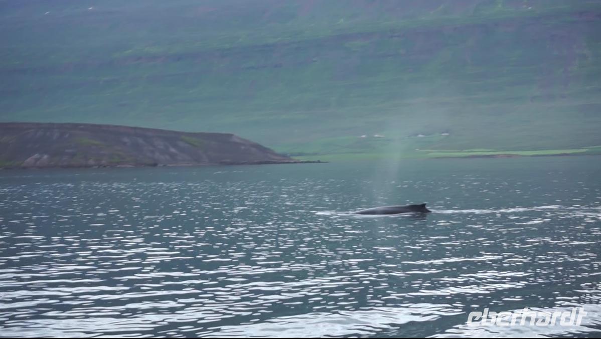 Nach einem ausgiebigen Frühstück und mit sonnigem Wetter fuhren wir in das Tal Norduradalur, wo wir einen Spaziergang am erloschenen Krater Grabrok machten. Einige Treppen führten nach oben, aber dort wurden wir mit einer super Aussicht belohnt! Der Krater Grabrok liegt in mitten des 3000 Jahre alten Lavafeldes Grabrokarhraun. Unterwegs picknickten wir wieder inmitten wunderschöner Natur. Anschließend besuchten wir den Pferdehof Flugumyri, wo uns die Besitzerin einige interessante Fakten über die robusten Islandpferde erzählte und uns die fünf verschiedenen Gangarten vorgeführt wurden - Schritt, Trab, Galopp, Tölt und Rennpass. Die beiden letzteren Gangarten besitzen nur Islandpferde. Nach der „Pferde-Show" blieb uns noch Zeit um Fragen zu stellen, Waffeln zu Essen und Kaffee oder Tee zu trinken. Nach diesem erlebnisreichen Programmpunkt fuhren wir weiter in die Hauptstadt des Nordens - Akureyri. Sie überrascht trotz der Lage fast am Polarkreis mit einer für isländische Verhältnisse sehr üppigen Vegetation. Nach dem Abendessen spazierten viele von uns zum Hafen, wo ein Boot von Ambassador auf uns wartete um uns auf eine Walsafari mitzunehmen. Wir fuhren ca. vierzig Minuten hinaus auf den Fjord Eyjafjordur, den längsten Fjord Islands. Wir hielten dort, wo die Wale immer fressen und warteten auf den ersten. Begleitet wurden wir von fast vollkommener Windstille, ruhigem Wasser und einem wunderschönen Sonnenuntergang. Insgesamt haben wir etwa zehn Buckelwale gesehen, die immer wieder aufgetaucht sind. Sie sind teilweise bis auf vier Meter an das Boot heran gekommen, aber außer Rücken und Schwanzflossen hat man von den ca. dreizehn bis siebzehn Meter langen Walen kaum etwas gesehen. Die Buckelwale wiegen zwischen fünfundzwanzig und vierzig Tonnen und man kann sie an ihren langen weißen Flippern (Brustflossen) erkennen, welche fünf bis sechs Meter lang sind (ein Drittel der Körpergröße). Ihre Schwanzflosse wird aus dem Wasser gehoben, wenn sie sich für einen tieferen Tauchgang bereit machen. Die Schwanzflosse ist ein sehr besonderes Merkmal, da sie bei jedem Wal anders ist, ähnlich wie ein Fingerabdruck. So kann man sie voneinander unterscheiden. Buckelwale können in größeren Gruppen auf Futtersuche gehen, oftmals sind sie jedoch Einzelgänger. Nach ungefähr drei Stunden intensiver und aufregender Walbeobachtung kamen wir kurz vor Mitternacht wieder im Hotel an. Draußen war es noch fast so hell wie am Tag. In Akureyri sind die roten Ampeln übrigens herzförmig, was einen gleich schon viel lieber auf grün warten ließ.
