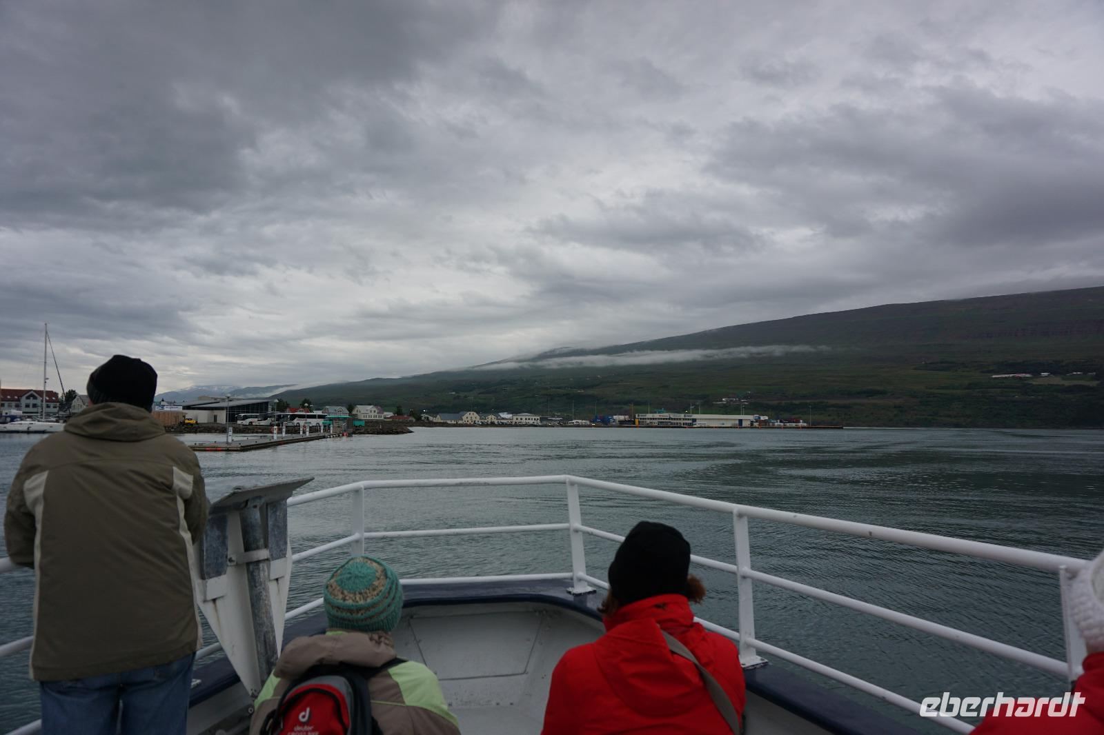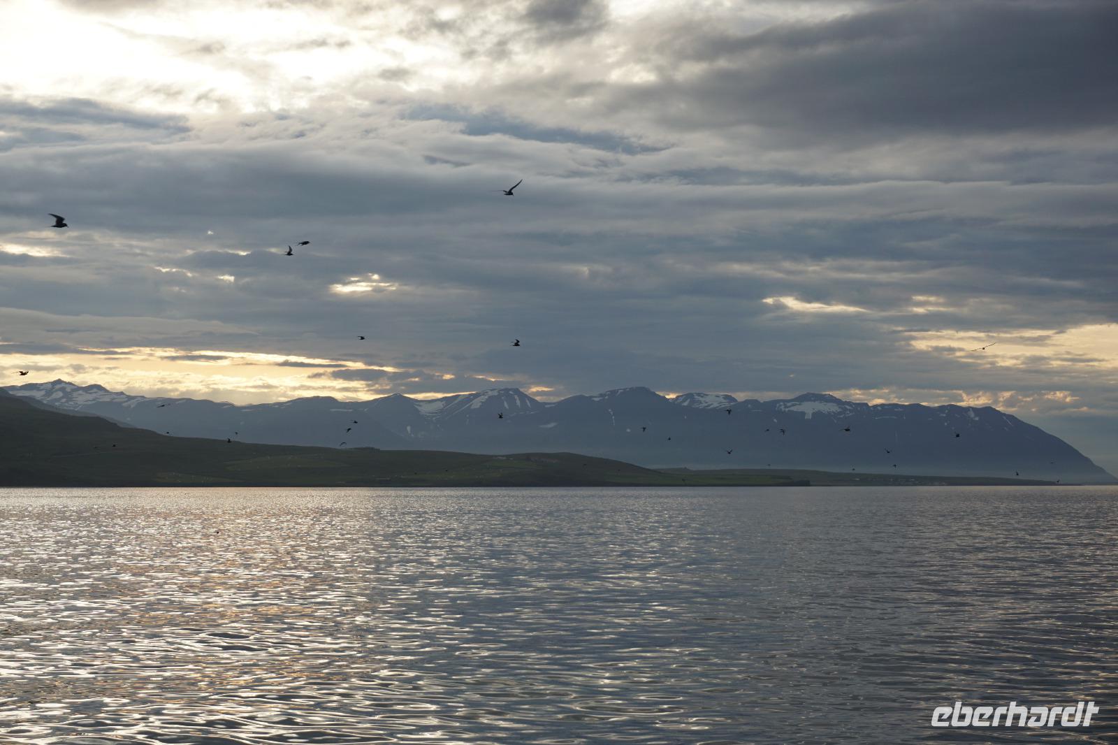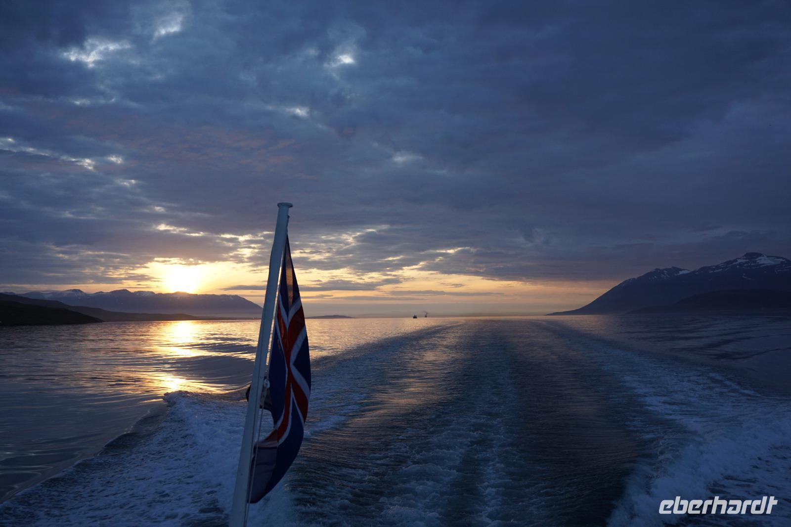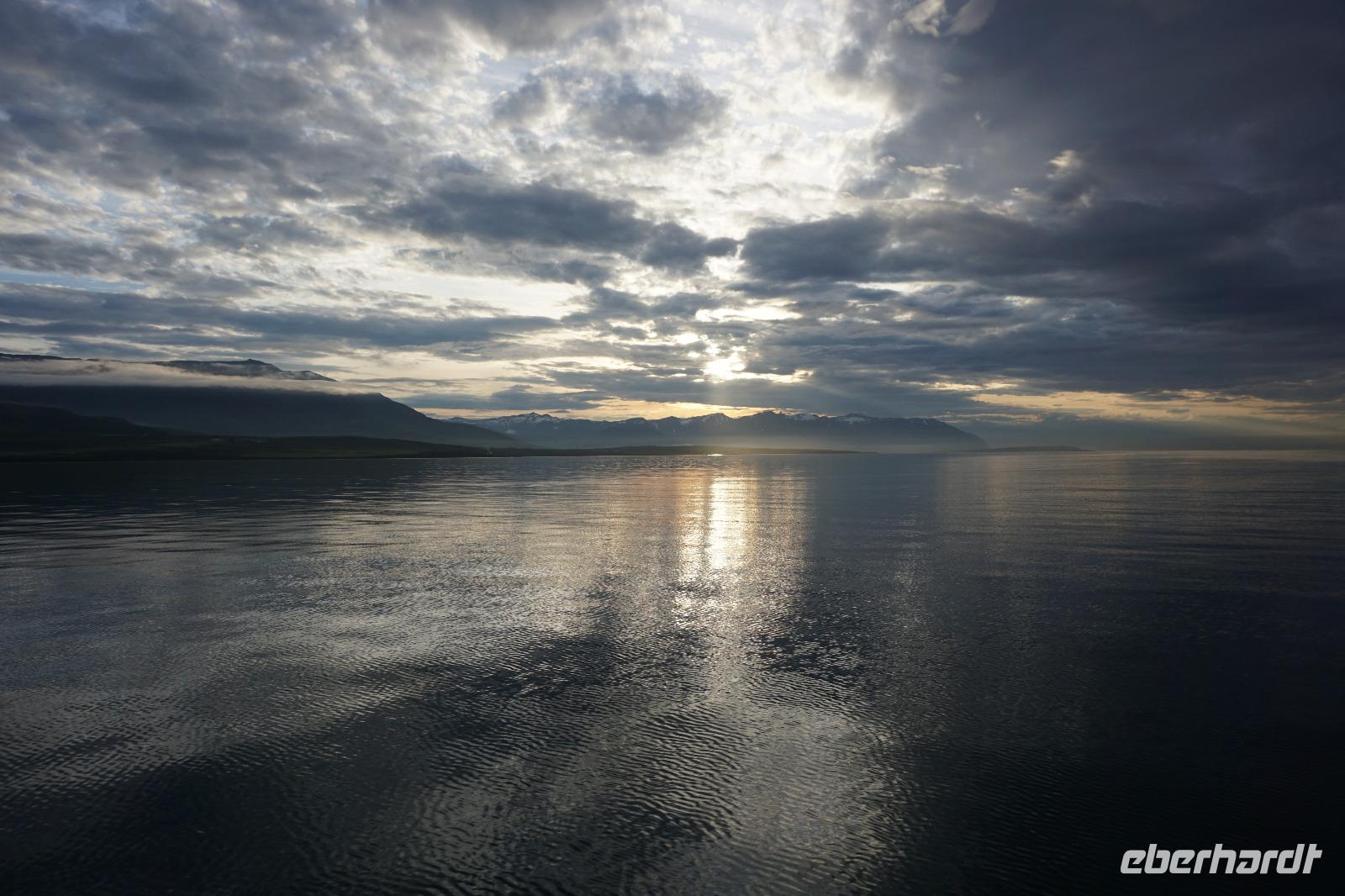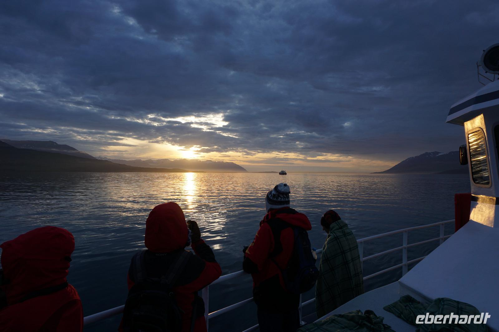 Nach einem ausgiebigen Frühstück und mit sonnigem Wetter fuhren wir in das Tal Norduradalur, wo wir einen Spaziergang am erloschenen Krater Grabrok machten. Einige Treppen führten nach oben, aber dort wurden wir mit einer super Aussicht belohnt! Der Krater Grabrok liegt in mitten des 3000 Jahre alten Lavafeldes Grabrokarhraun. Unterwegs picknickten wir wieder inmitten wunderschöner Natur. Anschließend besuchten wir den Pferdehof Flugumyri, wo uns die Besitzerin einige interessante Fakten über die robusten Islandpferde erzählte und uns die fünf verschiedenen Gangarten vorgeführt wurden - Schritt, Trab, Galopp, Tölt und Rennpass. Die beiden letzteren Gangarten besitzen nur Islandpferde. Nach der „Pferde-Show" blieb uns noch Zeit um Fragen zu stellen, Waffeln zu Essen und Kaffee oder Tee zu trinken. Nach diesem erlebnisreichen Programmpunkt fuhren wir weiter in die Hauptstadt des Nordens - Akureyri. Sie überrascht trotz der Lage fast am Polarkreis mit einer für isländische Verhältnisse sehr üppigen Vegetation. Nach dem Abendessen spazierten viele von uns zum Hafen, wo ein Boot von Ambassador auf uns wartete um uns auf eine Walsafari mitzunehmen. Wir fuhren ca. vierzig Minuten hinaus auf den Fjord Eyjafjordur, den längsten Fjord Islands. Wir hielten dort, wo die Wale immer fressen und warteten auf den ersten. Begleitet wurden wir von fast vollkommener Windstille, ruhigem Wasser und einem wunderschönen Sonnenuntergang. Insgesamt haben wir etwa zehn Buckelwale gesehen, die immer wieder aufgetaucht sind. Sie sind teilweise bis auf vier Meter an das Boot heran gekommen, aber außer Rücken und Schwanzflossen hat man von den ca. dreizehn bis siebzehn Meter langen Walen kaum etwas gesehen. Die Buckelwale wiegen zwischen fünfundzwanzig und vierzig Tonnen und man kann sie an ihren langen weißen Flippern (Brustflossen) erkennen, welche fünf bis sechs Meter lang sind (ein Drittel der Körpergröße). Ihre Schwanzflosse wird aus dem Wasser gehoben, wenn sie sich für einen tieferen Tauchgang bereit machen. Die Schwanzflosse ist ein sehr besonderes Merkmal, da sie bei jedem Wal anders ist, ähnlich wie ein Fingerabdruck. So kann man sie voneinander unterscheiden. Buckelwale können in größeren Gruppen auf Futtersuche gehen, oftmals sind sie jedoch Einzelgänger. Nach ungefähr drei Stunden intensiver und aufregender Walbeobachtung kamen wir kurz vor Mitternacht wieder im Hotel an. Draußen war es noch fast so hell wie am Tag. In Akureyri sind die roten Ampeln übrigens herzförmig, was einen gleich schon viel lieber auf grün warten ließ.