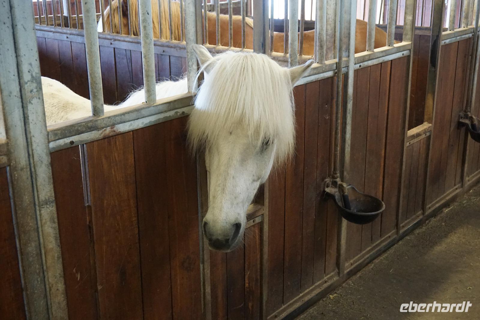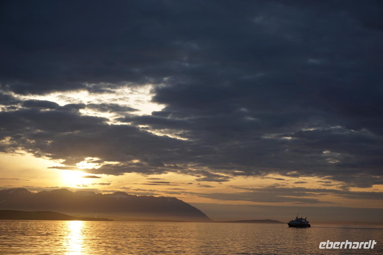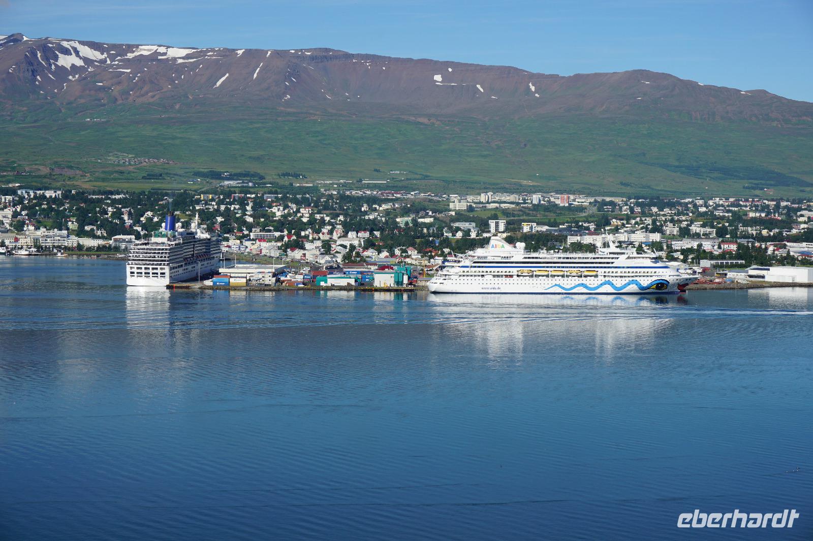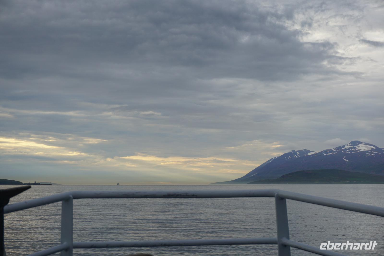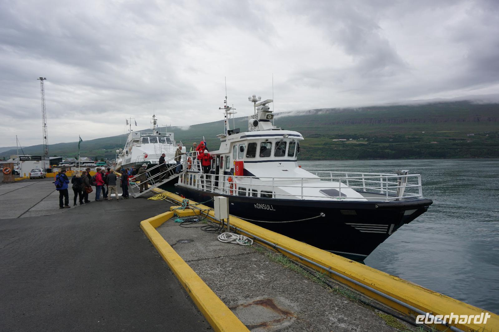 Nach einem ausgiebigen Frühstück und mit sonnigem Wetter fuhren wir in das Tal Norduradalur, wo wir einen Spaziergang am erloschenen Krater Grabrok machten. Einige Treppen führten nach oben, aber dort wurden wir mit einer super Aussicht belohnt! Der Krater Grabrok liegt in mitten des 3000 Jahre alten Lavafeldes Grabrokarhraun. Unterwegs picknickten wir wieder inmitten wunderschöner Natur. Anschließend besuchten wir den Pferdehof Flugumyri, wo uns die Besitzerin einige interessante Fakten über die robusten Islandpferde erzählte und uns die fünf verschiedenen Gangarten vorgeführt wurden - Schritt, Trab, Galopp, Tölt und Rennpass. Die beiden letzteren Gangarten besitzen nur Islandpferde. Nach der „Pferde-Show" blieb uns noch Zeit um Fragen zu stellen, Waffeln zu Essen und Kaffee oder Tee zu trinken. Nach diesem erlebnisreichen Programmpunkt fuhren wir weiter in die Hauptstadt des Nordens - Akureyri. Sie überrascht trotz der Lage fast am Polarkreis mit einer für isländische Verhältnisse sehr üppigen Vegetation. Nach dem Abendessen spazierten viele von uns zum Hafen, wo ein Boot von Ambassador auf uns wartete um uns auf eine Walsafari mitzunehmen. Wir fuhren ca. vierzig Minuten hinaus auf den Fjord Eyjafjordur, den längsten Fjord Islands. Wir hielten dort, wo die Wale immer fressen und warteten auf den ersten. Begleitet wurden wir von fast vollkommener Windstille, ruhigem Wasser und einem wunderschönen Sonnenuntergang. Insgesamt haben wir etwa zehn Buckelwale gesehen, die immer wieder aufgetaucht sind. Sie sind teilweise bis auf vier Meter an das Boot heran gekommen, aber außer Rücken und Schwanzflossen hat man von den ca. dreizehn bis siebzehn Meter langen Walen kaum etwas gesehen. Die Buckelwale wiegen zwischen fünfundzwanzig und vierzig Tonnen und man kann sie an ihren langen weißen Flippern (Brustflossen) erkennen, welche fünf bis sechs Meter lang sind (ein Drittel der Körpergröße). Ihre Schwanzflosse wird aus dem Wasser gehoben, wenn sie sich für einen tieferen Tauchgang bereit machen. Die Schwanzflosse ist ein sehr besonderes Merkmal, da sie bei jedem Wal anders ist, ähnlich wie ein Fingerabdruck. So kann man sie voneinander unterscheiden. Buckelwale können in größeren Gruppen auf Futtersuche gehen, oftmals sind sie jedoch Einzelgänger. Nach ungefähr drei Stunden intensiver und aufregender Walbeobachtung kamen wir kurz vor Mitternacht wieder im Hotel an. Draußen war es noch fast so hell wie am Tag. In Akureyri sind die roten Ampeln übrigens herzförmig, was einen gleich schon viel lieber auf grün warten ließ.