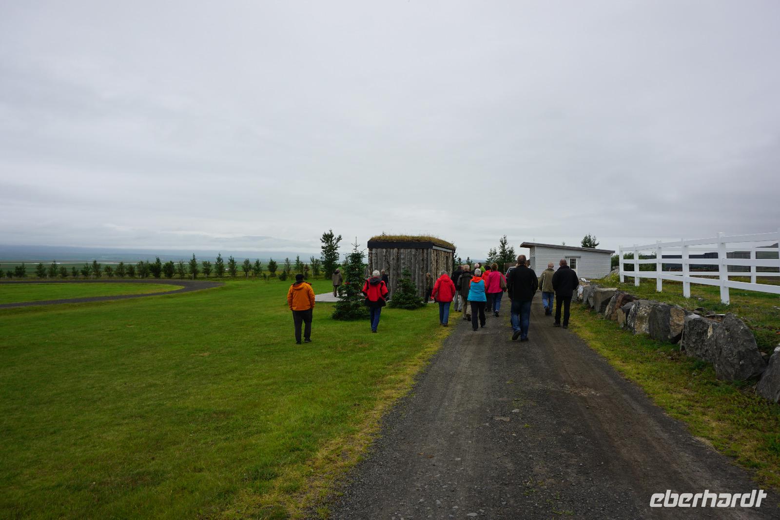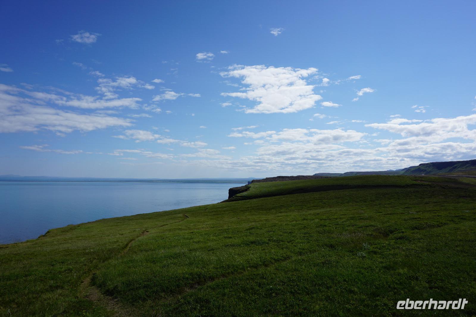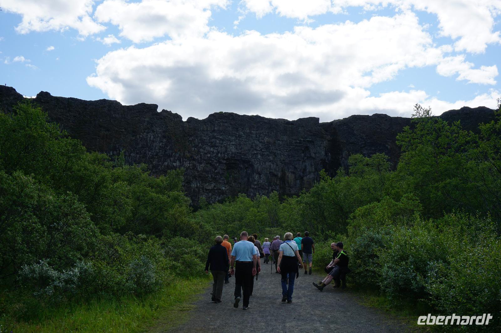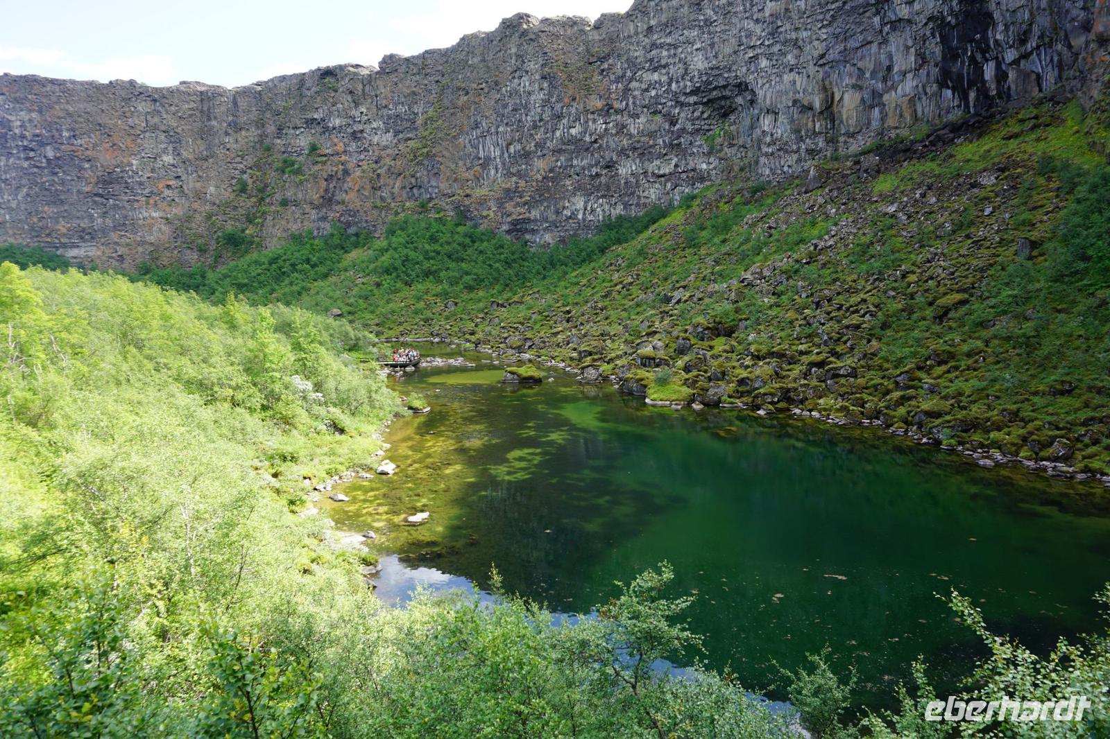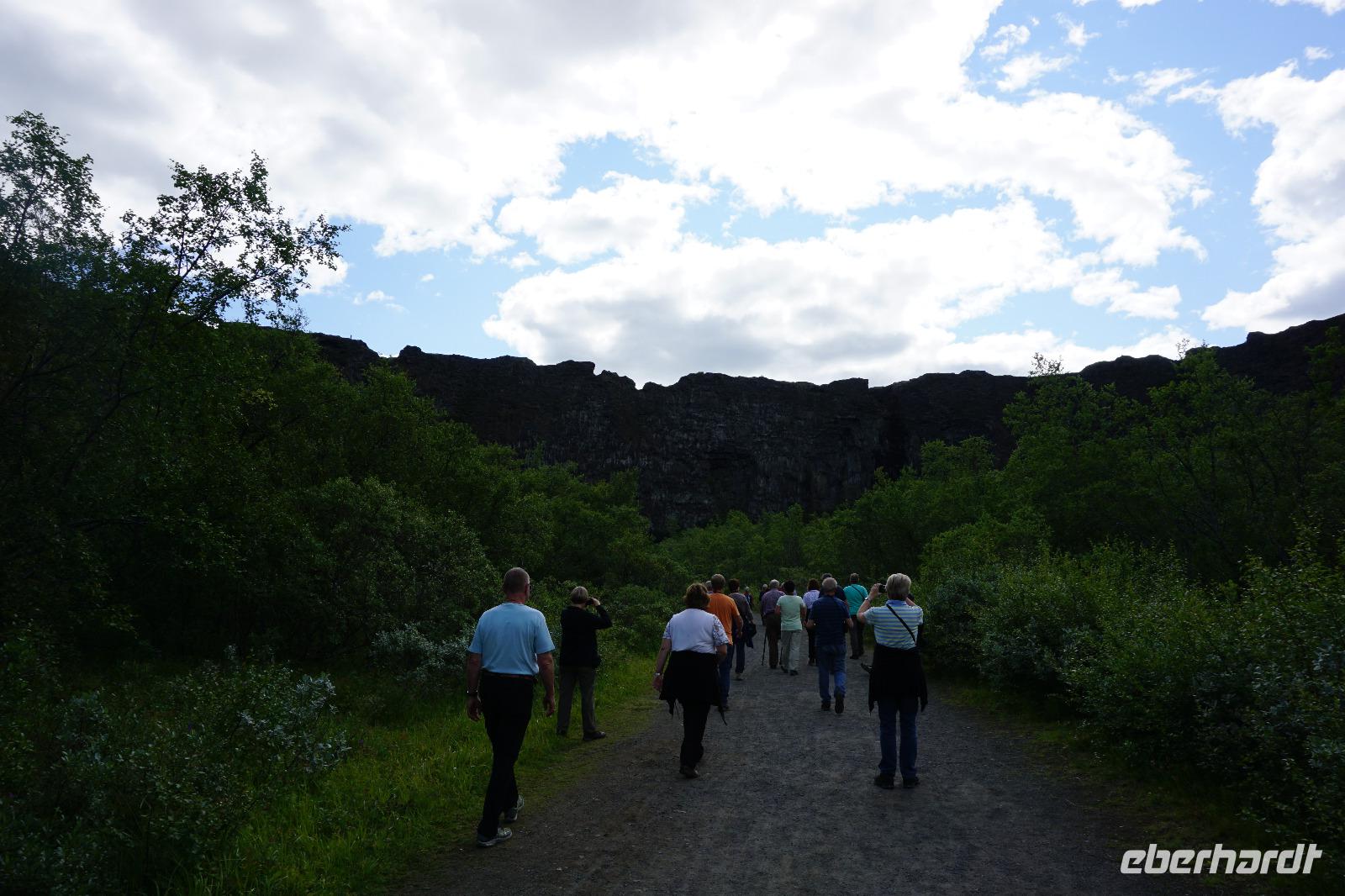 Am frühen Vormittag brachen wir in Richtung der Halbinsel Tjörnes auf. Auf dem Weg hielten wir kurz an einem Supermarkt in Husavik um für unser Picknick am Mittag einzukaufen. Unser nächstes Ziel war der beeindruckende Wasserfall Godafoss. Der „Götterfall" gehört zu den meistbesuchten Zielen Islands. Bei dem beliebten Fotomotiv hielten sich sehr viele Menschen auf uns es war fast unmöglich ein Bild ohne Menschen zu schießen. Nach einem kurzen Aufenthalt fuhren wir weiter nach Asbyrgi. Die Schlucht hat die Form eines Hufeisens und steht unter Naturschutz. Zuerst picknickten wir in der bizarren Felsenschlucht, danach spazierten wir mit Gunnar durch die Schlucht. Auf dem Rückweg hielten wir an den Vogelfelsen, wo wir auch ein paar Papageitaucher beobachten konnten. Anschließend fuhren wir wieder zurück nach Husavik, wo Zeit zum Verweilen blieb. Husavik liegt an einer sanft geschwungenen Bucht mit dunklem Sandstrand und ist die Hauptstadt der Walbeobachtung Europas. Am Nachmittag kamen wir wieder in Akureyri an, wo wir Zeit für eigene Erkundungen hatten. Im botanischen Garten direkt neben dem Hotel konnte man wunderbar spazieren gehen oder in der Einkaufsstraße bummeln und ein paar Souvenirs kaufen. Zum Abendessen kamen alle wieder zusammen und berichteten über ihre Erlebnisse in Akureyri.