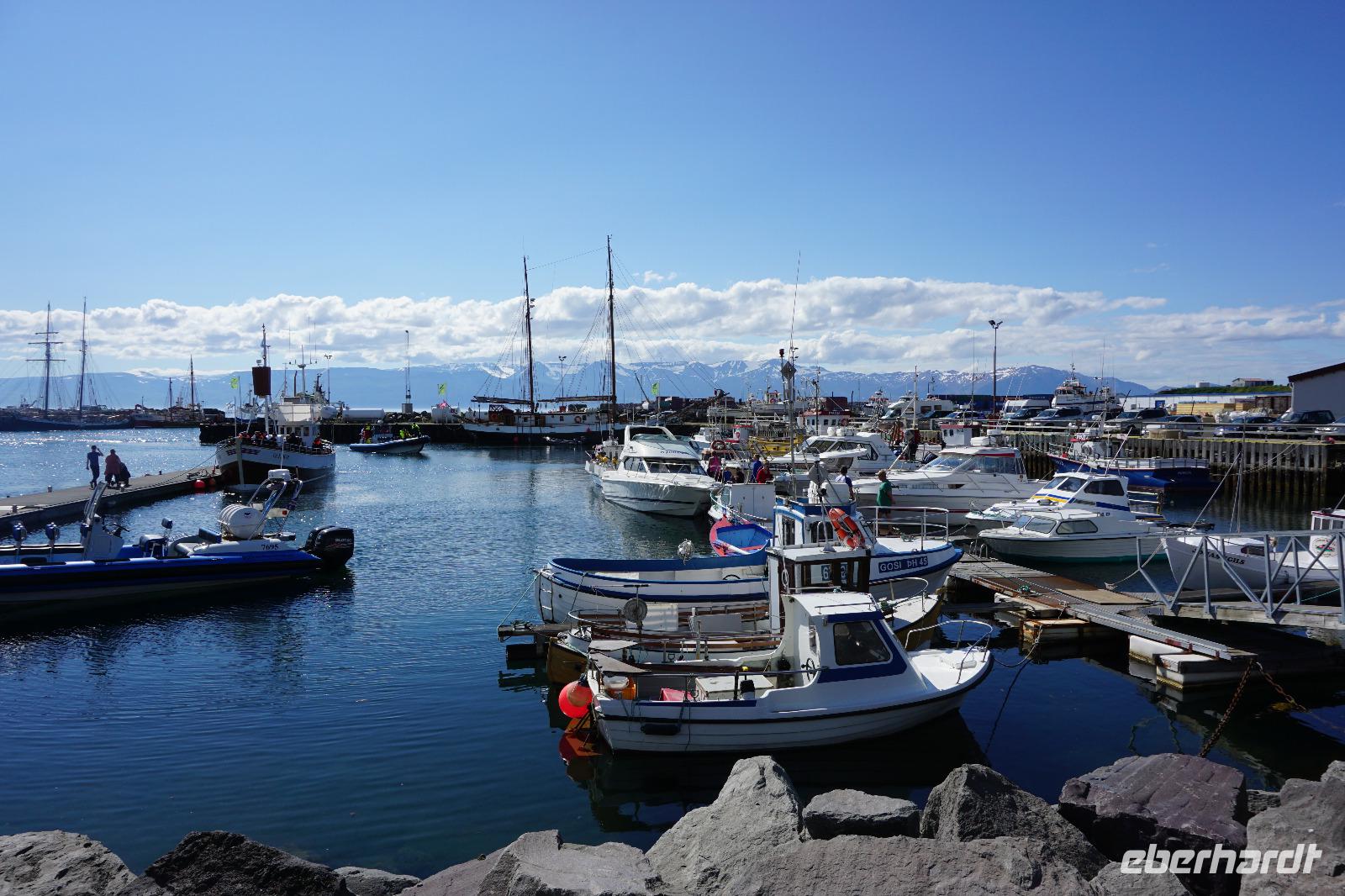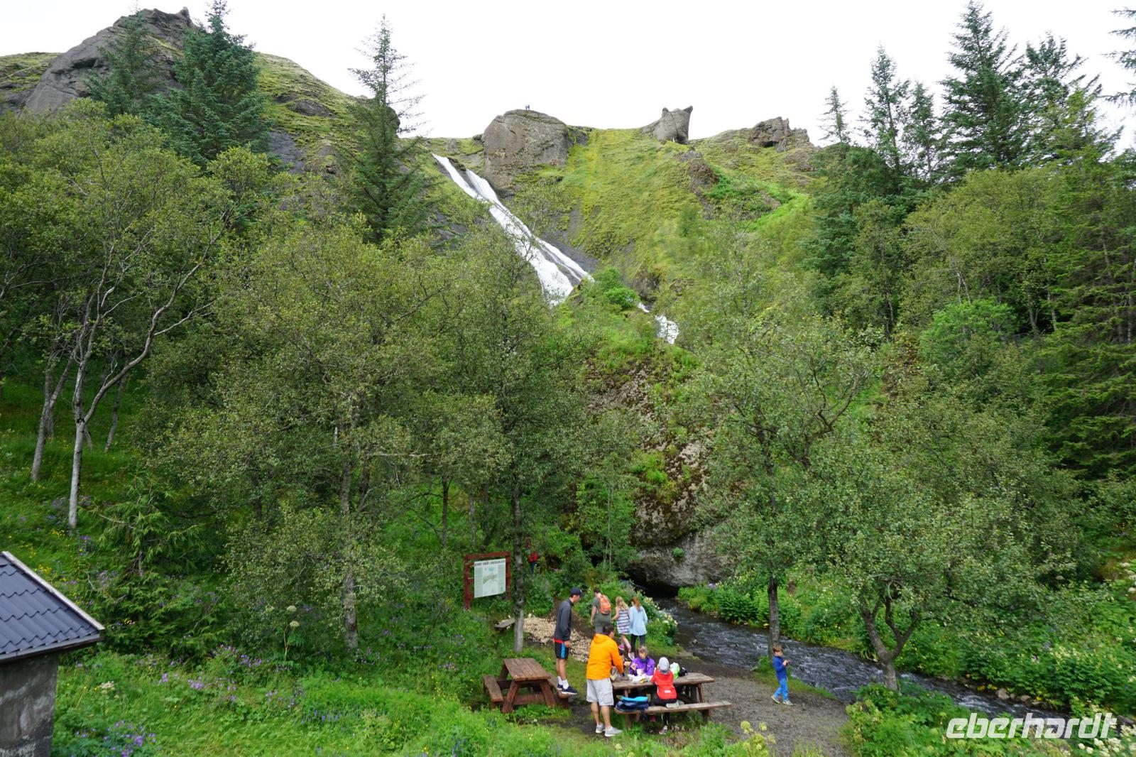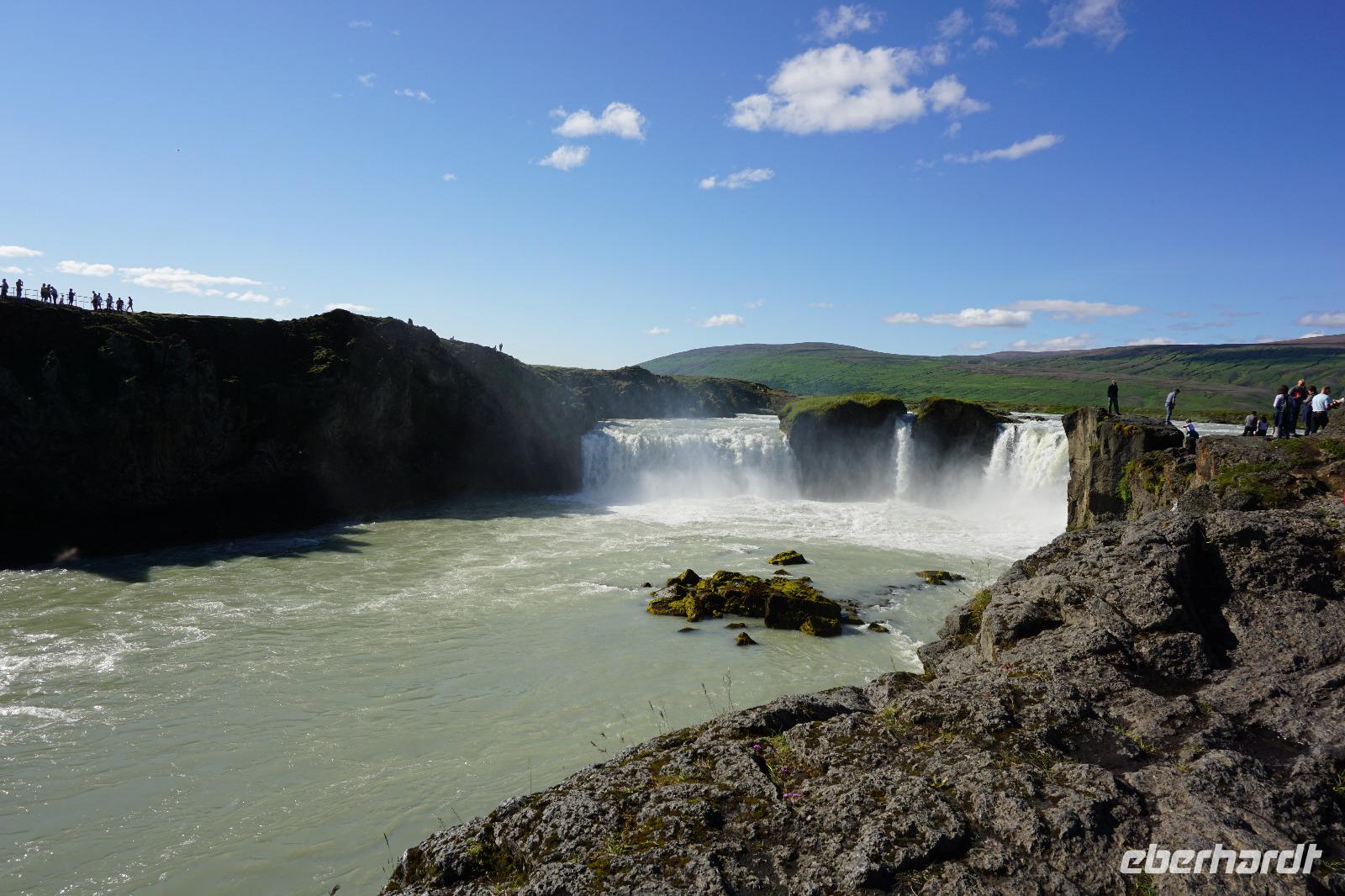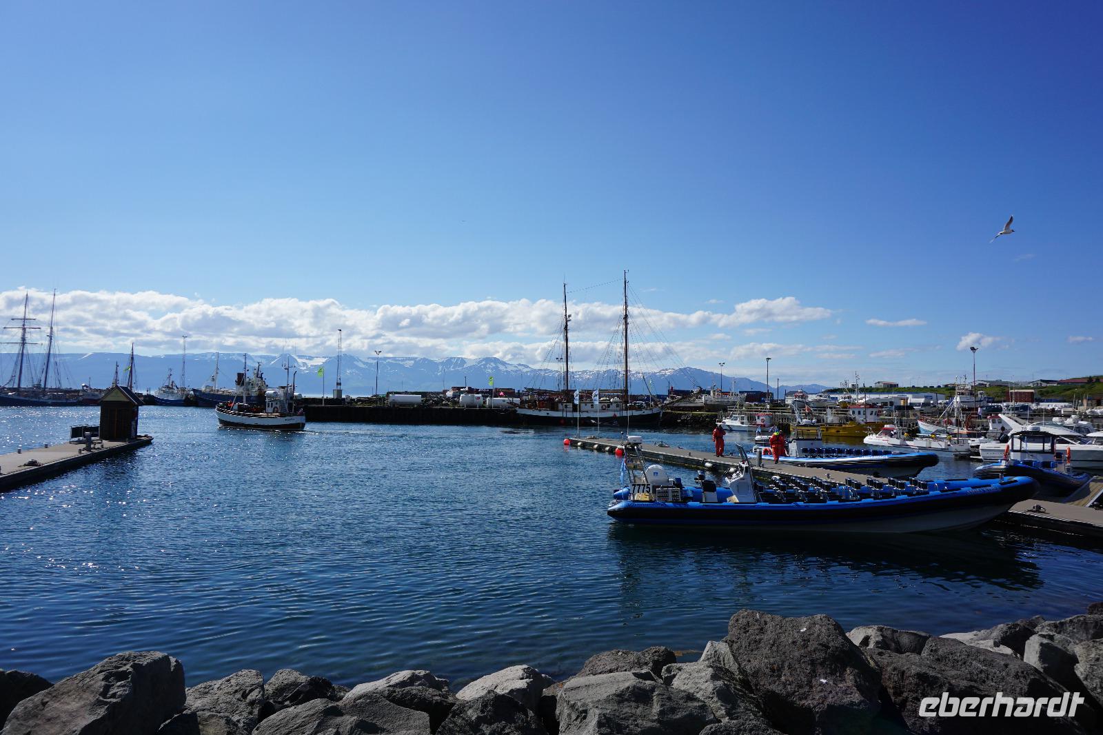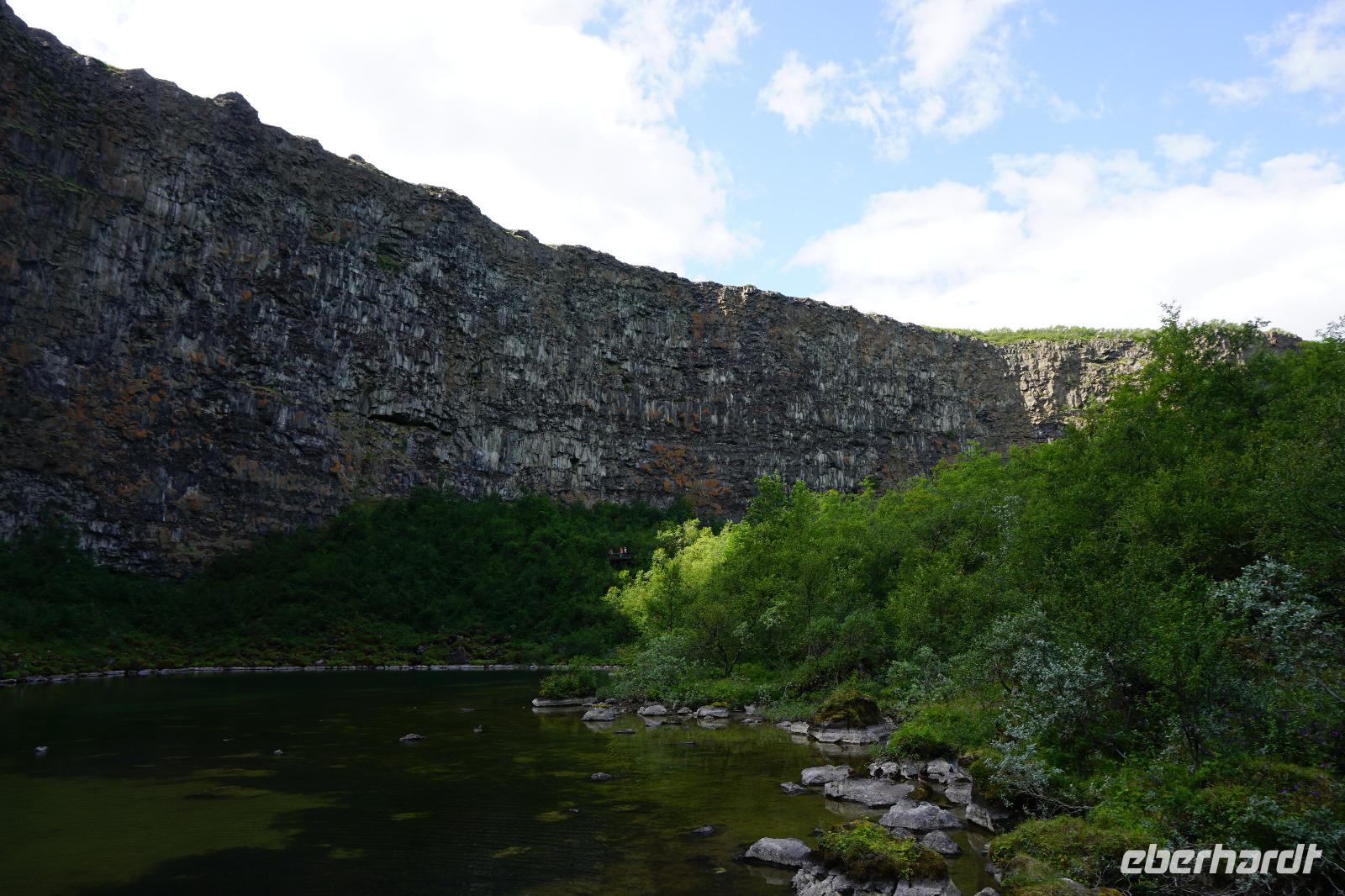 Am frühen Vormittag brachen wir in Richtung der Halbinsel Tjörnes auf. Auf dem Weg hielten wir kurz an einem Supermarkt in Husavik um für unser Picknick am Mittag einzukaufen. Unser nächstes Ziel war der beeindruckende Wasserfall Godafoss. Der „Götterfall" gehört zu den meistbesuchten Zielen Islands. Bei dem beliebten Fotomotiv hielten sich sehr viele Menschen auf uns es war fast unmöglich ein Bild ohne Menschen zu schießen. Nach einem kurzen Aufenthalt fuhren wir weiter nach Asbyrgi. Die Schlucht hat die Form eines Hufeisens und steht unter Naturschutz. Zuerst picknickten wir in der bizarren Felsenschlucht, danach spazierten wir mit Gunnar durch die Schlucht. Auf dem Rückweg hielten wir an den Vogelfelsen, wo wir auch ein paar Papageitaucher beobachten konnten. Anschließend fuhren wir wieder zurück nach Husavik, wo Zeit zum Verweilen blieb. Husavik liegt an einer sanft geschwungenen Bucht mit dunklem Sandstrand und ist die Hauptstadt der Walbeobachtung Europas. Am Nachmittag kamen wir wieder in Akureyri an, wo wir Zeit für eigene Erkundungen hatten. Im botanischen Garten direkt neben dem Hotel konnte man wunderbar spazieren gehen oder in der Einkaufsstraße bummeln und ein paar Souvenirs kaufen. Zum Abendessen kamen alle wieder zusammen und berichteten über ihre Erlebnisse in Akureyri.