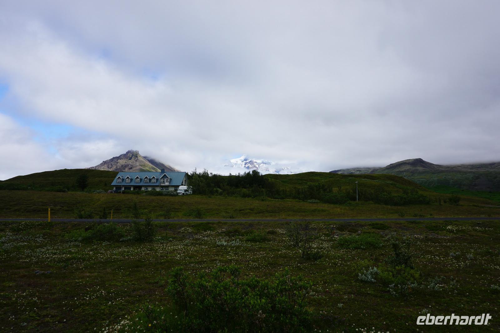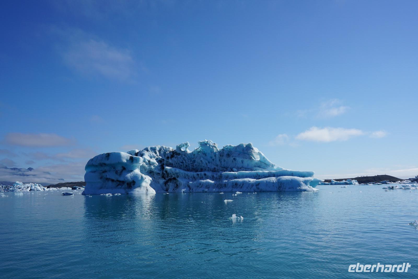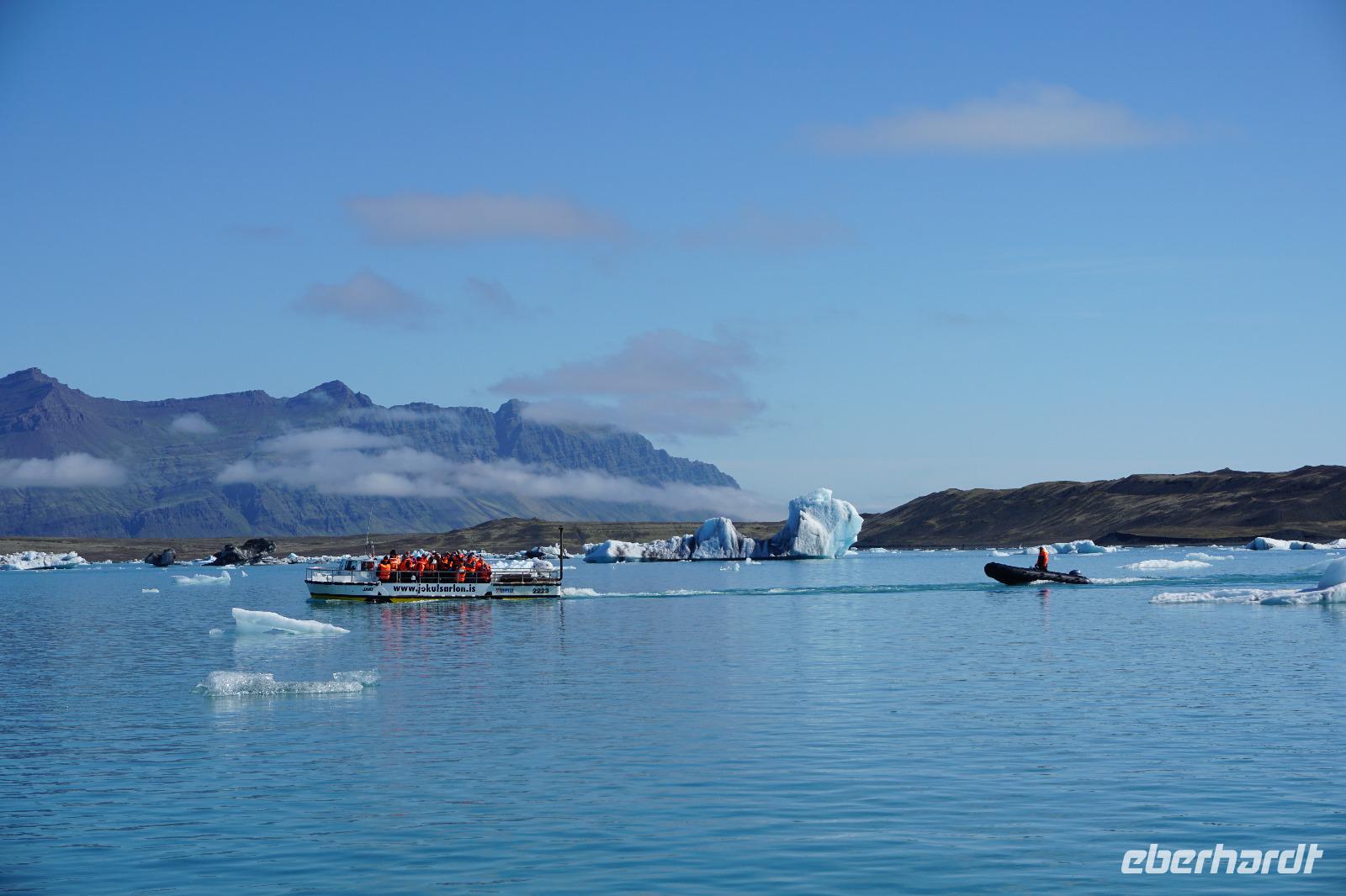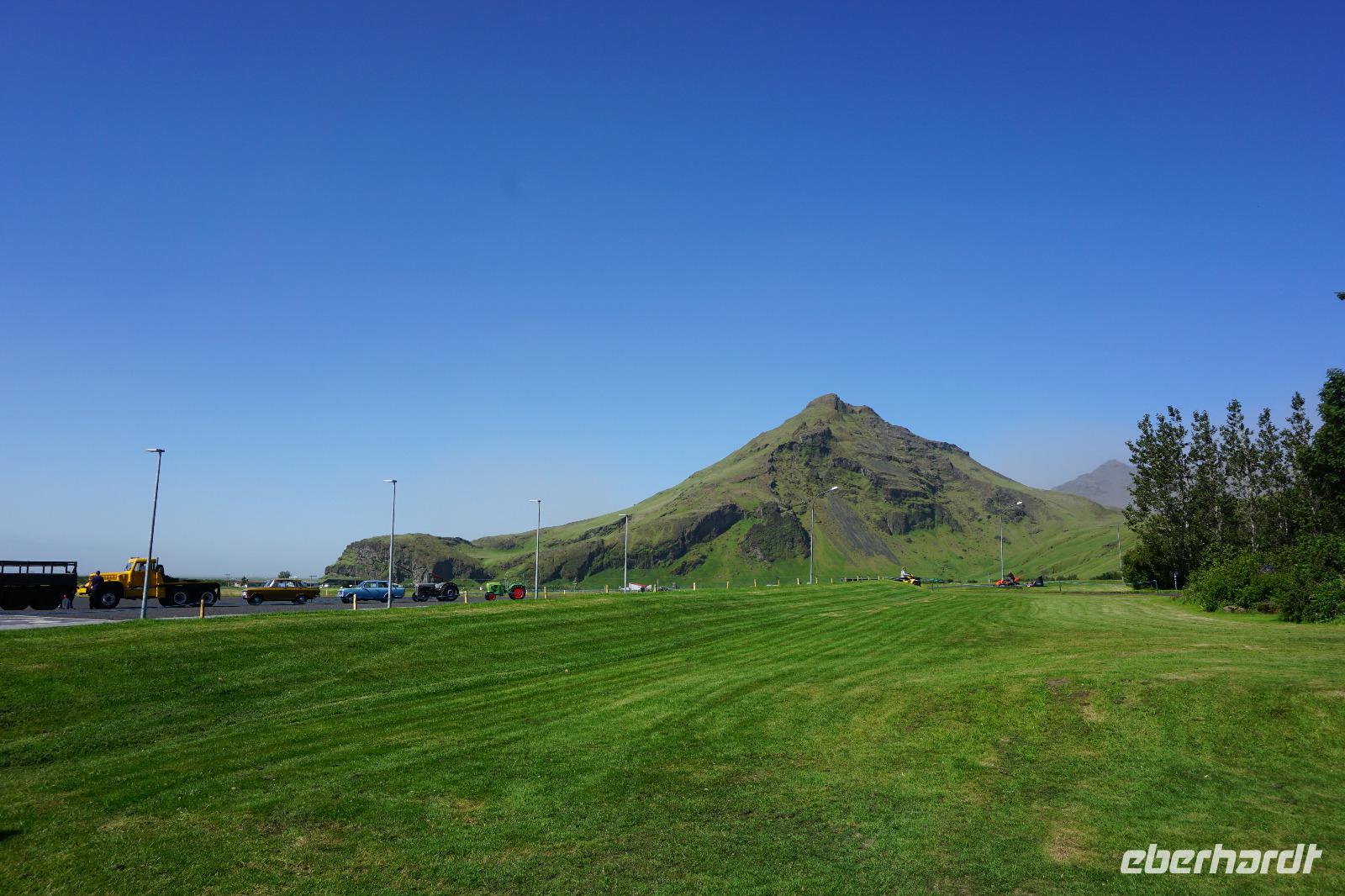 Am frühen Vormittag führte uns unser Weg zur Gletscherlagune Jökulsarlon, wo wir mit einem Amphibienfahrzeug über den größten Gletschersee Islands fuhren. Mit 258 Metern ist er der tiefste See der Insel. Unser Guide erzählte uns viel Interessantes über die Lagune, die voller schwimmender Eisberge unterschiedlicher Größen war. Später konnten wir sogar ein Stück von diesem kristallklaren Eises kosten. Überall auf dem See glitzerten die Eisberge in der Sonne und jeder sah etwas anders aus. Wir sahen auch nur ca. ein Drittel des Eisbergs, der größte Teil war im Wasser versteckt. Danach haben wir noch ein paar Fotos mit großen, an Land geschwemmten, Eisbergen gemacht. Unterwegs machten wir unsere Mittagspause an einer kleinen Raststätte. Anschließend fuhren wir in den Nationalpark Skaftafell, wo wir einen Blick auf das „ewige Eis" mit seinen vielen Spalten werfen konnten. Auch am Besuchszentrum machten wir einen kurzen Halt. Auf dem weiteren Weg hielten wir in einem kleinen Ort namens Kirkjubaejarklaustur, wo wir einen Spaziergang unternahmen und ein sonderbares Nonnendenkmal besichtigten. Wir fuhren weiter nach Vik, wo es die Möglichkeit für einen kleinen Fußmarsch am schwarzen Strand gab oder bei Ice Wear einige isländische Sachen einzukaufen. Sehr beliebt war der Kauf einer Mütze. Danach ging es für uns auch schon nach Dyrholaey zu unserem nächsten Hotel. Auf einem Berg gelegen, hatte man zum einen eine tolle Aussicht auf die schwarze Küste vor dem Hotel bzw. auf die durch die Sonne in Szene gesetzten Berge hinter dem Hotel. Man musste allerdings aufpassen, dass man nicht vom Wind weggeweht wird, weil dieser heute äußerst stark war. Nach ein bisschen Freizeit im Hotel haben wir gemeinsam gegessen.