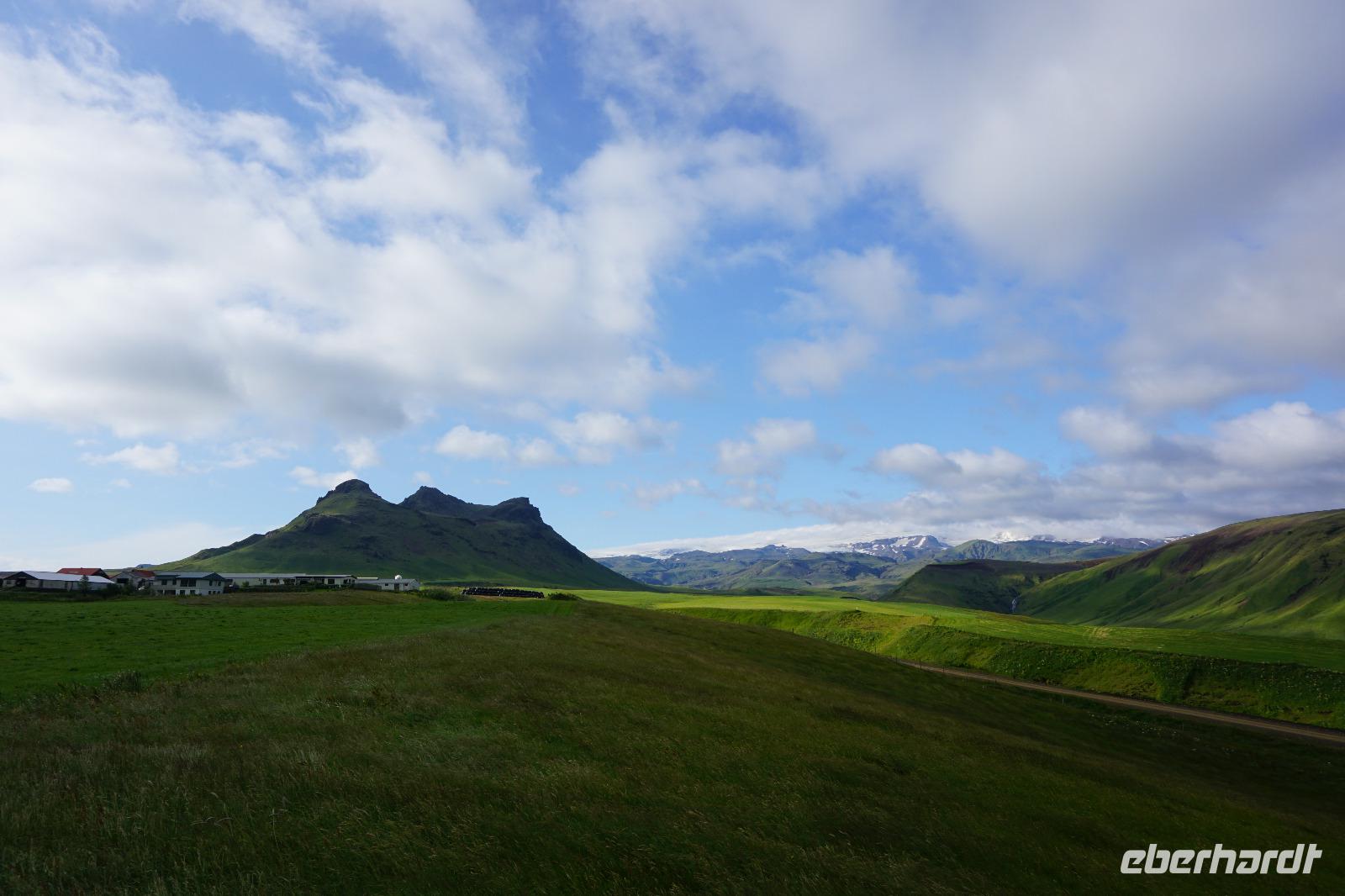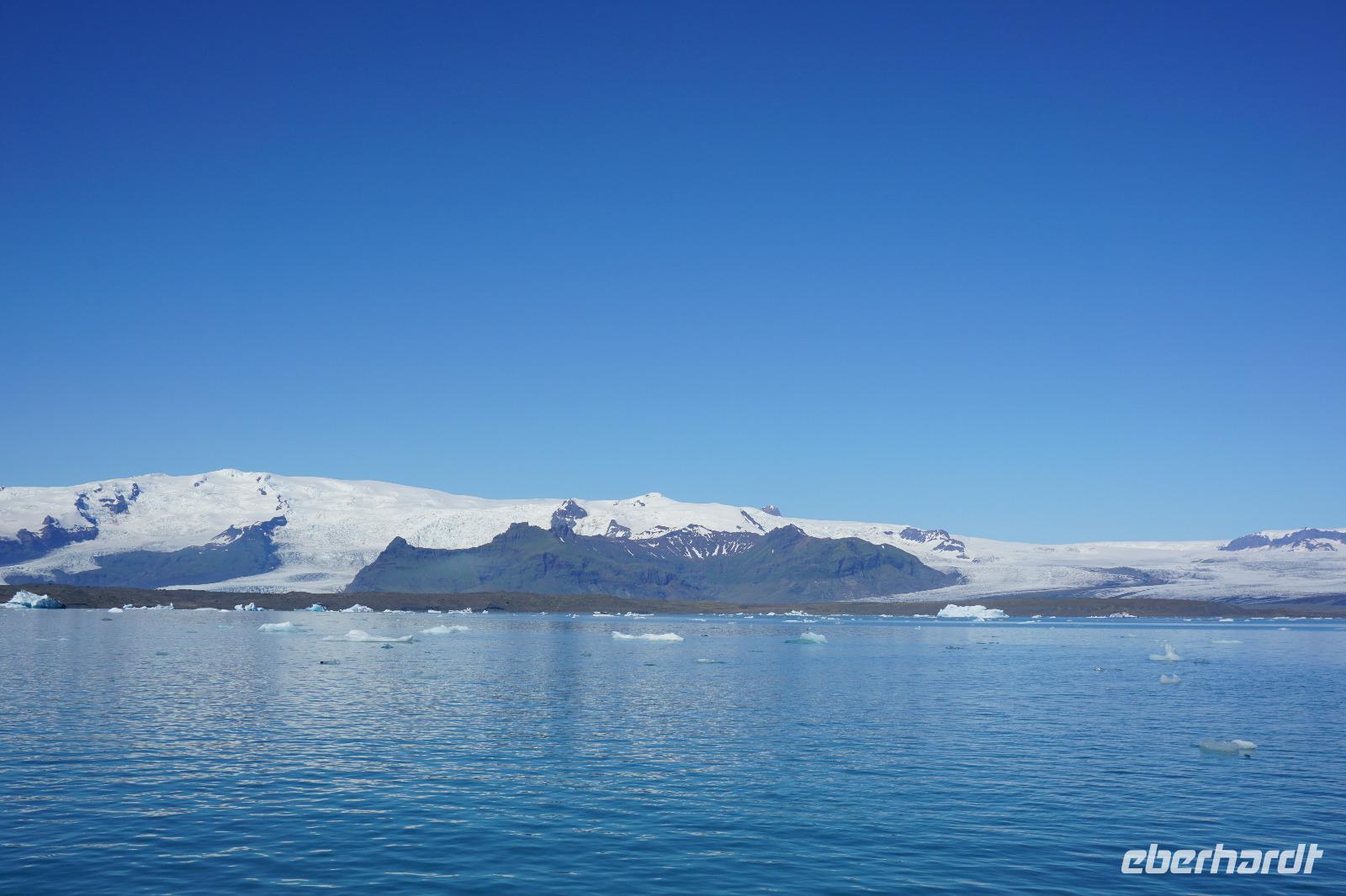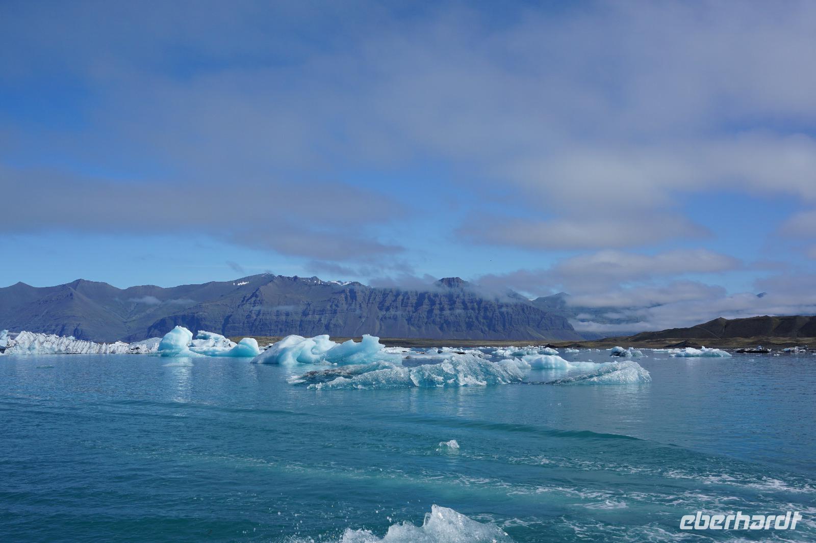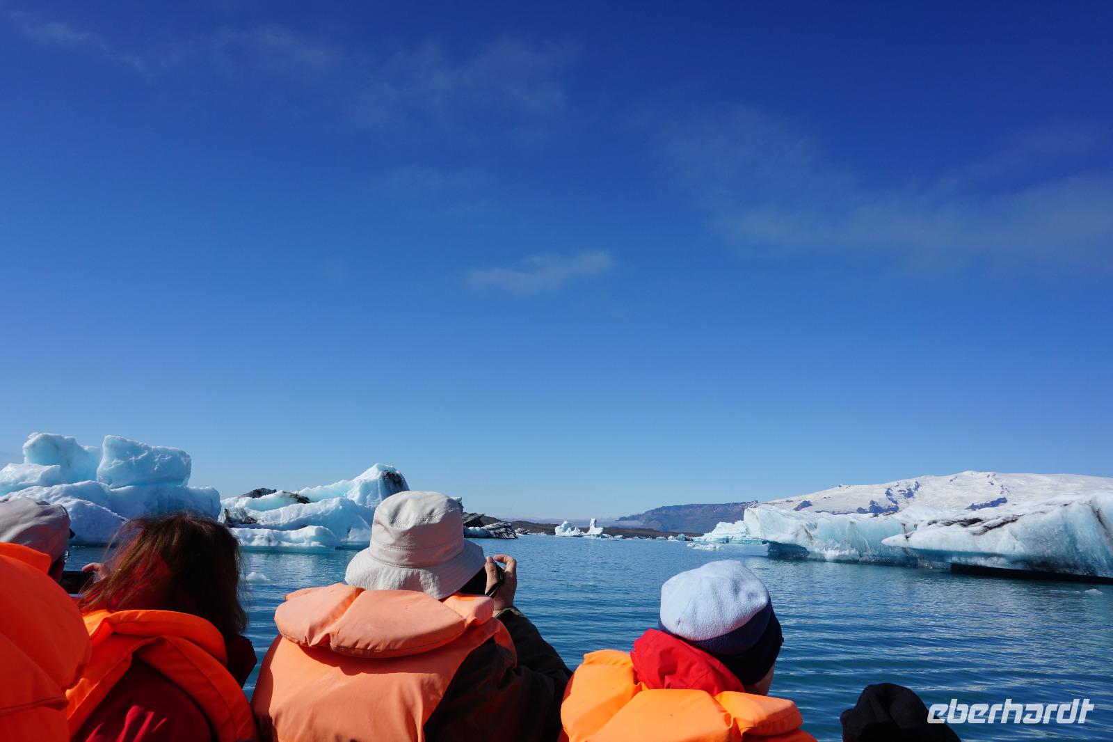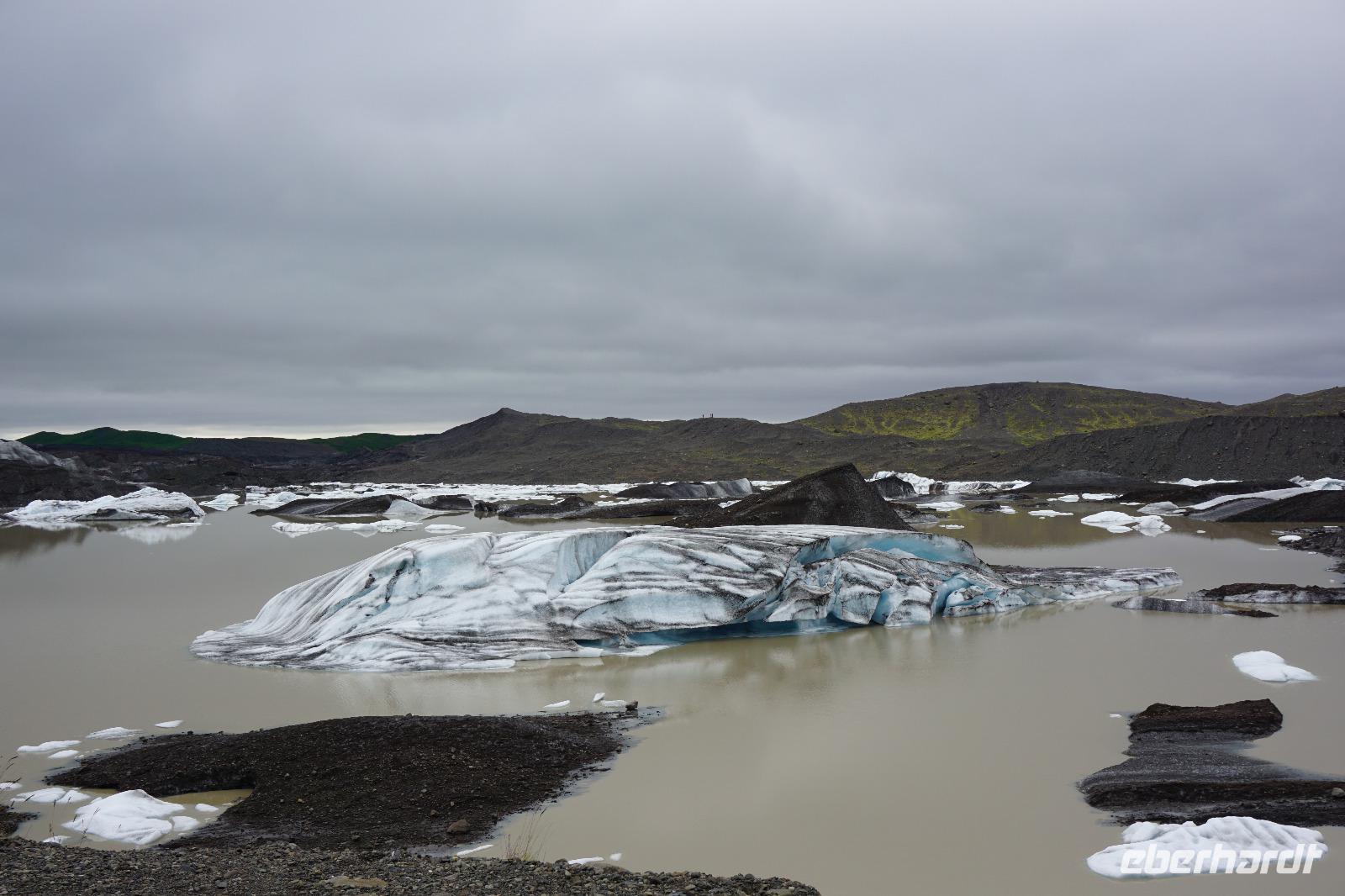 Am frühen Vormittag führte uns unser Weg zur Gletscherlagune Jökulsarlon, wo wir mit einem Amphibienfahrzeug über den größten Gletschersee Islands fuhren. Mit 258 Metern ist er der tiefste See der Insel. Unser Guide erzählte uns viel Interessantes über die Lagune, die voller schwimmender Eisberge unterschiedlicher Größen war. Später konnten wir sogar ein Stück von diesem kristallklaren Eises kosten. Überall auf dem See glitzerten die Eisberge in der Sonne und jeder sah etwas anders aus. Wir sahen auch nur ca. ein Drittel des Eisbergs, der größte Teil war im Wasser versteckt. Danach haben wir noch ein paar Fotos mit großen, an Land geschwemmten, Eisbergen gemacht. Unterwegs machten wir unsere Mittagspause an einer kleinen Raststätte. Anschließend fuhren wir in den Nationalpark Skaftafell, wo wir einen Blick auf das „ewige Eis" mit seinen vielen Spalten werfen konnten. Auch am Besuchszentrum machten wir einen kurzen Halt. Auf dem weiteren Weg hielten wir in einem kleinen Ort namens Kirkjubaejarklaustur, wo wir einen Spaziergang unternahmen und ein sonderbares Nonnendenkmal besichtigten. Wir fuhren weiter nach Vik, wo es die Möglichkeit für einen kleinen Fußmarsch am schwarzen Strand gab oder bei Ice Wear einige isländische Sachen einzukaufen. Sehr beliebt war der Kauf einer Mütze. Danach ging es für uns auch schon nach Dyrholaey zu unserem nächsten Hotel. Auf einem Berg gelegen, hatte man zum einen eine tolle Aussicht auf die schwarze Küste vor dem Hotel bzw. auf die durch die Sonne in Szene gesetzten Berge hinter dem Hotel. Man musste allerdings aufpassen, dass man nicht vom Wind weggeweht wird, weil dieser heute äußerst stark war. Nach ein bisschen Freizeit im Hotel haben wir gemeinsam gegessen.