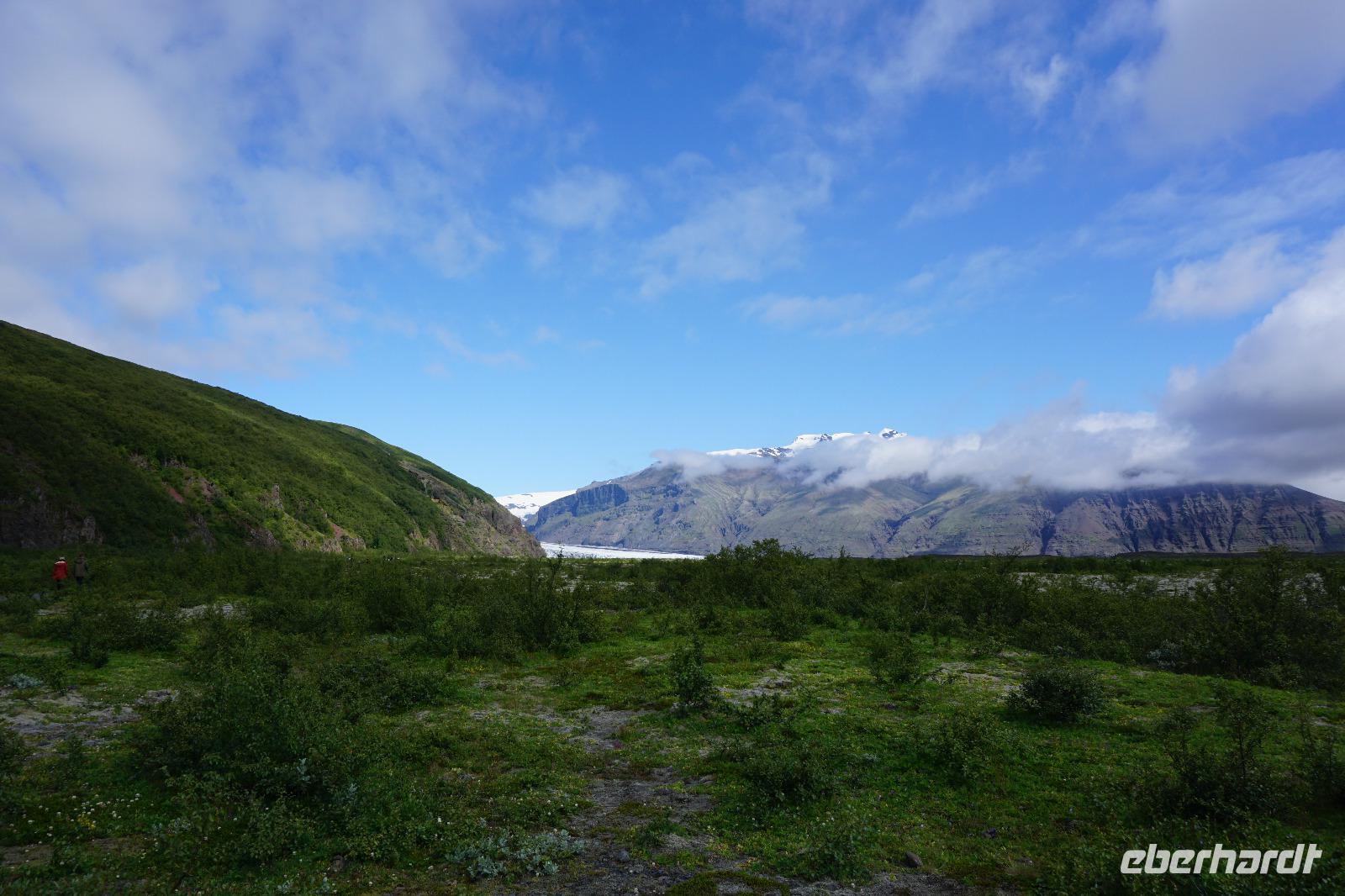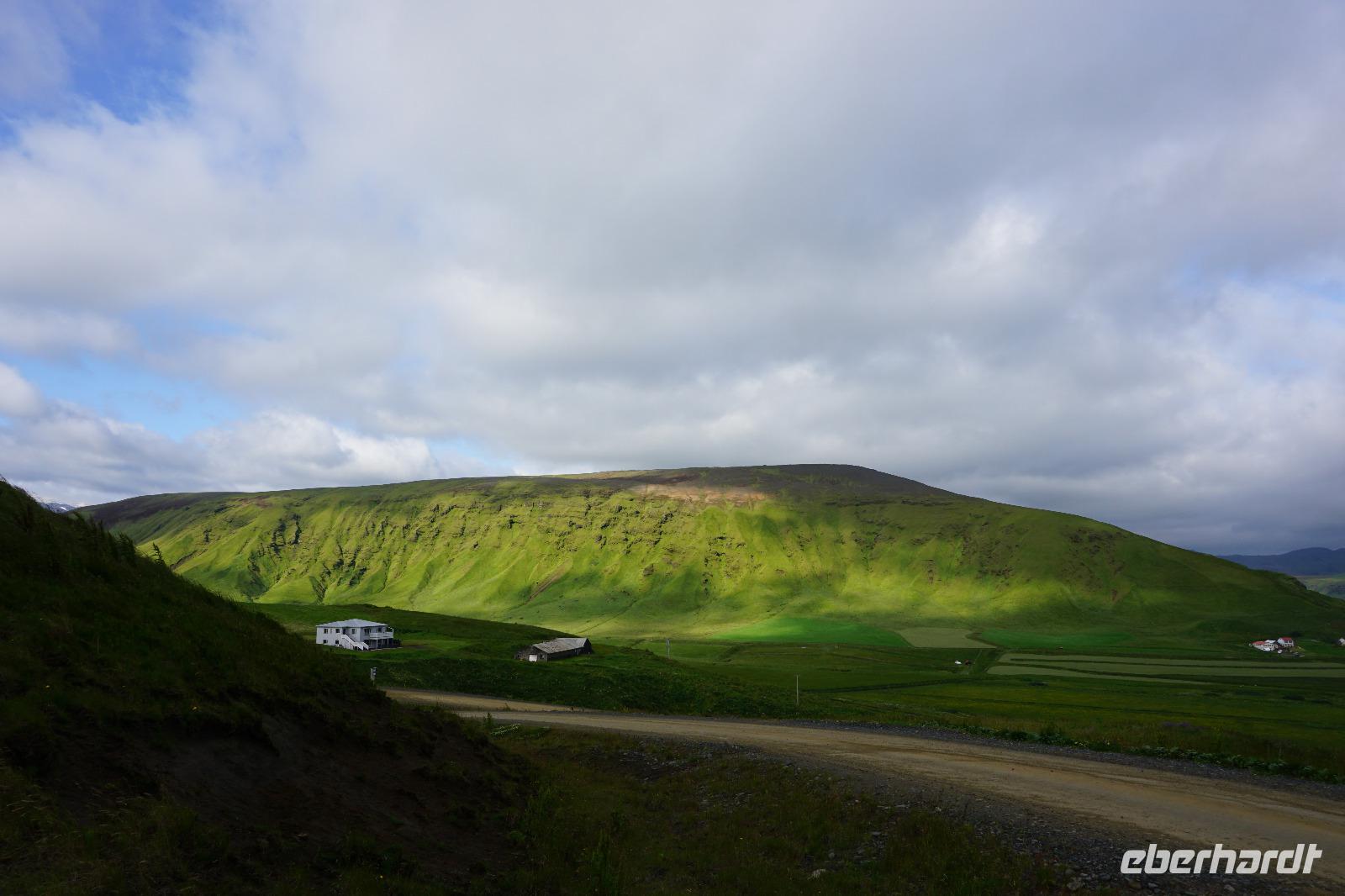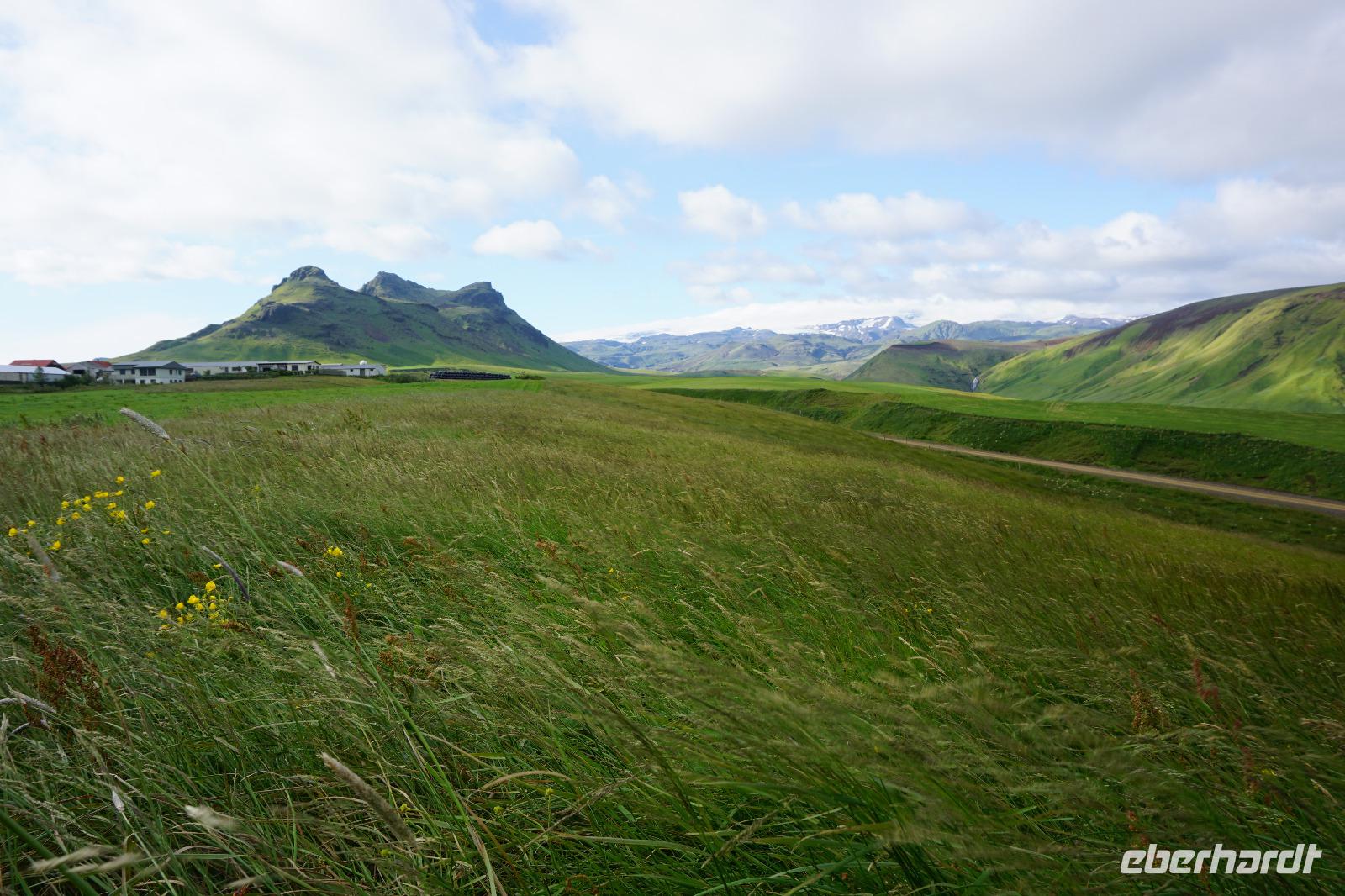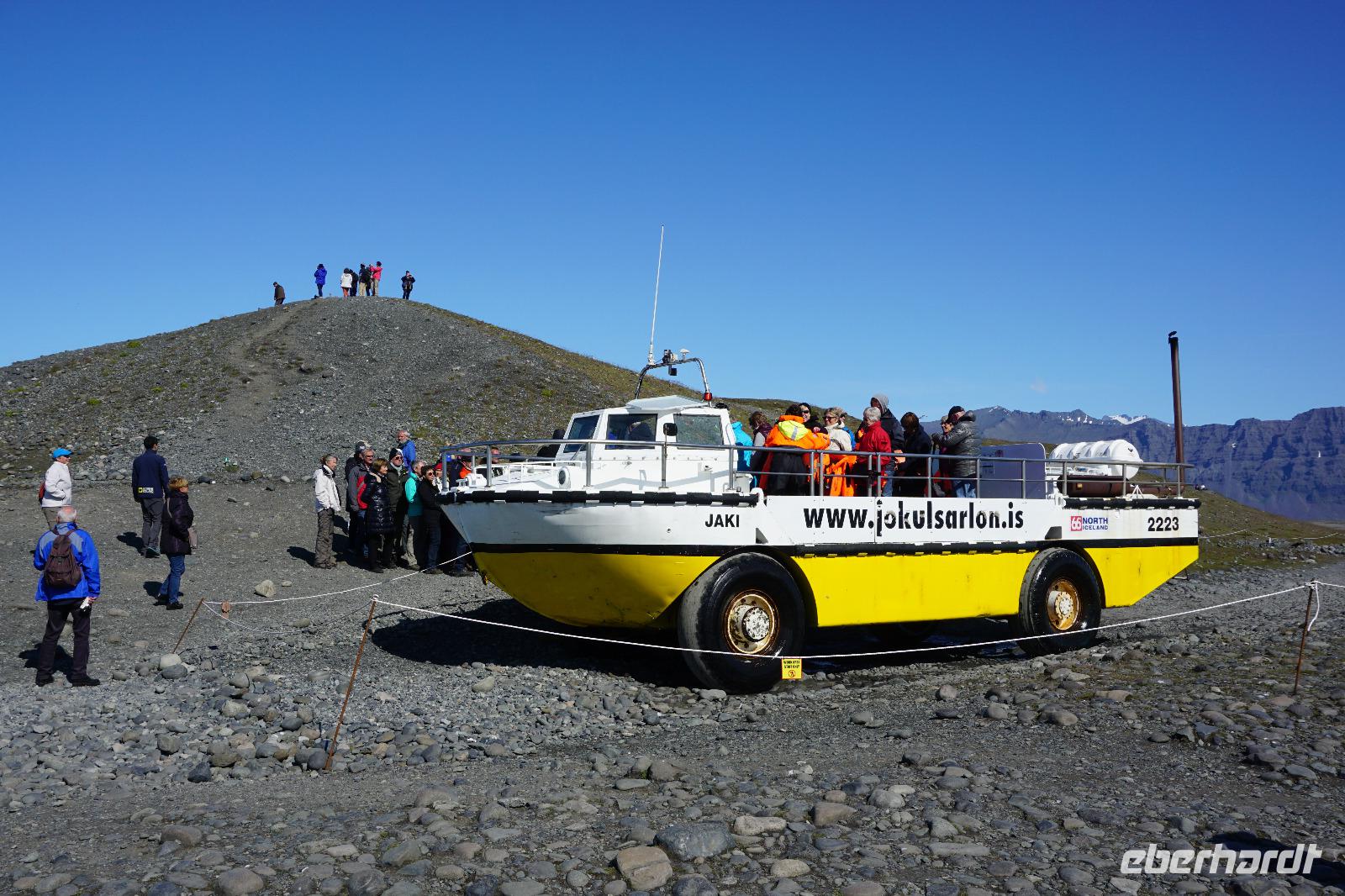 Am frühen Vormittag führte uns unser Weg zur Gletscherlagune Jökulsarlon, wo wir mit einem Amphibienfahrzeug über den größten Gletschersee Islands fuhren. Mit 258 Metern ist er der tiefste See der Insel. Unser Guide erzählte uns viel Interessantes über die Lagune, die voller schwimmender Eisberge unterschiedlicher Größen war. Später konnten wir sogar ein Stück von diesem kristallklaren Eises kosten. Überall auf dem See glitzerten die Eisberge in der Sonne und jeder sah etwas anders aus. Wir sahen auch nur ca. ein Drittel des Eisbergs, der größte Teil war im Wasser versteckt. Danach haben wir noch ein paar Fotos mit großen, an Land geschwemmten, Eisbergen gemacht. Unterwegs machten wir unsere Mittagspause an einer kleinen Raststätte. Anschließend fuhren wir in den Nationalpark Skaftafell, wo wir einen Blick auf das „ewige Eis" mit seinen vielen Spalten werfen konnten. Auch am Besuchszentrum machten wir einen kurzen Halt. Auf dem weiteren Weg hielten wir in einem kleinen Ort namens Kirkjubaejarklaustur, wo wir einen Spaziergang unternahmen und ein sonderbares Nonnendenkmal besichtigten. Wir fuhren weiter nach Vik, wo es die Möglichkeit für einen kleinen Fußmarsch am schwarzen Strand gab oder bei Ice Wear einige isländische Sachen einzukaufen. Sehr beliebt war der Kauf einer Mütze. Danach ging es für uns auch schon nach Dyrholaey zu unserem nächsten Hotel. Auf einem Berg gelegen, hatte man zum einen eine tolle Aussicht auf die schwarze Küste vor dem Hotel bzw. auf die durch die Sonne in Szene gesetzten Berge hinter dem Hotel. Man musste allerdings aufpassen, dass man nicht vom Wind weggeweht wird, weil dieser heute äußerst stark war. Nach ein bisschen Freizeit im Hotel haben wir gemeinsam gegessen.