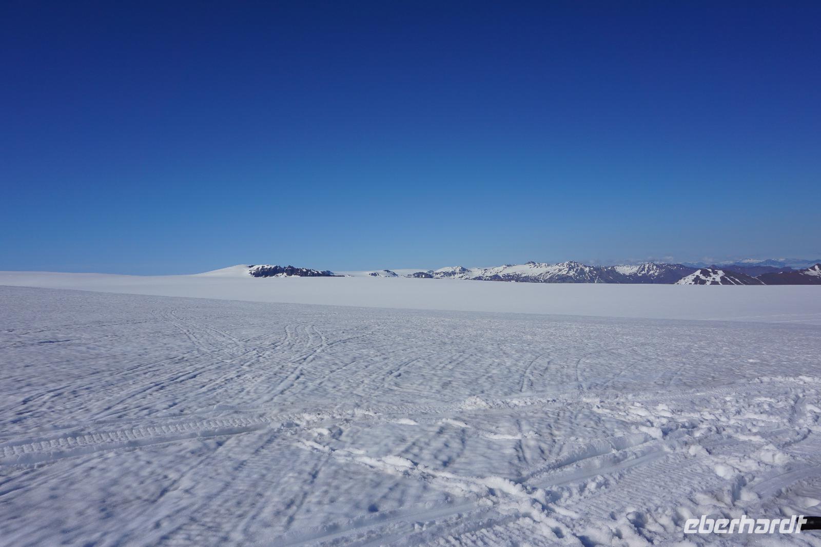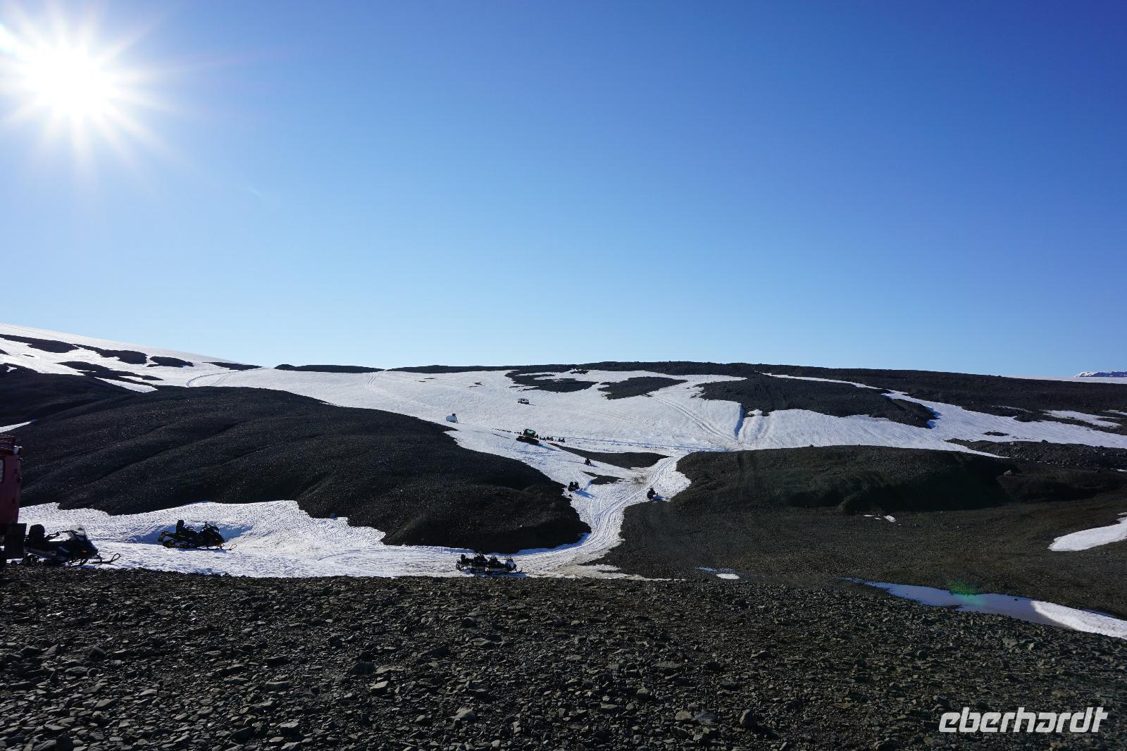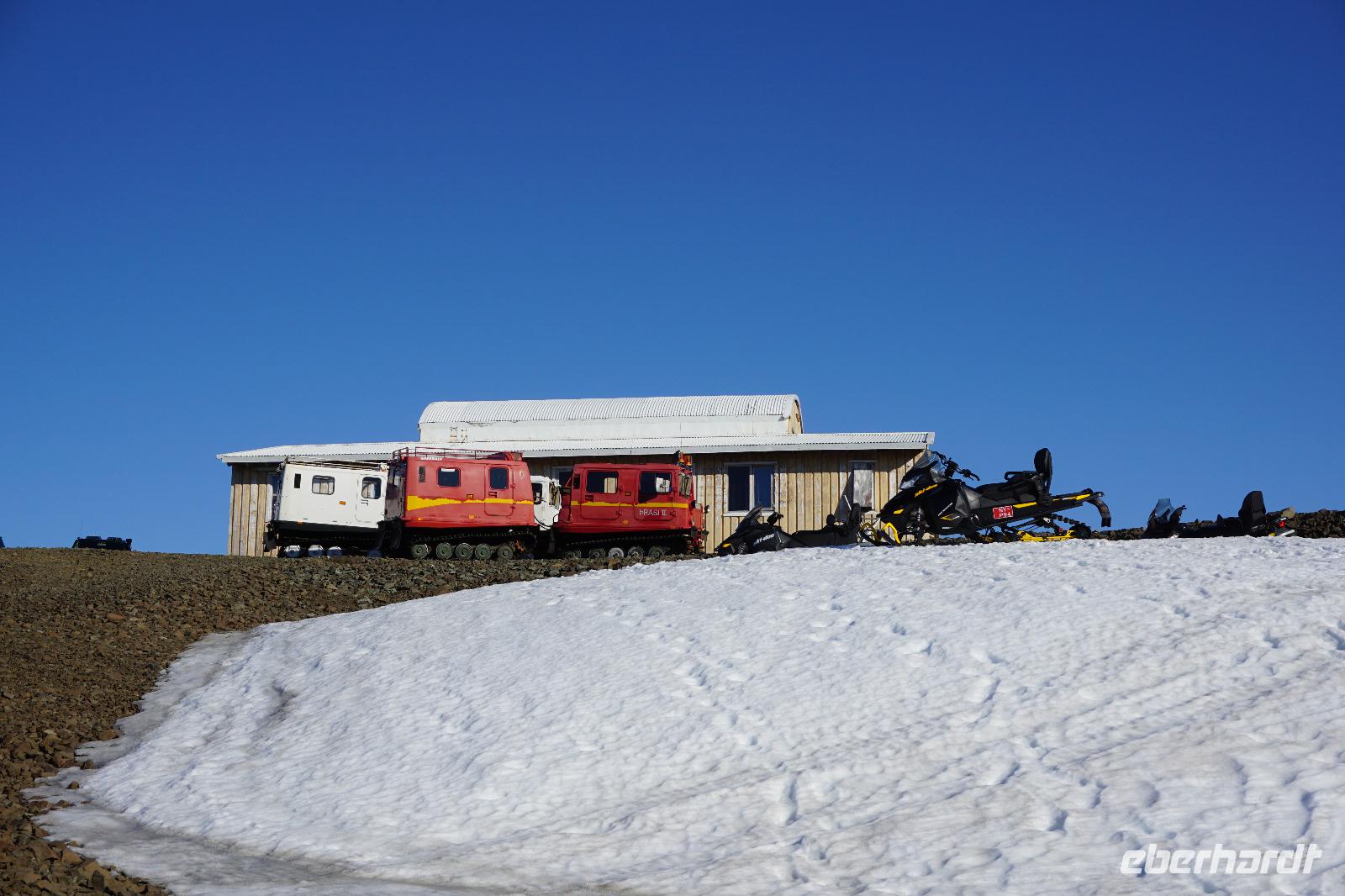 Mit gepackten Koffern verließen wir das Hotel und fuhren entlang der eindrucksvollen Ostküste. Ab und an machten wir einen kleinen Fotostopp bei einem Wasserfall inmitten grüner Landschaft. Unser erster Programmpunkt war Petras Steinhaus. Petras Sammlung besteht zum größten Teil aus Steinen, die in Stödvarfjördur und auf dem Gebiet des ganzen östlichen Islands gefunden wurden. Nachdem wir uns die prächtige Steinsammlung angesehen hatten, ging es für uns weiter nach Djupivogur, wo wir unsere Mittagspause machten. Auf dem Weg nach Höfn hielten wir noch an einem Felsen, wo man wieder die kleinen Papageitaucher entdecken konnte. Nachdem wir in Höfn angekommen waren, fuhren einige von uns mit einem Jeep auf den Gletscher Skalafellsjökull, ein Ausläufer des größten Gletschers Europas - dem Vatnajökull. Oben gab es die Möglichkeit selbst Schneemobil zu fahren. Wir wurden mit Schneeanzügen, Helmen und Gummistiefeln ausgestattet und dann ging es auch schon los. Am Anfang etwas holprig hatten wir schnell den Dreh raus und sehr viel Spaß am Fahren. Unsere kleine Gruppe war als einziges unterwegs. Außer uns gab es nur Berge, Schnee, klare Sicht und puren Sonnenschein. Für gewöhnlich sind nur etwa drei bis vier Grad Celsius auf dem Gletscher, heute waren es allerdings dreizehn! Einige andere von uns sind mit einem kleinen Bus bis zur Station auf ca. 800 Meter gefahren und haben sich von dort die wunderschönen mit Schnee überzogenen Ausläufer des Gletschers angesehen und natürlich auch unterwegs immer Mal das ein oder andere Foto geschossen. Nach einer aufregenden Tour und einem einmaligen Erlebnis, machten wir noch ein paar Fotos von dem großen Jeep. Dann ging es auch schon wieder runter vom Gletscher zurück ins Hotel. Am Abend trafen wir uns dann alle wieder.