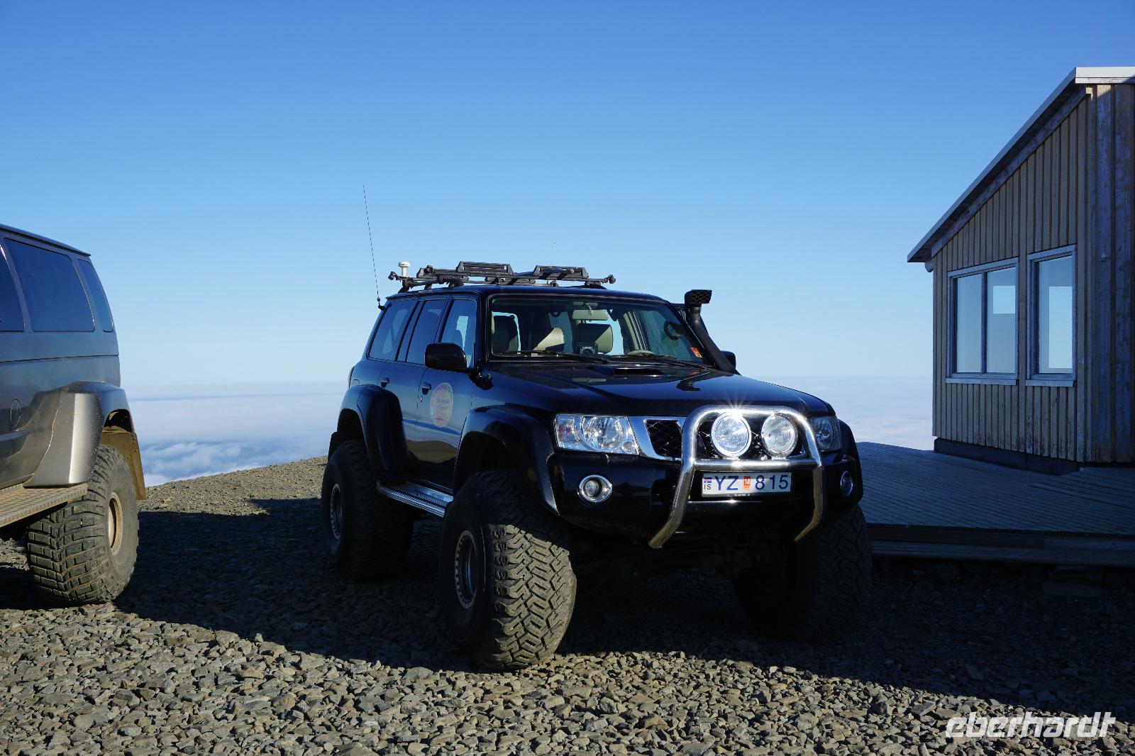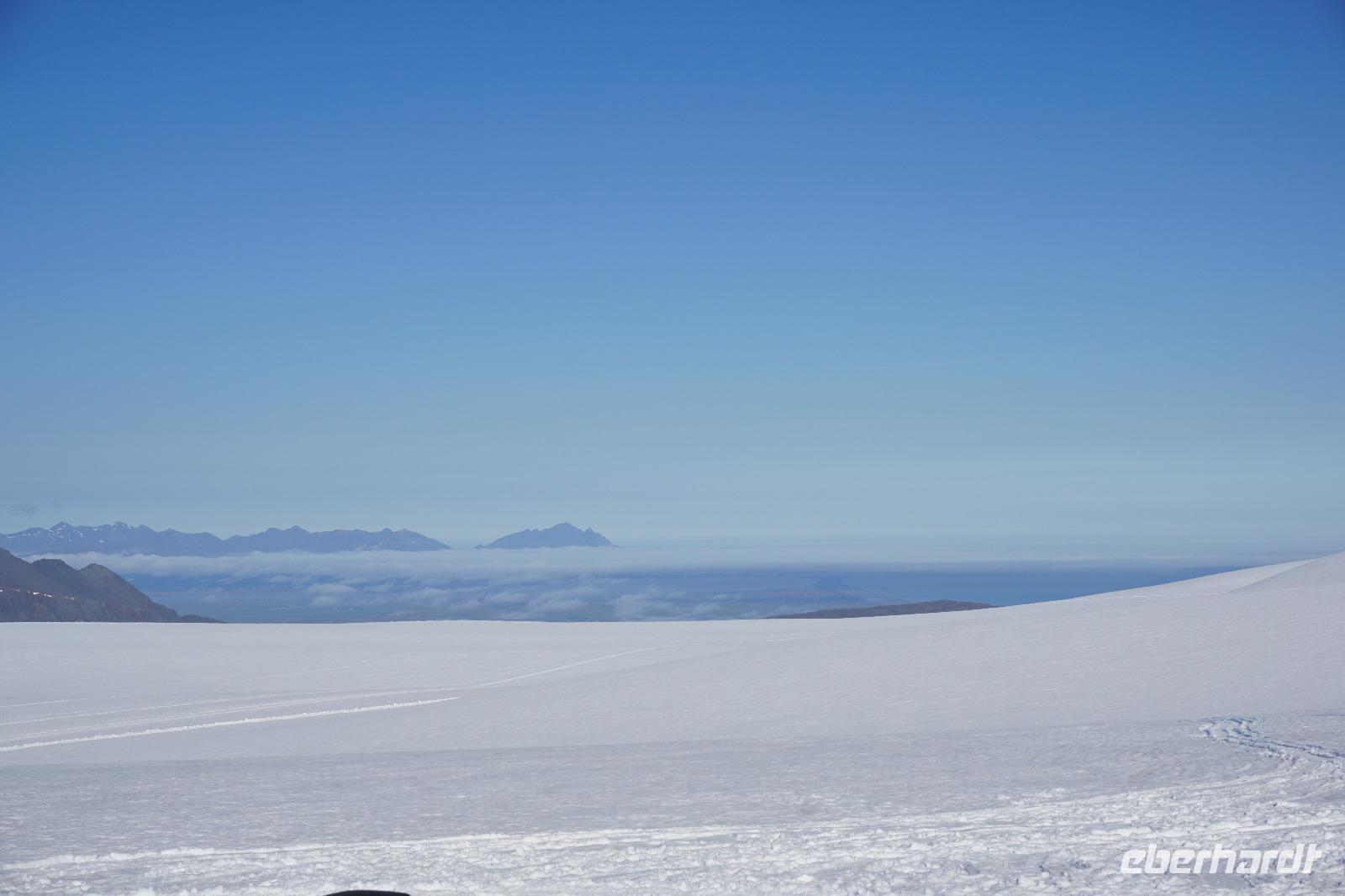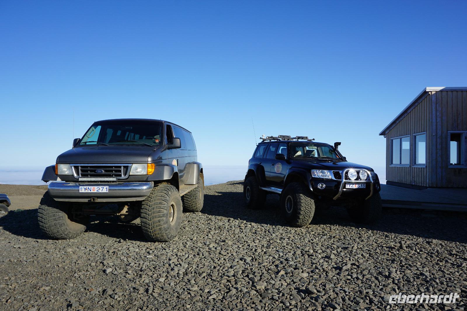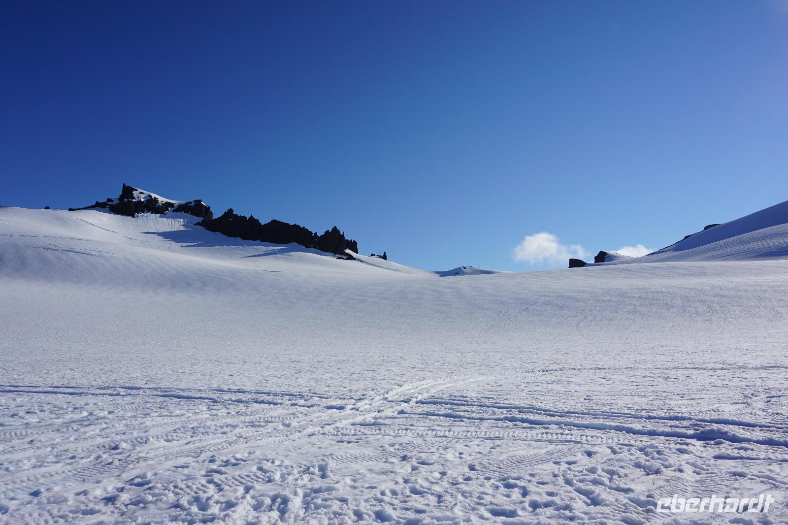 Mit gepackten Koffern verließen wir das Hotel und fuhren entlang der eindrucksvollen Ostküste. Ab und an machten wir einen kleinen Fotostopp bei einem Wasserfall inmitten grüner Landschaft. Unser erster Programmpunkt war Petras Steinhaus. Petras Sammlung besteht zum größten Teil aus Steinen, die in Stödvarfjördur und auf dem Gebiet des ganzen östlichen Islands gefunden wurden. Nachdem wir uns die prächtige Steinsammlung angesehen hatten, ging es für uns weiter nach Djupivogur, wo wir unsere Mittagspause machten. Auf dem Weg nach Höfn hielten wir noch an einem Felsen, wo man wieder die kleinen Papageitaucher entdecken konnte. Nachdem wir in Höfn angekommen waren, fuhren einige von uns mit einem Jeep auf den Gletscher Skalafellsjökull, ein Ausläufer des größten Gletschers Europas - dem Vatnajökull. Oben gab es die Möglichkeit selbst Schneemobil zu fahren. Wir wurden mit Schneeanzügen, Helmen und Gummistiefeln ausgestattet und dann ging es auch schon los. Am Anfang etwas holprig hatten wir schnell den Dreh raus und sehr viel Spaß am Fahren. Unsere kleine Gruppe war als einziges unterwegs. Außer uns gab es nur Berge, Schnee, klare Sicht und puren Sonnenschein. Für gewöhnlich sind nur etwa drei bis vier Grad Celsius auf dem Gletscher, heute waren es allerdings dreizehn! Einige andere von uns sind mit einem kleinen Bus bis zur Station auf ca. 800 Meter gefahren und haben sich von dort die wunderschönen mit Schnee überzogenen Ausläufer des Gletschers angesehen und natürlich auch unterwegs immer Mal das ein oder andere Foto geschossen. Nach einer aufregenden Tour und einem einmaligen Erlebnis, machten wir noch ein paar Fotos von dem großen Jeep. Dann ging es auch schon wieder runter vom Gletscher zurück ins Hotel. Am Abend trafen wir uns dann alle wieder.