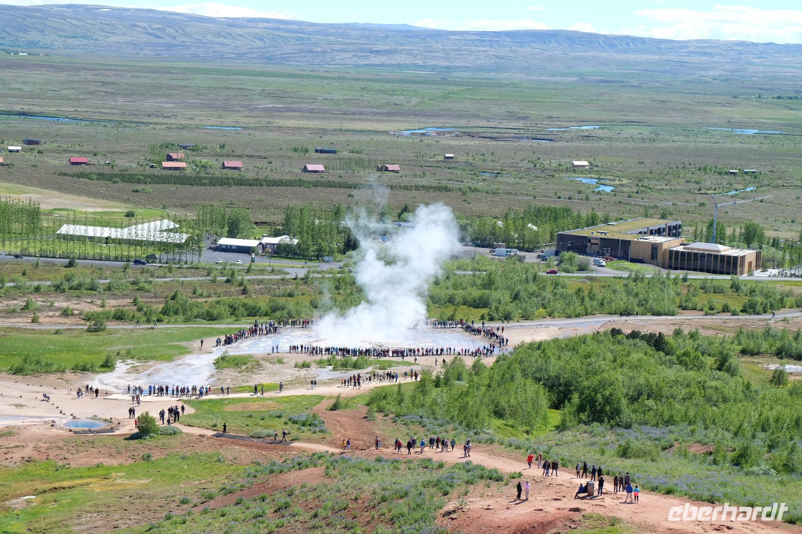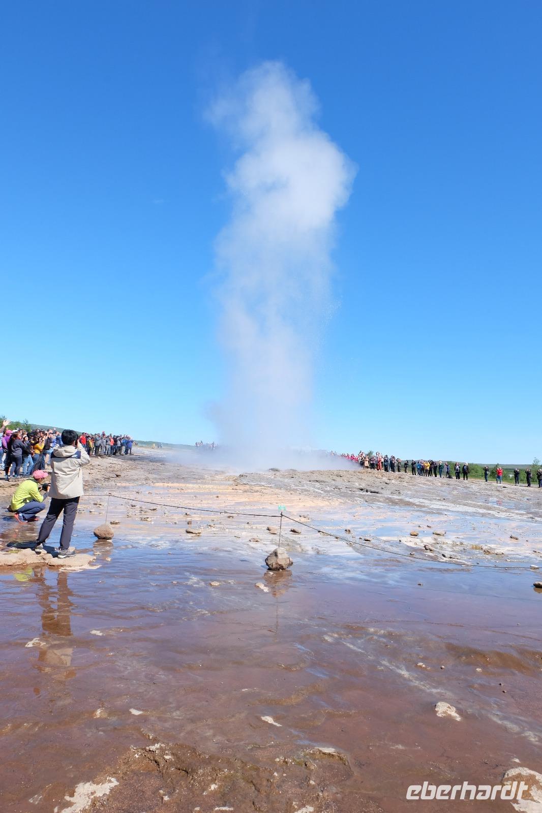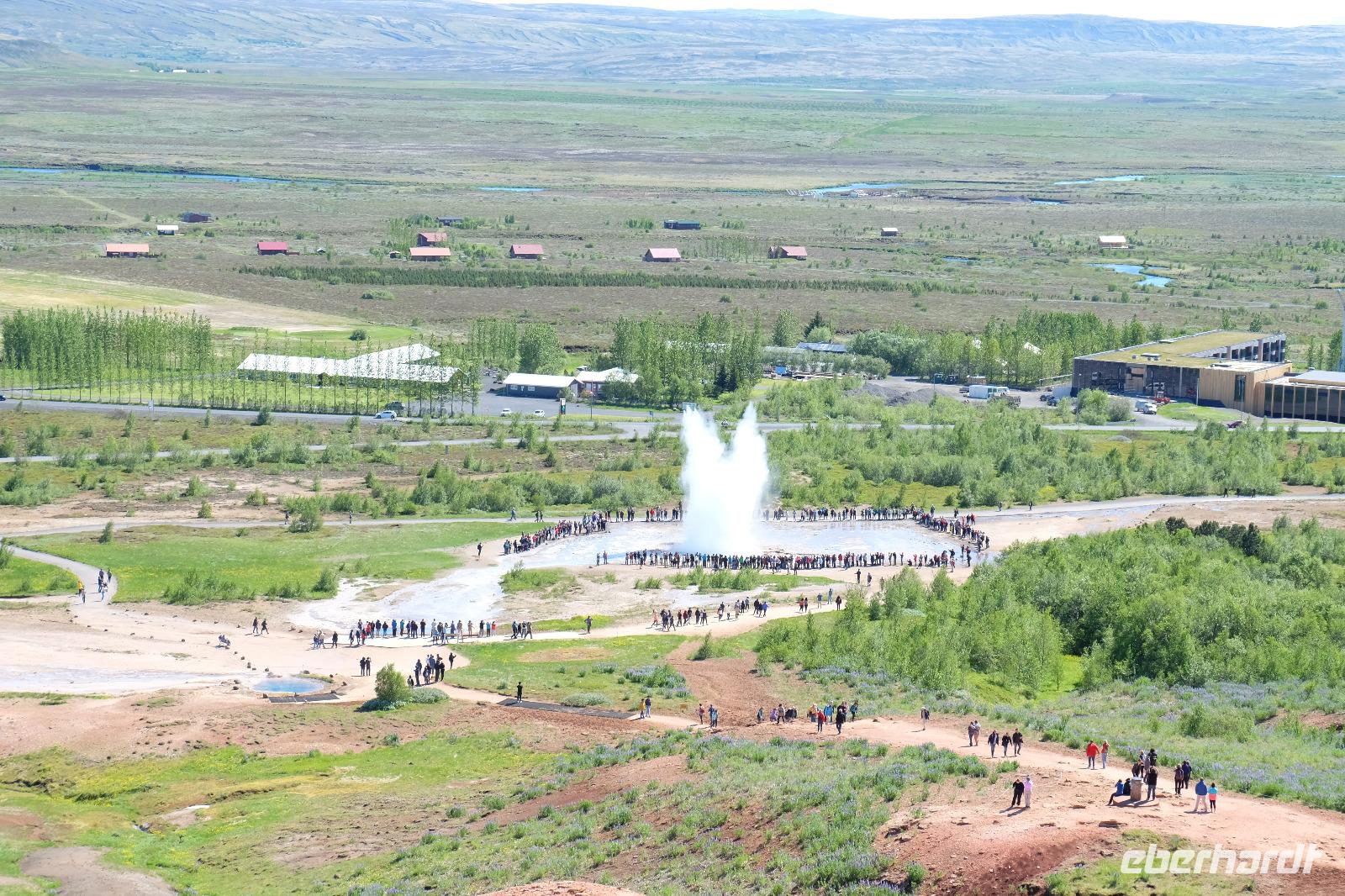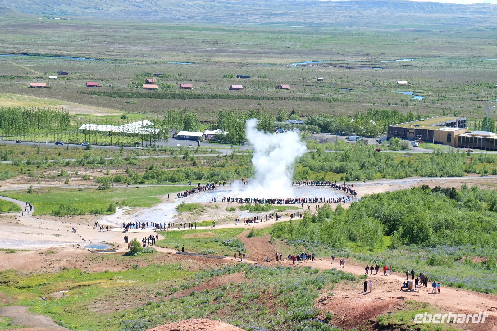 Gefällt dir das isländische Wetter nicht, dann warte einfach nur fünf Minuten. Der heutige Tag war der komplette Gegensatz zum gestrigen. Strahlender Sonnenschein, blauer Himmel und angenehme Temperaturen zauberten jedem Gast ein Lächeln ins Gesicht. Das heutige Thema unserer Reiseleiterin ist die Entstehung Islands, die heißen Quellen und die abwechslungsreiche Natur. Wir fuhren auf die Ringstraße Nummer 1, mit einer Länge von 1350 Km. Hier werden wir hauptsächlich während der Reise unterwegs sein. Unser erster Halt des heutigen Tages war der Kratersee Kerid (übersetzte der "Krug"). Das türkisblaue Wasser schimmerte im Licht und es entstand ein traumhaftes Fotomotiv. Weiter ging es nun zu dem ersten großen Wasserfall unserer Reise. An dem Punkt, an dem der Fluss Tungufljót einen scharfen rechtsknick macht liegt Faxi. Ein breiter Wasserfall, der mit einer gewaltigen Kraft einige Meter in die Tiefe stürzt. Einige von uns traten bis auf weniger als einen Meter an die reißende Strömung heran und spürten die Stärke des Wassers hautnah. Nach nur wenigen Minuten Fahrt, erreichten wir den wohl bekanntesten Wasserfall der Insel - Gullfoss - der Goldene Wasserfall. Über zwei versetzt aufeinanderliegenden Stufen des Flussbettes, stürzen hier über 1000 m3 Wasser pro Sekunde in die 70 Meter tiefe Schlucht des Flusses Hvítá. Die nächste Attraktion des heutigen Tages ist der Geysir Strokkur (übersetzt das "Butterfass"), der uns gleich bei unserer Ankunft mit seinem Ausbruch und der rießigen in die Luft schießenden Wassersäule begrüßt. Übrig blieb nur eine kleine Pfütze und große Augen in den Gesichtern der Gäste. Jeder wollte ein Foto oder Video von diesem gewaltigen Naturspektakel haben und so standen wir in Reih und Glied da und warteten gespannt auf den nächsten Ausbruch. Keine 10 Minuten später erlebten wir es erneut und dann nochmal und nochmal. Wir wollten gar nicht mehr weg. Doch es wartete ja noch mehr auf uns. Thingvellir (übersetzt die Parliamentwiesen) - die heiligste Stelle der Isländer ist unser nächster Stop. Wir spazierten durch den Nationalpark, kamen vorbei an einer kleinen Kirche, bis wir schließlich genau zwischen zwei Kontinentalplatten standen. Mit dem einen Fuß auf der europäischen und mit dem anderen auf der amerikanischen. Nach einer kurzen Pause trafen wir uns (fast) vollständig zur Weiterfahrt am Bus. Doch unsere Gruppe war schon jetzt ein eingeschweistes Team und so waren rasch wieder alle Schäfchen vereint. Geschafft von einem aufregenden und erlebnisreichen Tag, erreichten wir gegen frühen Abend unser Hotel in Reykjavik.