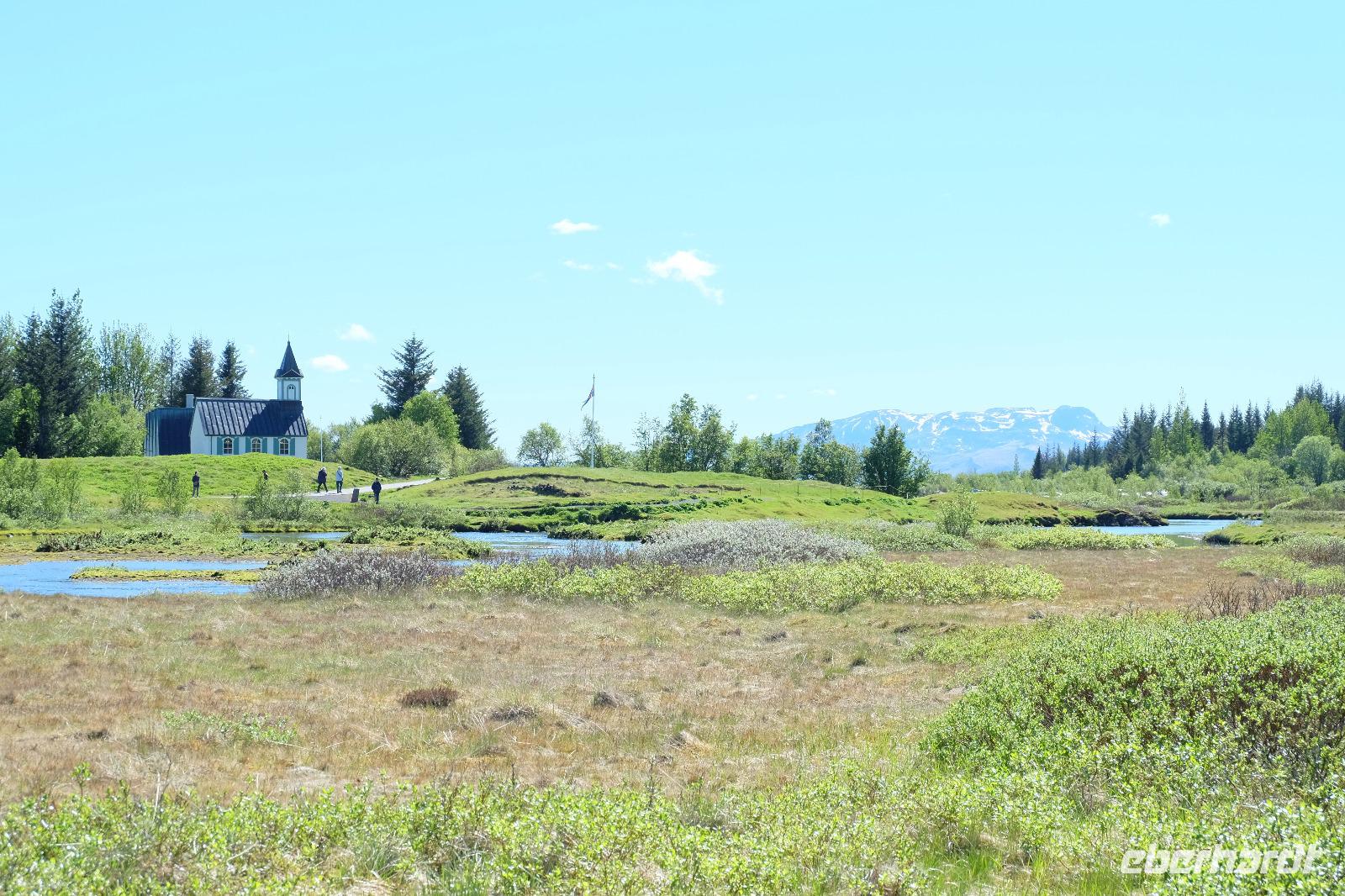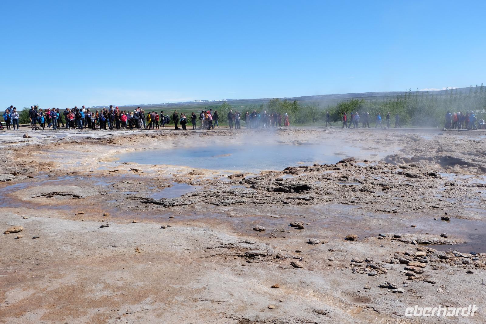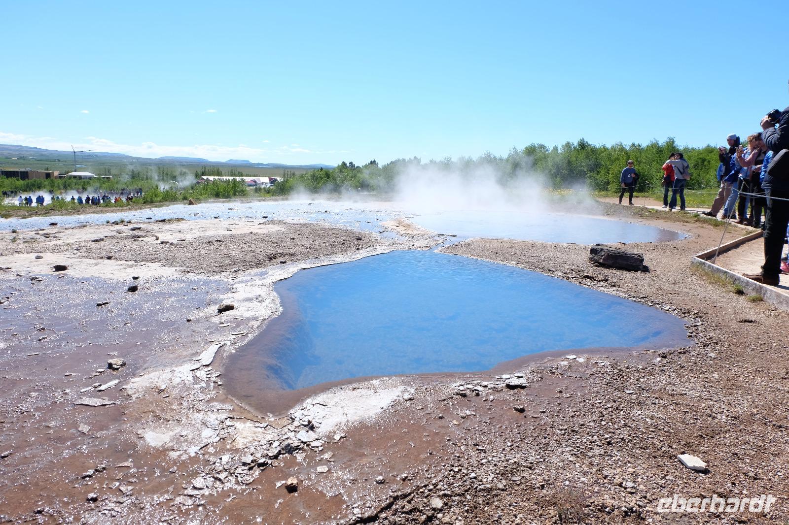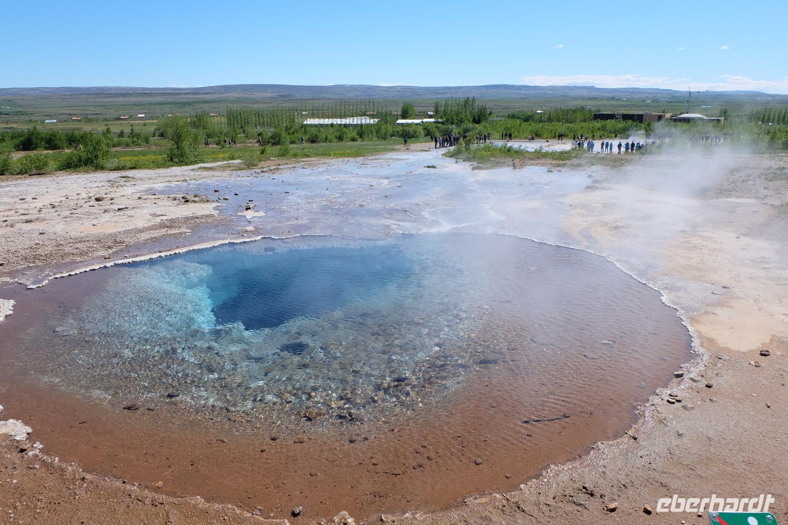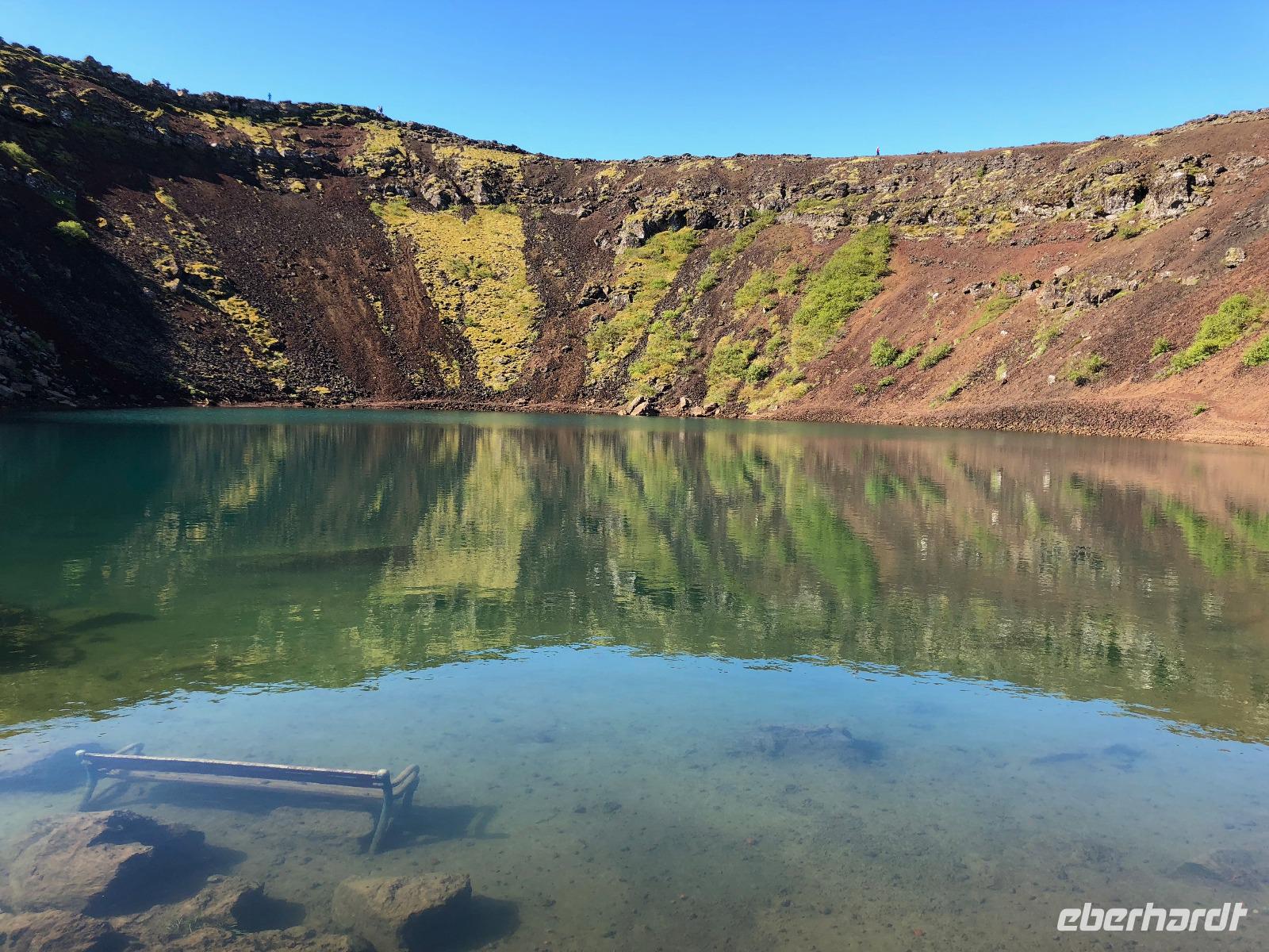Gefällt dir das isländische Wetter nicht, dann warte einfach nur fünf Minuten. Der heutige Tag war der komplette Gegensatz zum gestrigen. Strahlender Sonnenschein, blauer Himmel und angenehme Temperaturen zauberten jedem Gast ein Lächeln ins Gesicht. Das heutige Thema unserer Reiseleiterin ist die Entstehung Islands, die heißen Quellen und die abwechslungsreiche Natur. Wir fuhren auf die Ringstraße Nummer 1, mit einer Länge von 1350 Km. Hier werden wir hauptsächlich während der Reise unterwegs sein. Unser erster Halt des heutigen Tages war der Kratersee Kerid (übersetzte der "Krug"). Das türkisblaue Wasser schimmerte im Licht und es entstand ein traumhaftes Fotomotiv. Weiter ging es nun zu dem ersten großen Wasserfall unserer Reise. An dem Punkt, an dem der Fluss Tungufljót einen scharfen rechtsknick macht liegt Faxi. Ein breiter Wasserfall, der mit einer gewaltigen Kraft einige Meter in die Tiefe stürzt. Einige von uns traten bis auf weniger als einen Meter an die reißende Strömung heran und spürten die Stärke des Wassers hautnah. Nach nur wenigen Minuten Fahrt, erreichten wir den wohl bekanntesten Wasserfall der Insel - Gullfoss - der Goldene Wasserfall. Über zwei versetzt aufeinanderliegenden Stufen des Flussbettes, stürzen hier über 1000 m3 Wasser pro Sekunde in die 70 Meter tiefe Schlucht des Flusses Hvítá. Die nächste Attraktion des heutigen Tages ist der Geysir Strokkur (übersetzt das "Butterfass"), der uns gleich bei unserer Ankunft mit seinem Ausbruch und der rießigen in die Luft schießenden Wassersäule begrüßt. Übrig blieb nur eine kleine Pfütze und große Augen in den Gesichtern der Gäste. Jeder wollte ein Foto oder Video von diesem gewaltigen Naturspektakel haben und so standen wir in Reih und Glied da und warteten gespannt auf den nächsten Ausbruch. Keine 10 Minuten später erlebten wir es erneut und dann nochmal und nochmal. Wir wollten gar nicht mehr weg. Doch es wartete ja noch mehr auf uns. Thingvellir (übersetzt die Parliamentwiesen) - die heiligste Stelle der Isländer ist unser nächster Stop. Wir spazierten durch den Nationalpark, kamen vorbei an einer kleinen Kirche, bis wir schließlich genau zwischen zwei Kontinentalplatten standen. Mit dem einen Fuß auf der europäischen und mit dem anderen auf der amerikanischen. Nach einer kurzen Pause trafen wir uns (fast) vollständig zur Weiterfahrt am Bus. Doch unsere Gruppe war schon jetzt ein eingeschweistes Team und so waren rasch wieder alle Schäfchen vereint. Geschafft von einem aufregenden und erlebnisreichen Tag, erreichten wir gegen frühen Abend unser Hotel in Reykjavik.