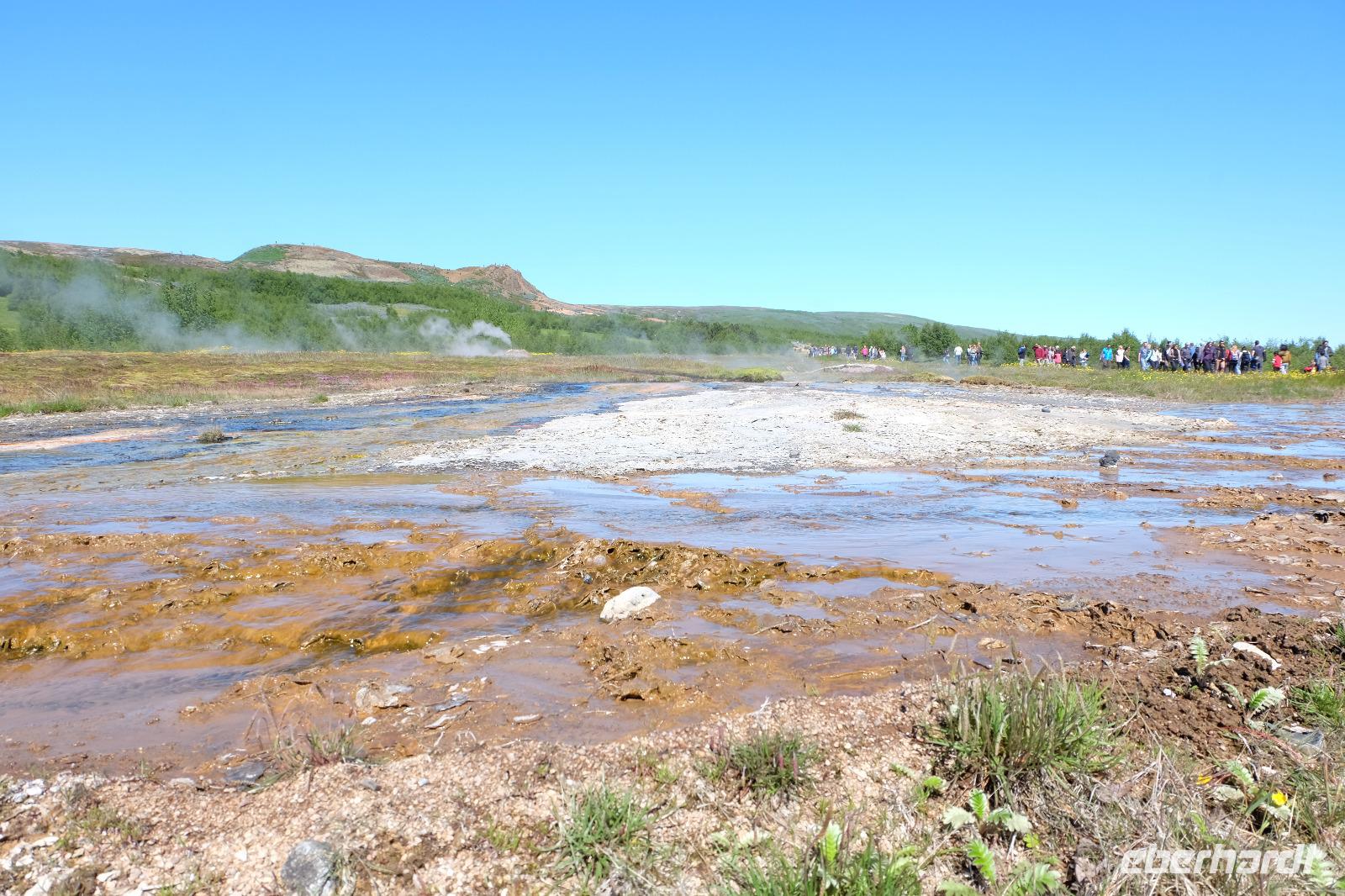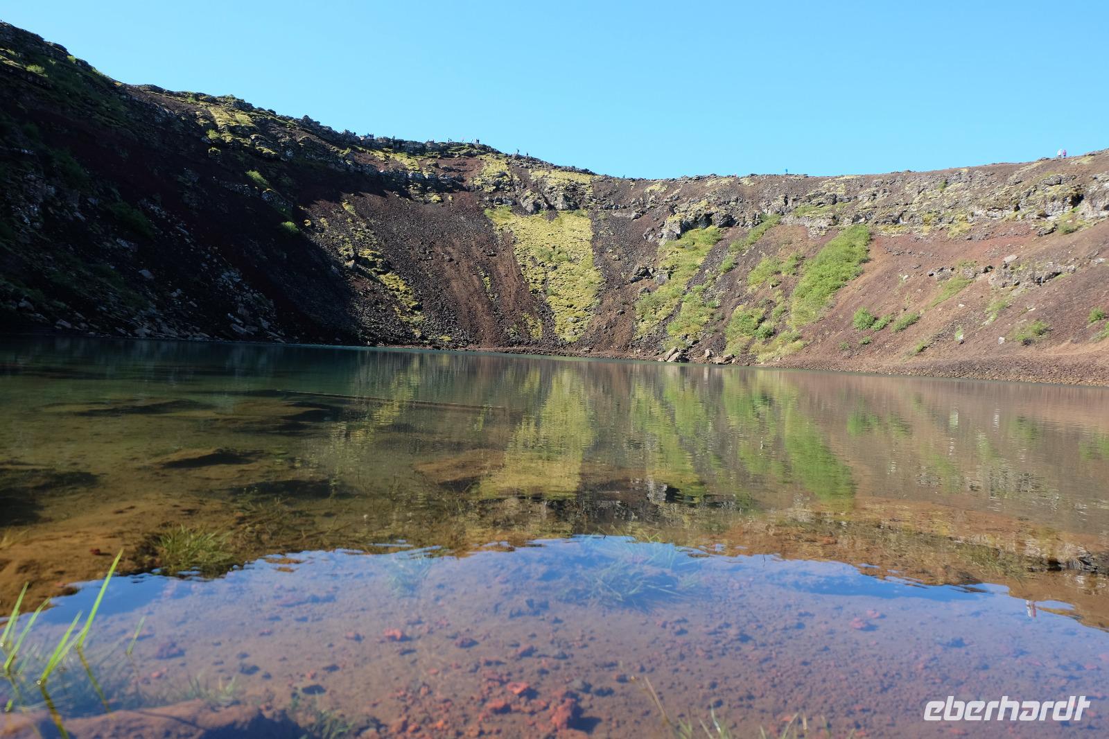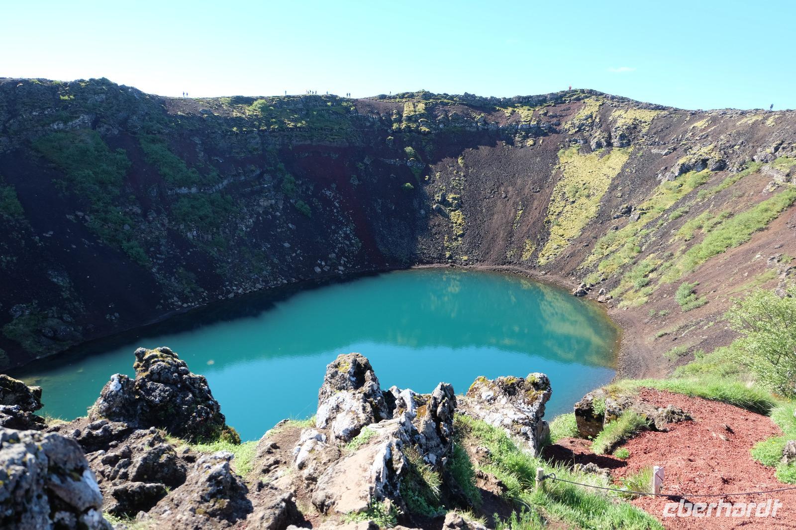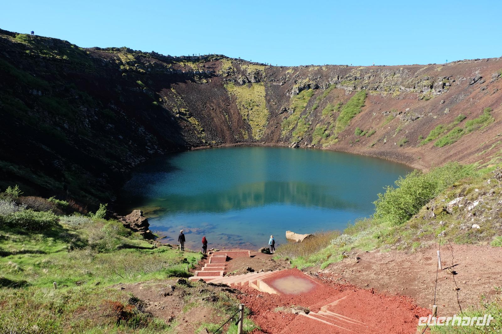 Gefällt dir das isländische Wetter nicht, dann warte einfach nur fünf Minuten. Der heutige Tag war der komplette Gegensatz zum gestrigen. Strahlender Sonnenschein, blauer Himmel und angenehme Temperaturen zauberten jedem Gast ein Lächeln ins Gesicht. Das heutige Thema unserer Reiseleiterin ist die Entstehung Islands, die heißen Quellen und die abwechslungsreiche Natur. Wir fuhren auf die Ringstraße Nummer 1, mit einer Länge von 1350 Km. Hier werden wir hauptsächlich während der Reise unterwegs sein. Unser erster Halt des heutigen Tages war der Kratersee Kerid (übersetzte der "Krug"). Das türkisblaue Wasser schimmerte im Licht und es entstand ein traumhaftes Fotomotiv. Weiter ging es nun zu dem ersten großen Wasserfall unserer Reise. An dem Punkt, an dem der Fluss Tungufljót einen scharfen rechtsknick macht liegt Faxi. Ein breiter Wasserfall, der mit einer gewaltigen Kraft einige Meter in die Tiefe stürzt. Einige von uns traten bis auf weniger als einen Meter an die reißende Strömung heran und spürten die Stärke des Wassers hautnah. Nach nur wenigen Minuten Fahrt, erreichten wir den wohl bekanntesten Wasserfall der Insel - Gullfoss - der Goldene Wasserfall. Über zwei versetzt aufeinanderliegenden Stufen des Flussbettes, stürzen hier über 1000 m3 Wasser pro Sekunde in die 70 Meter tiefe Schlucht des Flusses Hvítá. Die nächste Attraktion des heutigen Tages ist der Geysir Strokkur (übersetzt das "Butterfass"), der uns gleich bei unserer Ankunft mit seinem Ausbruch und der rießigen in die Luft schießenden Wassersäule begrüßt. Übrig blieb nur eine kleine Pfütze und große Augen in den Gesichtern der Gäste. Jeder wollte ein Foto oder Video von diesem gewaltigen Naturspektakel haben und so standen wir in Reih und Glied da und warteten gespannt auf den nächsten Ausbruch. Keine 10 Minuten später erlebten wir es erneut und dann nochmal und nochmal. Wir wollten gar nicht mehr weg. Doch es wartete ja noch mehr auf uns. Thingvellir (übersetzt die Parliamentwiesen) - die heiligste Stelle der Isländer ist unser nächster Stop. Wir spazierten durch den Nationalpark, kamen vorbei an einer kleinen Kirche, bis wir schließlich genau zwischen zwei Kontinentalplatten standen. Mit dem einen Fuß auf der europäischen und mit dem anderen auf der amerikanischen. Nach einer kurzen Pause trafen wir uns (fast) vollständig zur Weiterfahrt am Bus. Doch unsere Gruppe war schon jetzt ein eingeschweistes Team und so waren rasch wieder alle Schäfchen vereint. Geschafft von einem aufregenden und erlebnisreichen Tag, erreichten wir gegen frühen Abend unser Hotel in Reykjavik.