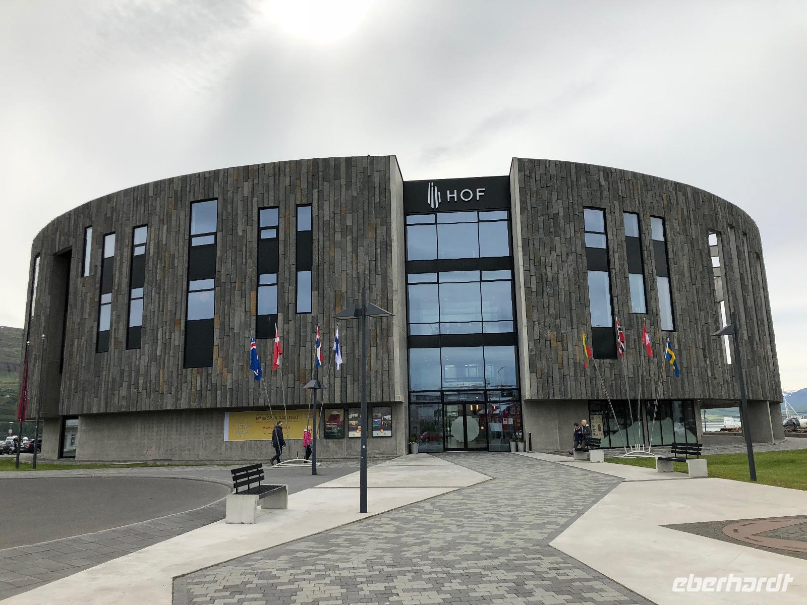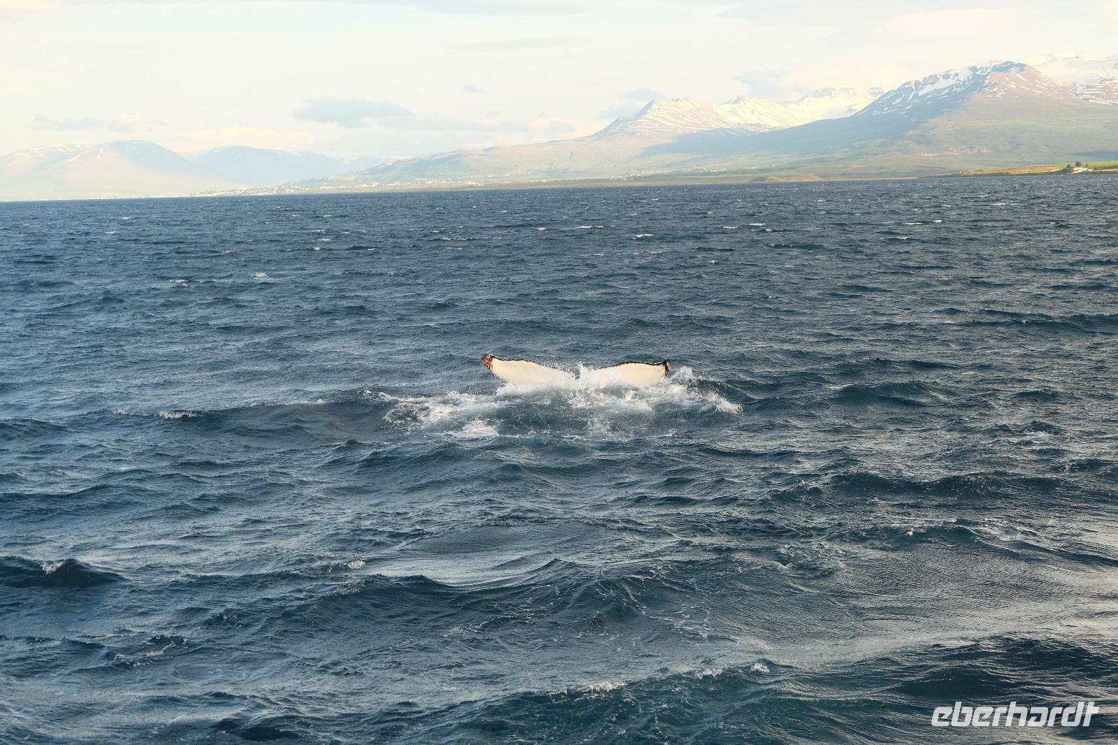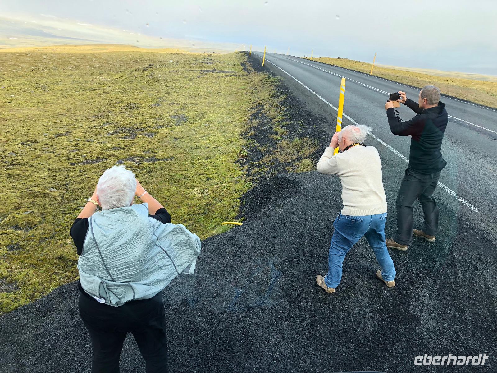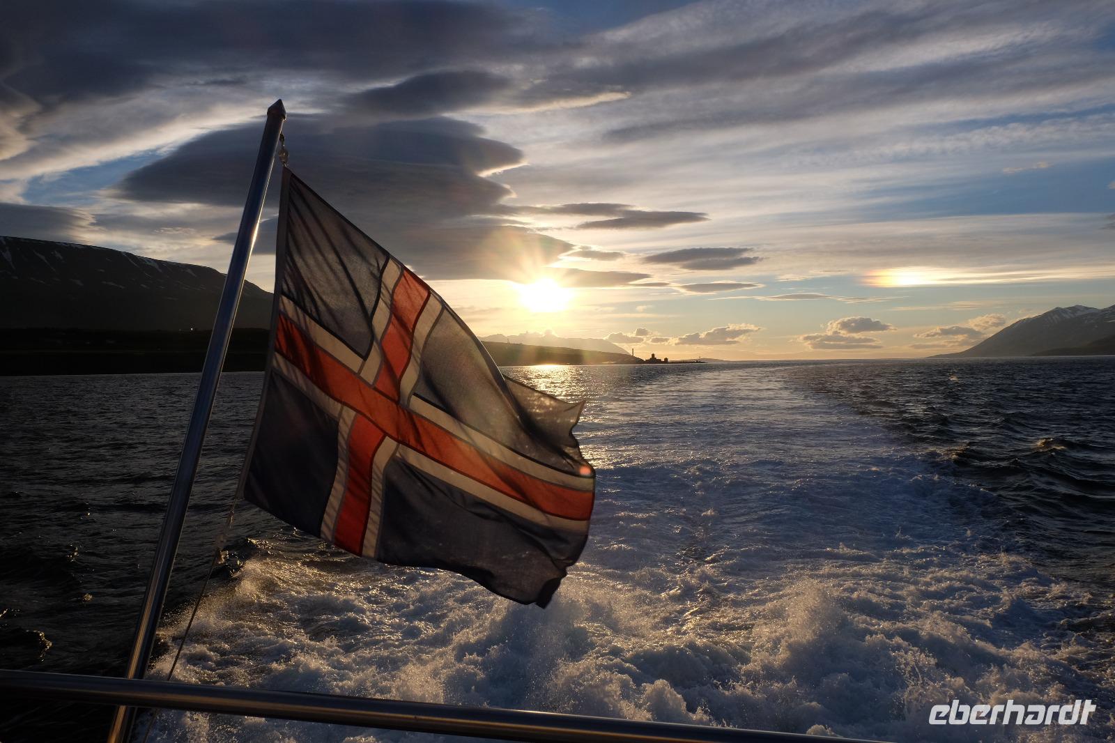 Unser Tag begann mit einer kleinen Wanderung auf den Grabrok Krater, welche sich schnell als ein Kampf gegen den Sturm herausstellte. Der Regen lies keine Sekunde auf sich warten - wir hatten ihn ja schon vermisst. Doch der kurze Regenschauer sollte vorerst der letzte auf unserer Reise sein. Nach diesem Frühsport geht es weiter in Richtung der Galsi Horse Farm. Auf dem Weg dahin fuhren wir durch die mystischen und sagenumworbenen Heiden Islands. Hier befindet sich eine große Wetterschneise, somit ist die Gefahr vor extrem schnellem Wetterwechsel ungewöhnlich hoch. Unsere Reiseleiterin erzählte uns viele Geschichten um diesen Ort und so waren wir dann sehr erleichtert, als wir dieses Gebiet durchquert hatten und ein etwas friedlicheres Thema auf uns wartete - die Island Pferde. Auf dem Reiterhof wurden uns die verschiedenen Gangarten der Pferde vorgeführt. Danach durfte jeder die Tiere von Nahen beobachten, mit Gras füttern und Fotos machen. Gegen Nachmittag machte sich die Sonne bemerkbar und wir nutzten die aufkommende gute Stimmung, um gemeinsam auf unser Abenteuer Island anzustoßen und den isländischen Stockfisch zu probieren. Nach dem zügigen Entleeren des Brennivins zu urteilen, hat der typisch isländische Kartoffelschnaps jedem sehr gemundet. Mit neuer Energie und lockerer Stimmung erreichten wir Akureyri, unseren heutigen Übernachtungsort. Wir machten einen kurzen Stop in der Stadt, um die Isländer bei den letzten Minuten des WM-Spiels beim Public Viewing zu unterstützen. Im Hotel angekommen, ging es für einige Gäste auch gleich zum nächsten Highlight der Reise - die Walsafari. Wir staunten nicht schlecht, als wir die blauen Riesen direkt vor dem Boot auftauchen sahen und mit einem großen Hieb ihrer Schwanzflosse verabschiedet wurden.