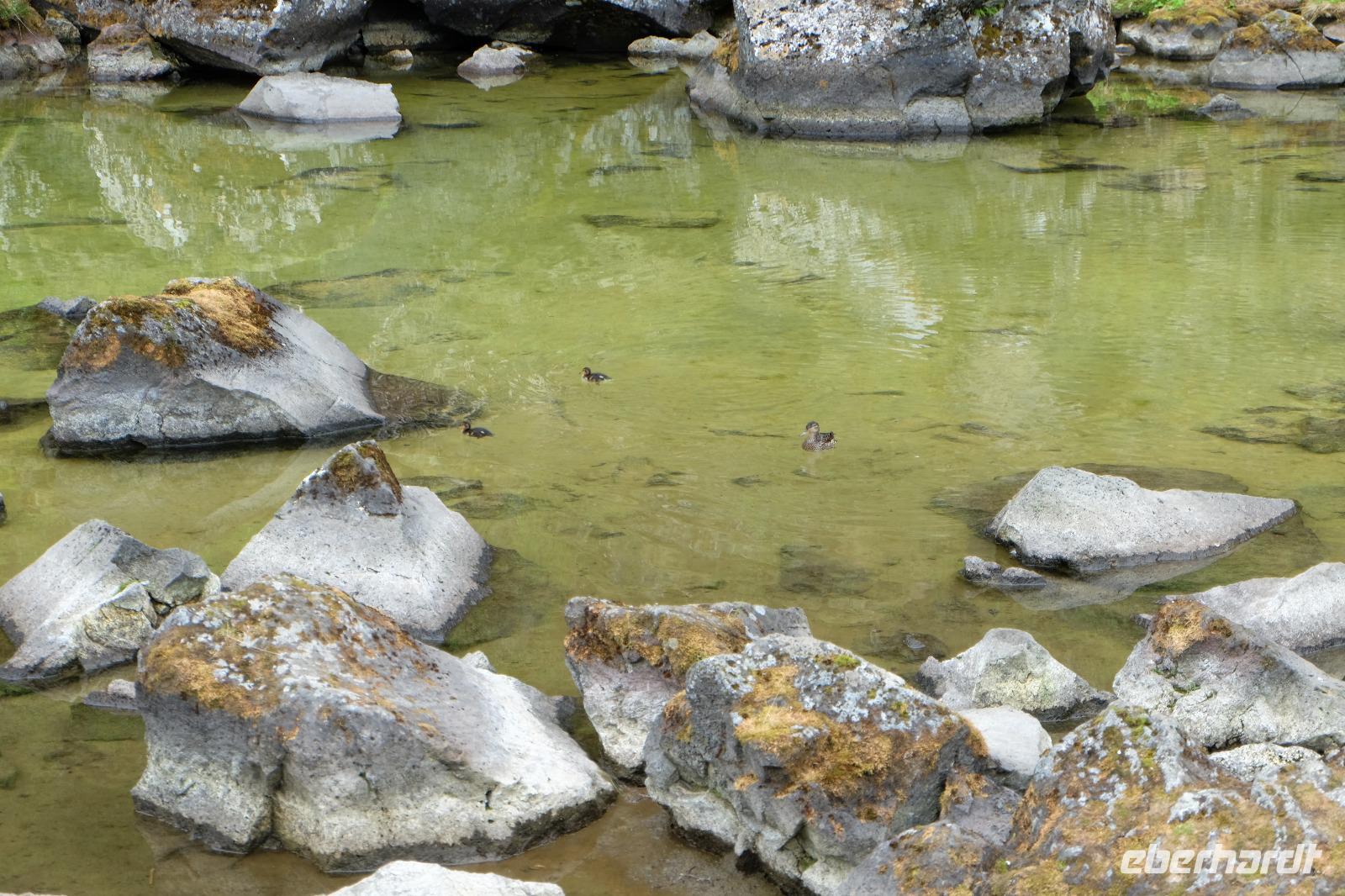 Nur wenige Minuten von unserem Hotel entfernt, befindet sich der Myvatn (übersetzt der Mückensee). Und er macht seinem Namen alle Ehre. Der über 35 Km2 große und etwa 2500 Jahre alte See entstand aus alten Lavafeldern und in seiner Mitte befinden sich 50 kleine Inseln, die wir von den Kratern aus entdecken konnten. Wir fuhren entland des Laxa, einem herrlichen Lachsfluss, an welchen unser Busfahrer am liebsten seine Angel sofort zücken würde, weiter nach Dimmuborgir in die dunkle Stadt. Hier gibt es ein Labyrinth aus Lavafeldern mit natürlich entstanden Felsfiguren. Durch unsere Fantasie sahen wir die eigenartigsten Kraturen und wurden zu erfinderischen Geschichtenerzählern. Nach unserem Spaziergang war es Zeit für ein wenig Entspannung und so ließen wir im Naturbad Jardbodin im warmen und mineralhaltigen Wasser die Seele baumeln. Fünf Jahre jünger und entspannter denn je, ging für uns die Reise weiter nach Namaskard. Heiße Dämpfe und eine schwefelige Note steigen aus den blubbernden Schlammlöchern und dominieren hier die karge Landschaft. Die Bewegung unter der Erde ist hier besonders stark spürbar. Und der ein oder andere spürte den heißen Schlamm auch etwas zu sehr. Eine Abkühlung war nun bitter nötig und so fuhren wir in Richtung Dettifoss. Wir liefen etwa 20 Minuten durch die beeindruckende Steinwüste, bevor wir den leistungsstärksten Wasserfall Europas erreichten. Unsere sprachlosen Gesichter sagen mehr als tausend Worte, als wir vor diesem Giganten standen. Einige von uns liefen sogar hinunter bis an den Rand des Wasserfalls und kamen durchnässt aber glücklich wieder hinauf. Weiter geht es nun zum Fjallakaffi etwas abweichend von unserer eigentlichen Route. Aber die spontanen Abstecher sind ja bekanntlicher Weise die besten. Und so hatten wir die Chance jungen Polarfüchse bei ihren Raufspielen zuzusehen. Und auch ein weiter Bewohner des Hofes wollte nicht von uns loslassen. Eine kleine Ziege, welche sogar eine Runde durch unseren Bus drehte, machte uns den Abschied des Hofes etwas schwerer. Am Ende des Tages erreichten wir dann unser Hotel Svartiskogur, dem isländischen Schwarzwald.