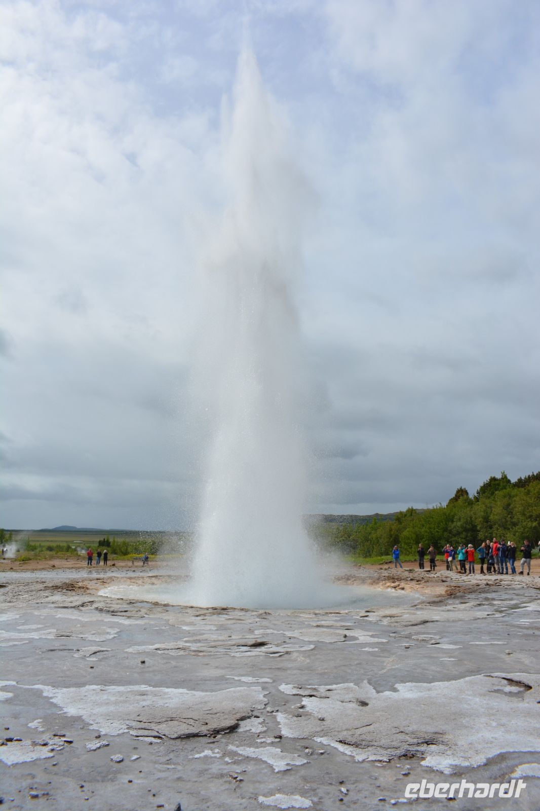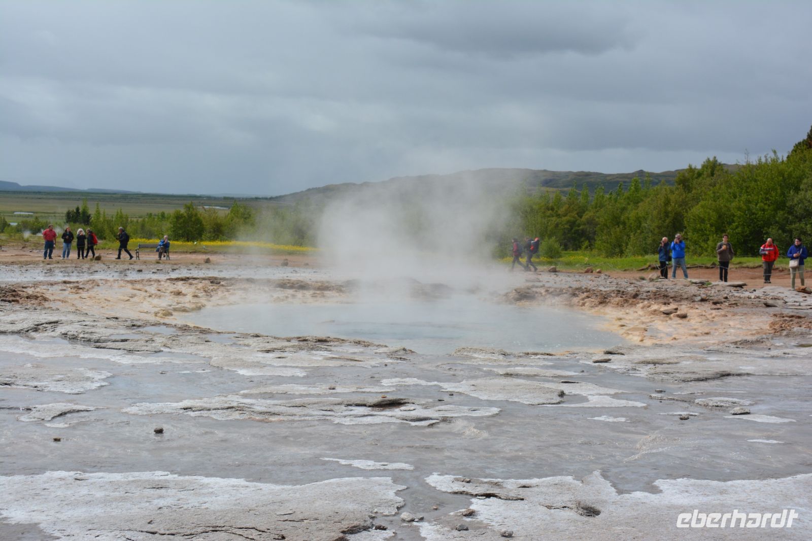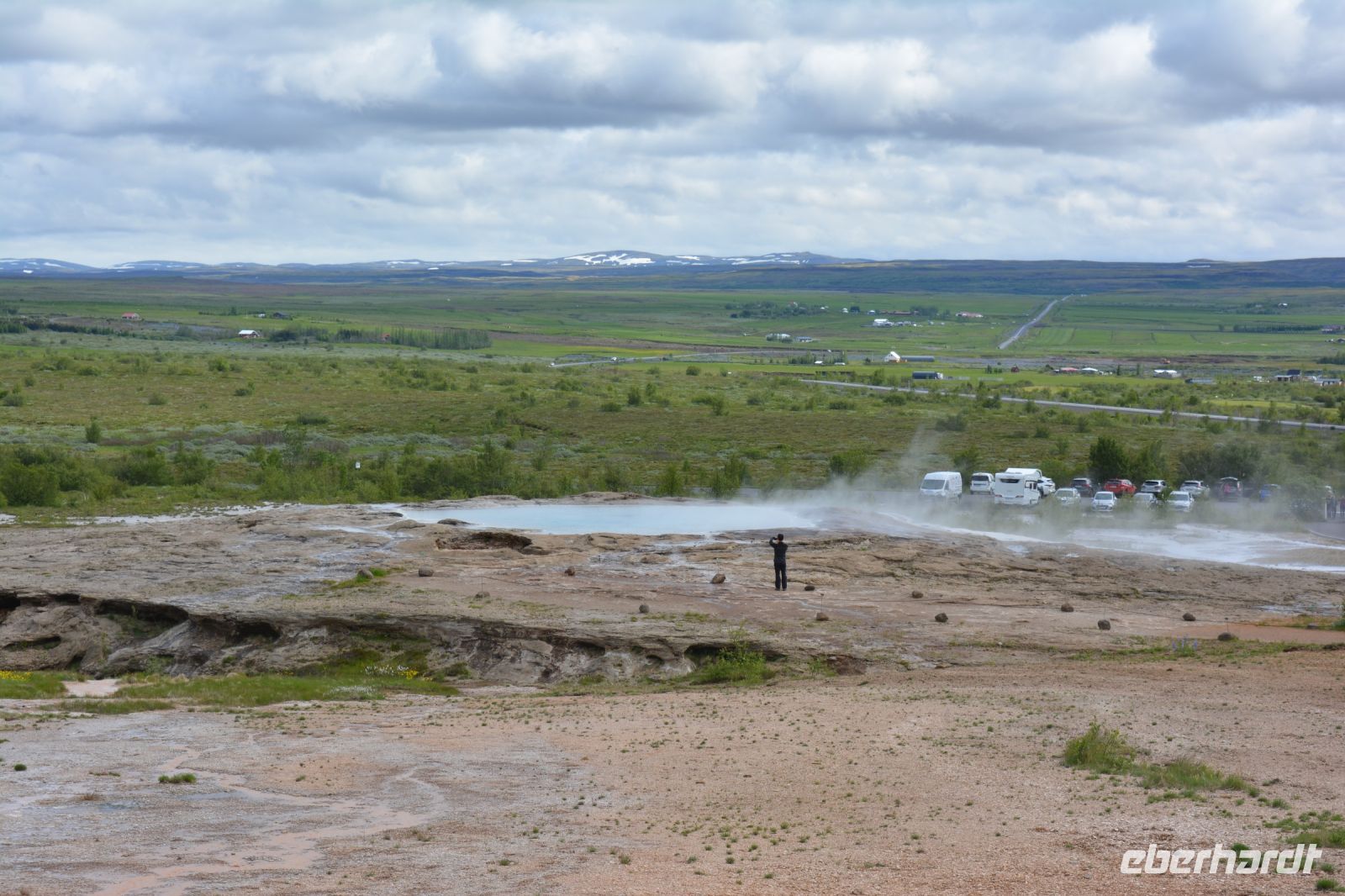 Nach etwas Fahrzeit erreichen wir die nächste Naturattraktion Islands. Ein Gebiet mit vielen heißen Quellen, überall qualmt es und beim Aussteigen haben wir bereits etwas Schwefelgeruch in der Nase. Das besondere an diesen heißen Quellen – eine davon ist ein Geysir und spuckt regelmäßig eine bis zu 35 Meter hohe Fontäne in den Himmel. Alle fünf bis zehn Minuten lässt sich dieses Spektakel am Strokkur beobachten.