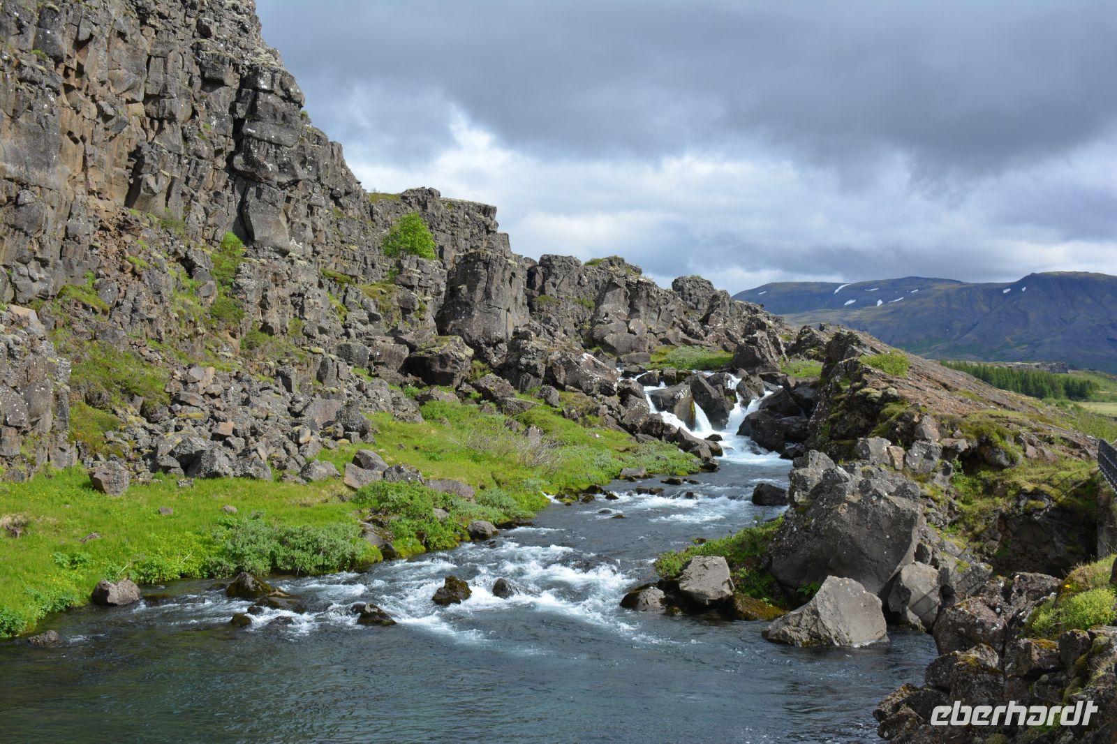 Hier treffen auch die eurasische und die nordamerikanisch Platte aufeinander, bzw. die beiden driften hier auseinander. Jedes Jahr ca. zwei Zentimeter. Dabei entweicht Lava und erkaltet an der Oberfläche. Island wird also Jahr für Jahr etwas größer. Außerdem wurde an diesem Ort im Jahr 930 das isländische Parlament gegründet. Und genau heute vor 78 Jahren wurde im Thingvellir-Nationalpark die Republik Island gegründet. Überall sieht man heute zum Nationalfeiertag die Isländische Flagge oder auch Einwohner in der entsprechenden Tracht. Ebenfalls im Nationalpark befindet sich der größte See Islands. Der beste Punkt zum Schnorcheln und Tauchen, auch wenn die maximale Temperatur 6°C beträgt. Der See hat nur einen oberirdischen Zufluss, alle anderen Zuflüsse kommen von den umliegenden Gletschern. Von dort brauch das Wasser bis zu 40 Jahren durch das Lavagestein, bis es in den See gelangt. Man findet hier 80 endemische Algenarten, auch noch an der tiefsten Stelle in bis zu 30 Metern.