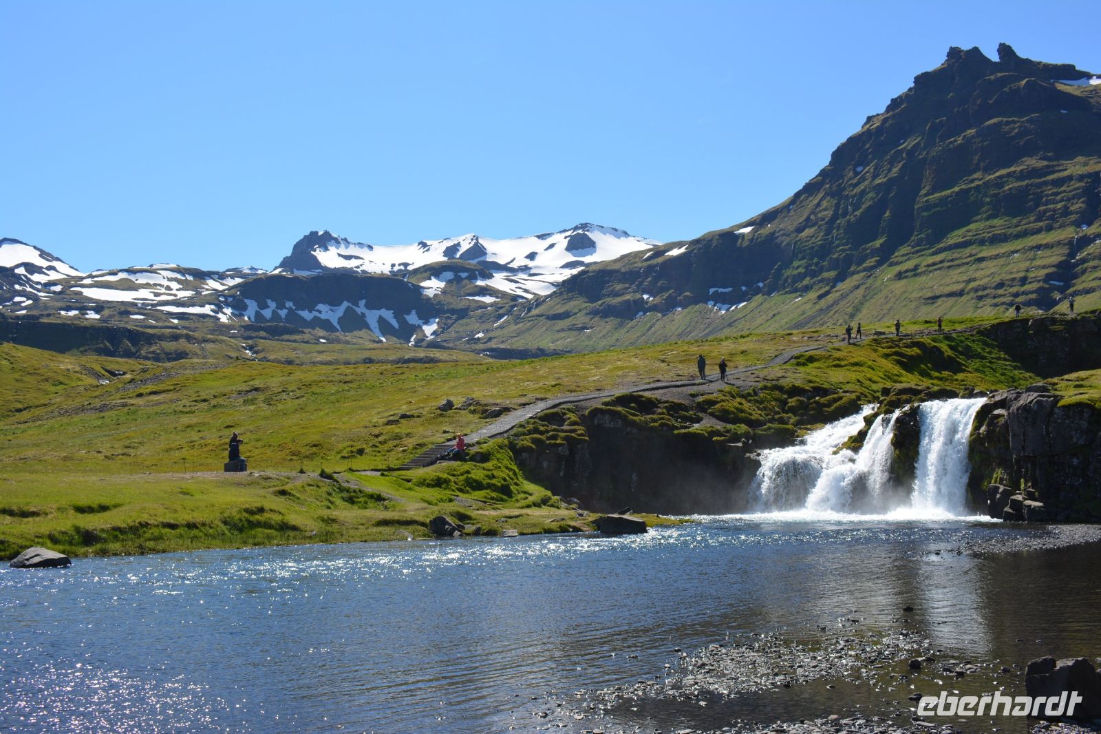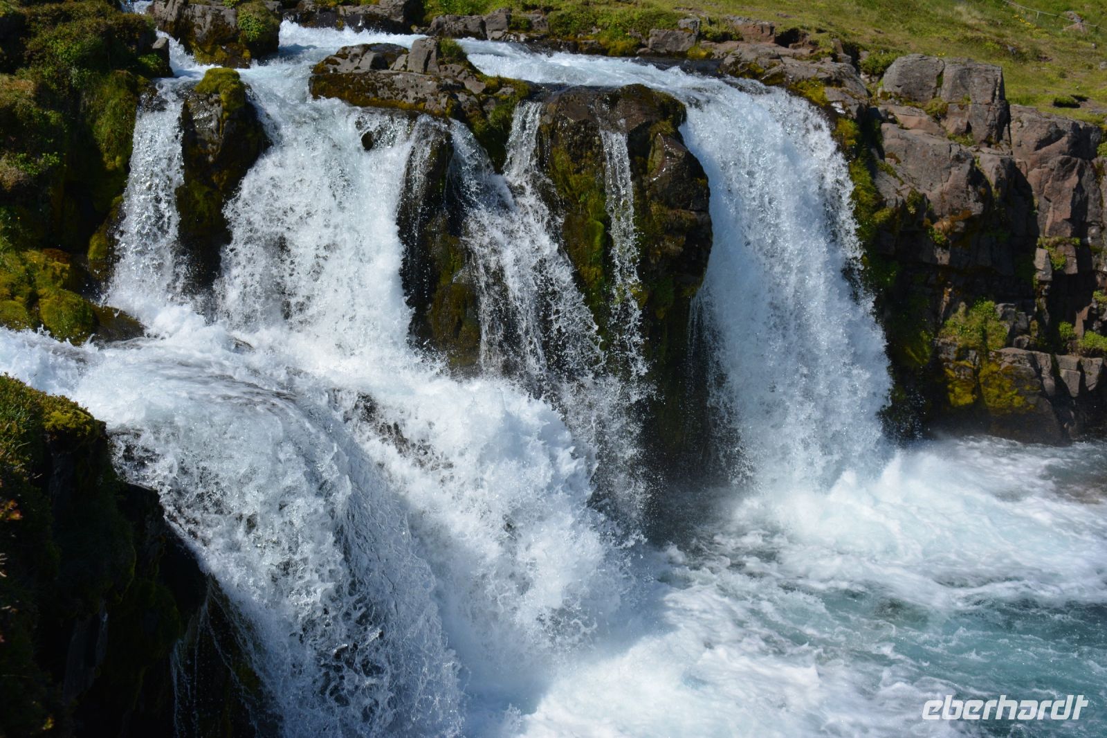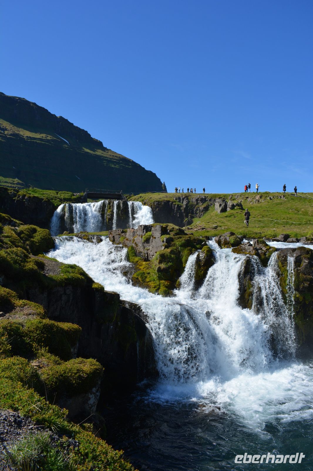 Unser Highlight heute ist der Kirkjufell, der Kirchenfall. Das meist fotografierte Motiv von Island. Der Berg aus dem der Wasserfall kommt, sieht aus wie ein Kirchenschiff, daher der Name. Im Vergleich zum Gullfoss von gestern ist er eher klein, aber mit dem vielen grün drum herum ein schönes Naturereignis.