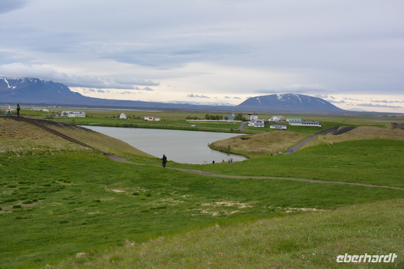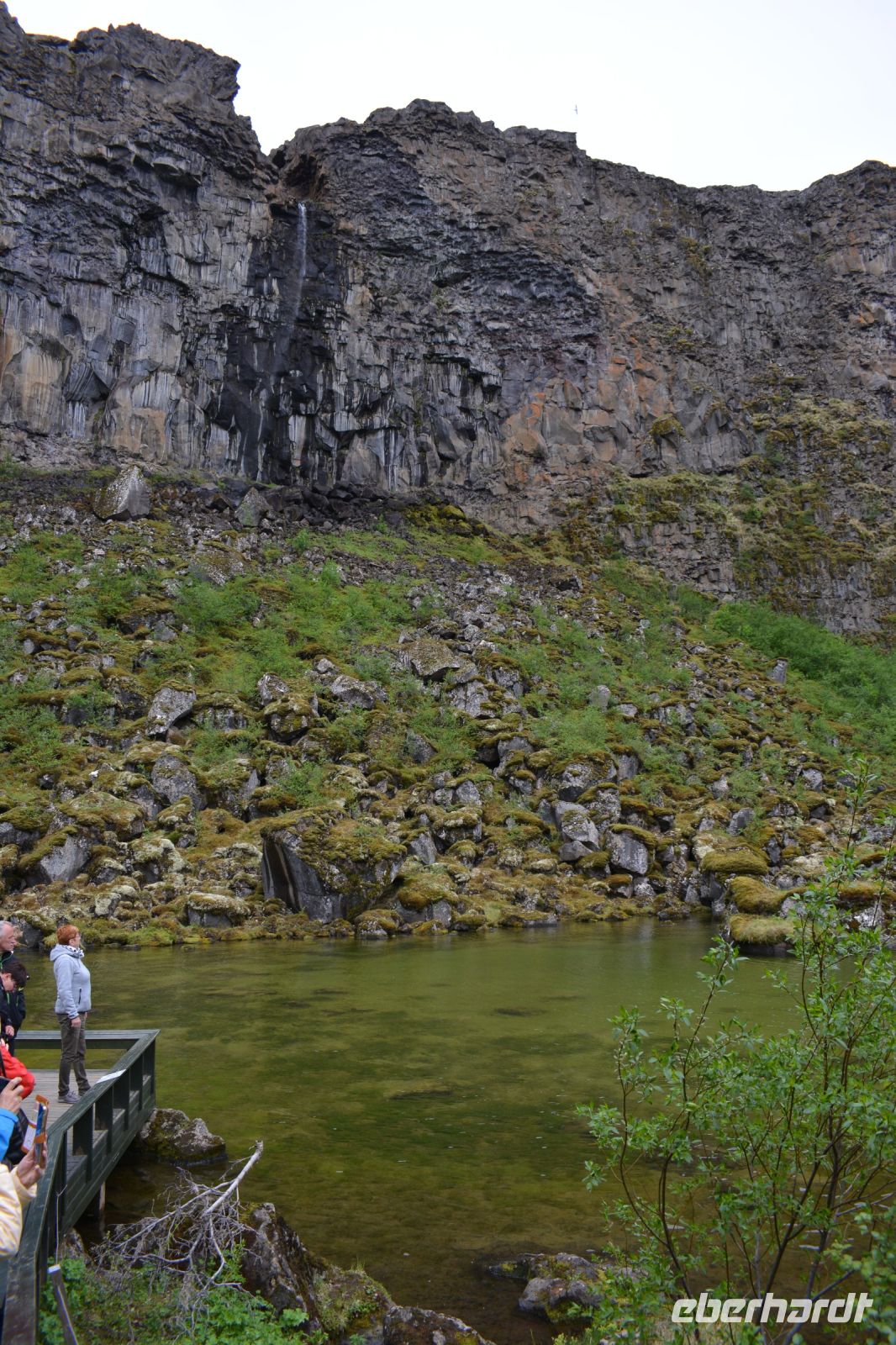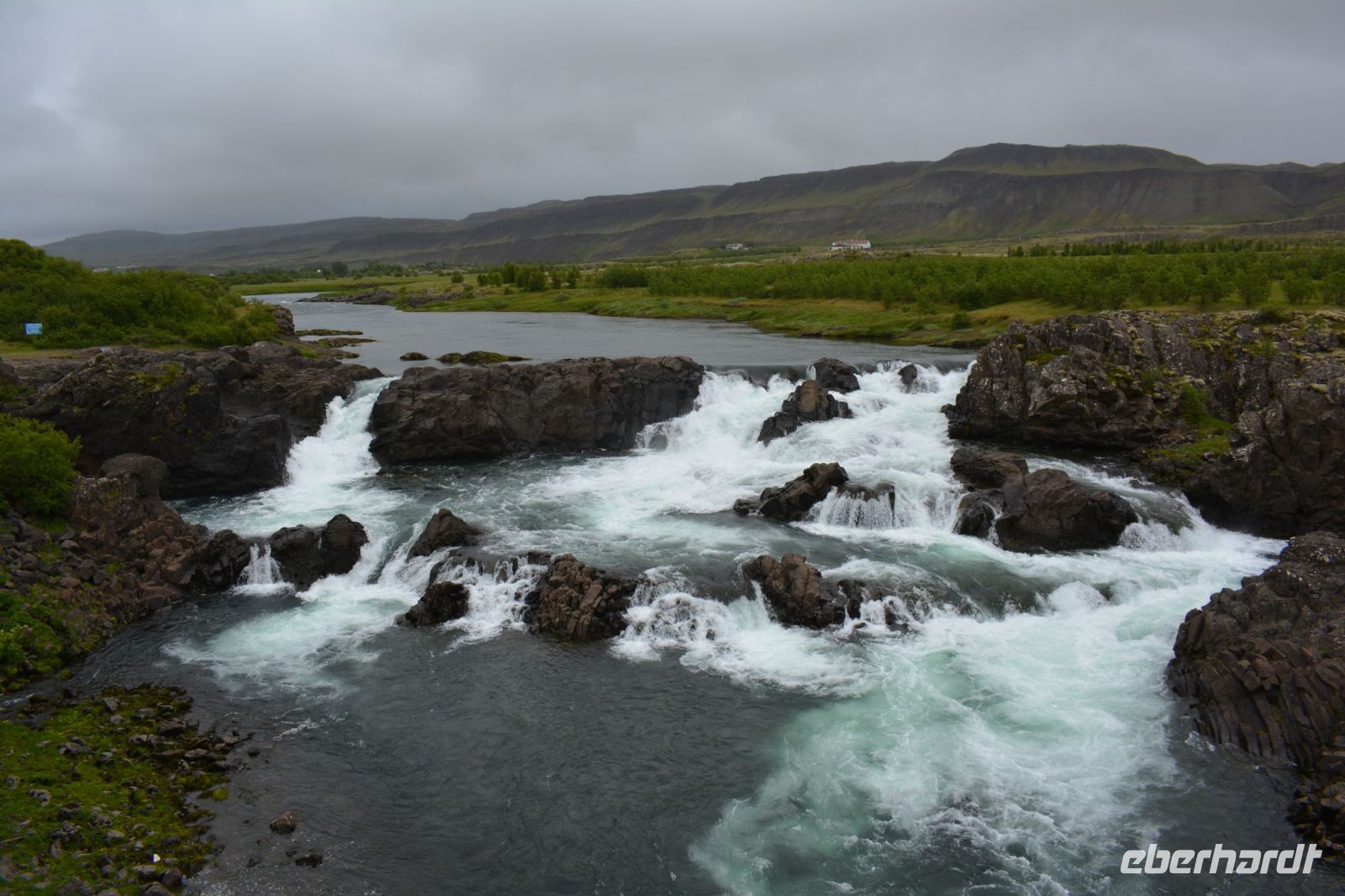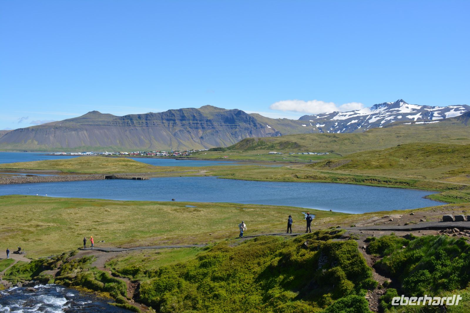 Schon beim Frühstück sind wir uns einig, eigentlich wollen wir nicht abreisen. Die Sonne kämpft sich so langsam durch die Wolken und man hat einen weiten Blick über das Meer und bis hoch zum Gletscher. Doch nur fünf Minuten später, so wie es leider auf Island normal ist, zieht es sich zu und es wird nass. Also doch, Koffer in den Bus und los. Wir haben heute einen weiten Weg vor uns. Vor der Halbinsel Snaefellnes bis ganz in den Norden nach Akureyri, dafür müssen wir aber erstmal zurück nach Borganes und dann immer wieder die Straße 1 entlang. Auf Grund des Wetters können wir die Wanderung am erloschenen Krater leider nicht machen. Der Weg ist mit Holz ausgelegt und dieser ist sehr rutschig, wenn es nass ist. Als Alternative fahren wir zum Glanni-Wasserfall. Im dazugehörigen Fluss ziehen jedes Jahr viele Lachse zurück zu ihrer Geburtsstätte um dort zu laichen. Dann springen diese auch den Wasserfall hinauf.