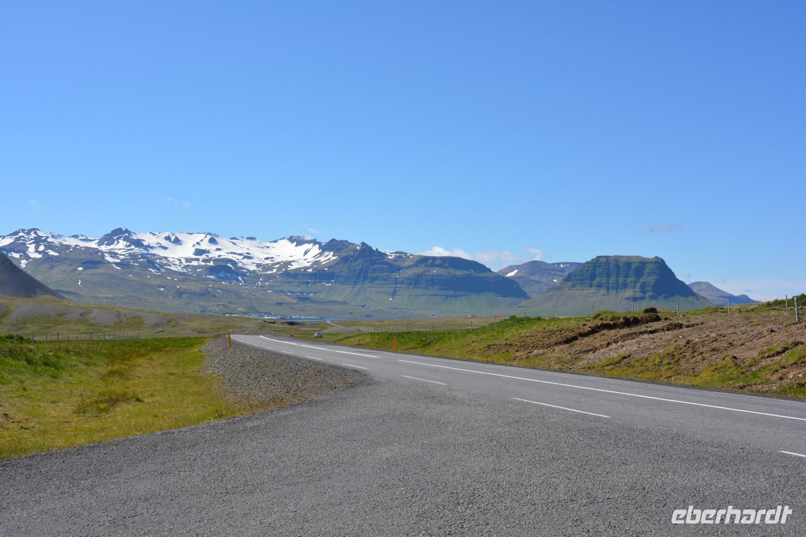 Immer wieder sieht man Berge mit kleinen Schneefeldern und Schafe, sowie Islandpferde auf den Weiden am Straßenrand.