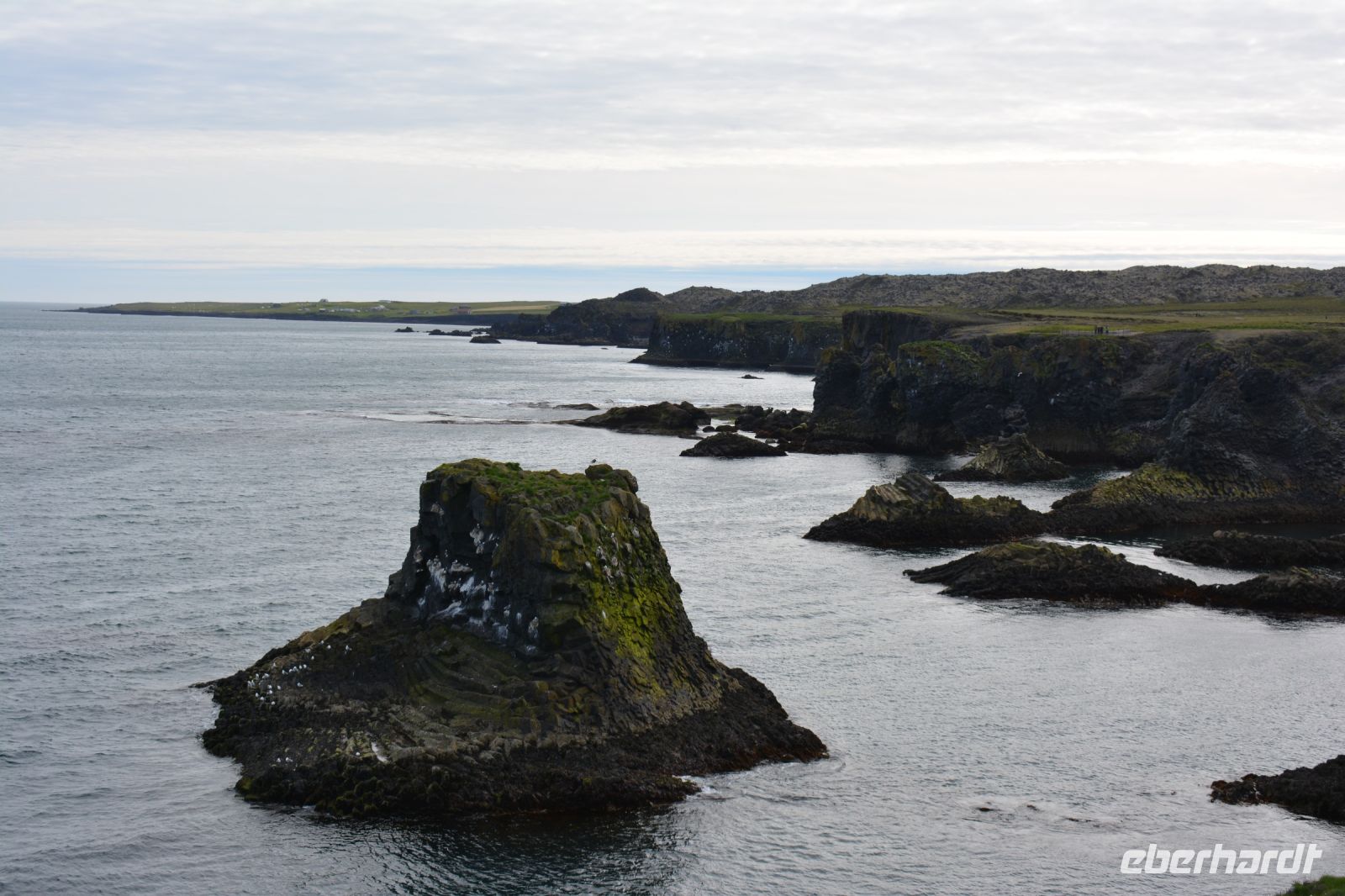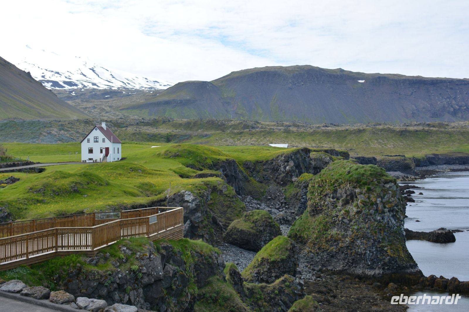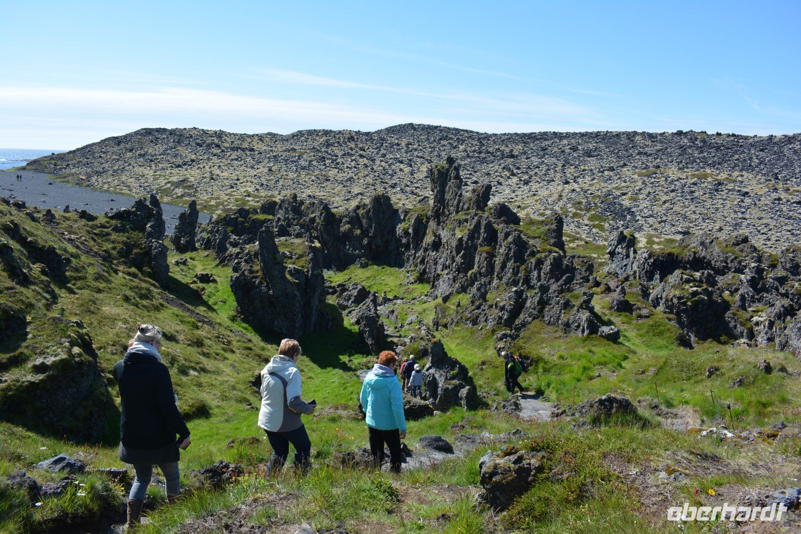 Kurze Zeit später erreichen wir das Fosshotel in Hellnar, unsere Unterbringung für die nächste Nacht. Jedoch hat Lisa noch eine Überraschung für uns. Wir checken schnell ein und bringen unsere Koffer ins Zimmer, danach geht es mit dem Reisebus noch weiter in den Ort Arnarstapi. Hier machen wir eine kurze Wanderung entlang der Klippen mit seinen ungewöhnlichen Formen. Viele Möwen und Küstenseeschwalben nisten hier. Wer will kann mit dem Bus zurück zum Hotel fahren, der Rest nimmt den kleinen Wanderweg entlang der Küste. Drei Kilometer geht es durch Lavafelder entlang der Klippen. Immer den Blick auf den Ozean.