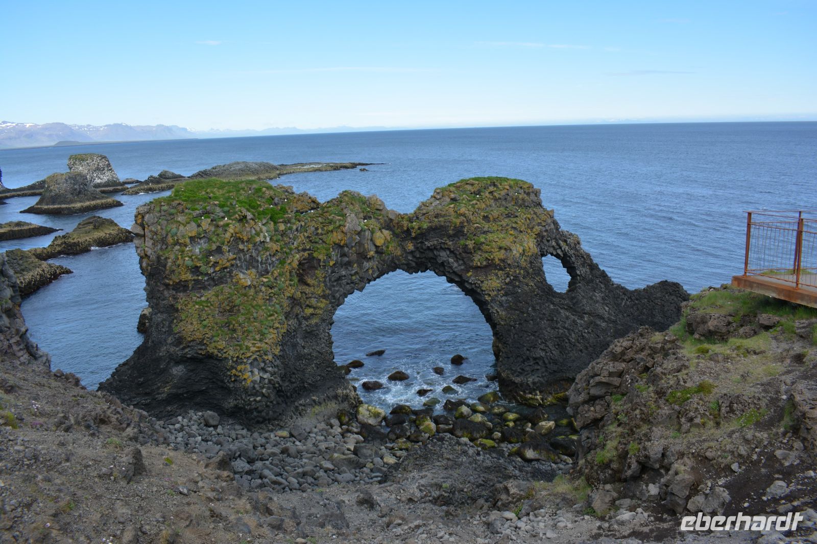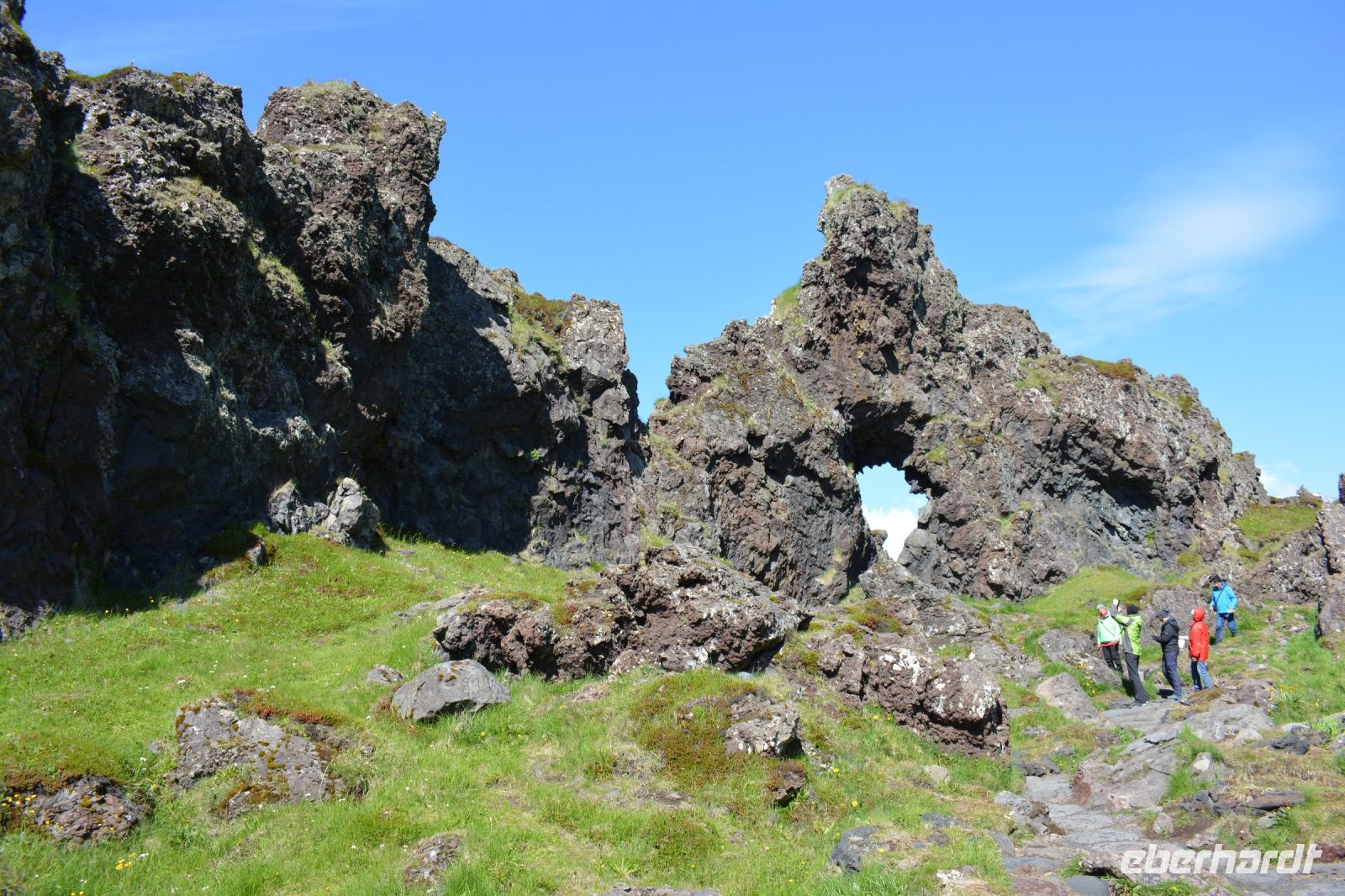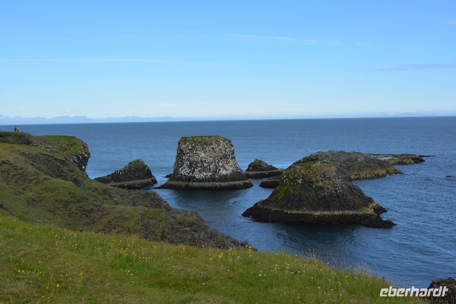 Kurze Zeit später erreichen wir das Fosshotel in Hellnar, unsere Unterbringung für die nächste Nacht. Jedoch hat Lisa noch eine Überraschung für uns. Wir checken schnell ein und bringen unsere Koffer ins Zimmer, danach geht es mit dem Reisebus noch weiter in den Ort Arnarstapi. Hier machen wir eine kurze Wanderung entlang der Klippen mit seinen ungewöhnlichen Formen. Viele Möwen und Küstenseeschwalben nisten hier. Wer will kann mit dem Bus zurück zum Hotel fahren, der Rest nimmt den kleinen Wanderweg entlang der Küste. Drei Kilometer geht es durch Lavafelder entlang der Klippen. Immer den Blick auf den Ozean.