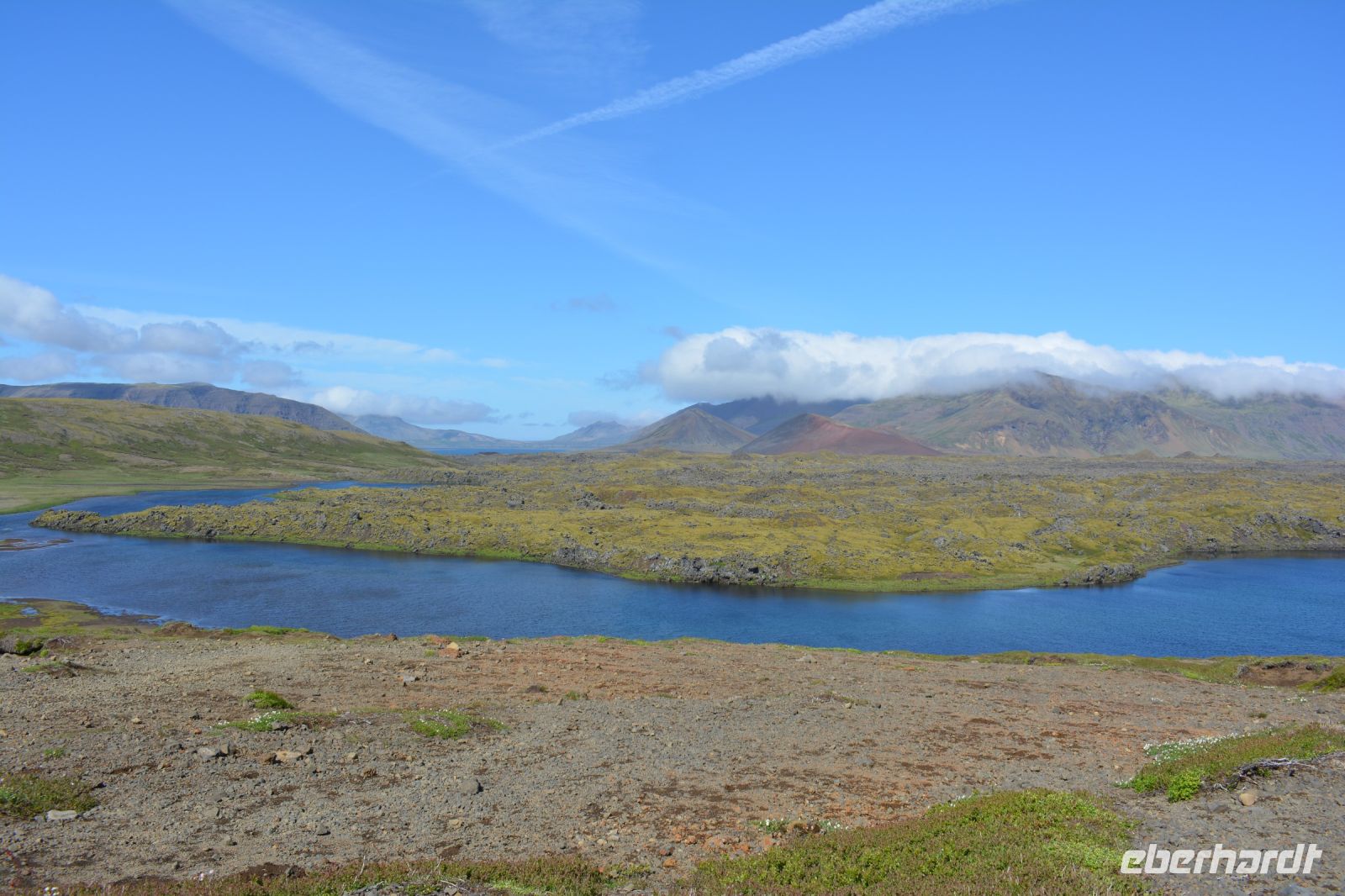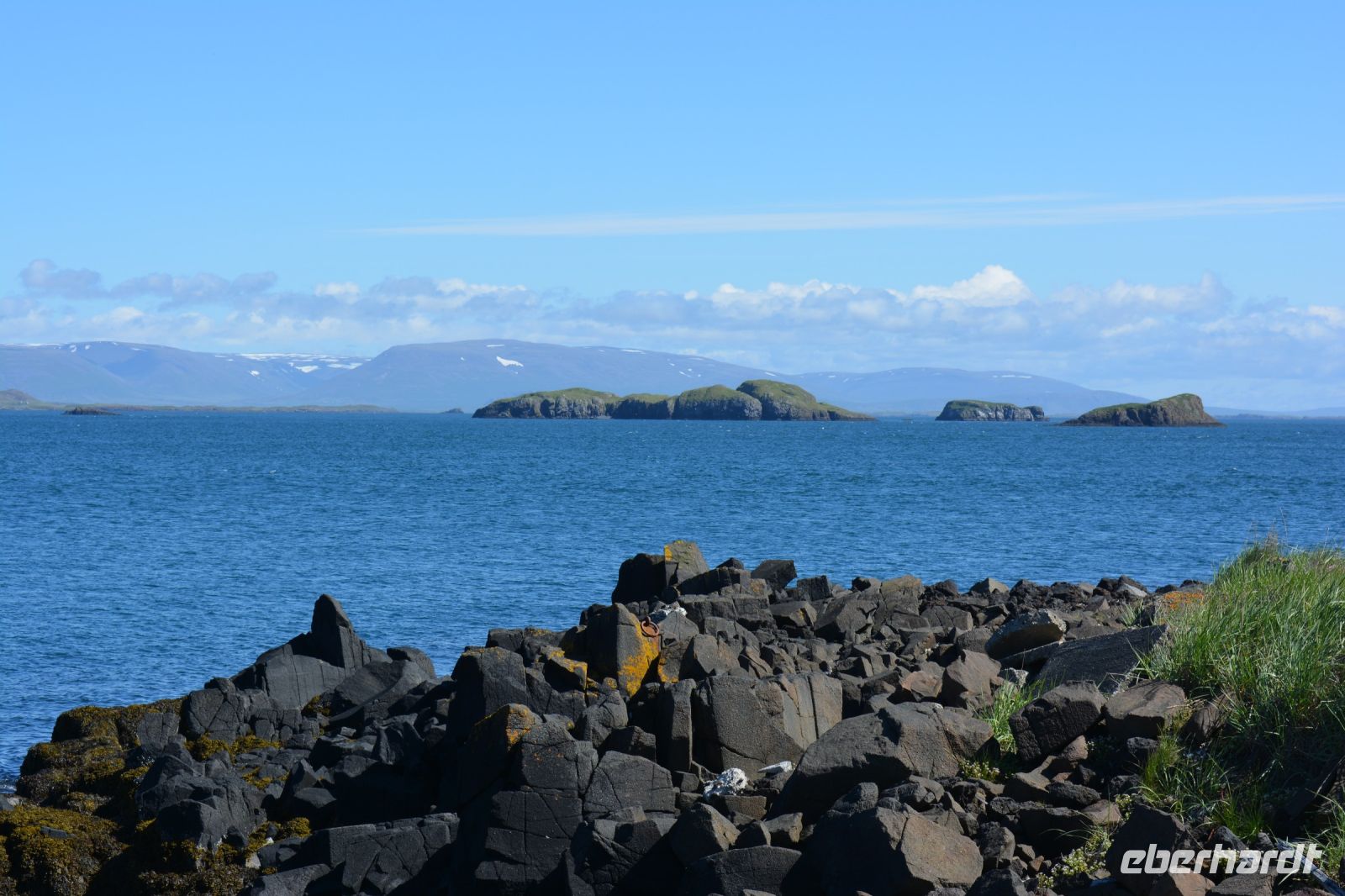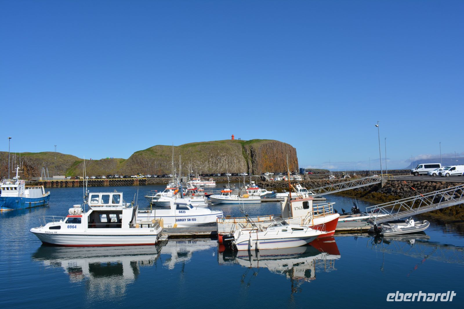 Entlang von Kratern und grünen Wiesen erreichen wir endlich die Halbinsel Snaefellsnes und das bei strahlendem Sonnenschein. Durch die Berge hindurch fahren wir auf die Nordseite der Insel, wo wir einen Stopp am See Baulárvallavatn machen. Hier hat meine eine fabelhafte Aussicht auf das große Lavafeld. Unser nächster Stopp ist im Ort Stykkisholmur, wiederum auf einer kleinen Halbinsel gelegen. Da keiner in den Alkoholshop möchte, fahren wir direkt zum Hafen. Ja, in Island gibt es Alkohol nur in speziellen Läden zu kaufen, welche es auch nicht an jeder Ecke gibt.