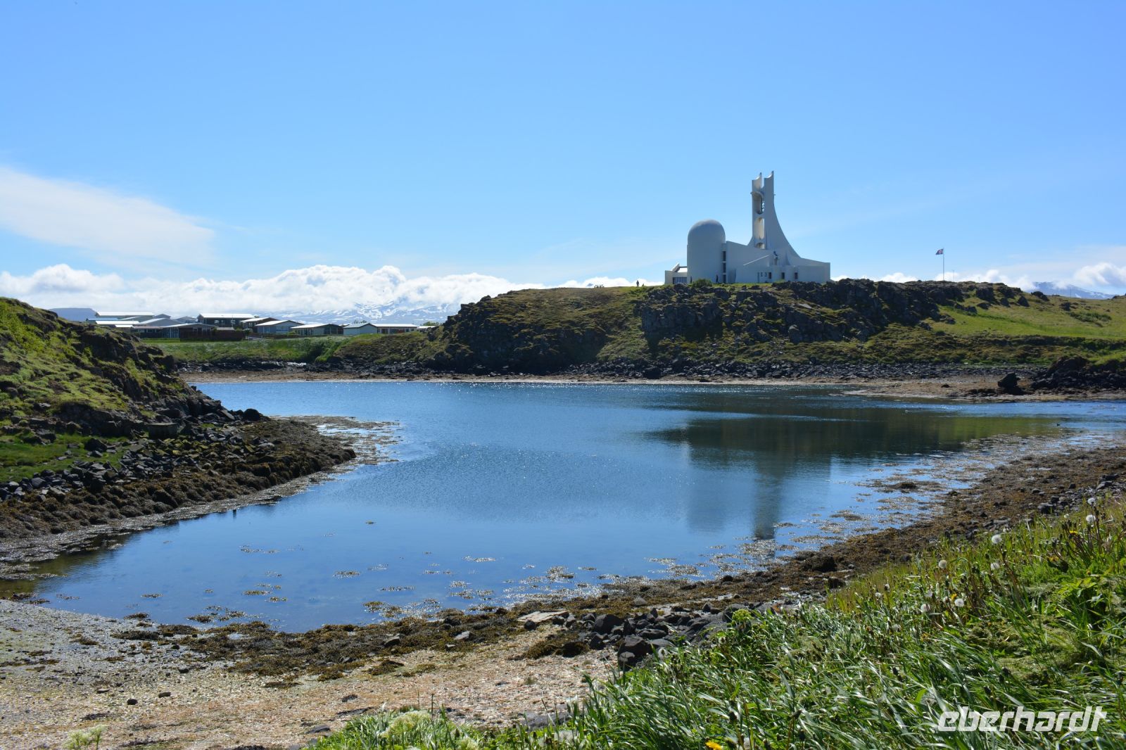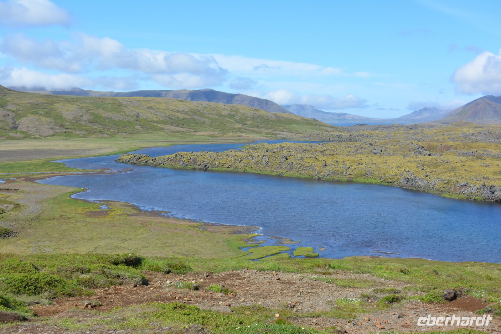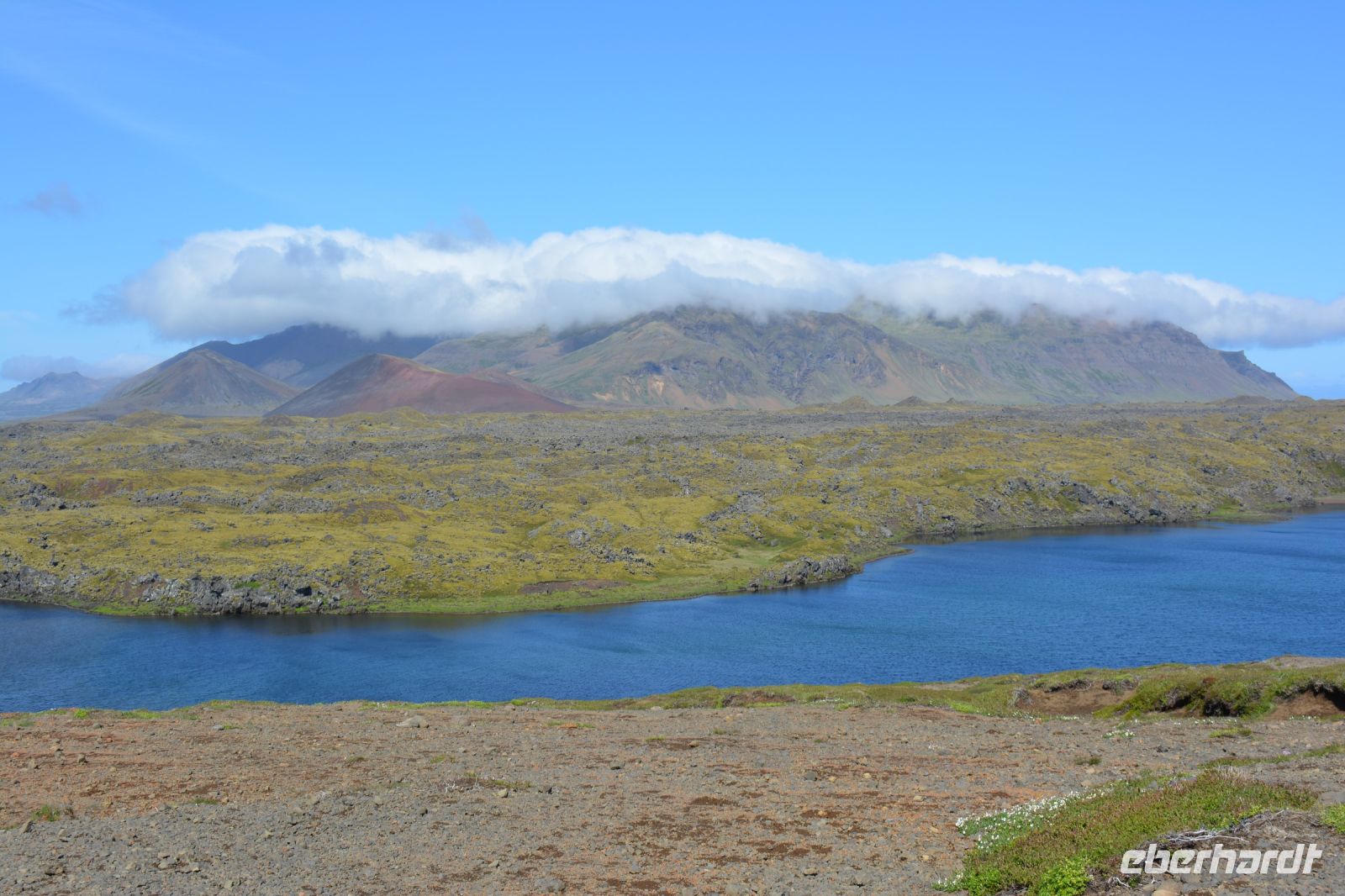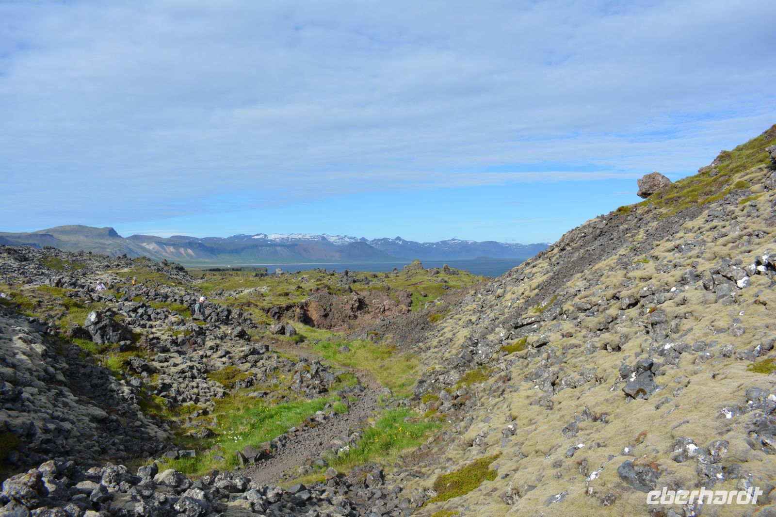 Entlang von Kratern und grünen Wiesen erreichen wir endlich die Halbinsel Snaefellsnes und das bei strahlendem Sonnenschein. Durch die Berge hindurch fahren wir auf die Nordseite der Insel, wo wir einen Stopp am See Baulárvallavatn machen. Hier hat meine eine fabelhafte Aussicht auf das große Lavafeld. Unser nächster Stopp ist im Ort Stykkisholmur, wiederum auf einer kleinen Halbinsel gelegen. Da keiner in den Alkoholshop möchte, fahren wir direkt zum Hafen. Ja, in Island gibt es Alkohol nur in speziellen Läden zu kaufen, welche es auch nicht an jeder Ecke gibt.