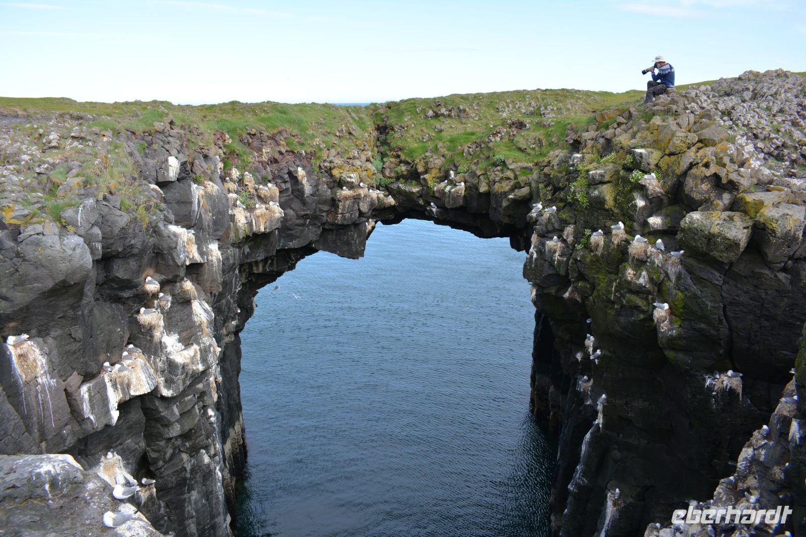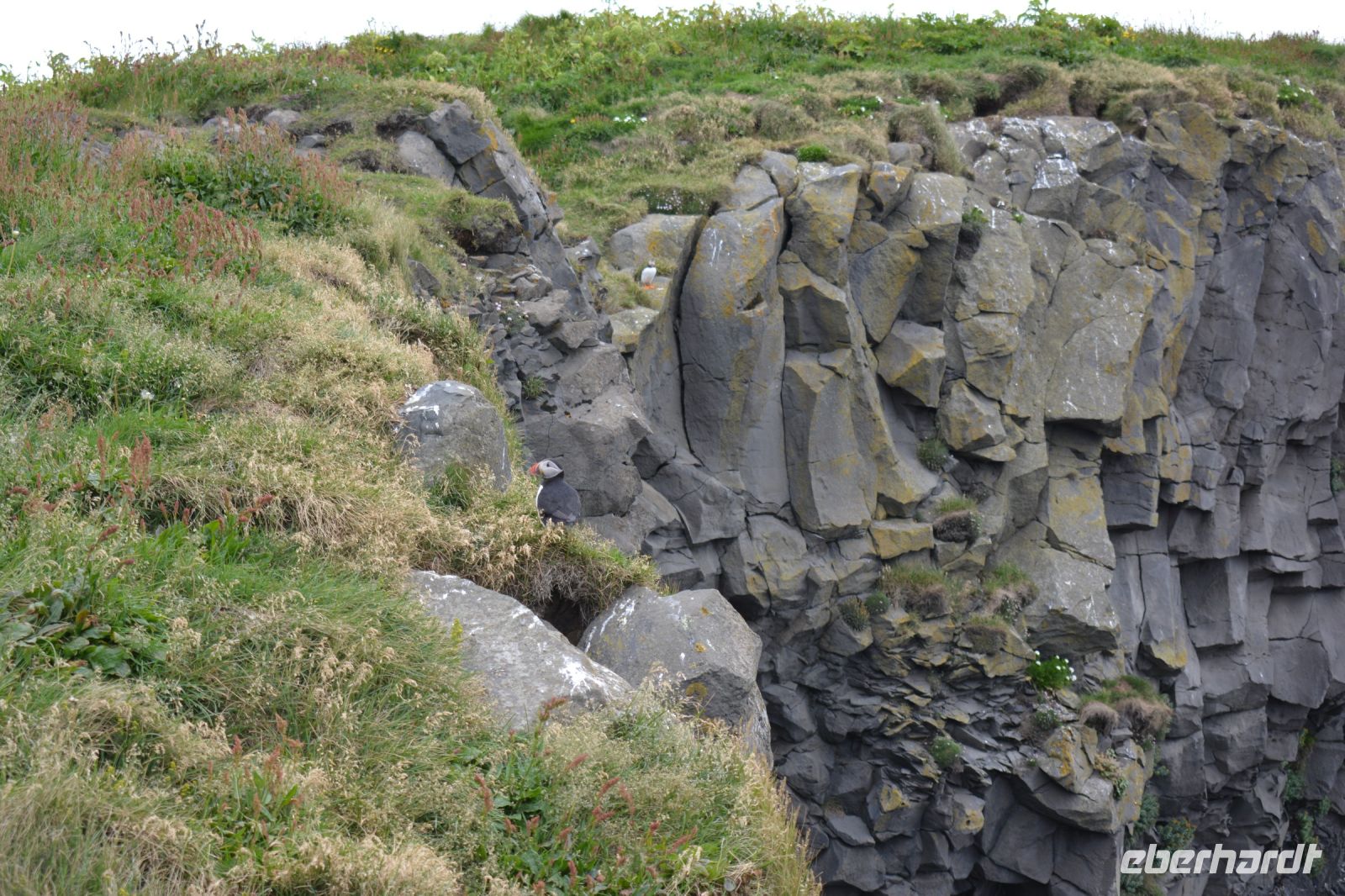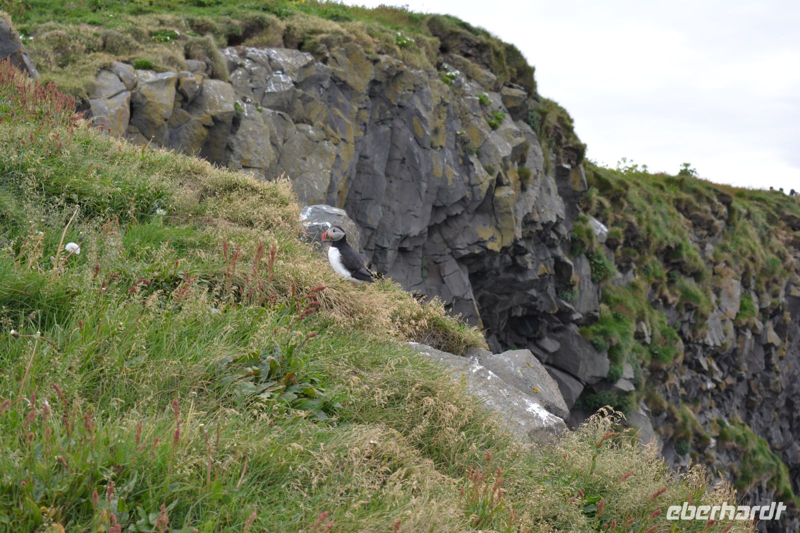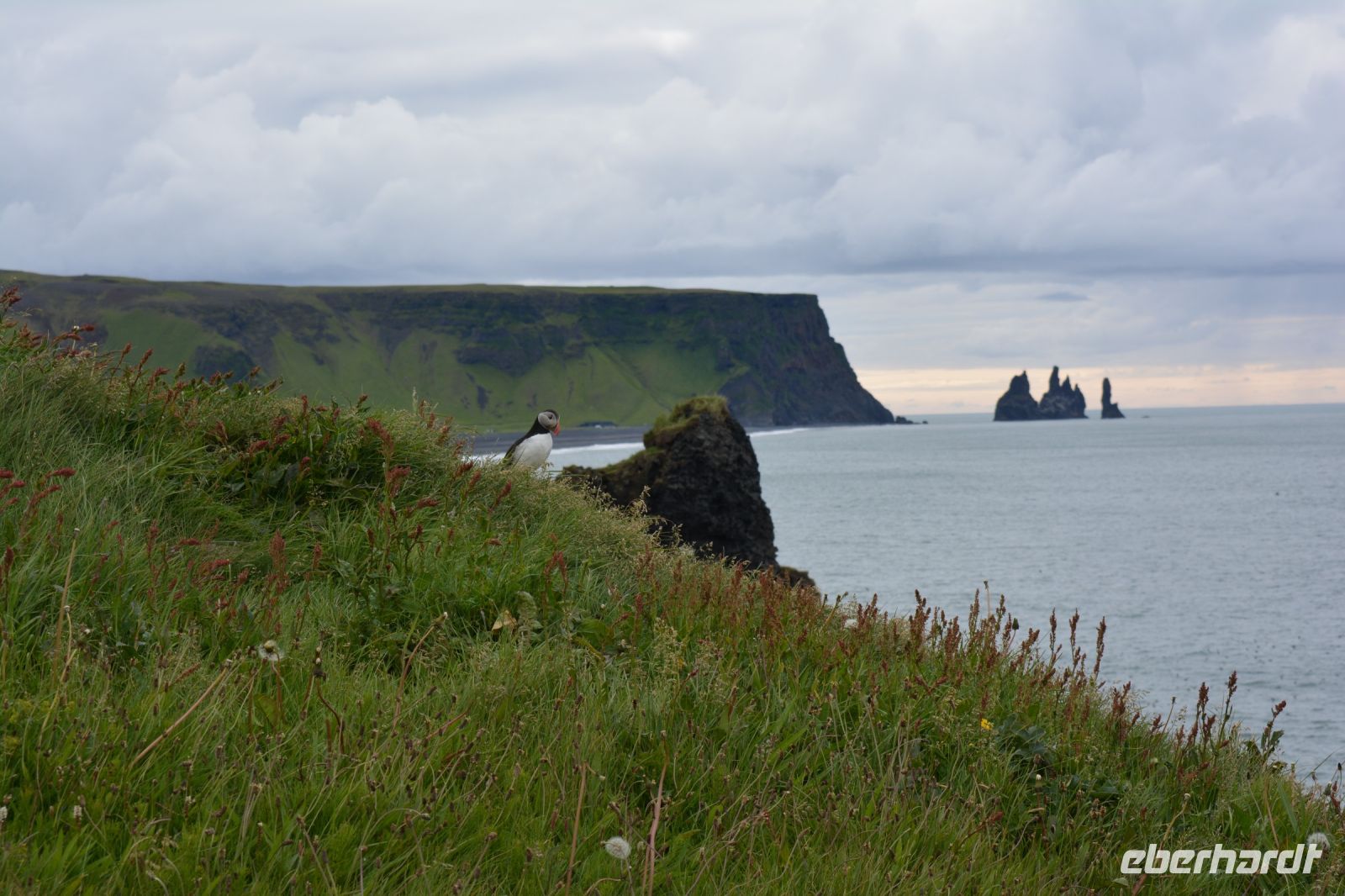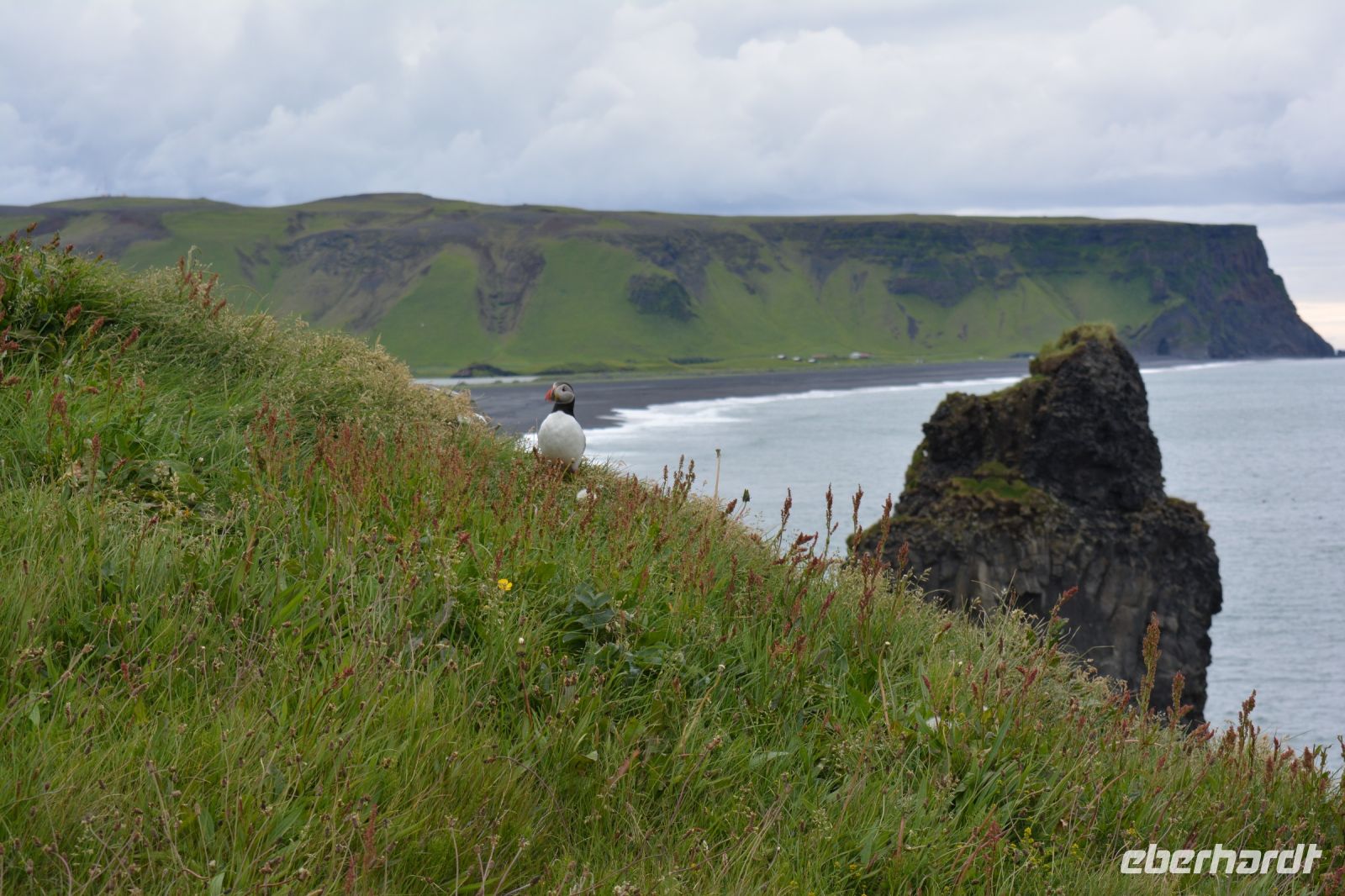 Ein letztes Mal packt unser Busfahrer Dore heute unsere Koffer in den Bus. Für uns geht es heute bereits 8.30 Uhr los, da wir pünktlich am Tor zur Landspitze Dyrholaey sein wollen. Aktuell ist der Felsen über Nacht gesperrt, um den unzählige Seevögeln in den schroffen Gestein etwas Ruhe beim Brüten zu gewähren. Vor allem Möwen sind hier zahlreich vertreten. Doch wenn man ganz genau hinschaut, flattern hier auch andere schwarz-weiße Gesellen umher. Es handelt sich um den schwarz-weiß gefiederten Papageientaucher, welche sich hier ihre Höhlen zum Nisten graben. Außerhalb der Brutzeit ist der Seevogel nur auf dem Wasser unterwegs und nicht an Land anzutreffen. Wir haben Glück und einer der Vögel landet sehr nah am Wegesrand und steht Modell für unzählige Fotos.
