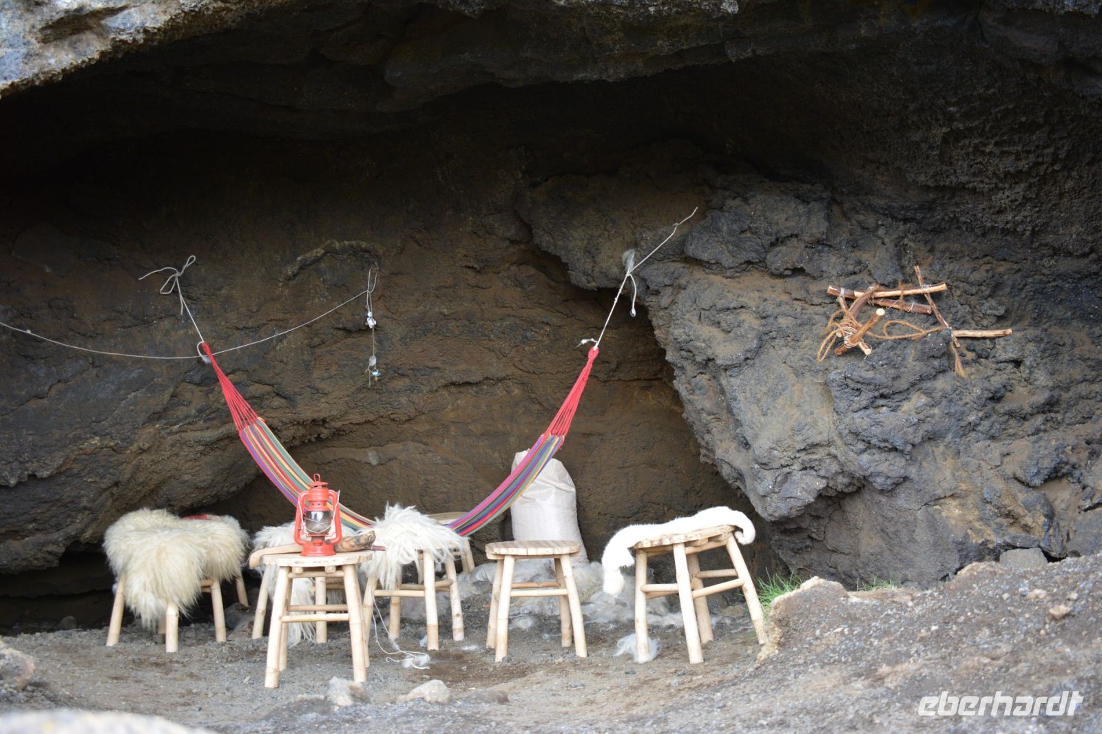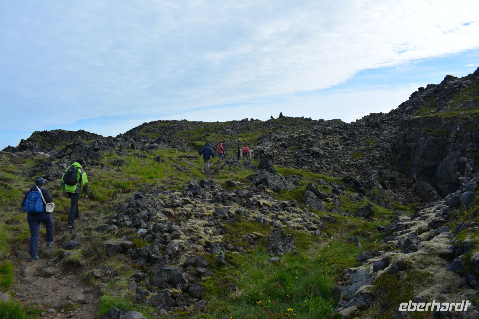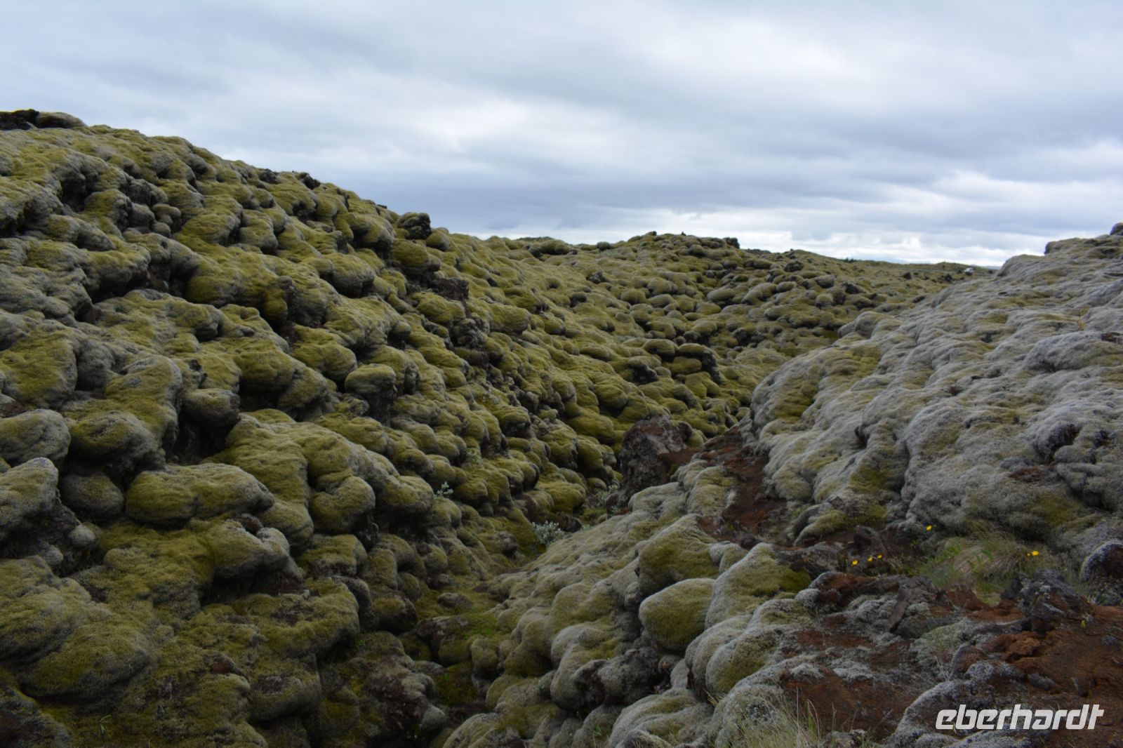 Über den Bergkamm, vorbei an zahlreichen Seen und Lavafeldern. Von diesen gibt es zwei verschiedene Arten, die sich gut unterscheiden lassen. Zum einen das A`a-Lavafeld, welches aus Lava entstanden ist, die unter 2500°C heiß war und dadurch nur zähflüssig und bröcklig fließen konnte. Zu erkennen ist dieses Lavafeld an seiner unebenen Struktur. Hingegen das Pahoehoe-Lavafeld hat eine sehr glatte Oberfläche. Hier war die Lava über 2500°C heiß und ist auch besser geflossen, zu vergleichen mit Honig.