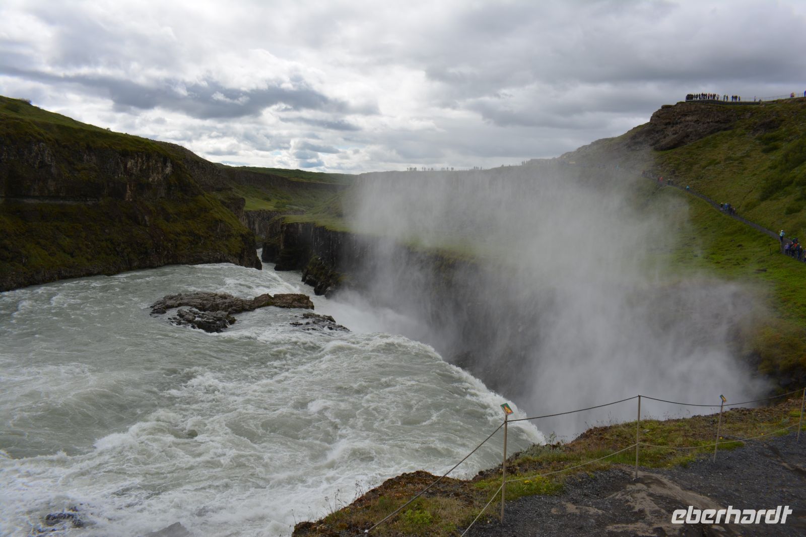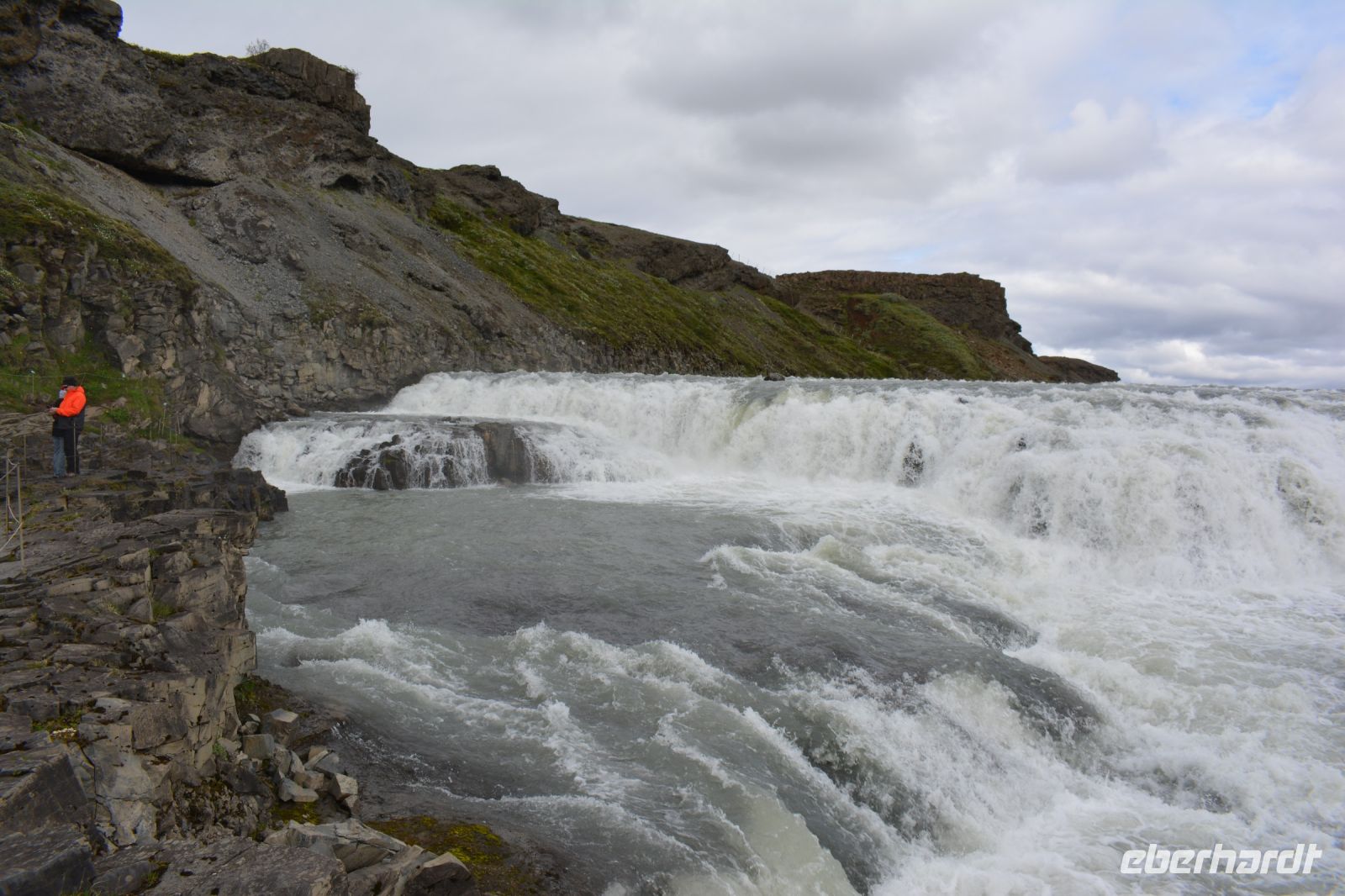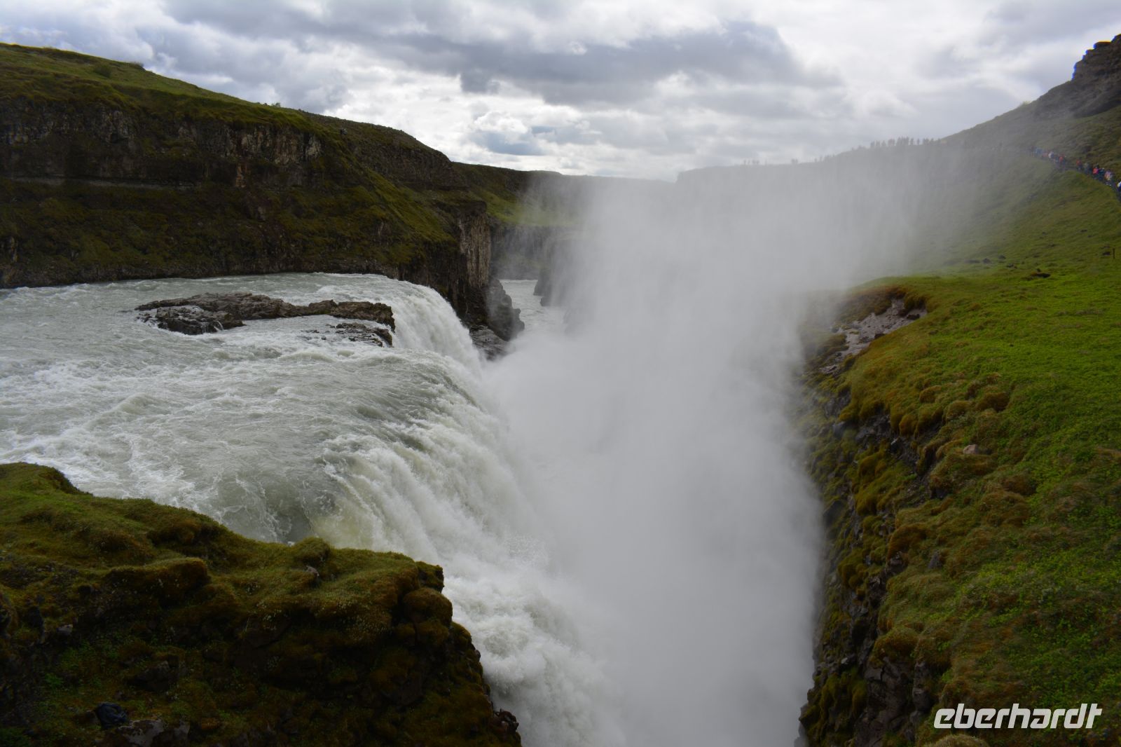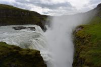 Nachdem wir nun Wasser gesehen haben, das in die Luft geht, gibt es jetzt noch einen Ort, wo das Wasser in rasanter Geschwindigkeit nach unten fällt. Nach kurzer Fahrt erreichen wir den Wasserwall Gollfuss. 32 Meter stürzt dieser in zwei Stufen nach unten. Am Fuße des Wasserfalls hat sich bereits ein 2,5 Kilometer langer und 70 Meter tiefer Canyon gebildet. Das Wasser hier kommt vom nicht weit entfernten 60 Kilometer langem Gletscher. Lisa erzählt uns, dass es dieses Naturschauspiel fast gar nicht mehr gegeben hätte, da Investoren hier ein riesiges Wasserkraftwerk errichten wollten. Doch eine tapfere Frau, dessen Vater früher das Land besaß, wehrte sich gegen die Investoren und klagte vor Gericht. Nach langem Kampf bekam sie schließlich recht. Für sie wurde am Wasserfall ein Denkmal errichtet. Auch wir sind sehr dankbar, dass wir uns heute diesen wundervollen Wasserfall anschauen durften.