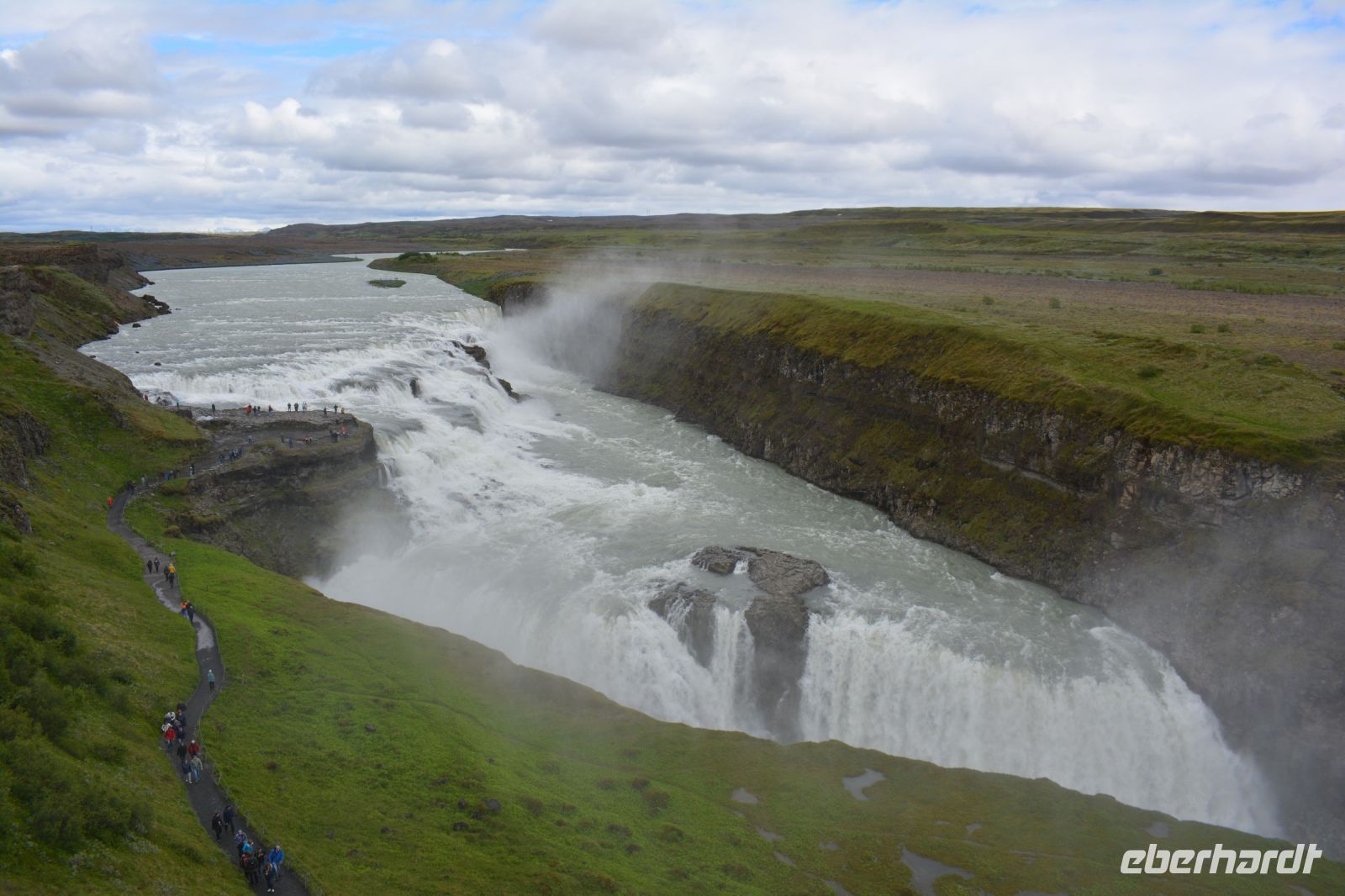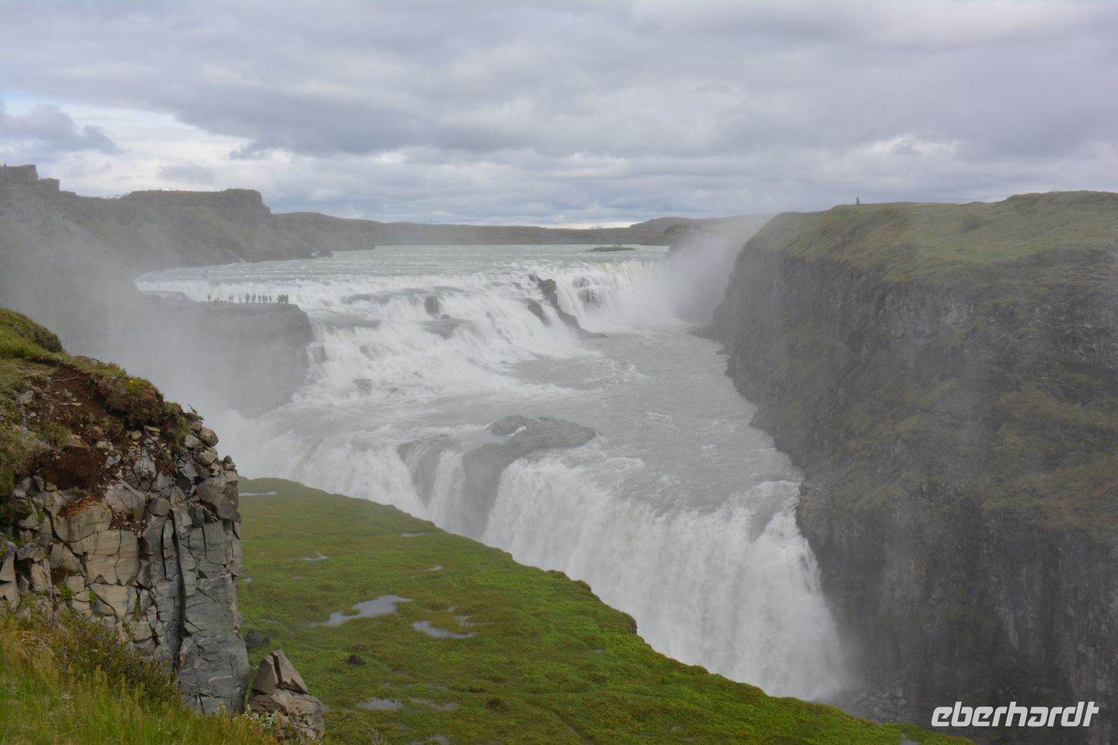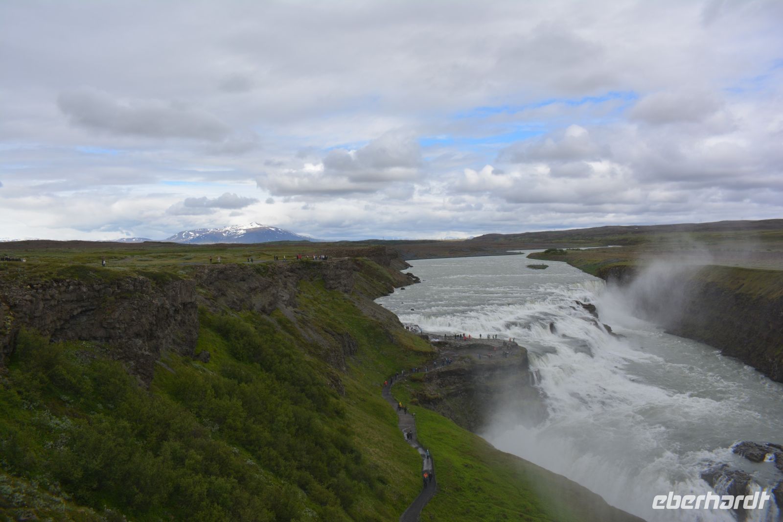 Nachdem wir nun Wasser gesehen haben, das in die Luft geht, gibt es jetzt noch einen Ort, wo das Wasser in rasanter Geschwindigkeit nach unten fällt. Nach kurzer Fahrt erreichen wir den Wasserwall Gollfuss. 32 Meter stürzt dieser in zwei Stufen nach unten. Am Fuße des Wasserfalls hat sich bereits ein 2,5 Kilometer langer und 70 Meter tiefer Canyon gebildet. Das Wasser hier kommt vom nicht weit entfernten 60 Kilometer langem Gletscher. Lisa erzählt uns, dass es dieses Naturschauspiel fast gar nicht mehr gegeben hätte, da Investoren hier ein riesiges Wasserkraftwerk errichten wollten. Doch eine tapfere Frau, dessen Vater früher das Land besaß, wehrte sich gegen die Investoren und klagte vor Gericht. Nach langem Kampf bekam sie schließlich recht. Für sie wurde am Wasserfall ein Denkmal errichtet. Auch wir sind sehr dankbar, dass wir uns heute diesen wundervollen Wasserfall anschauen durften.