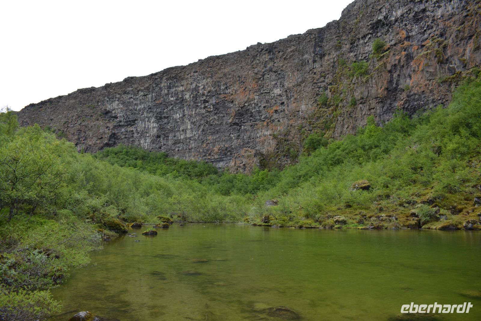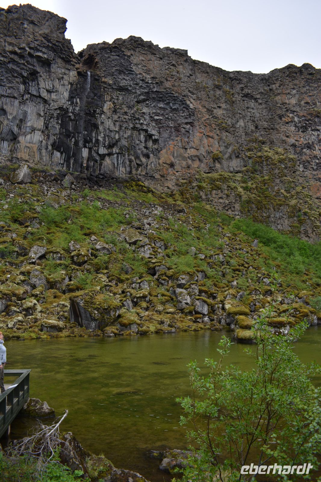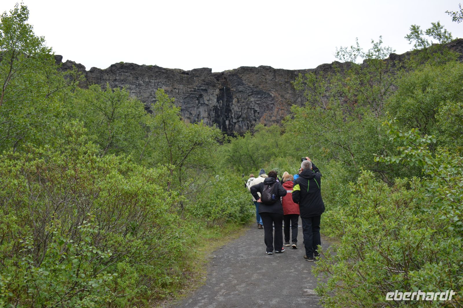 Gegen Mittag erreichen wir den Jökulsárgljúfur-Nationalpark und mit ihm auch die Asybyrgi-Schlucht. Diese soll, der nordischen Mythologie nach, durch den Huf von Odins achtbeinigem Pferd Sleipnir entstanden sein und ist dadurch hufeisenförmig geworden. Geologisch ist belegt, dass verschiedene Gletscherläufe und Vulkanausbrüche diese besondere Form erschaffen haben. Der Fluss der sich heute über die zwei heute besichtigten Wasserfälle ergießt, hatte eins sein Flussbett in dieser Schlucht. Heute hat sich der Verlauf in den Osten verlagert.