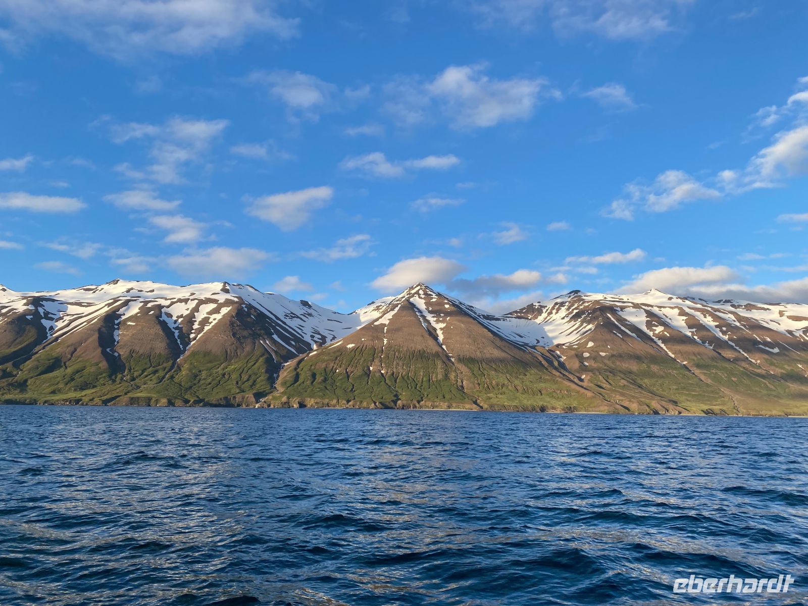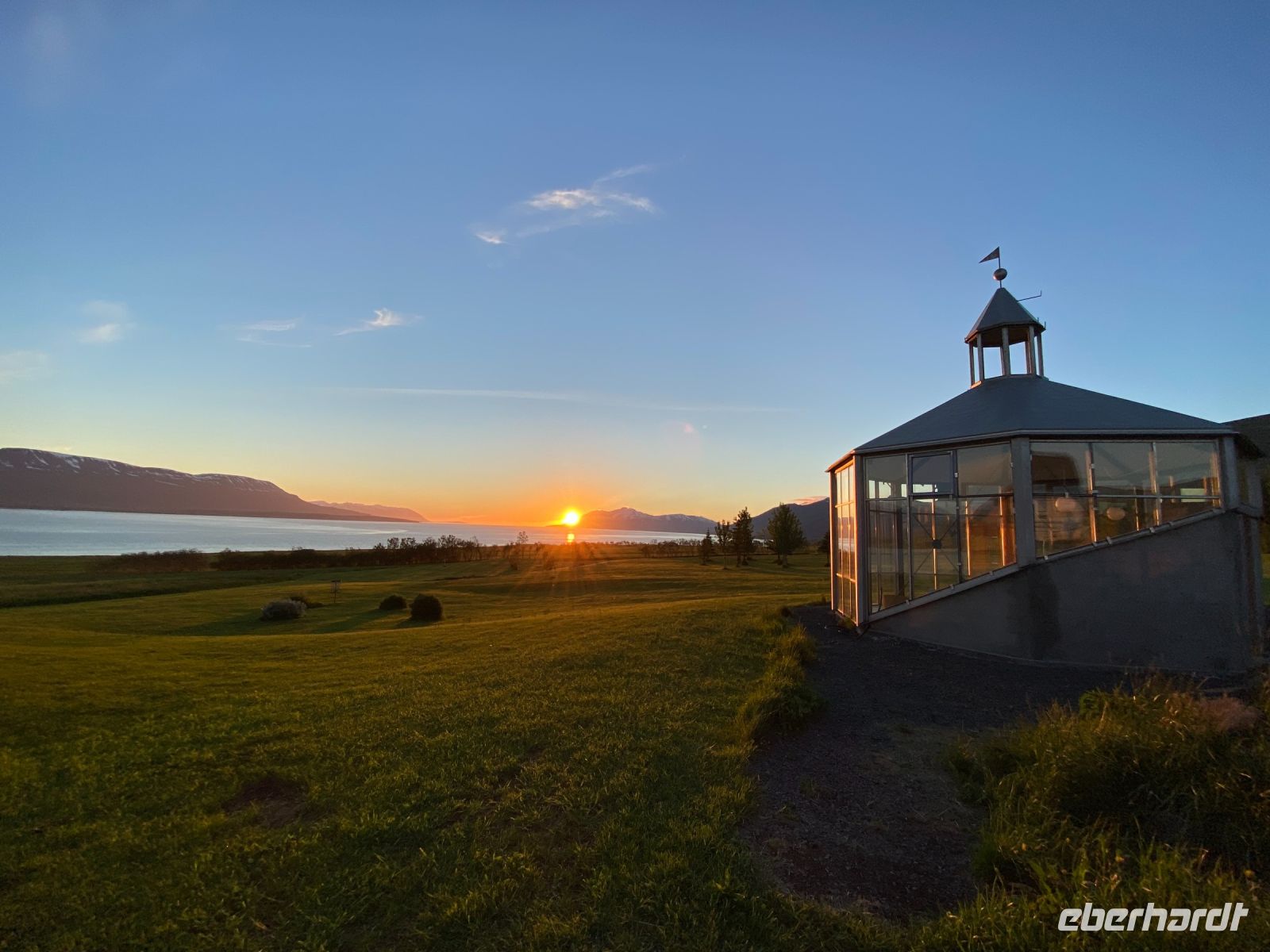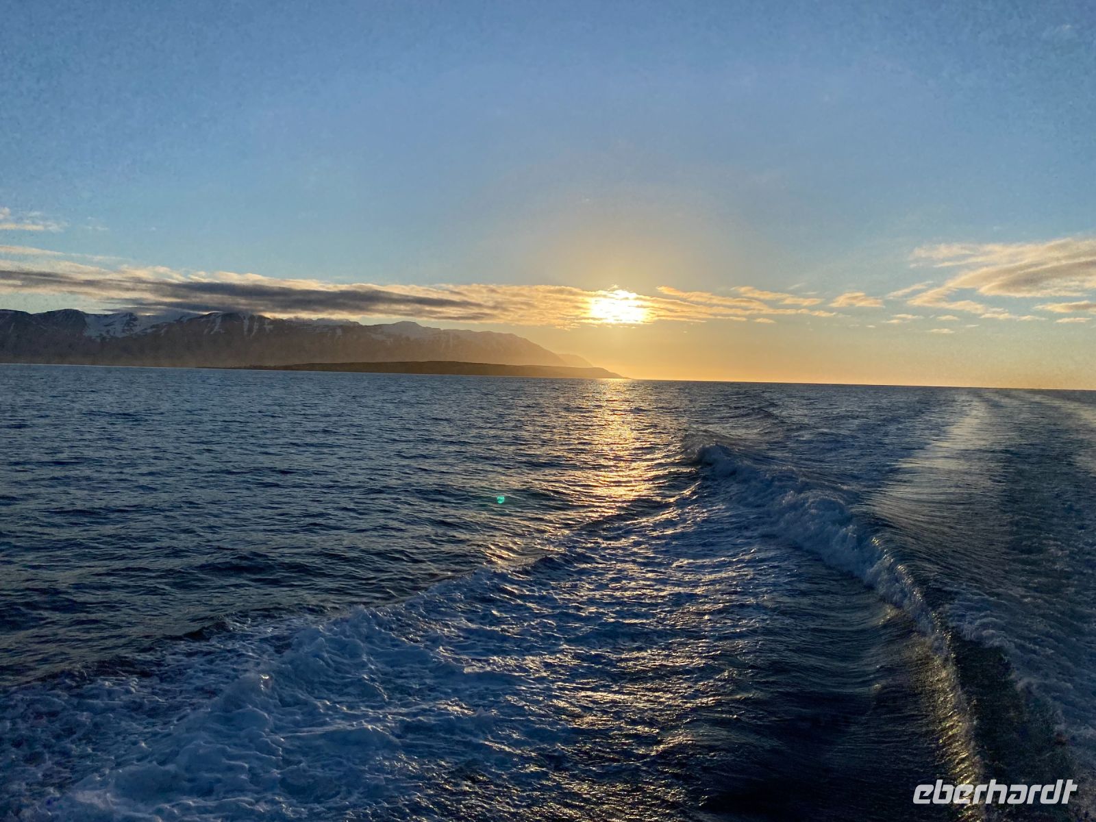 Doch alle wollen heute pünktlich zurück im Hotel sein, denn wir haben noch etwas nachzuholen. Heute gibt es keinen Wind und die Sonne kämpft sich immer wieder durch die Wolken. Dank einiger Absprachen können wir die Walsafari heute nachholen. Nach dem Abendessen bringt uns der Bus in den Hafen von Akureyri, wo das Boot bereits auf uns wartet. Nach circa 1,5 Stunden Fahrt und kaltem Fahrtwind sehen wir, kurz vor dem Ende des Fjords, endlich zwei Wale. Immer wieder steigen sie auf und lassen uns erstaunen. Es gesellen sich noch drei weitere Wale dazu und scheinen um das Boot zu schwimmen. Wir erfahren, dass es zwei ausgewachsene Buckelwale mit ihren Jungen sind, Ein unglaubliches Erlebnis und das auch noch bei wolkenlosem Himmel. Genau um Mitternacht erreichen wir unser Hotel und die Sonne steht genau im Fjord, wenn das kein Bild wert ist.