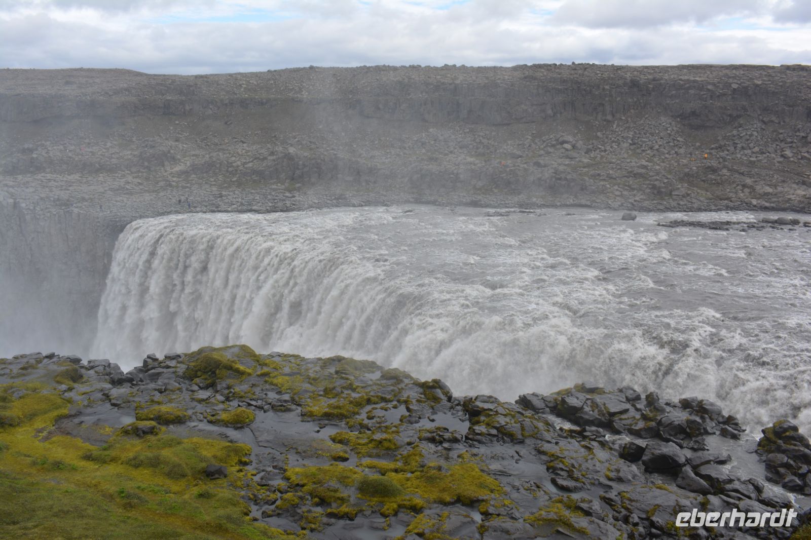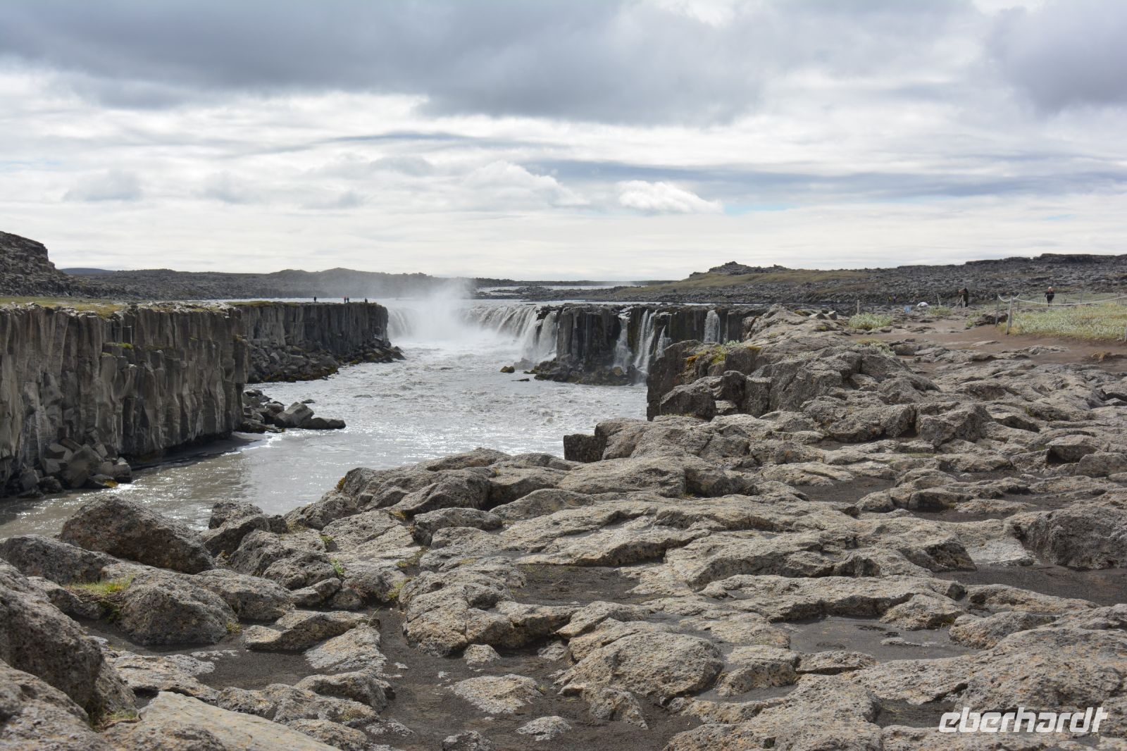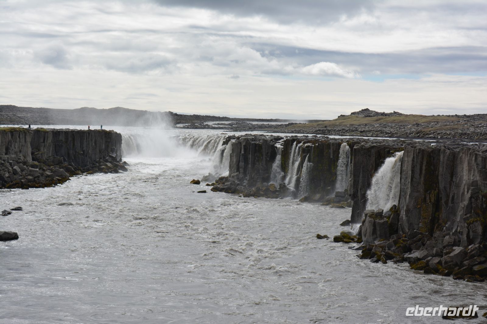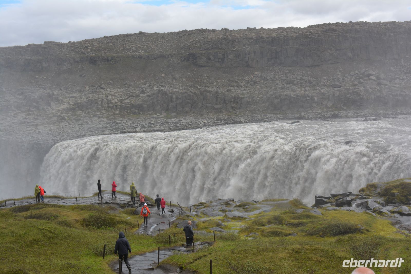 Inmitten einer kargen Landschaft biegen wir links ab und sehen schon von weitem Gischt aufsteigen. Es erwartet uns der größte Wasserfall Europas – der Dettifoss. Mit 44 Metern Fallhöhe und einer Breite von 100 Metern erinnert er an die Niagarafälle. Hier bekommt man schon in der Gischt eine kostenfreie Dusche. Von verschiedenen Aussichtspunkten haben wir unterschiedliche Blicke auf die herabstürzenden Wassermassen. Wer möchte läuft noch etwas weiter zum Sellfoss. Auf diesen Wasserfall im gleichen Fluss hat man schon einen tollen Blick von weiter Weg. In mehreren kleinen Wasserfällen findet hier Wasser seinen Weg nach unten.