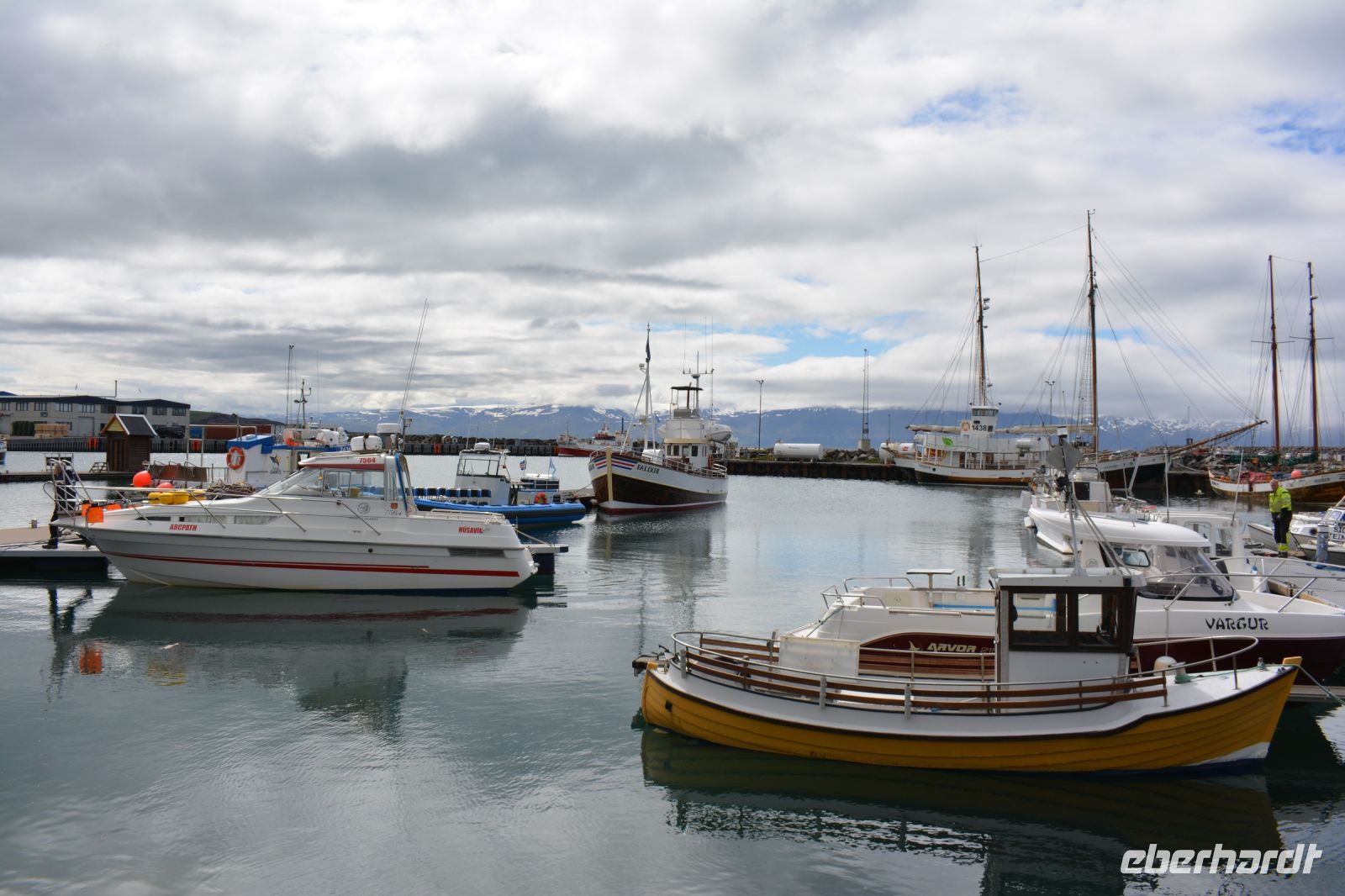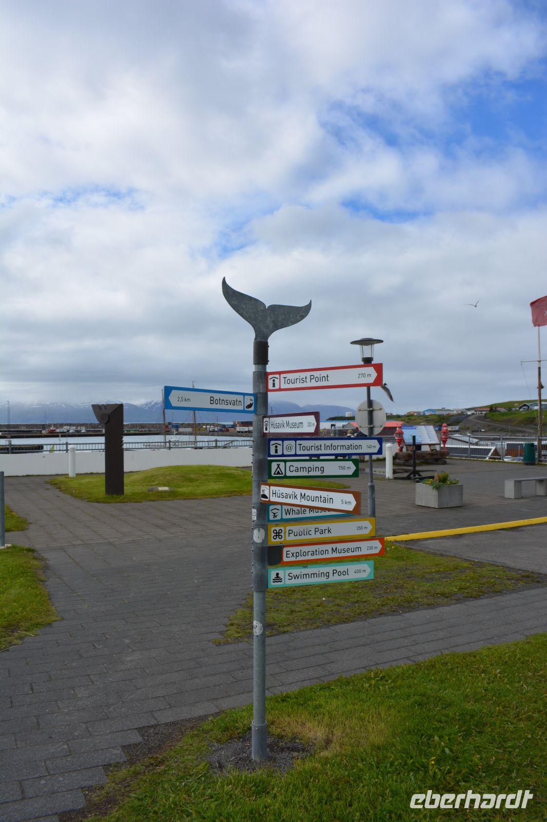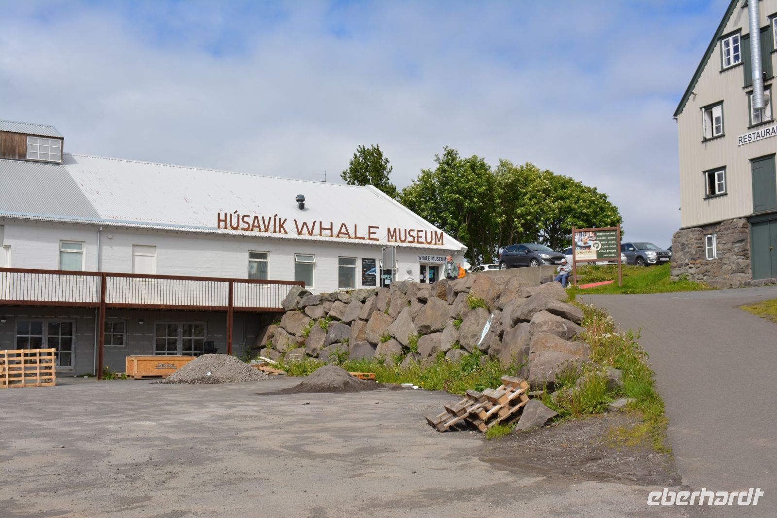 Nach all den landschaftlichen Ereignissen, sehnen wir uns nach etwas Zivilisation und wir machen und auf dem Weg nach Husavik. Man kann hier ins Walmuseum gehen, in den kleinen Cafés etwas essen und trinken und in eines der zahlreichen Souvenirshops stöbern. Hier gibt es oft die besonderen, handgestrickten Islandpullover, für die man oft über 200 Euro bezahlt. Wir bekommen natürlich erklärt, wieso diese so wertvoll sind. Die Haarwurzel des Islandschafs besteht aus vier einzelnen Haaren. Die drei kurzen Haare dienen zum Warmhalten, denn hier wird es nur selten über 15°C warm. Das eine längere Haar ist besonders fettig und von innen hohl, damit sind die Schafe bei Regen nicht nass werden. Außerdem ermöglicht es den Tieren zu schwimmen. Aktuell gibt es noch rund 400.000 Schafe auf Island, Tendenz sinkend. Für die Bauern lohnt sich die Zucht nicht mehr, da sie für das Fleisch immer weniger Geld bekommen.
